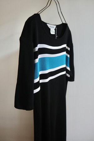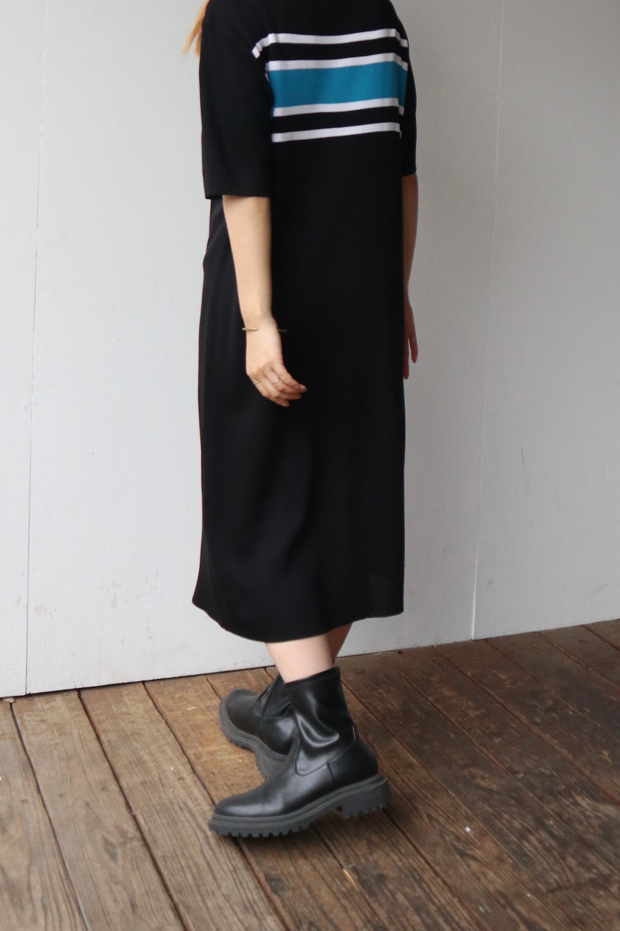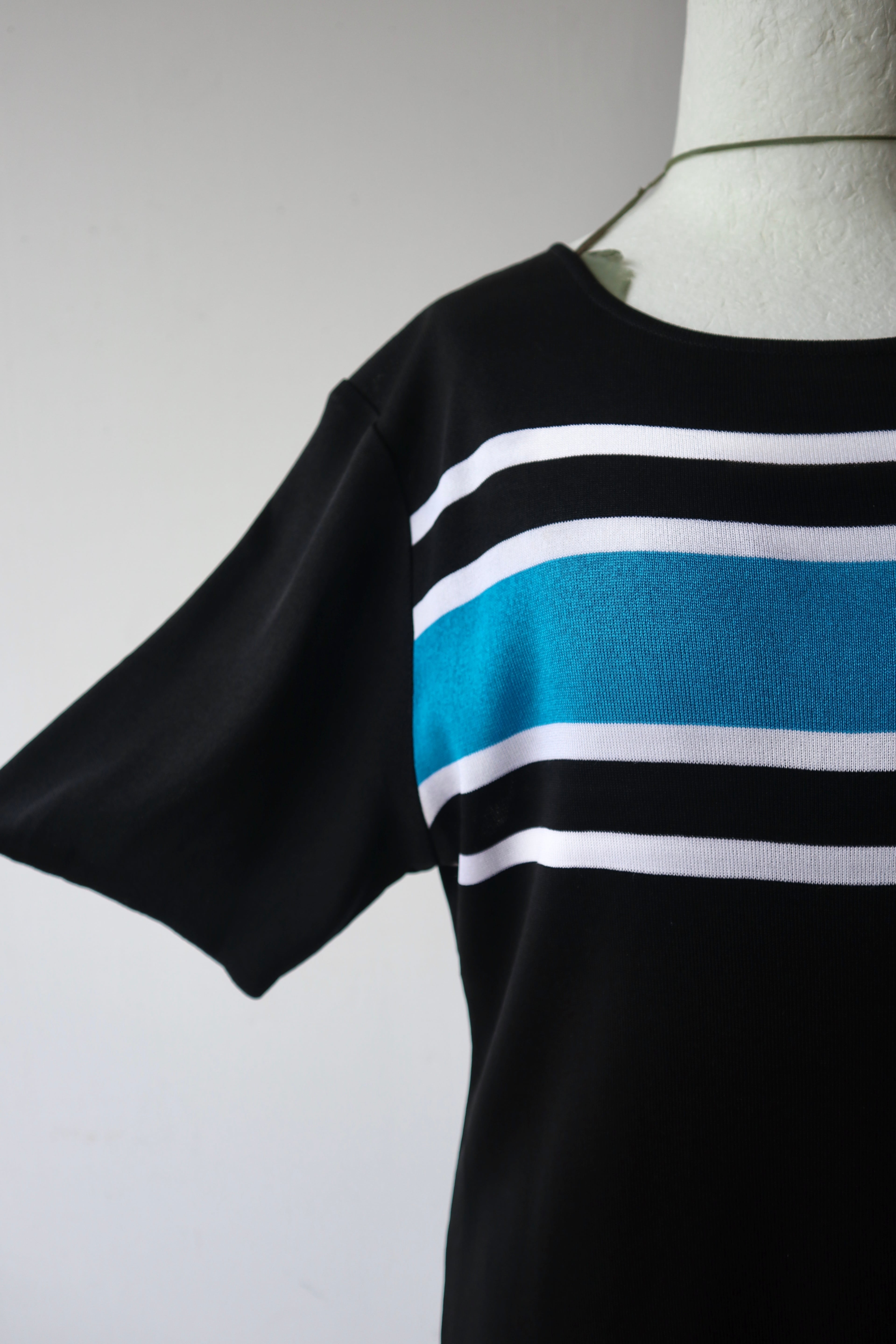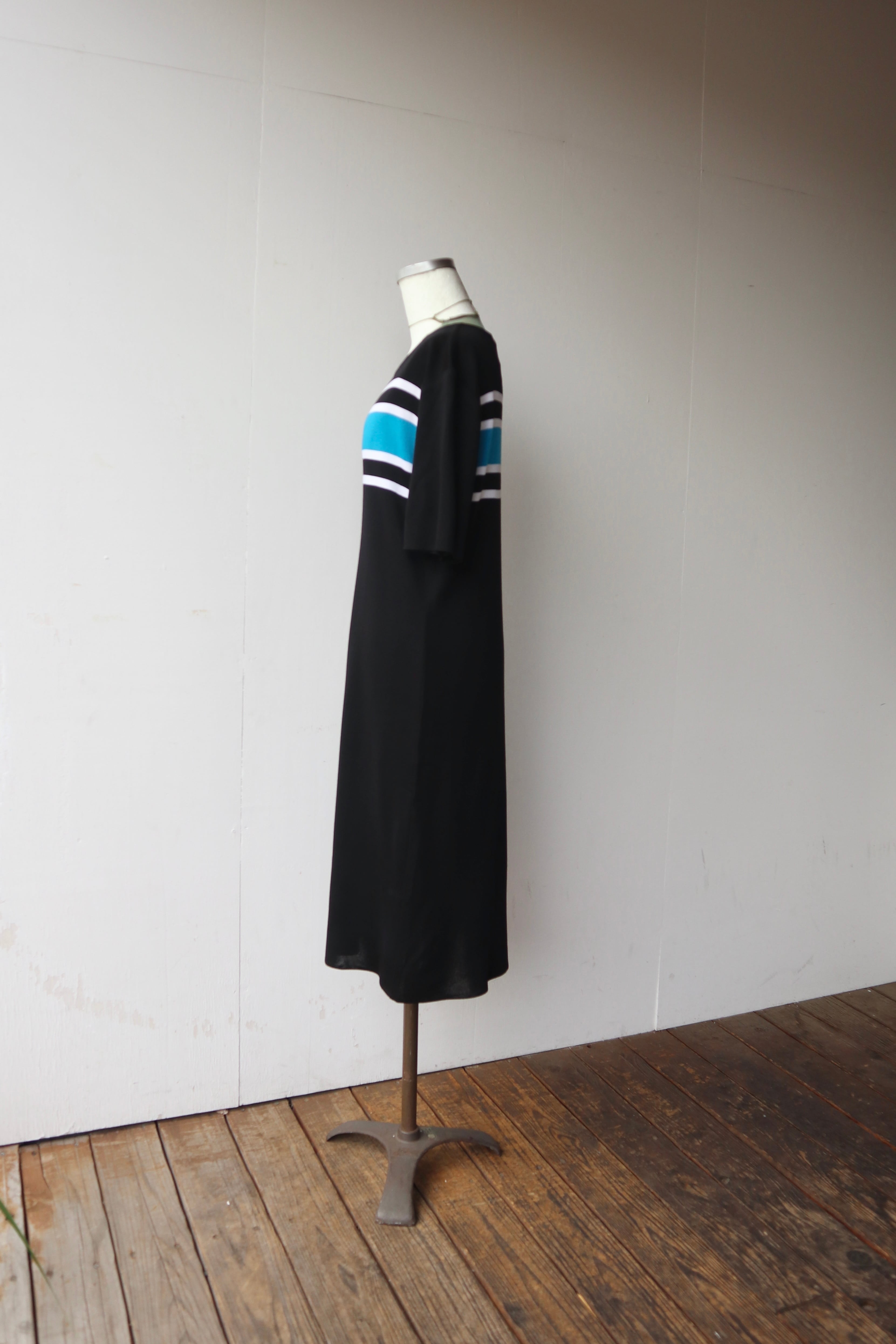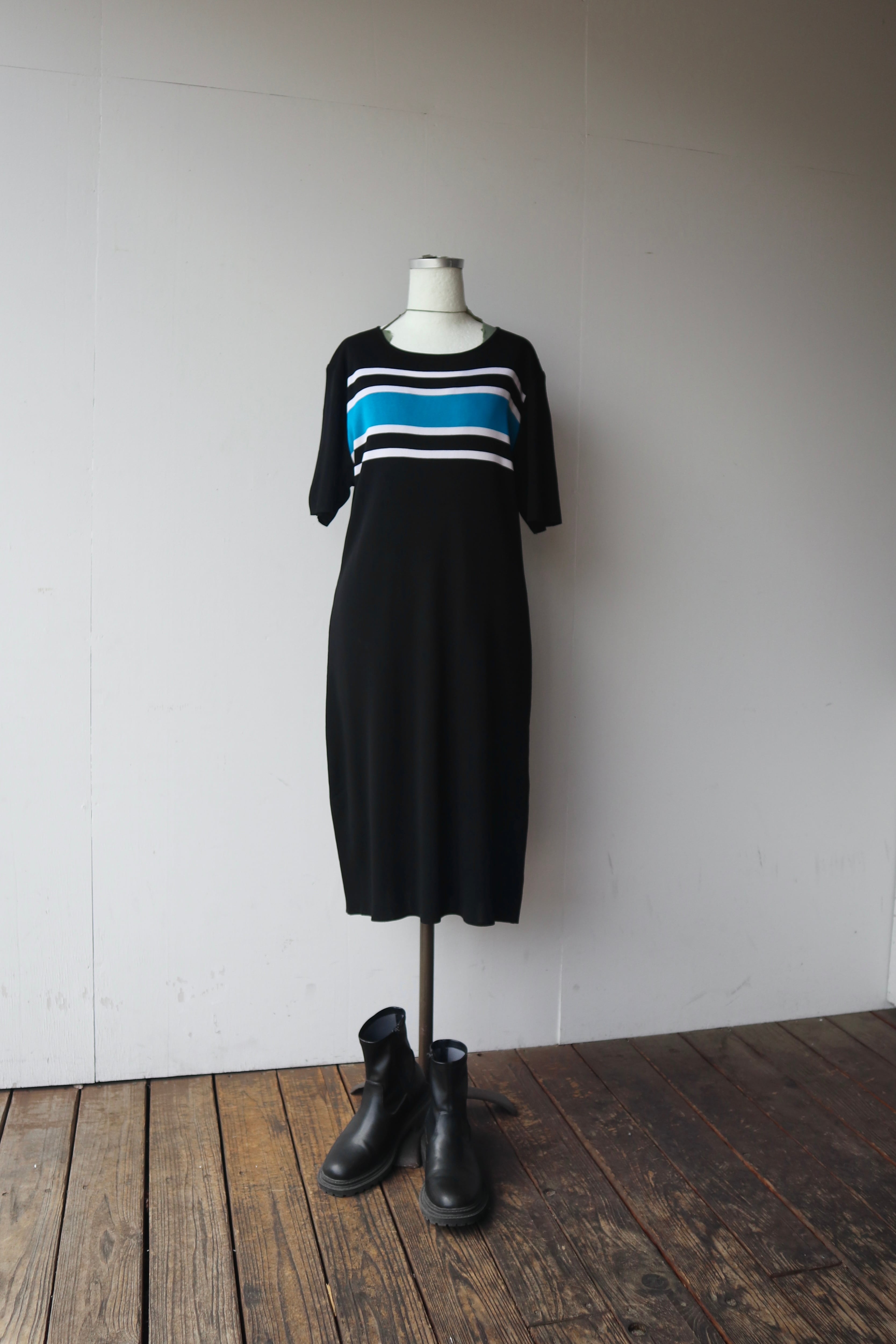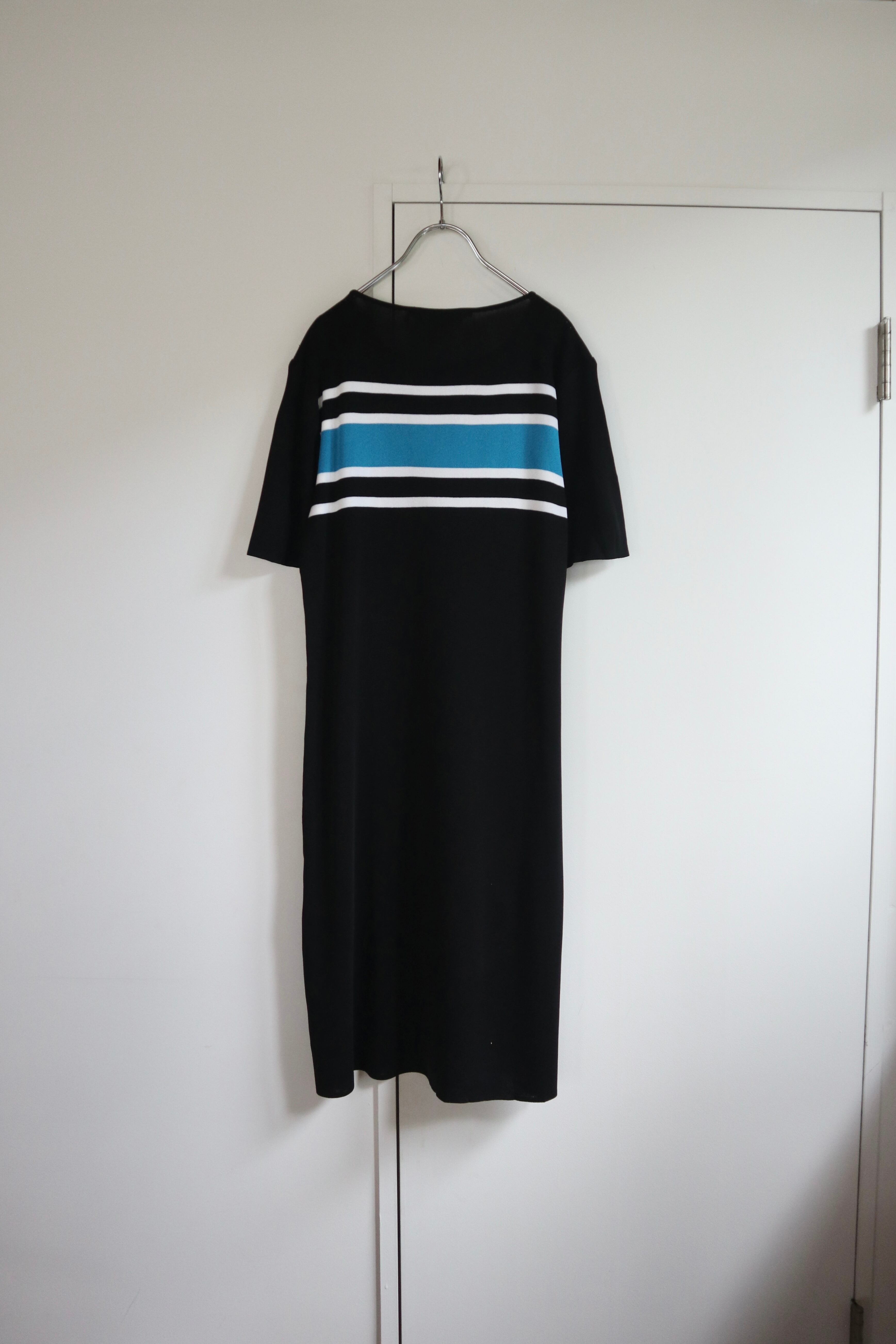 ストンと落ちるシルエットで胸元の水色と白のラインが