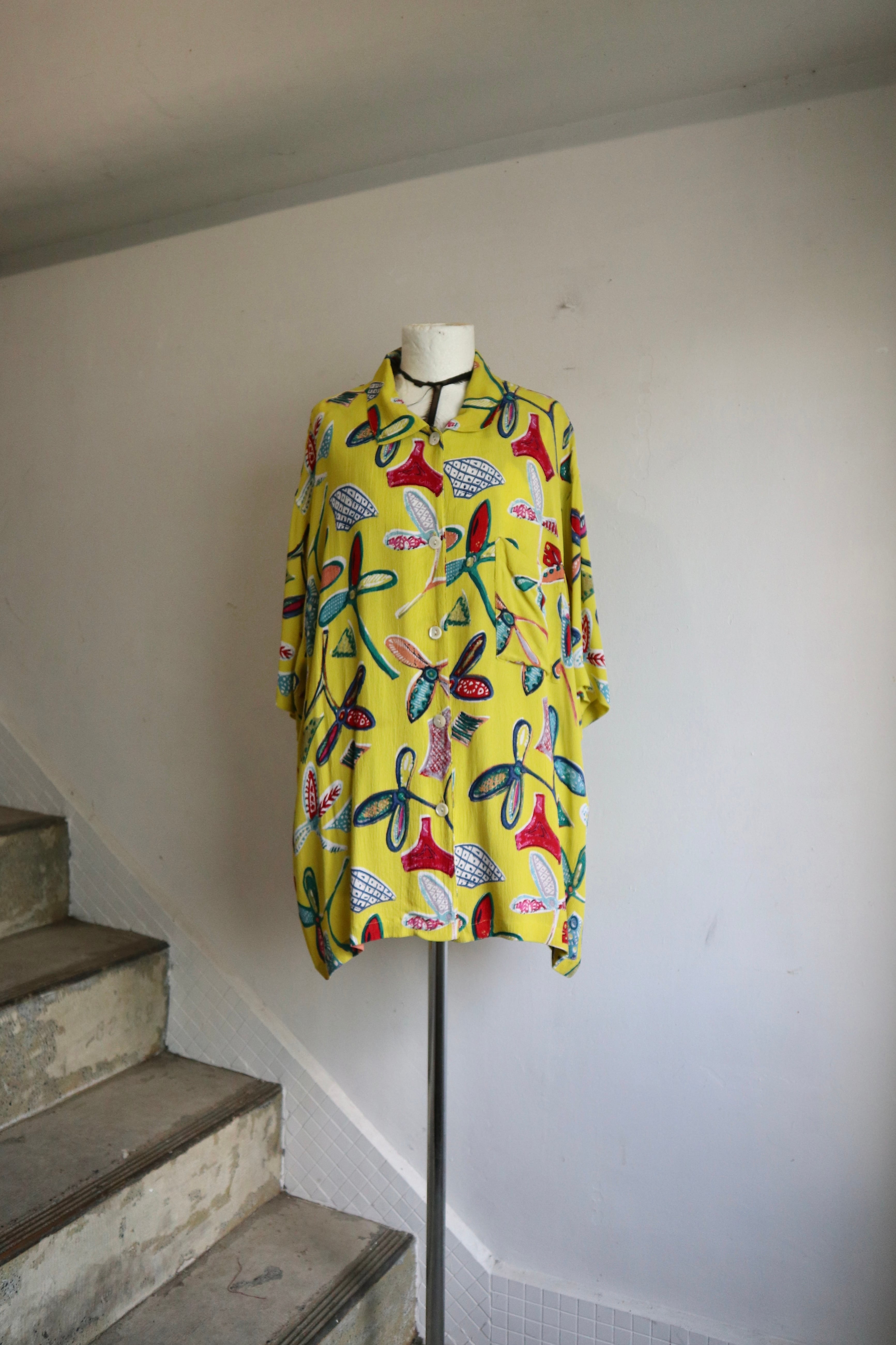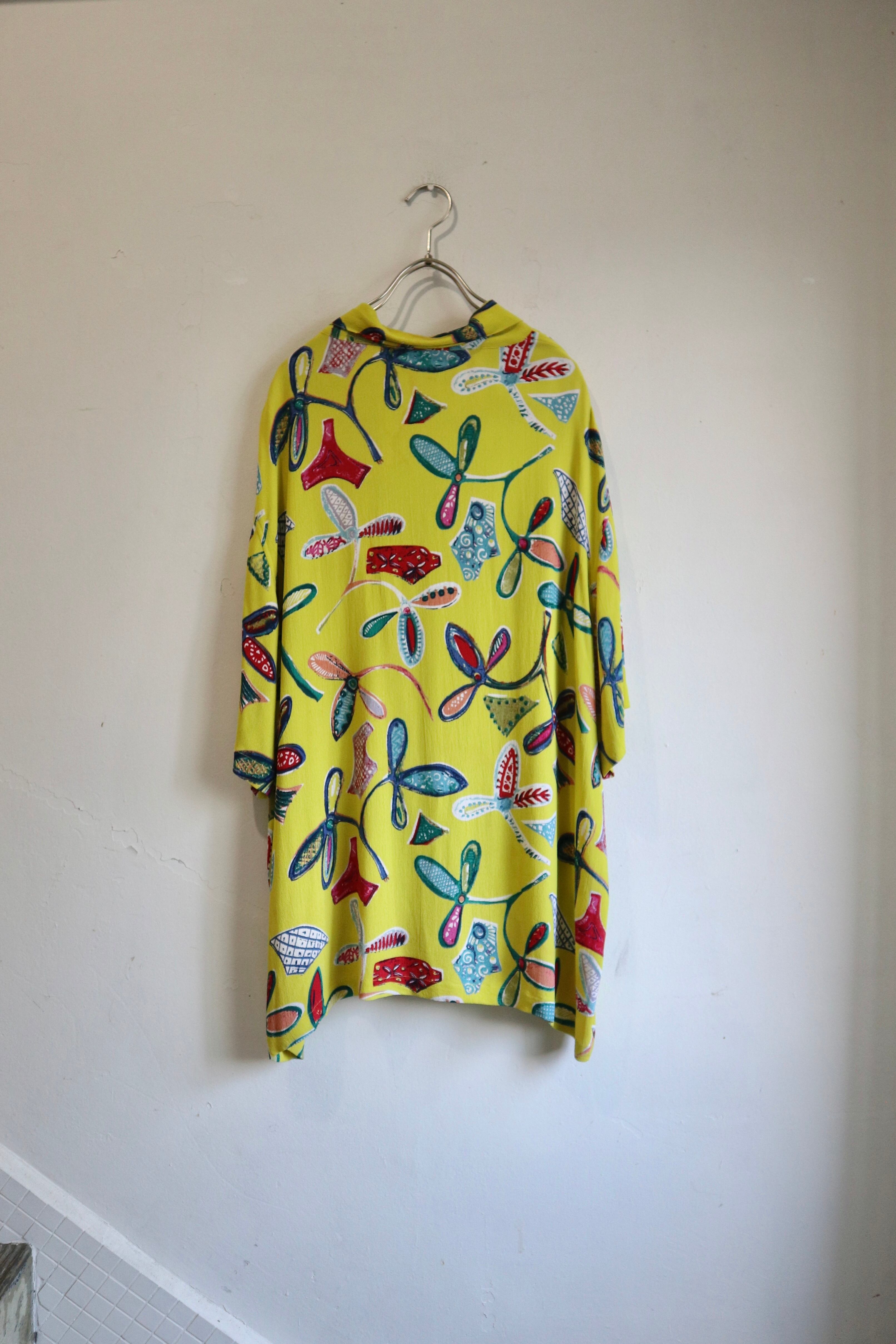 発色のよい蛍光イエローにアートな柄がとても素敵な一着