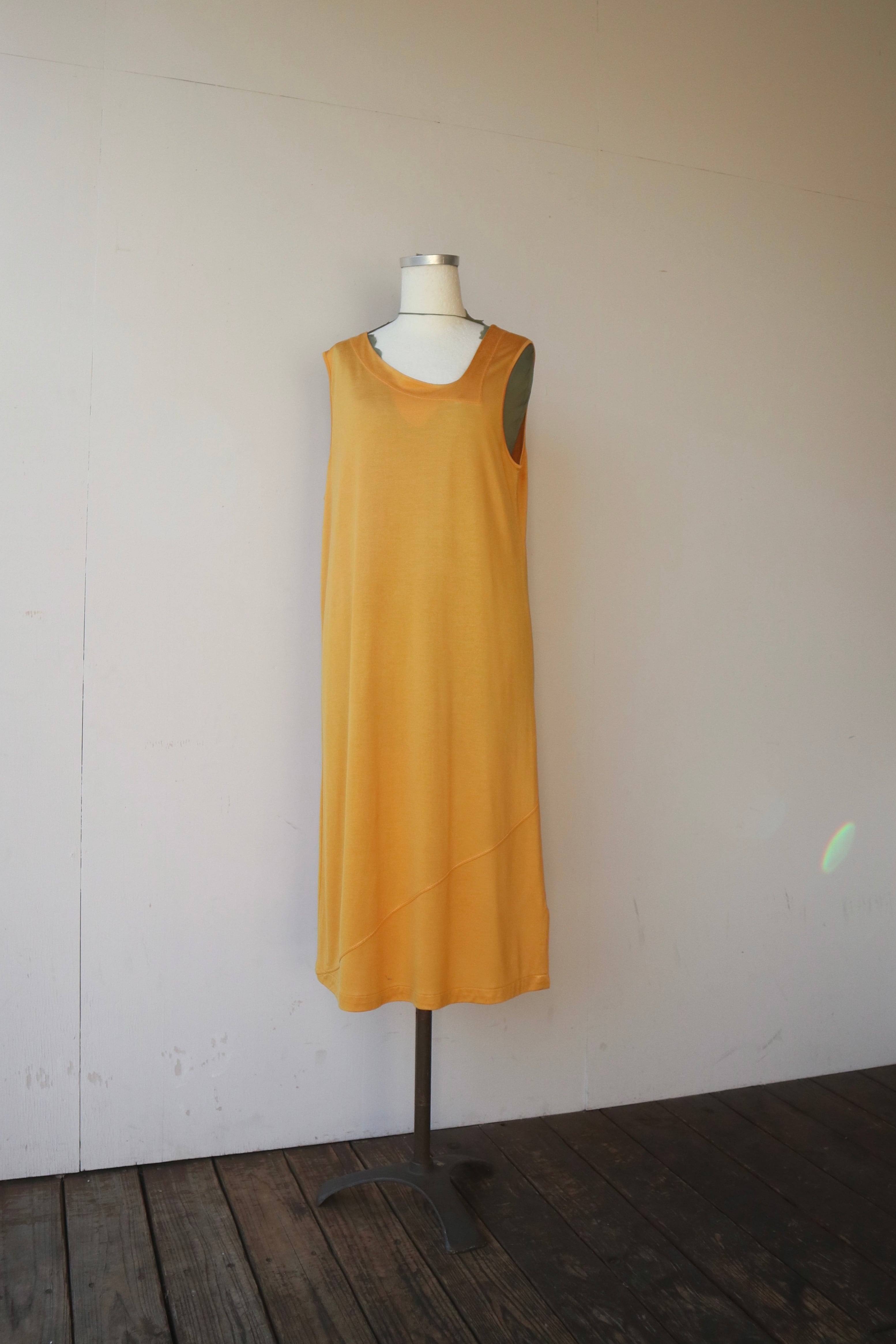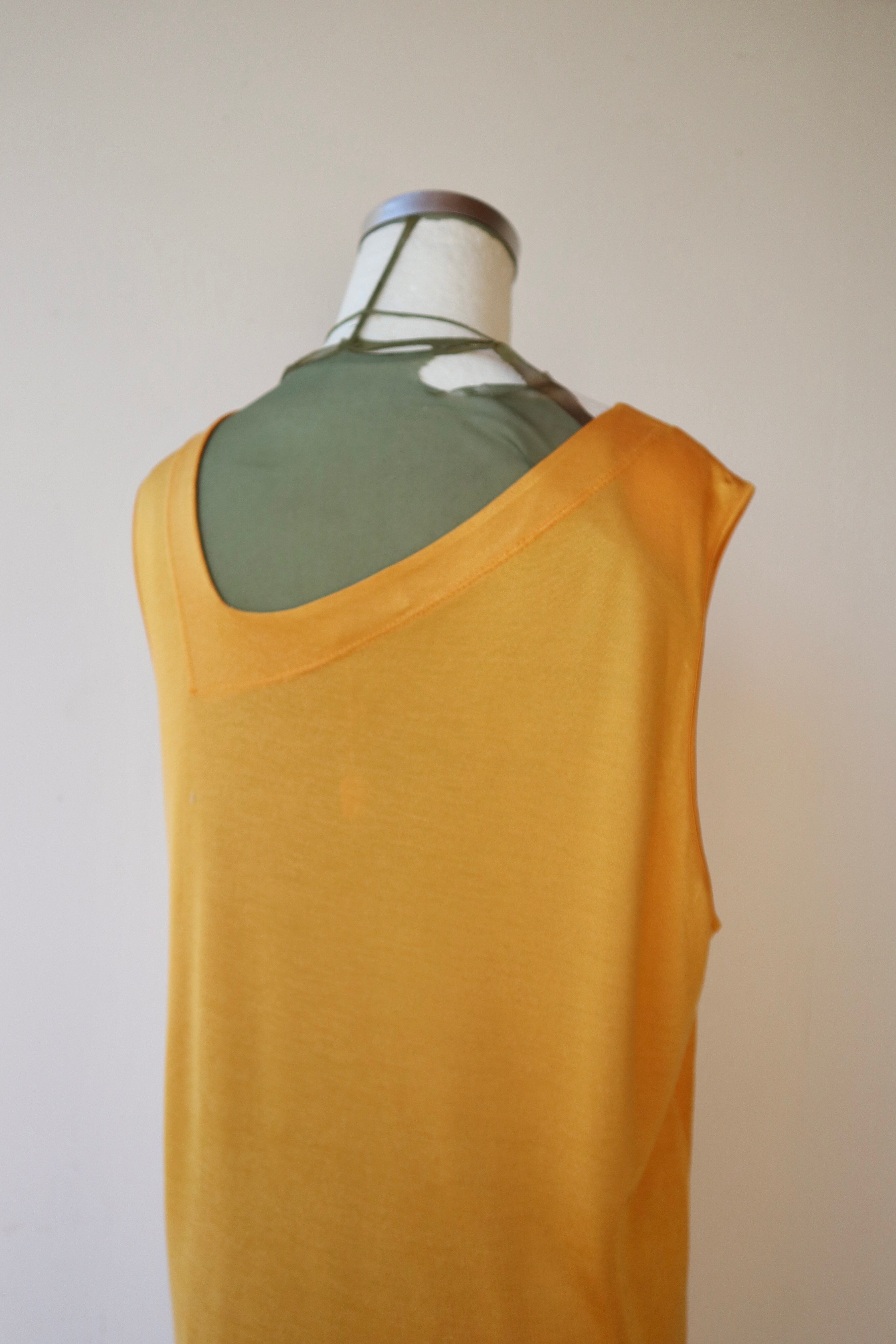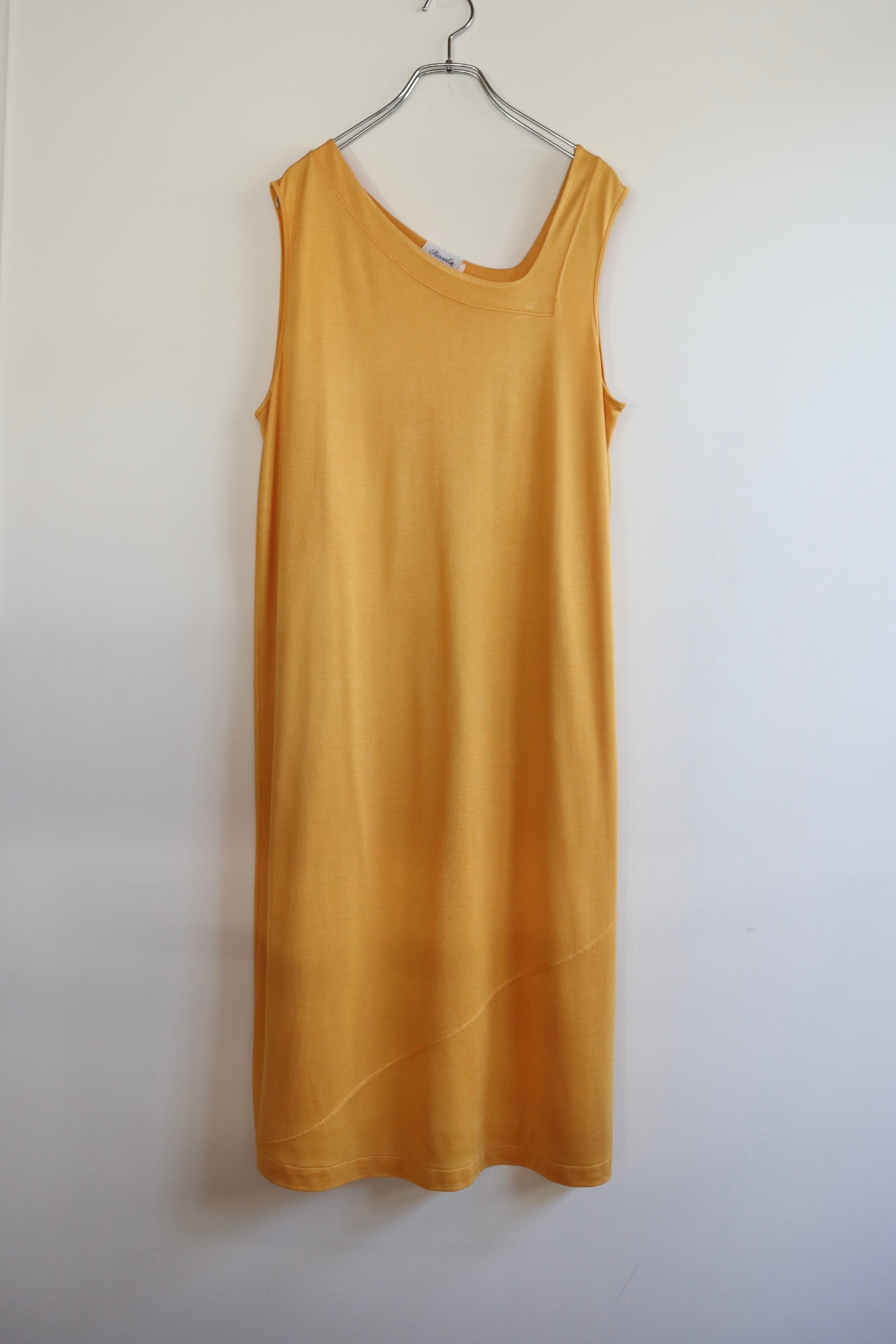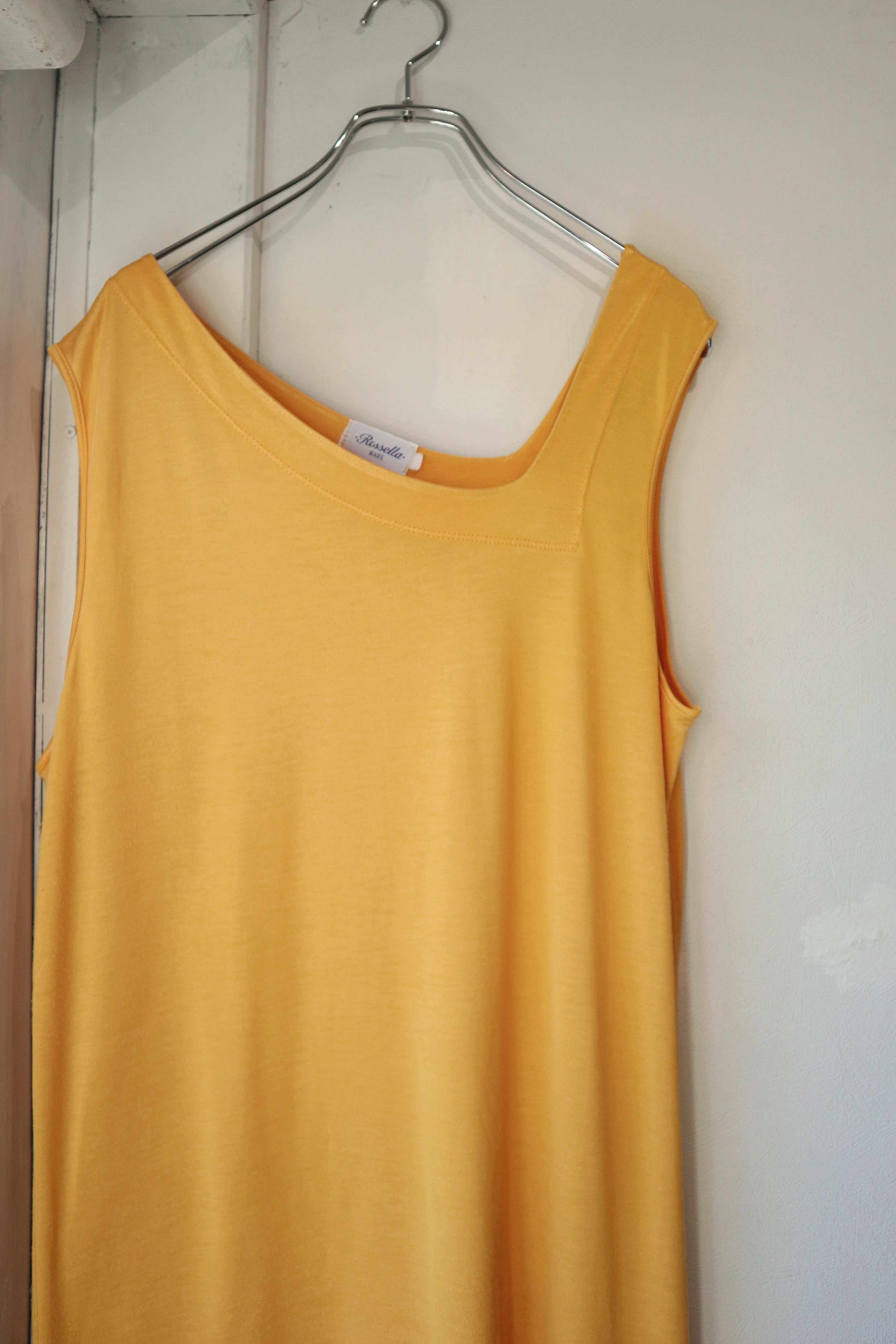 ネックラインのカッティングが特徴的で肌見せになり、ストレートなシルエットですが伸縮性のある素材で
