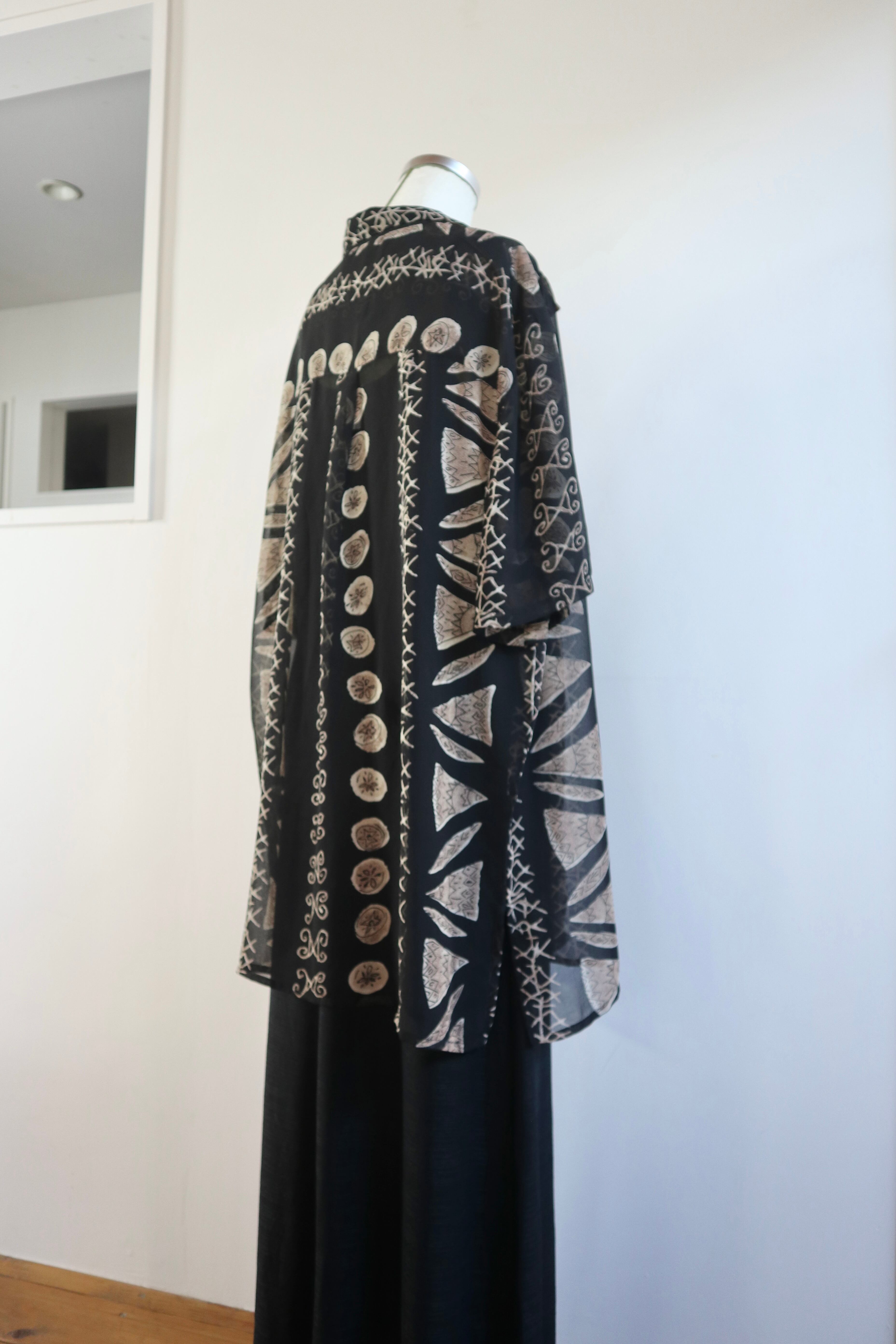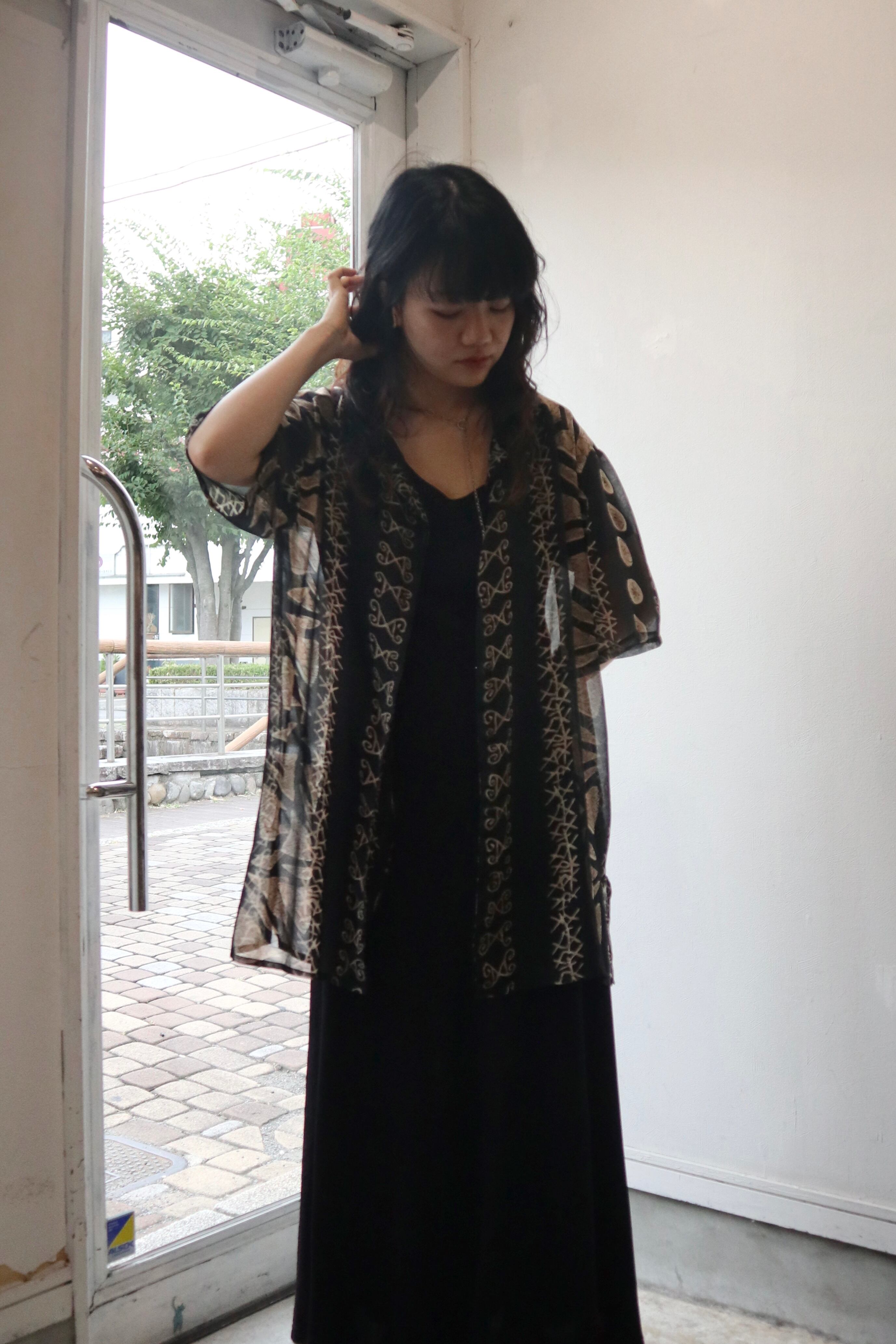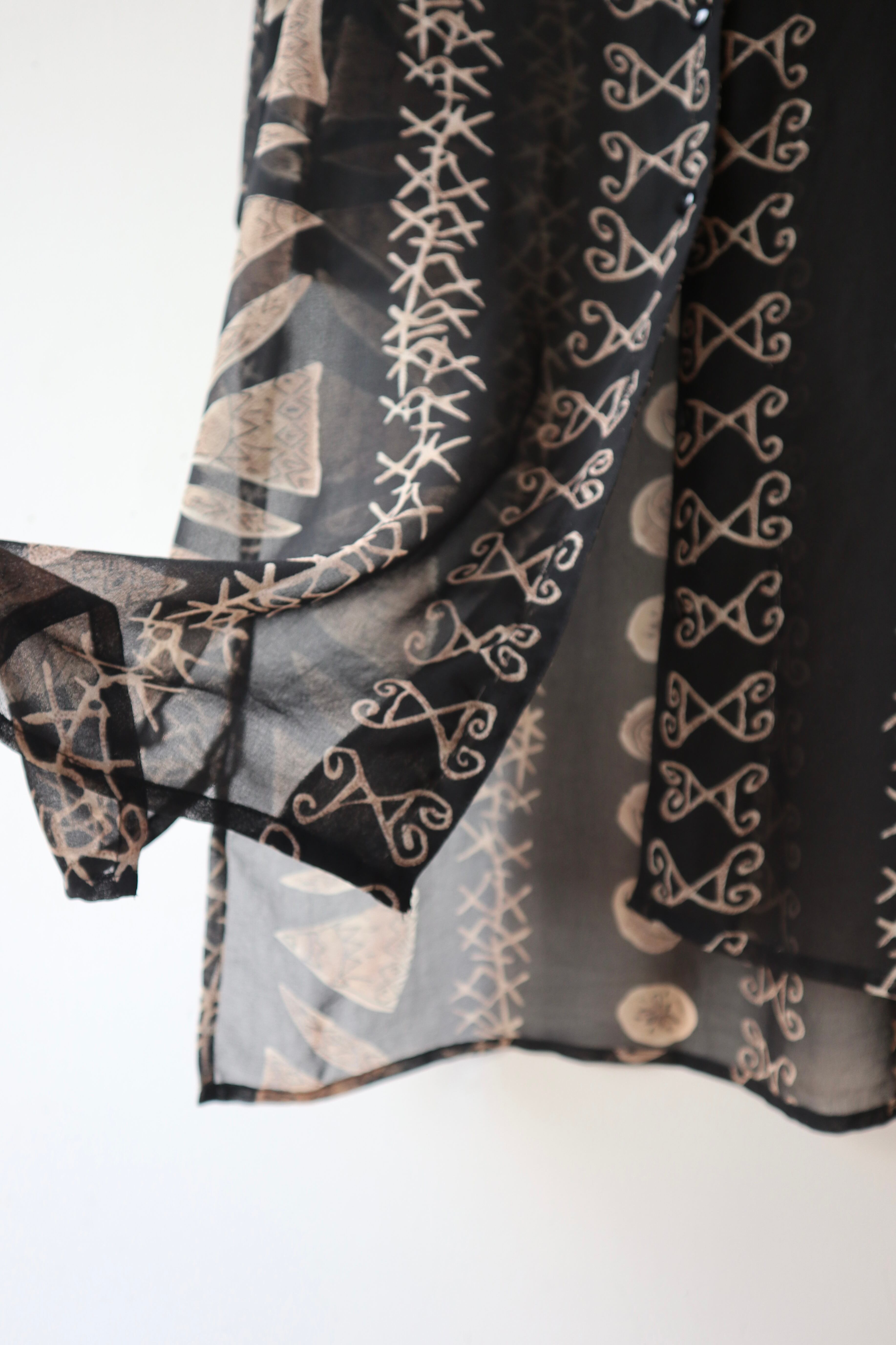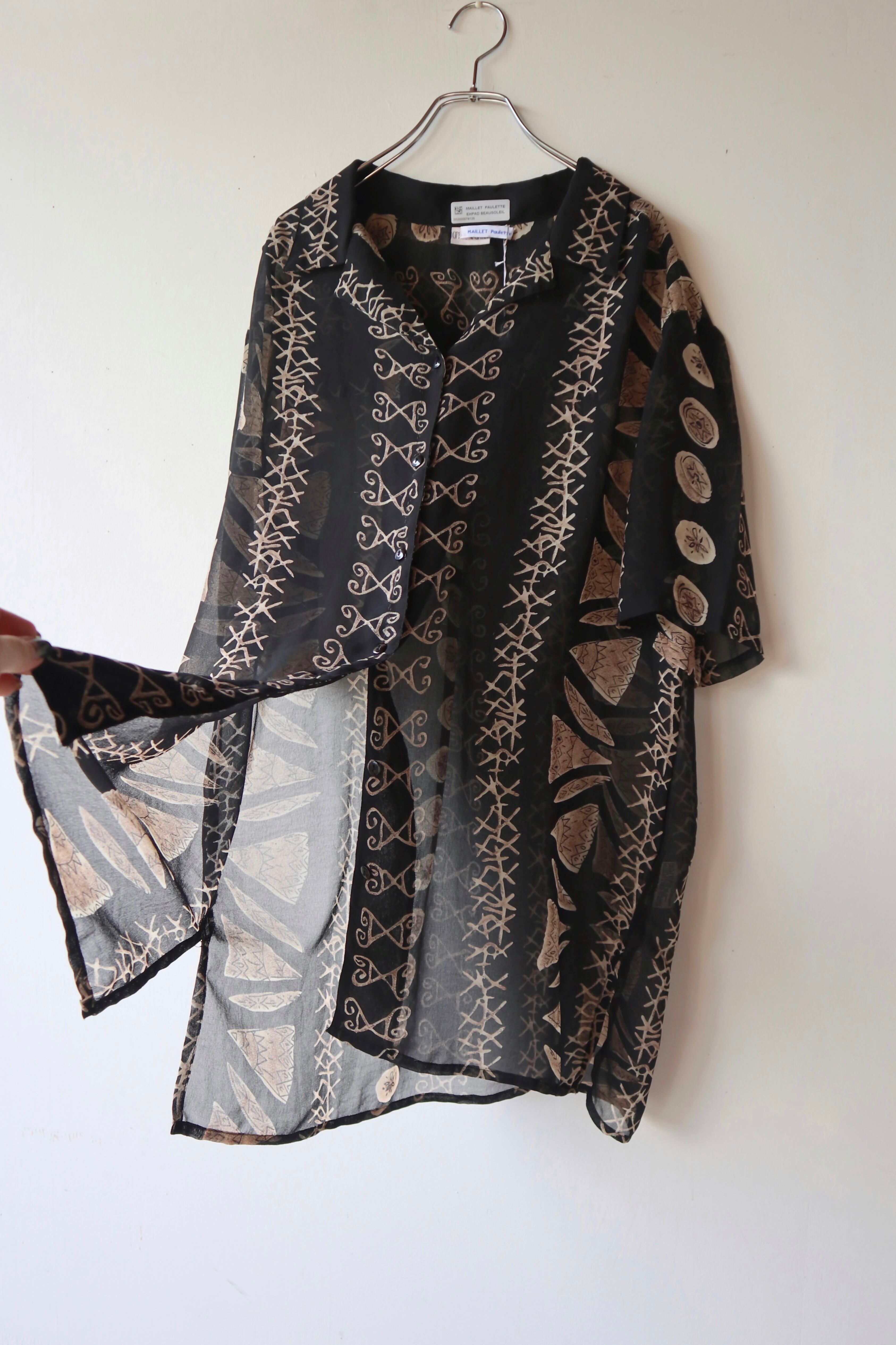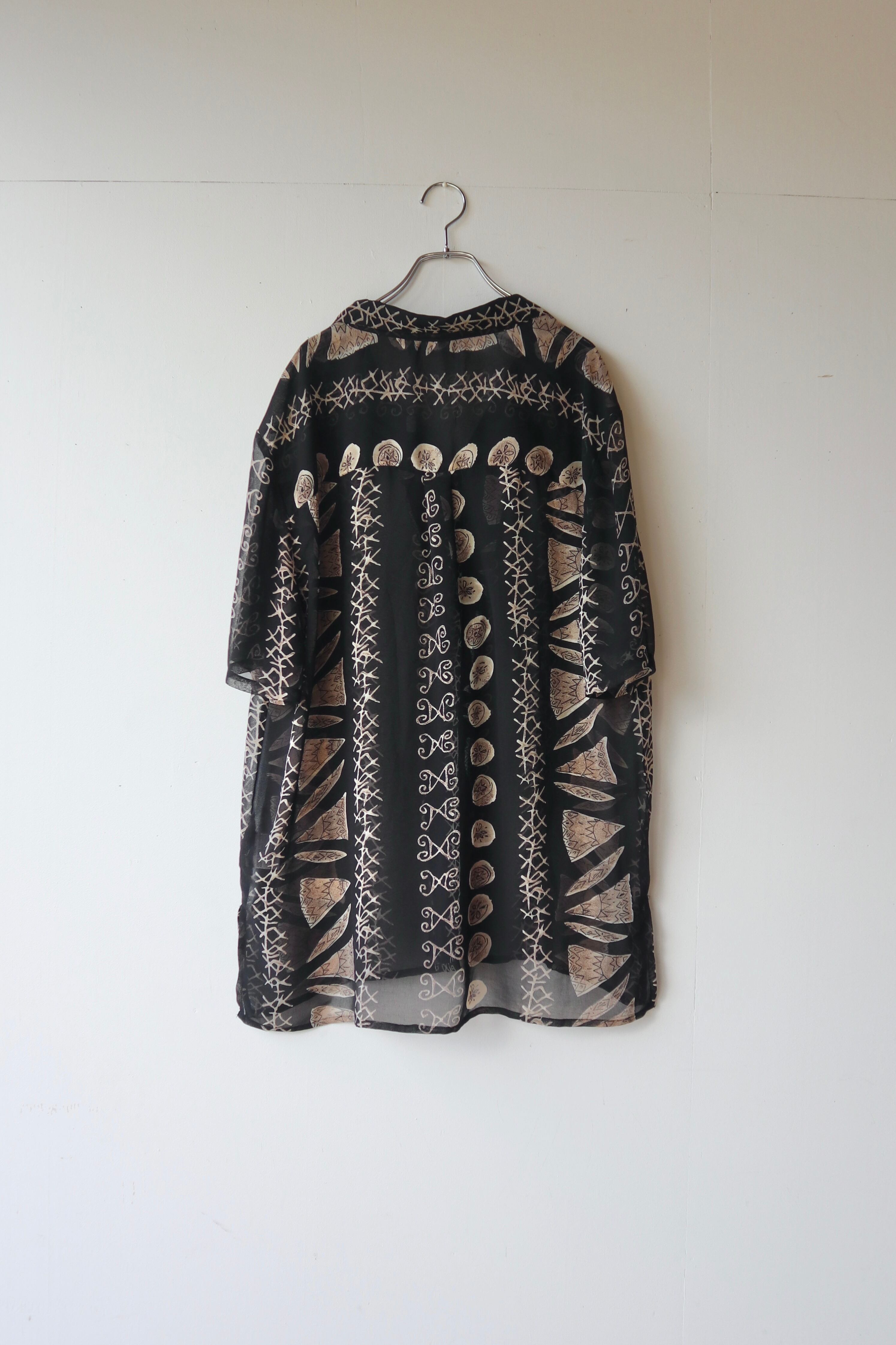 黒ベースにベージュの柄がプリントされたシアーシャツ