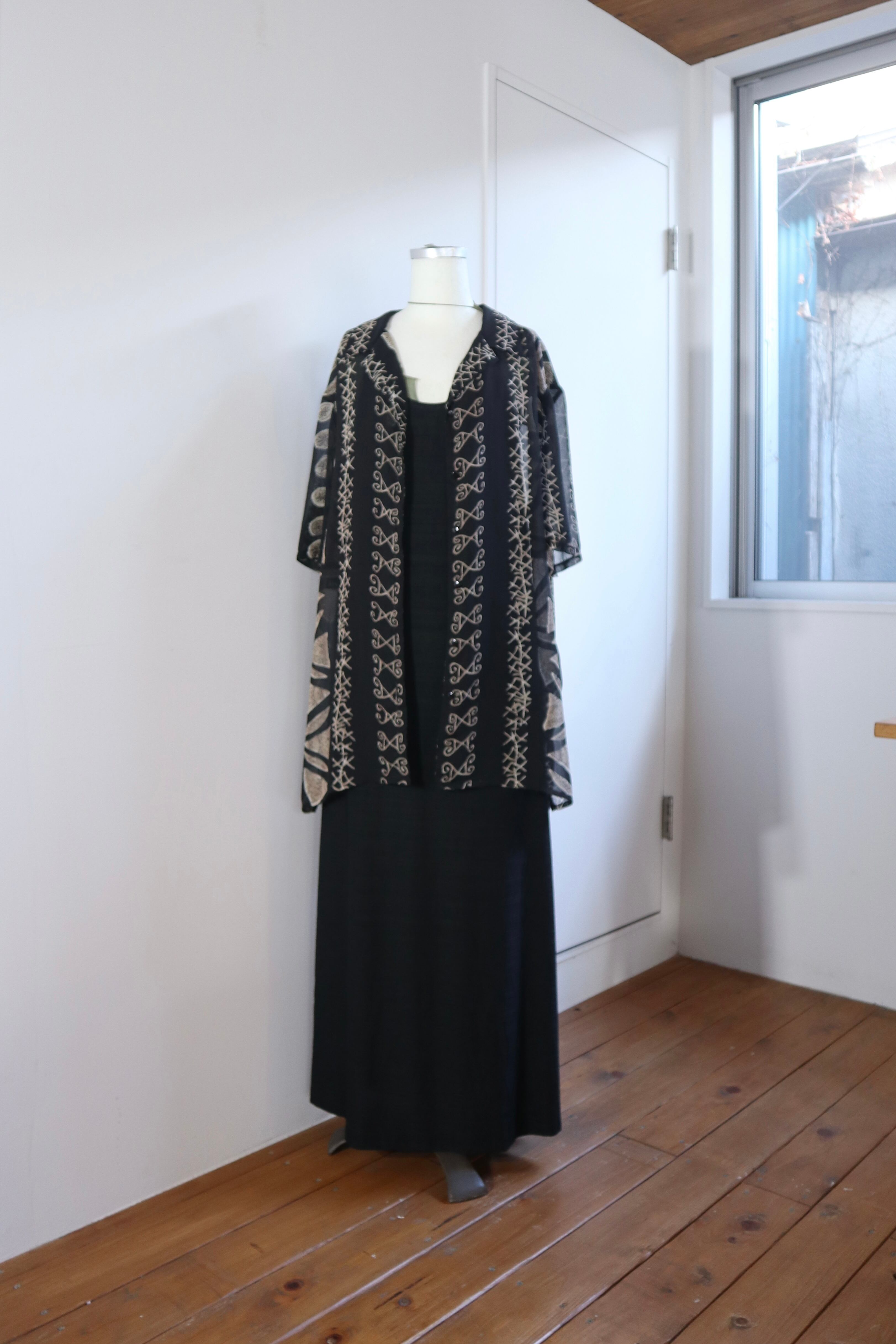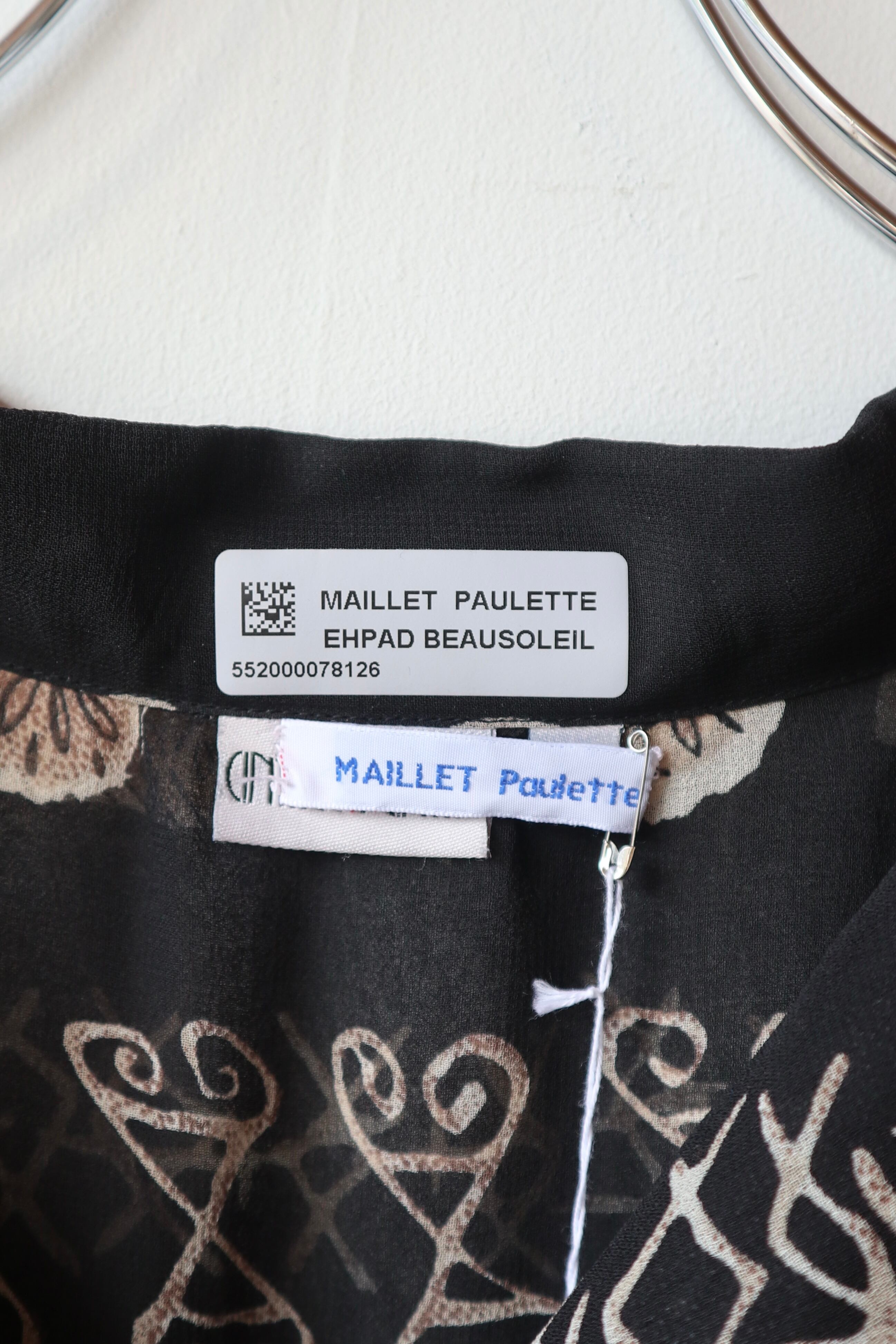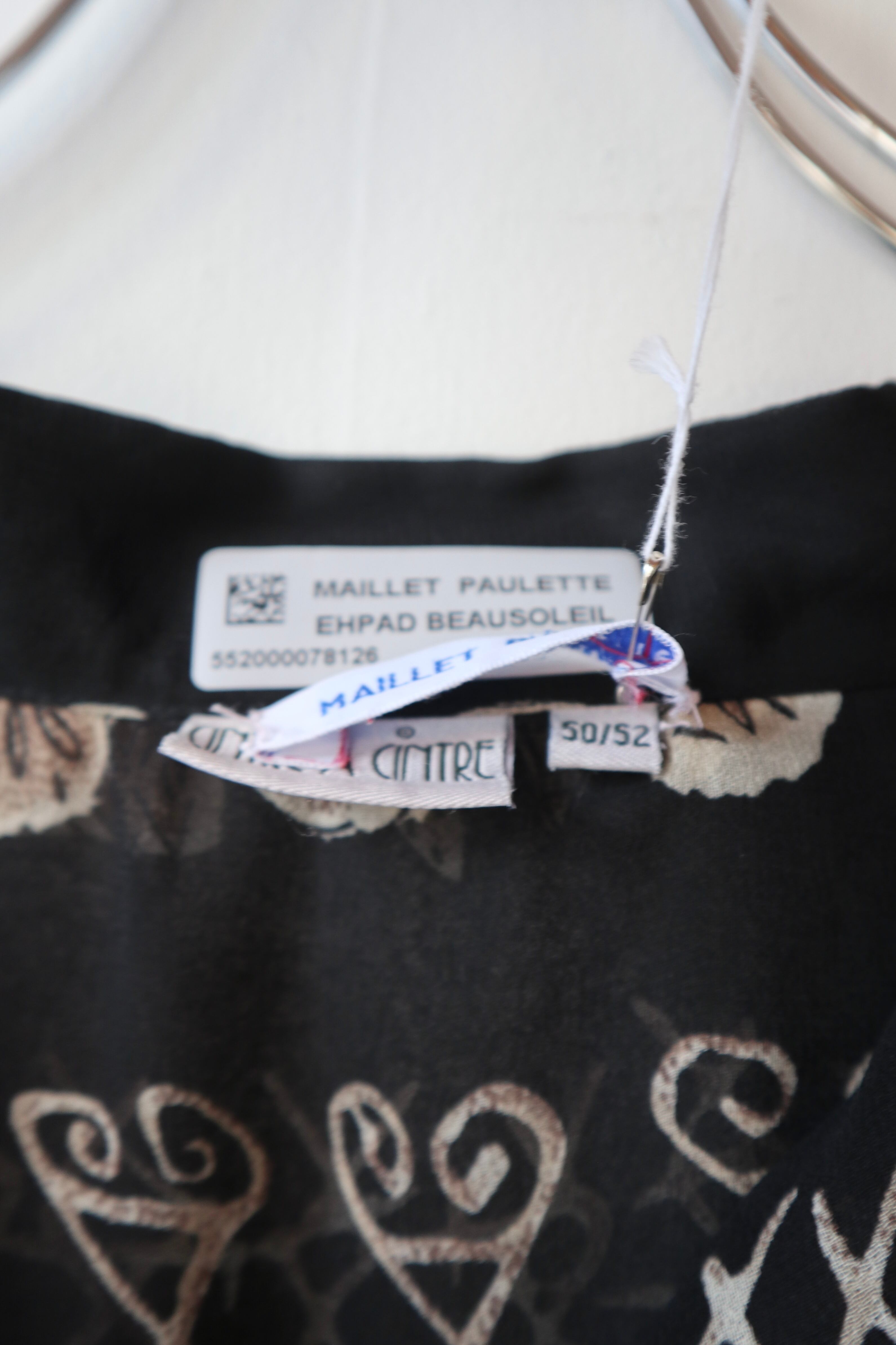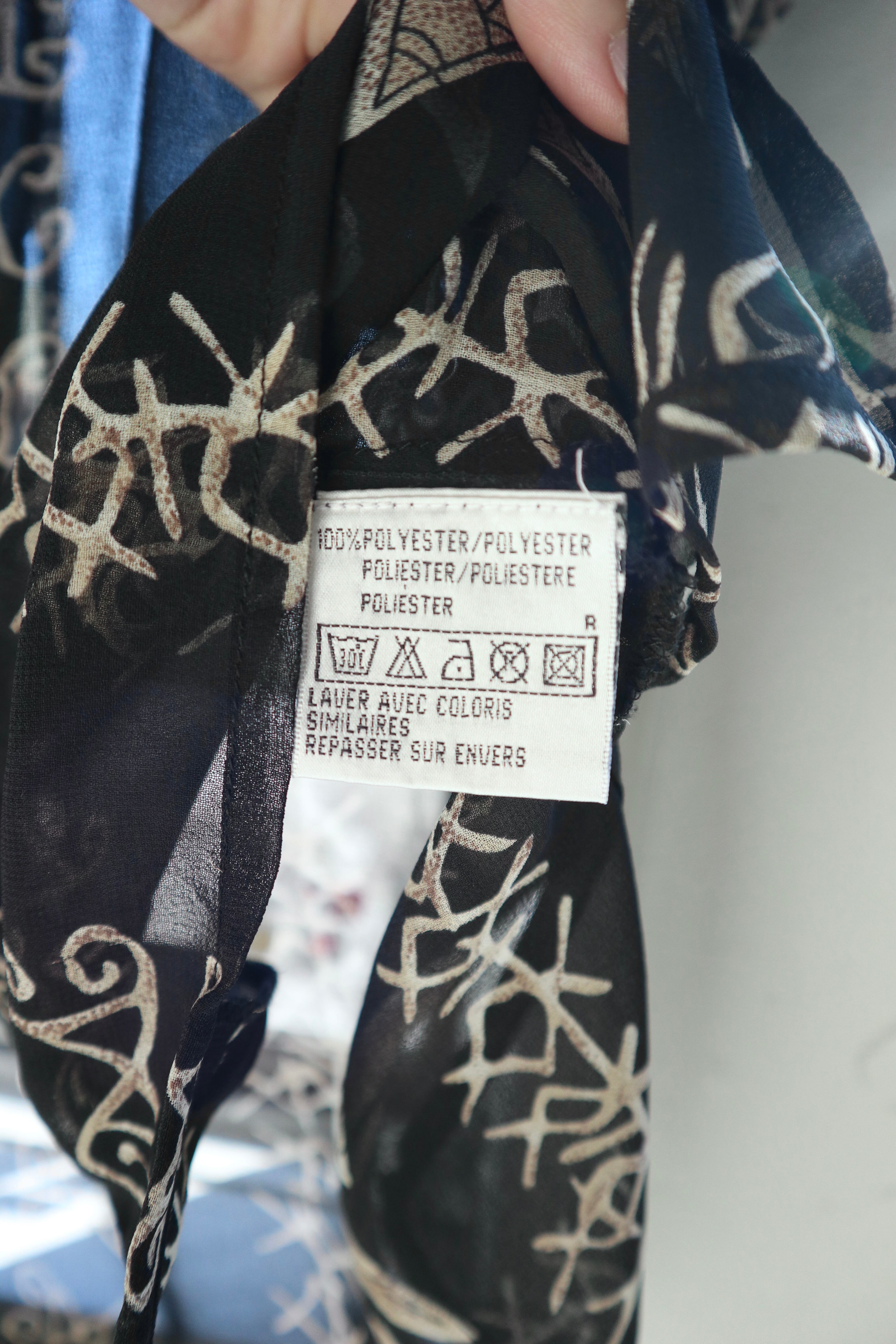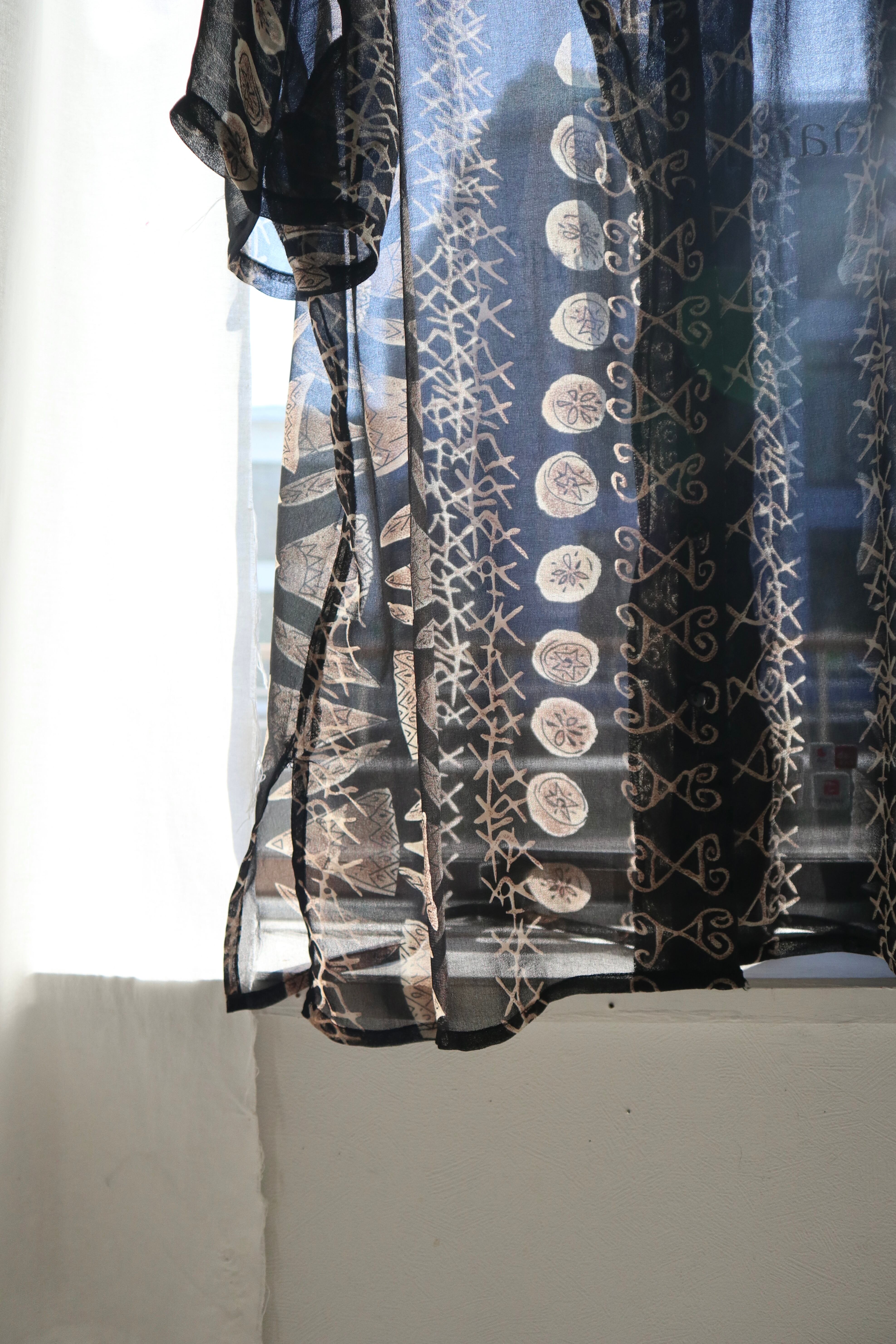 黒ベースにベージュの柄がプリントされたシアーシャツ