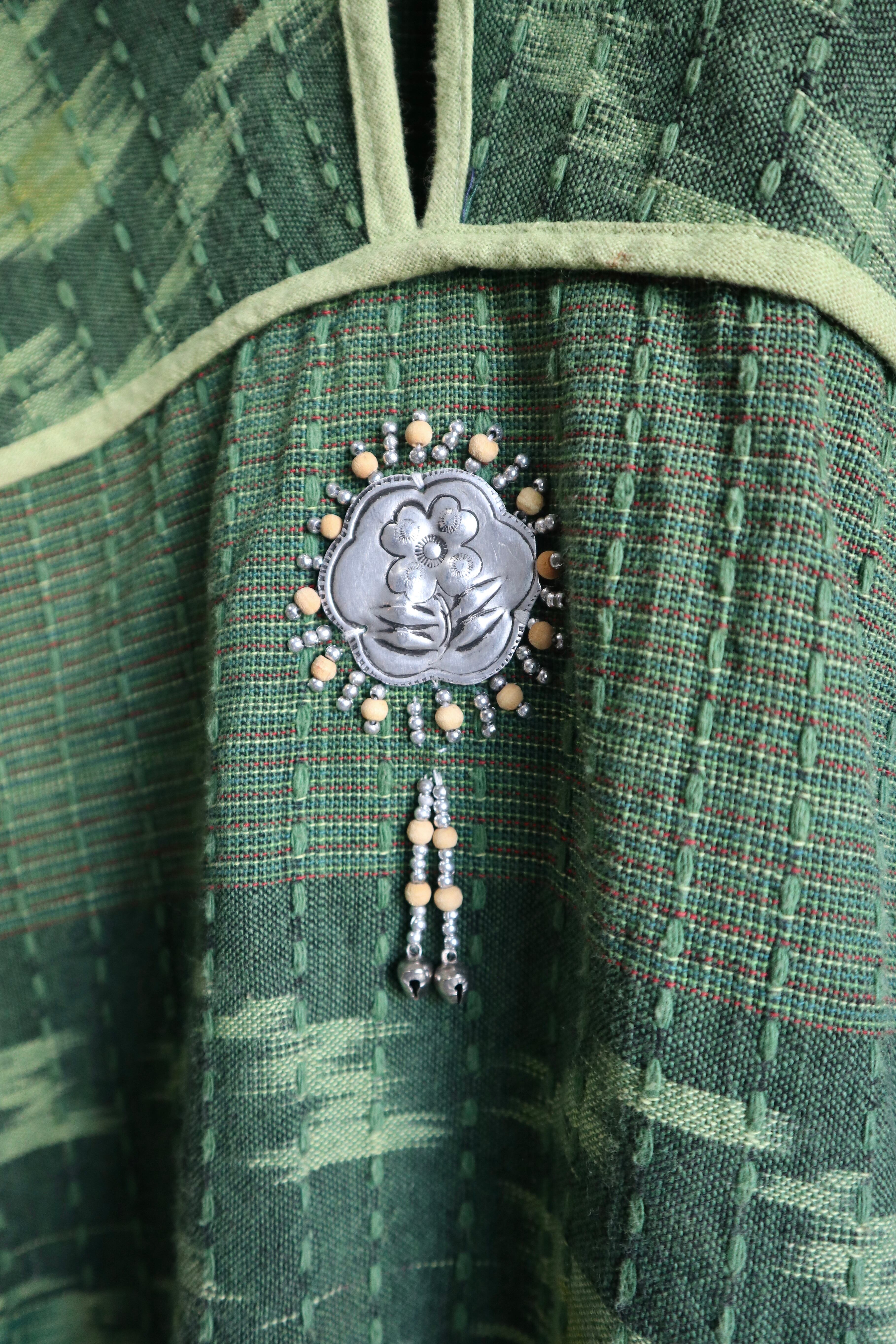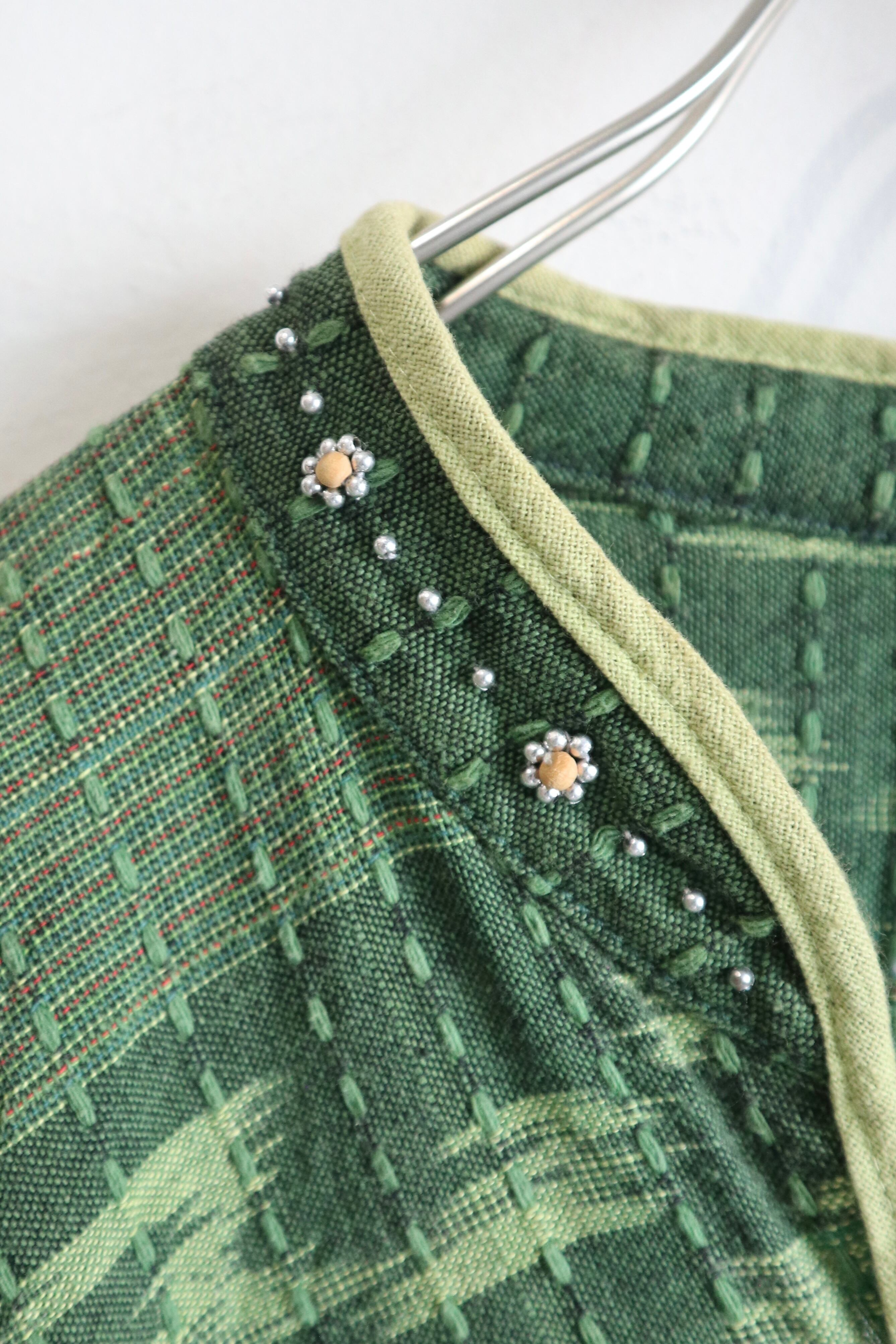 襟や前面中央にはビーズや鈴などの刺繍が施され、