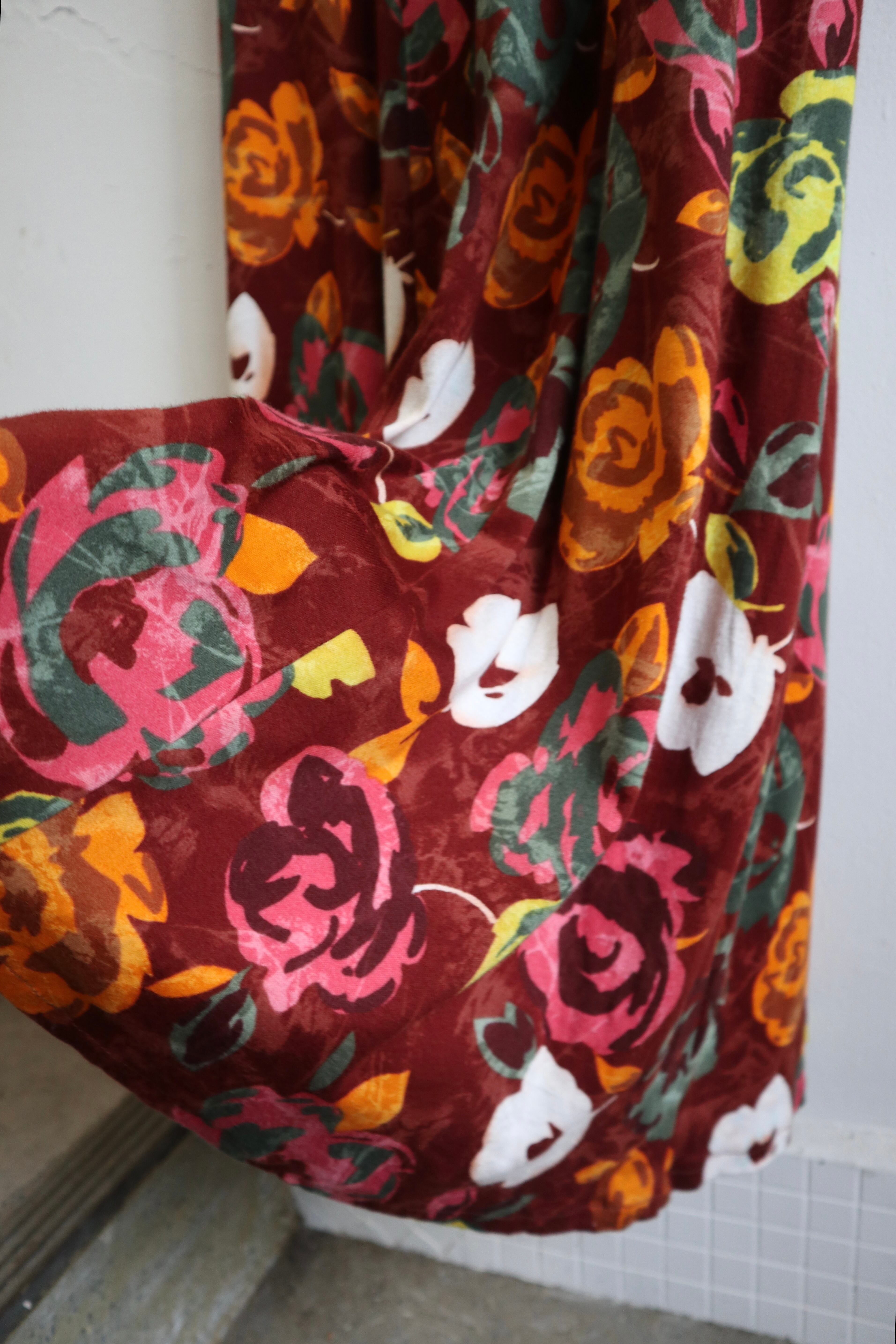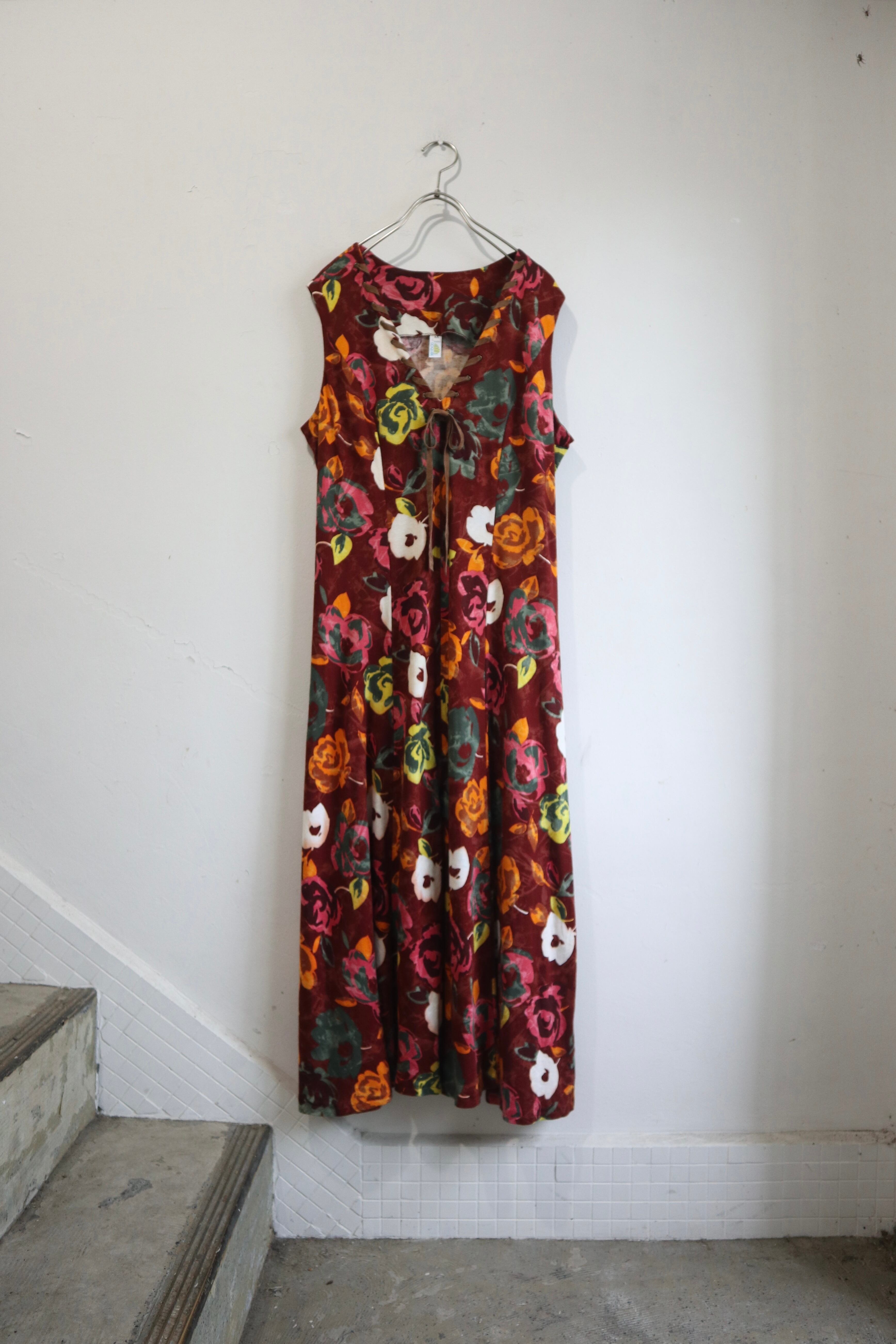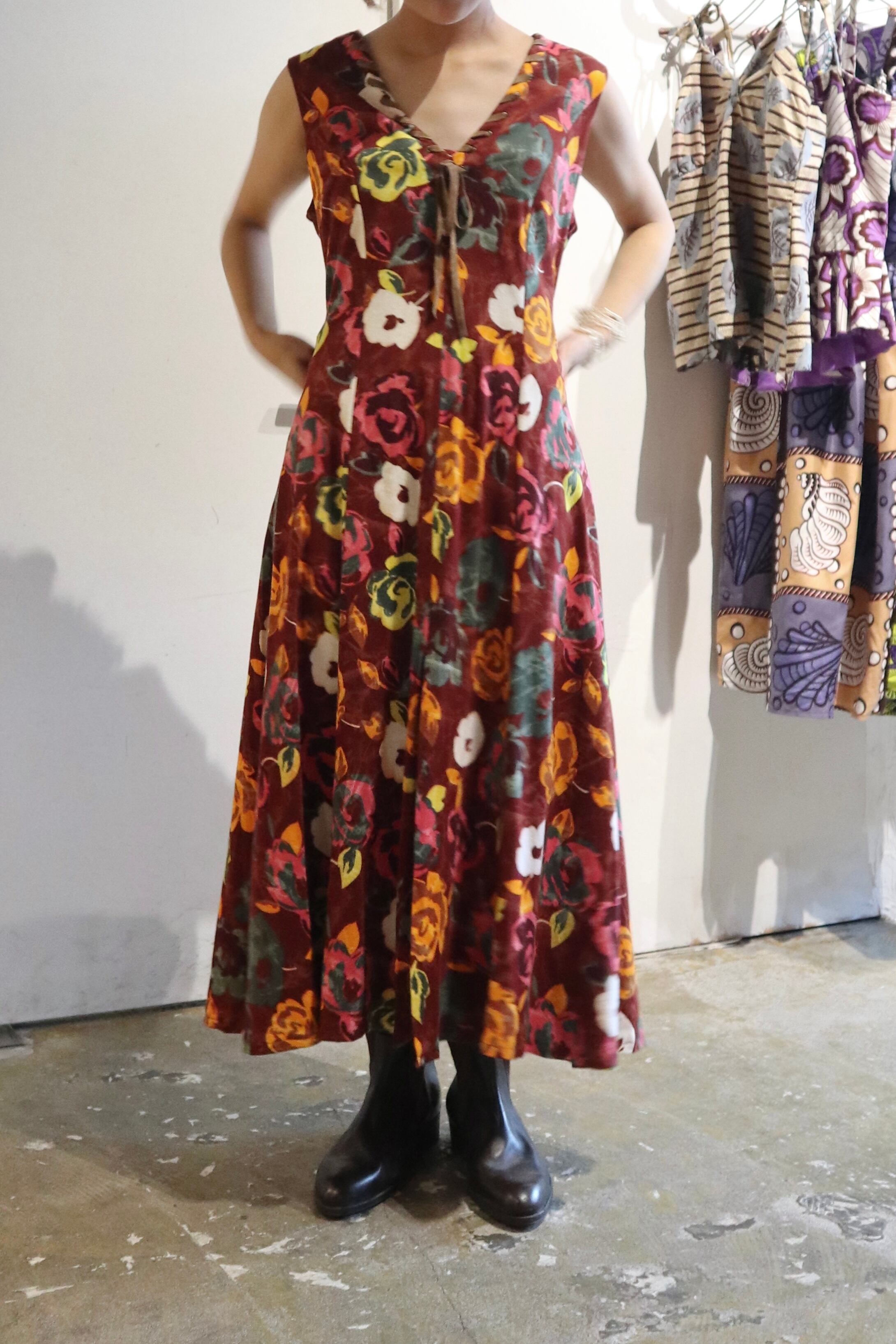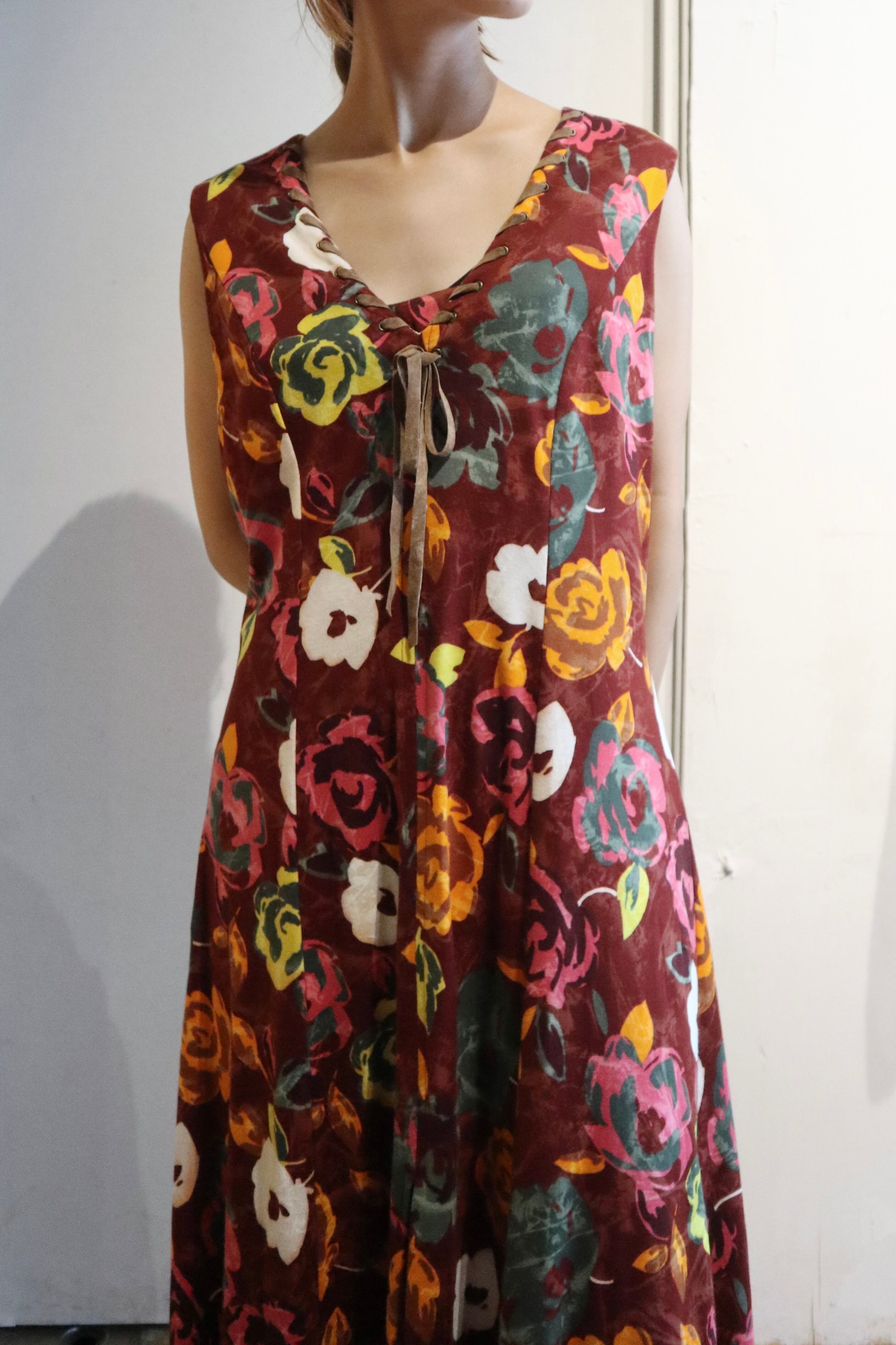 カラフルな花柄プリントに首元のレースアップのディテールが可愛らしく、ベースのブラウンカラーが上品で秋口まで使いやすいワンピース