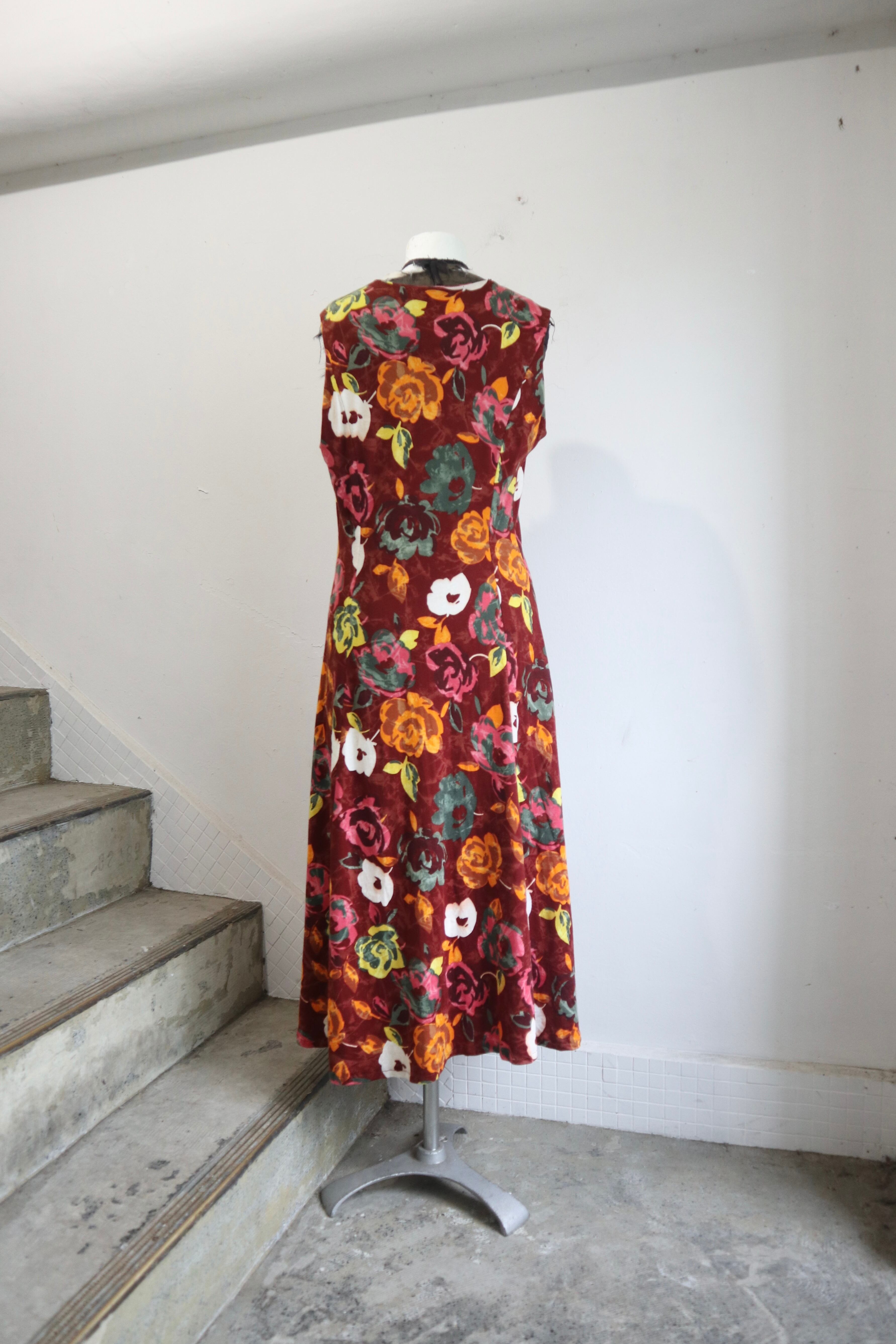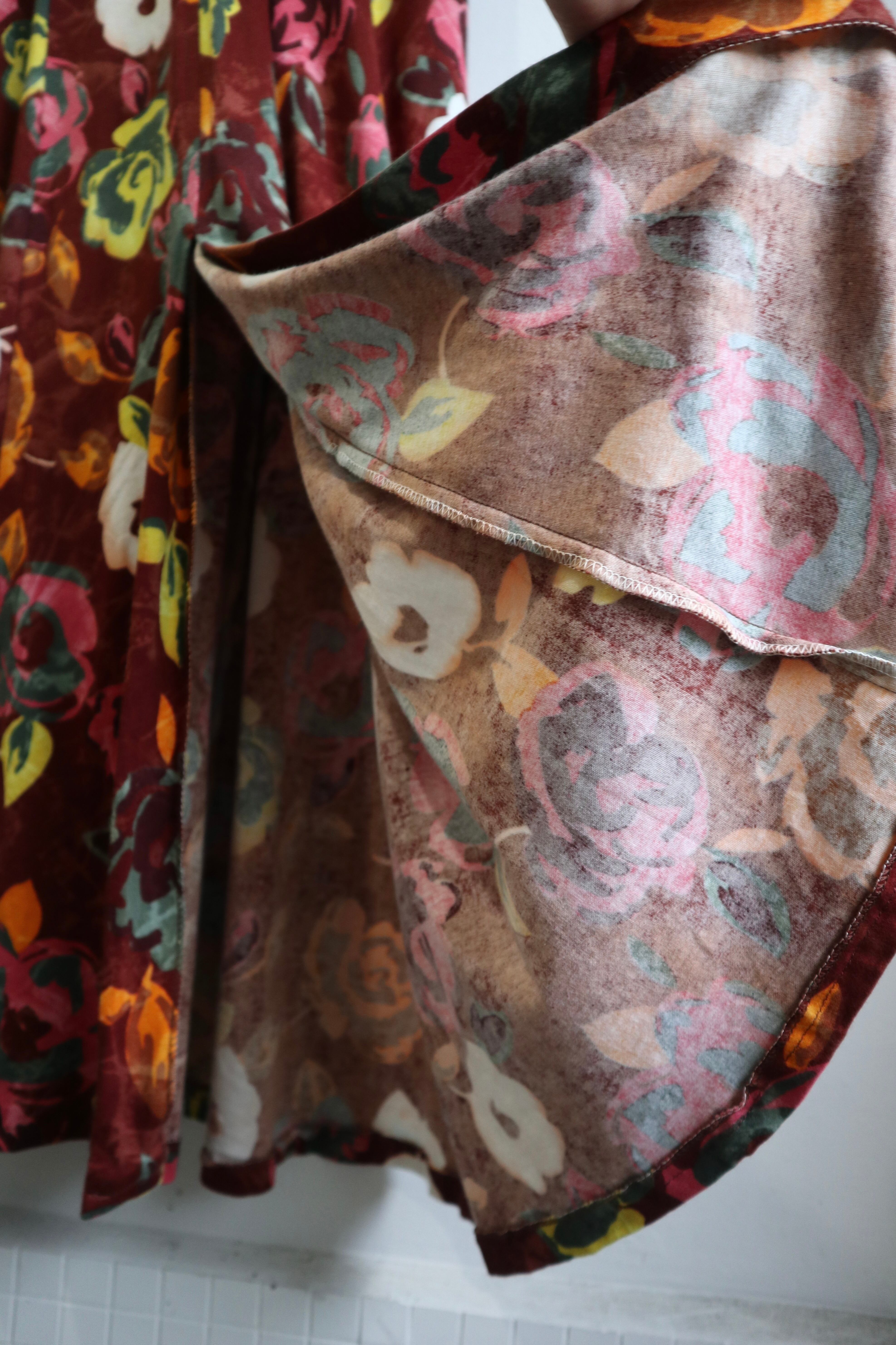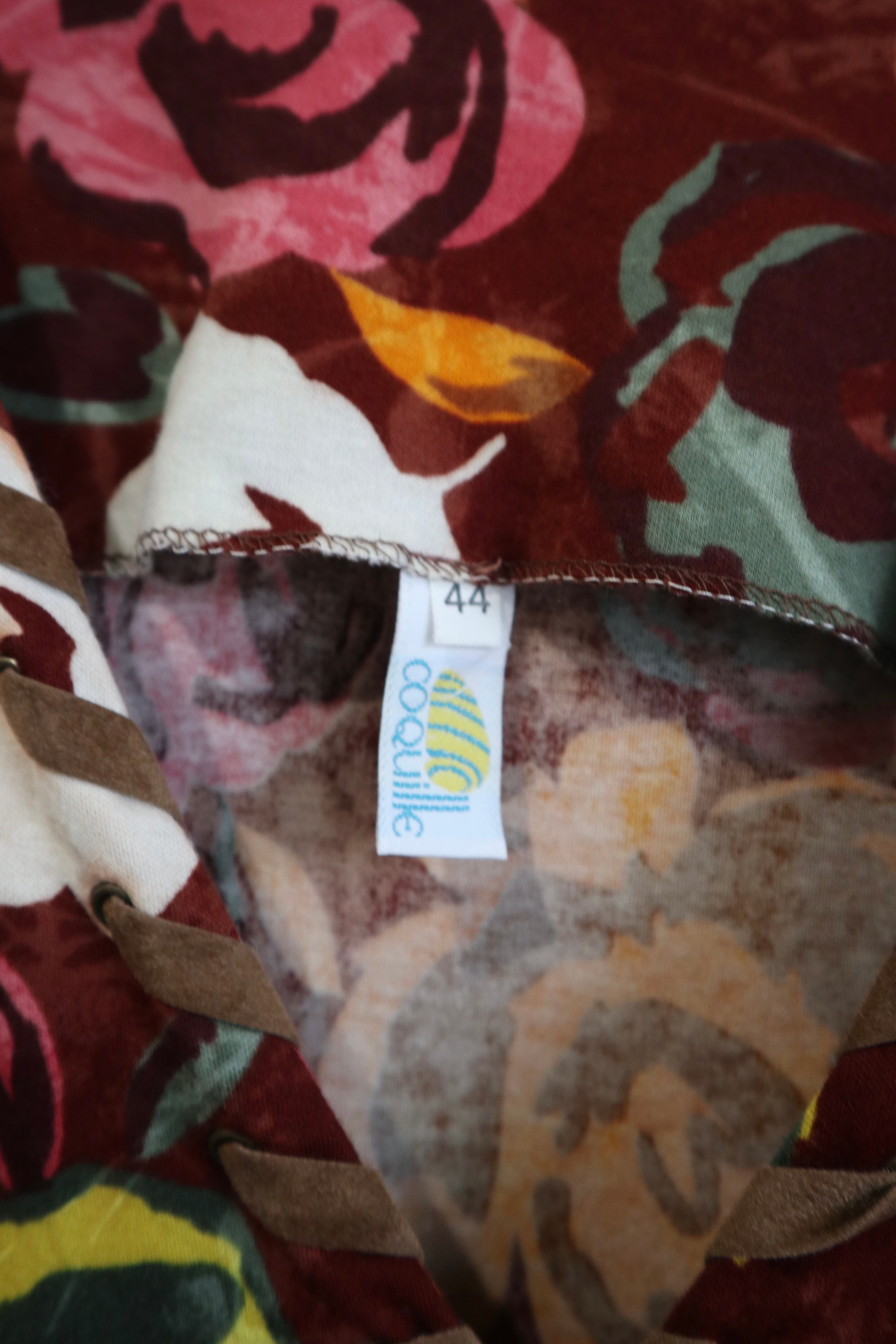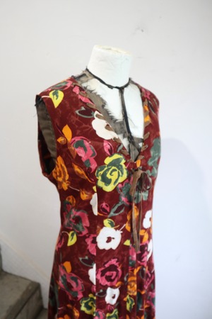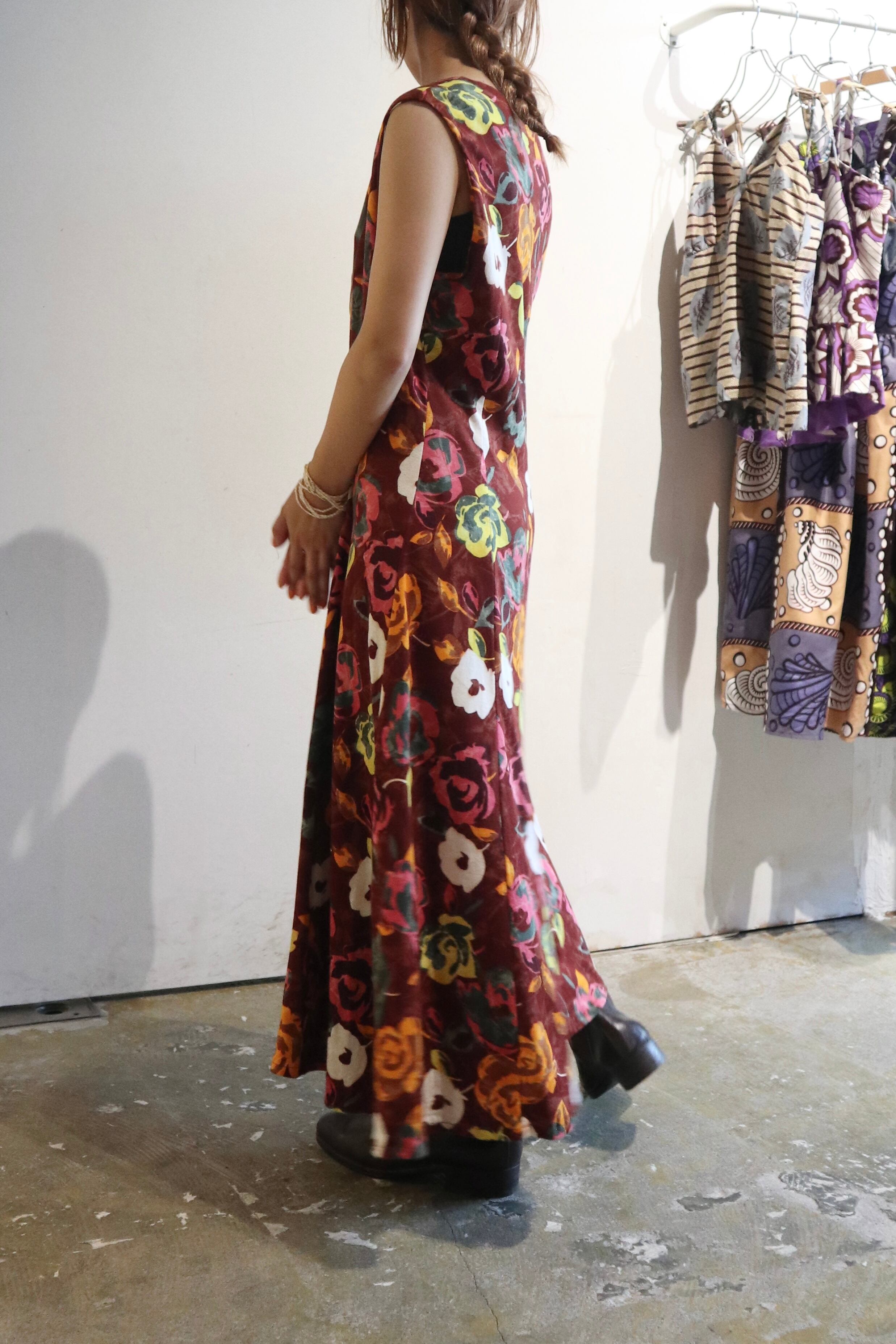 カラフルな花柄プリントに首元のレースアップのディテールが可愛らしく、ベースのブラウンカラーが上品で秋口まで使いやすいワンピース