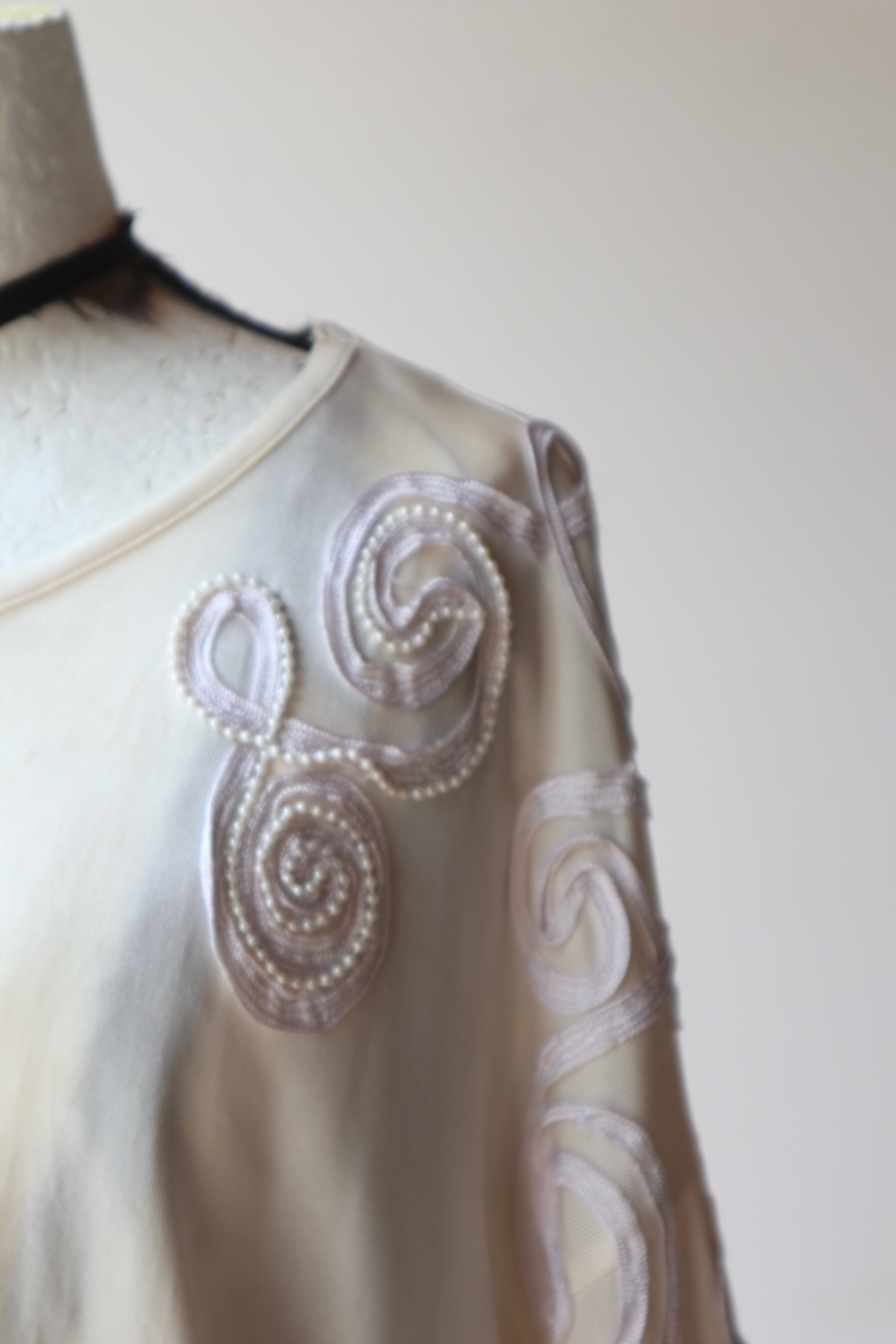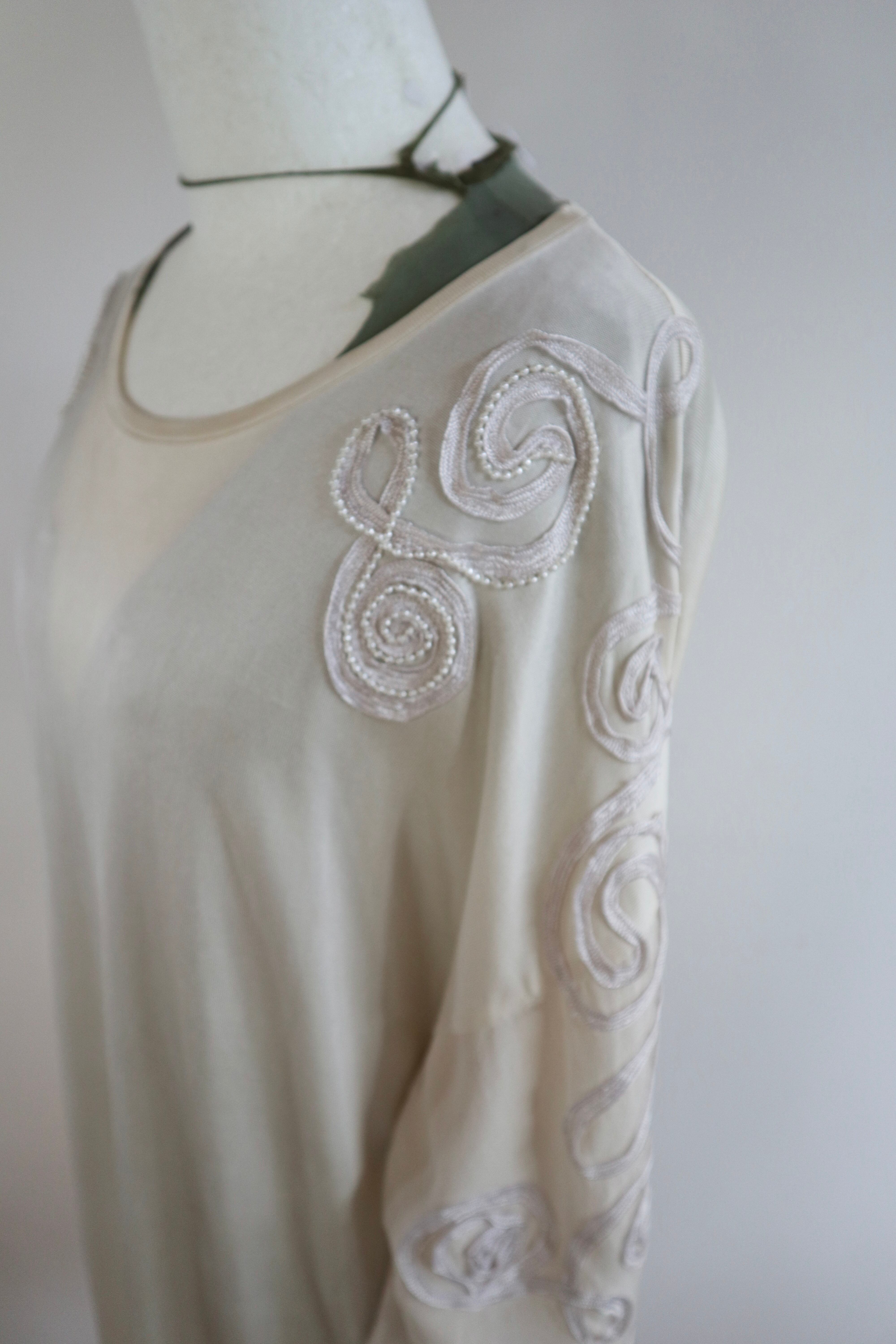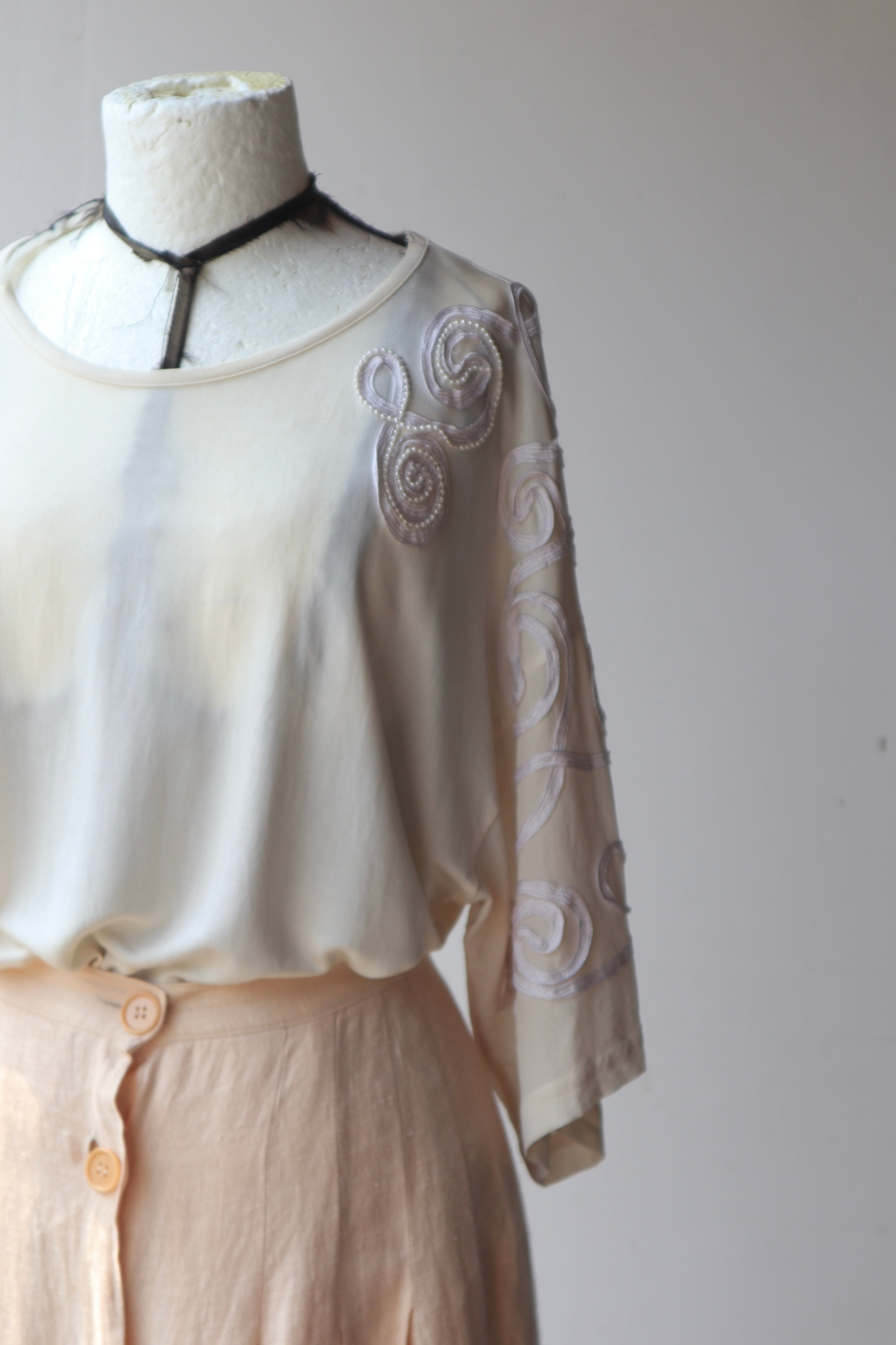繊細なシルク素材にくるくると装飾刺繍が立体的に施されたヴィンテージシルクトップス