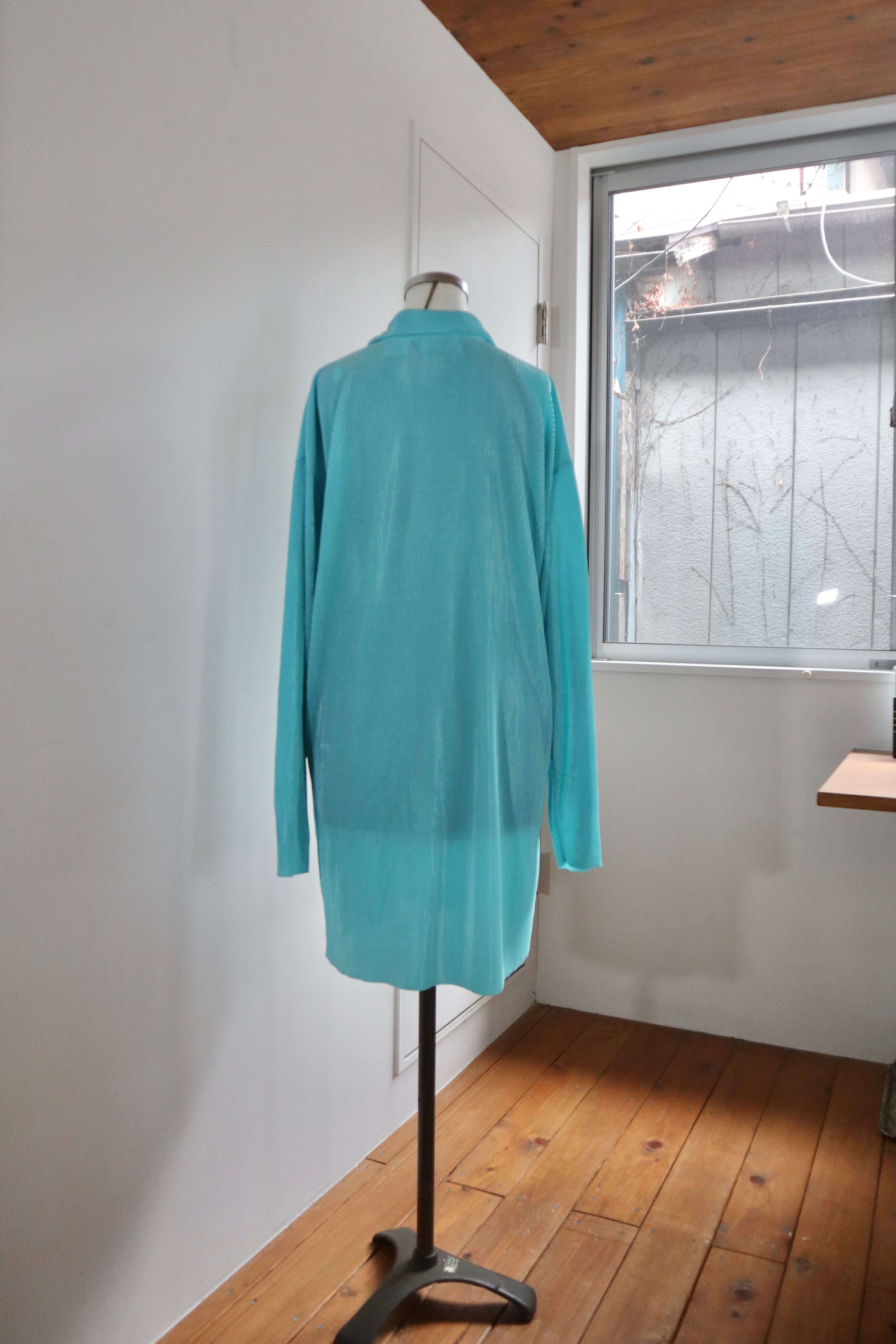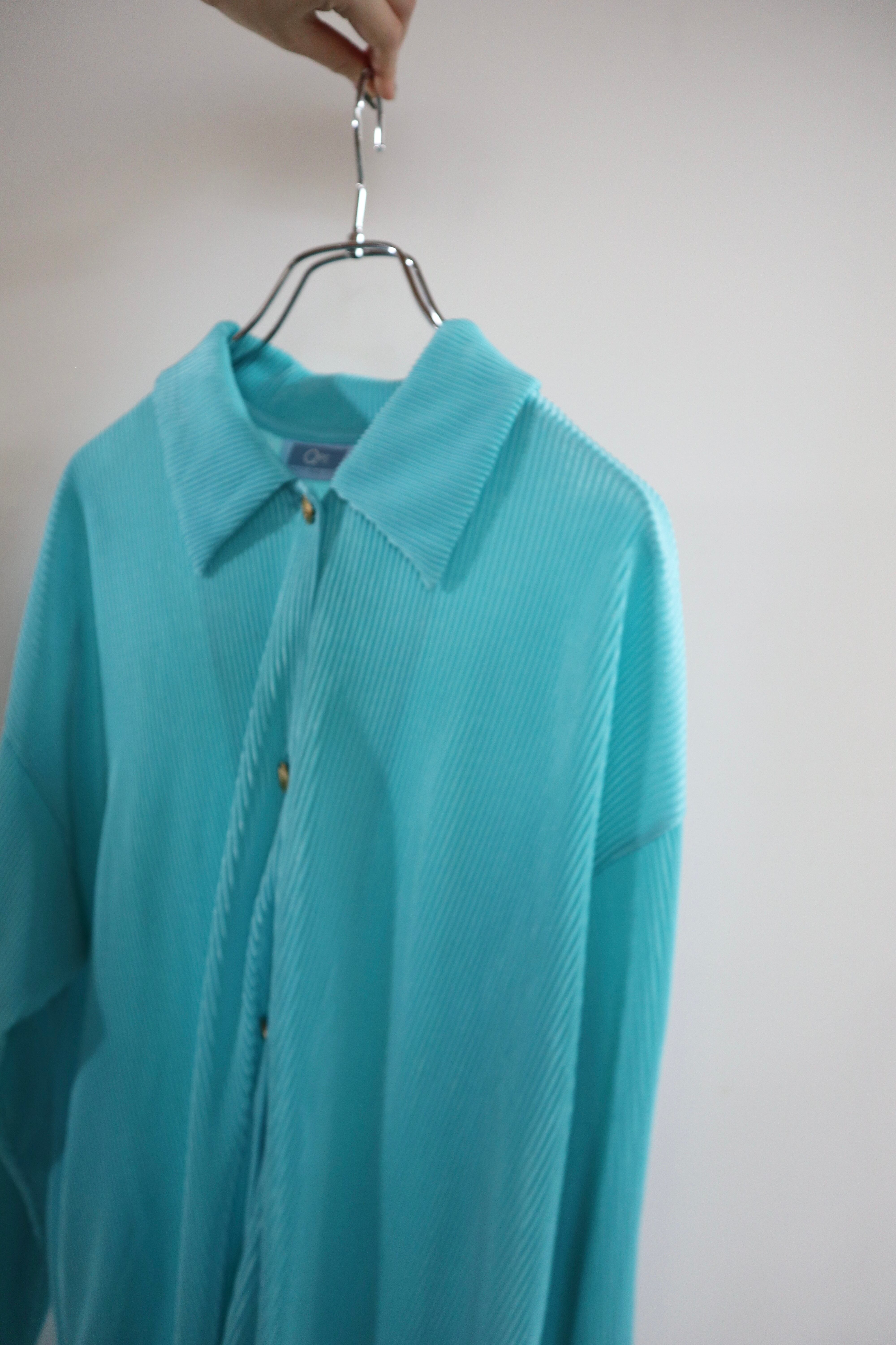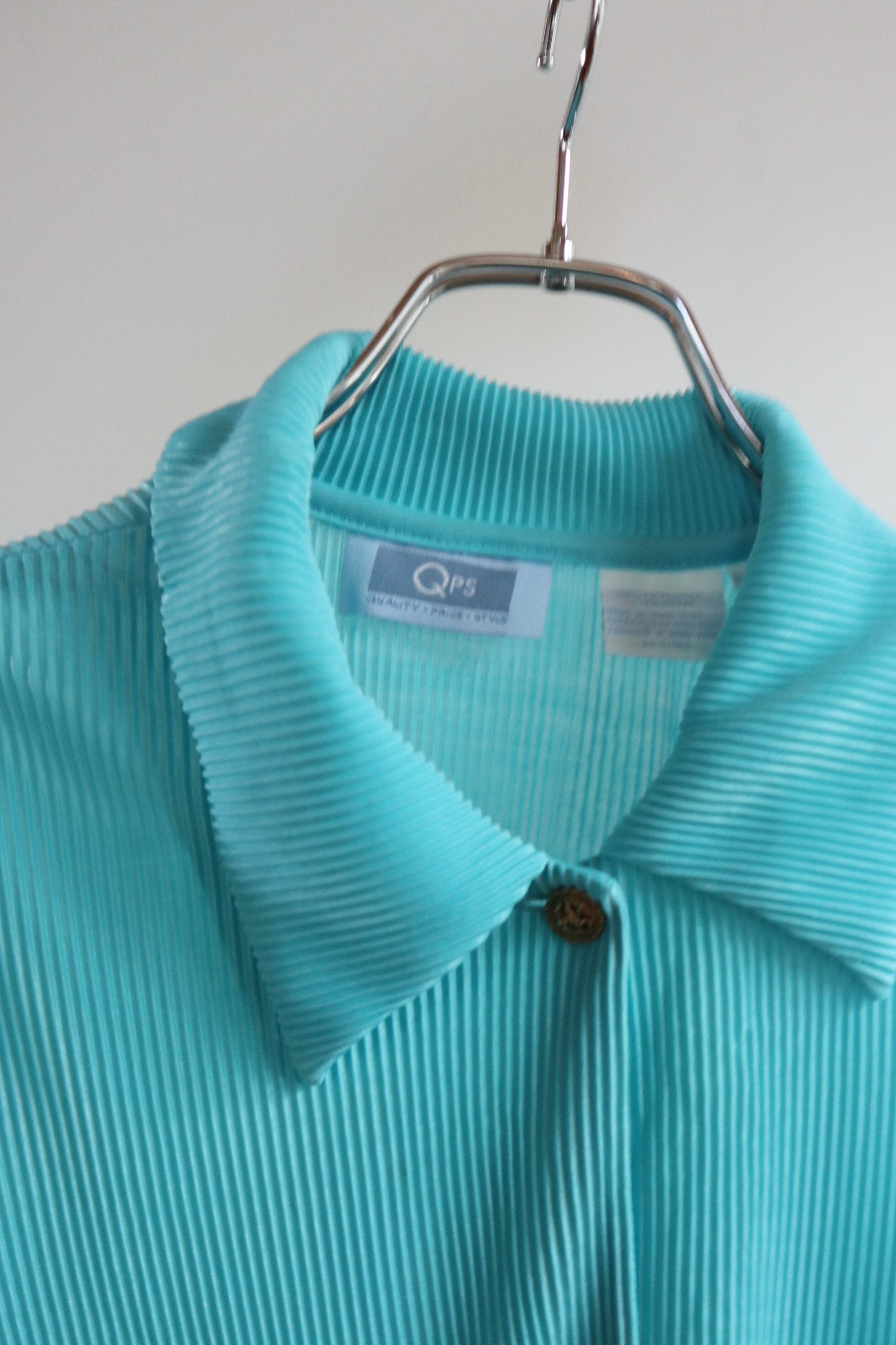 ターコイズブルーのような色鮮やかなプリーツシャツ