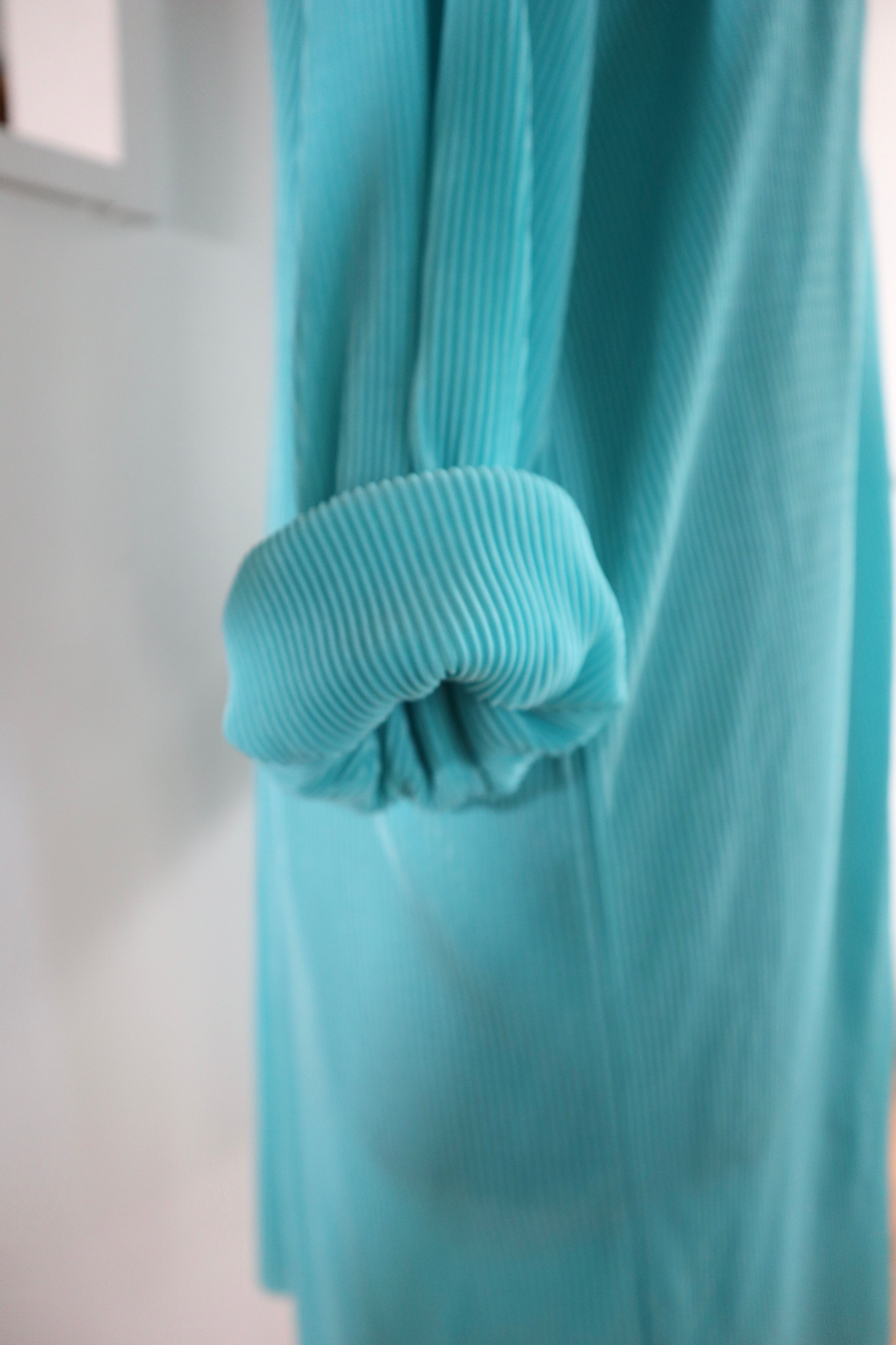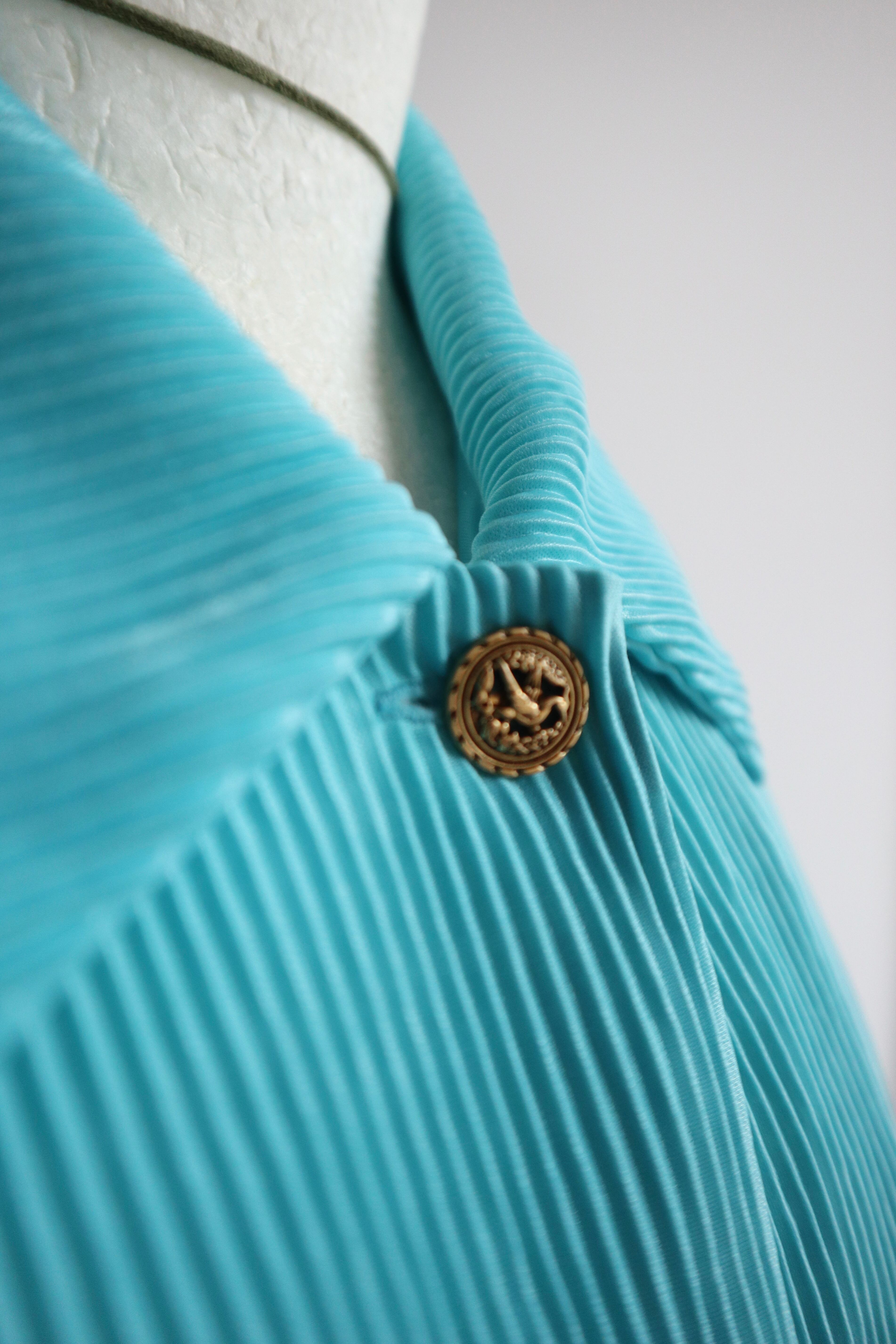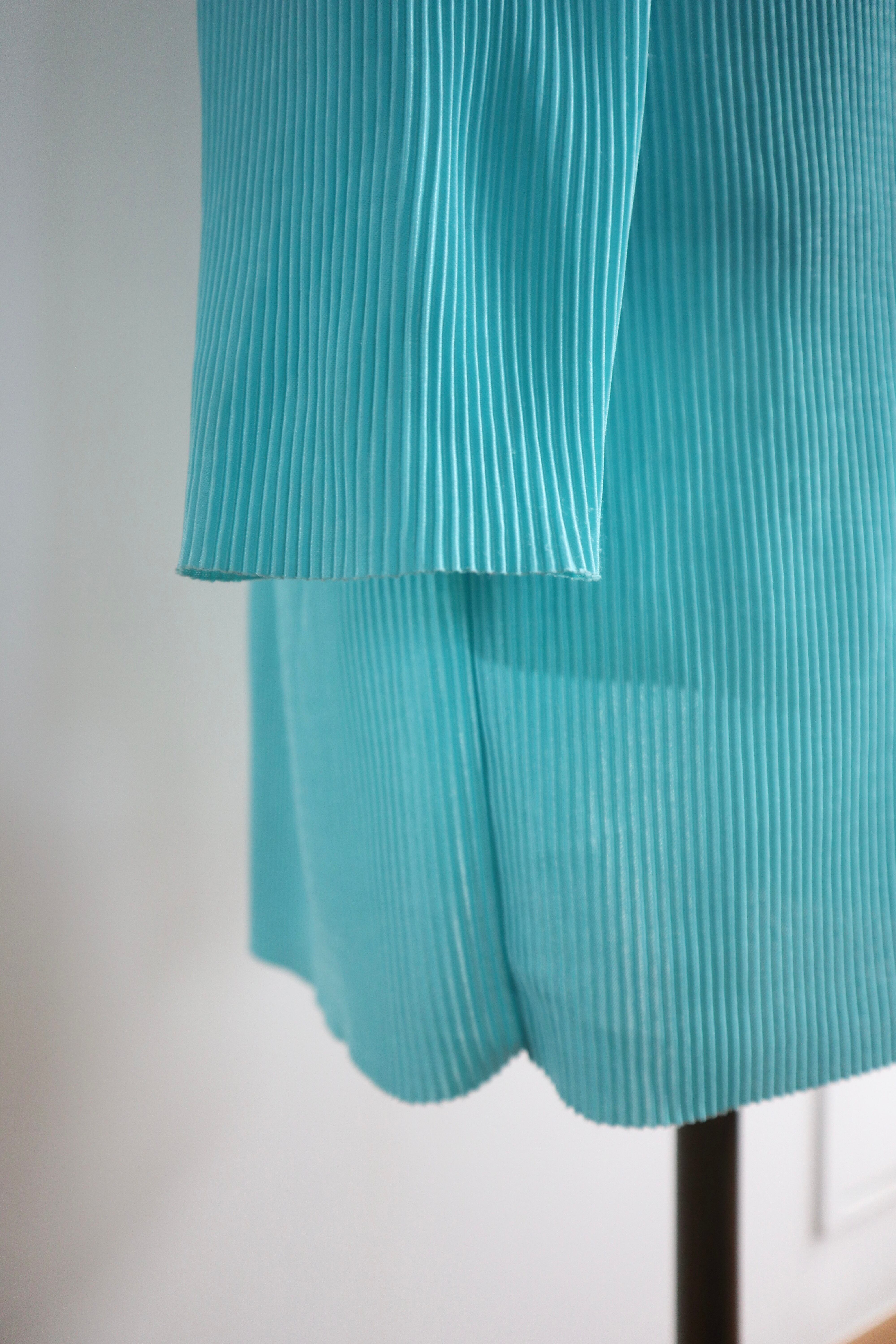 ターコイズブルーのような色鮮やかなプリーツシャツ