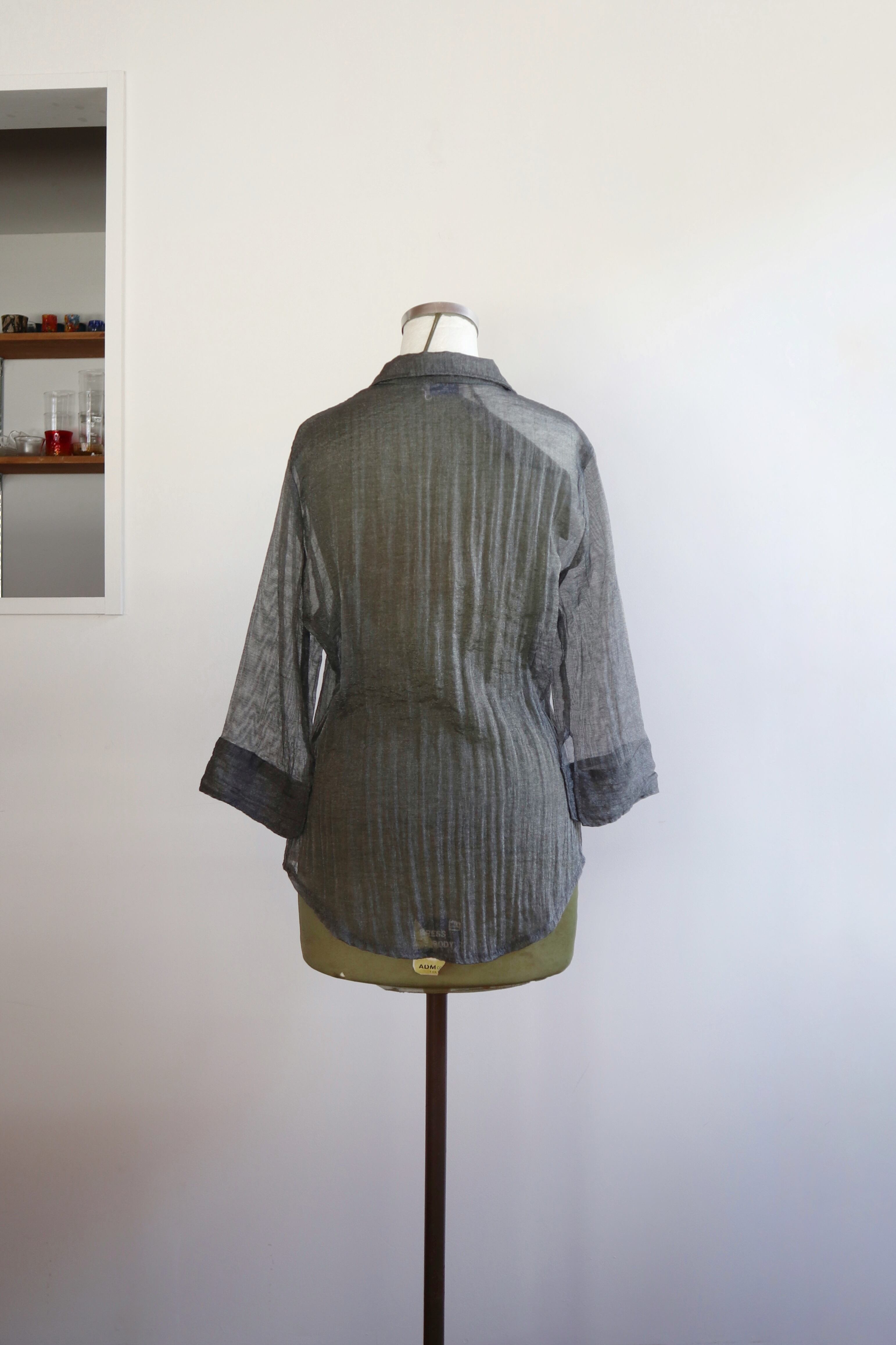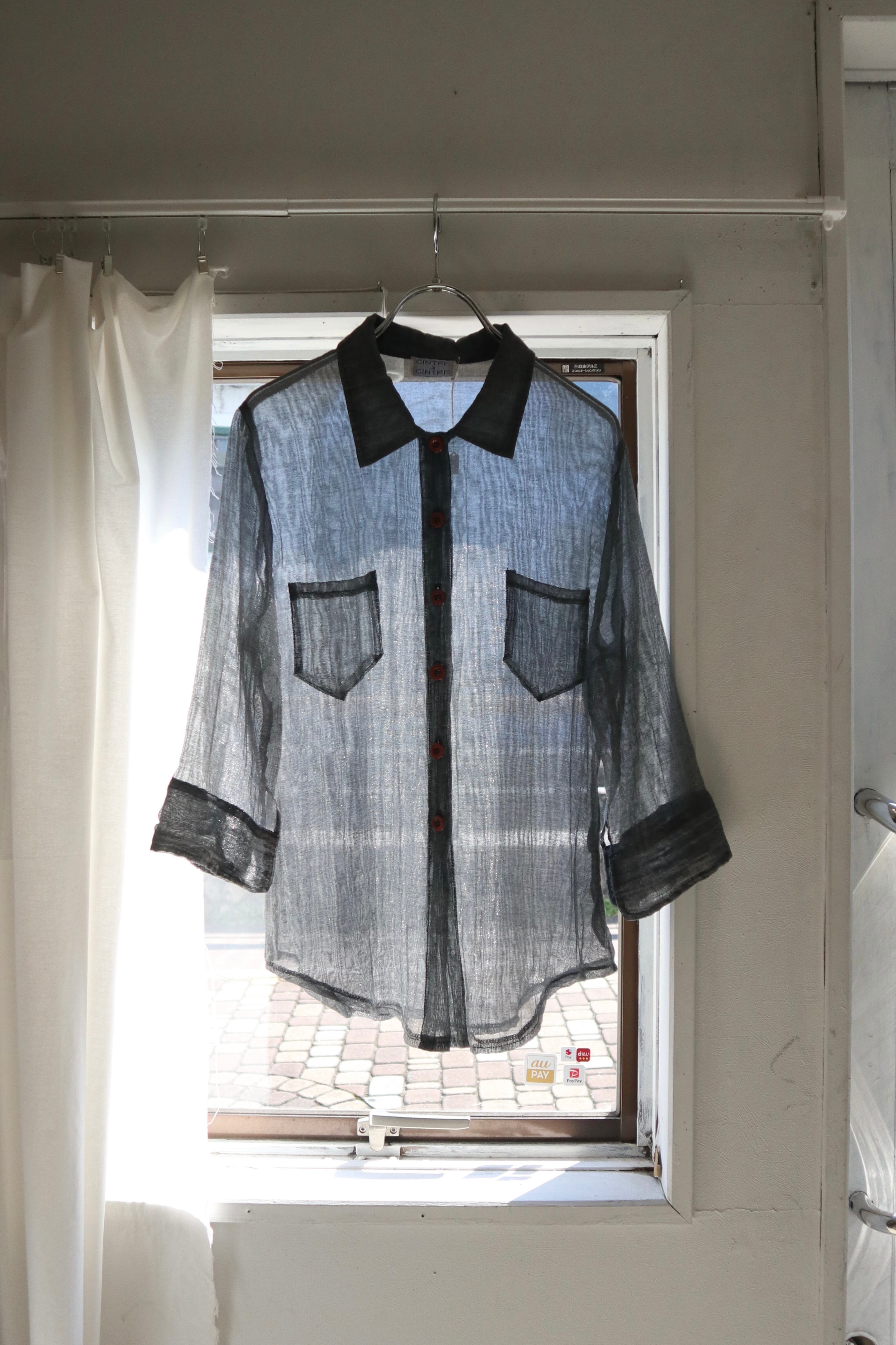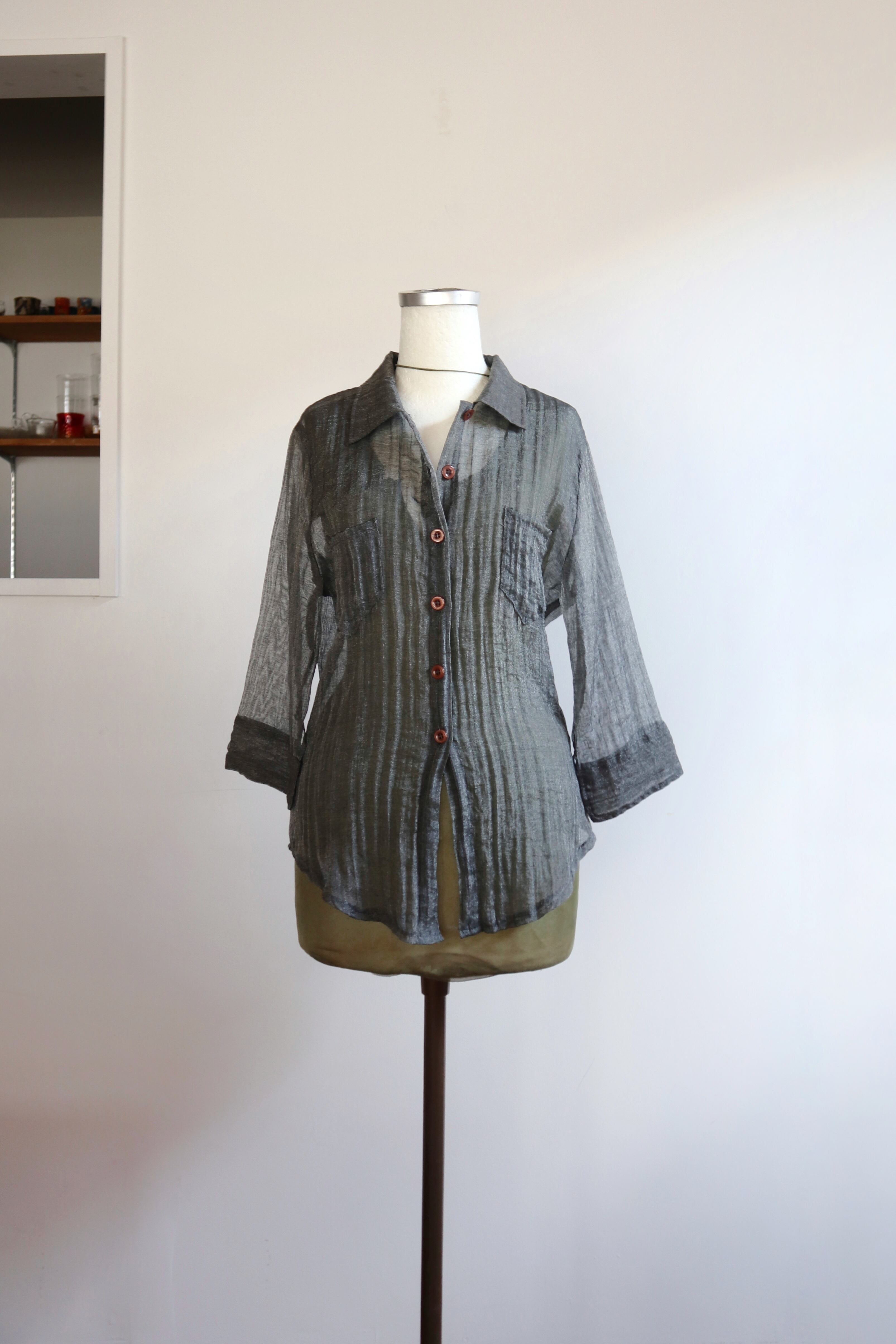 ラメのような光沢感のあるグレー色のシアーシャツ。