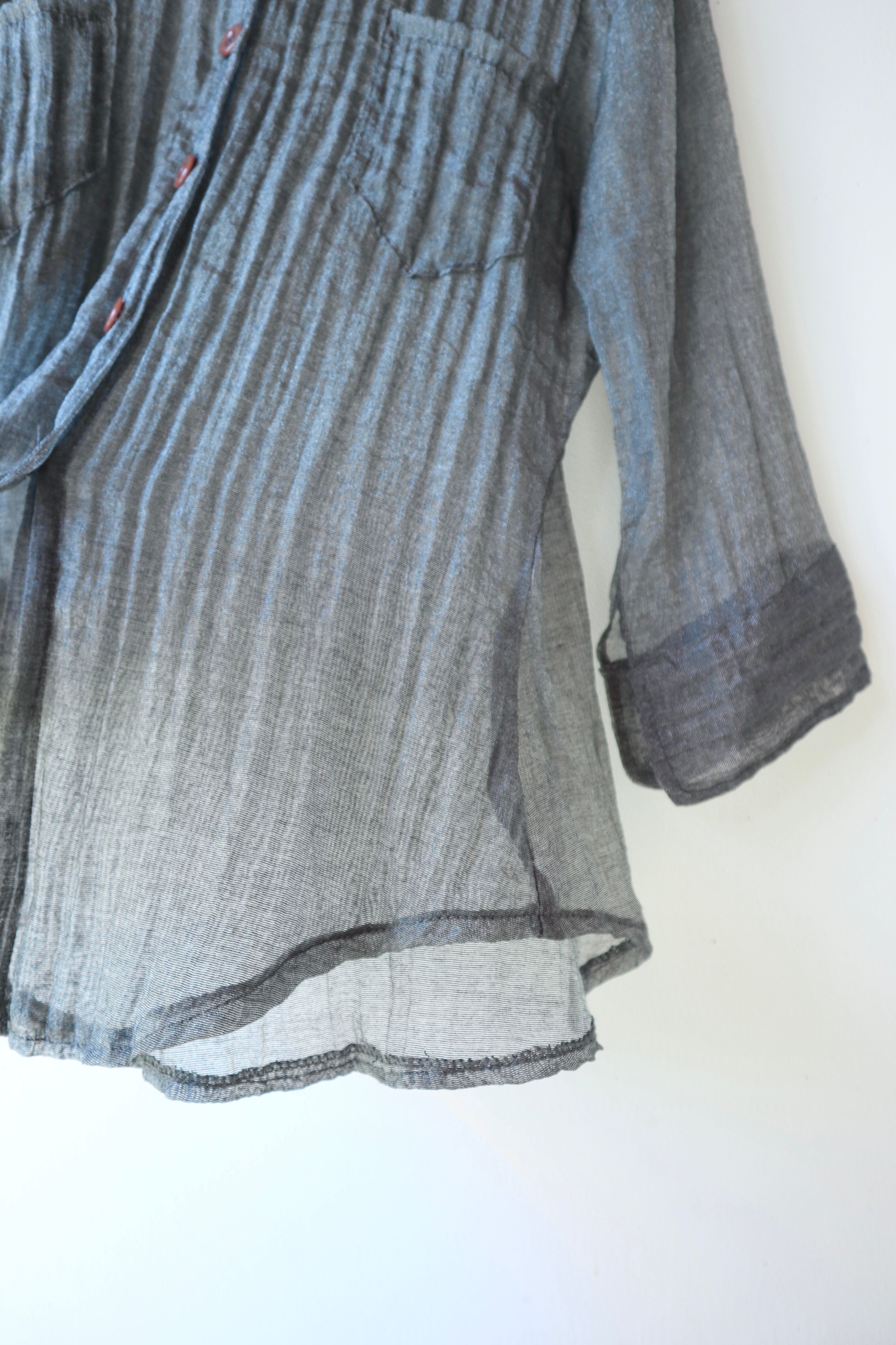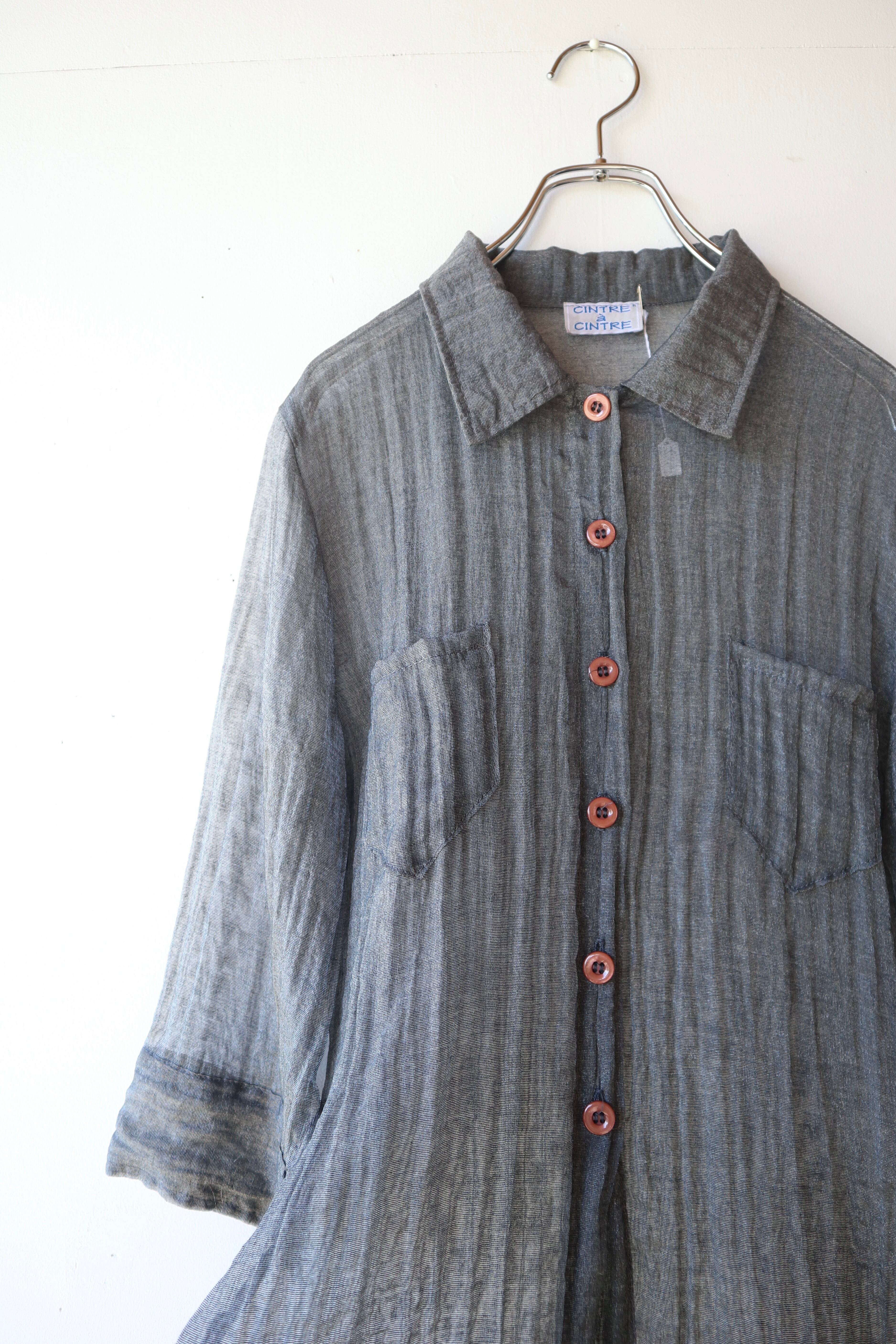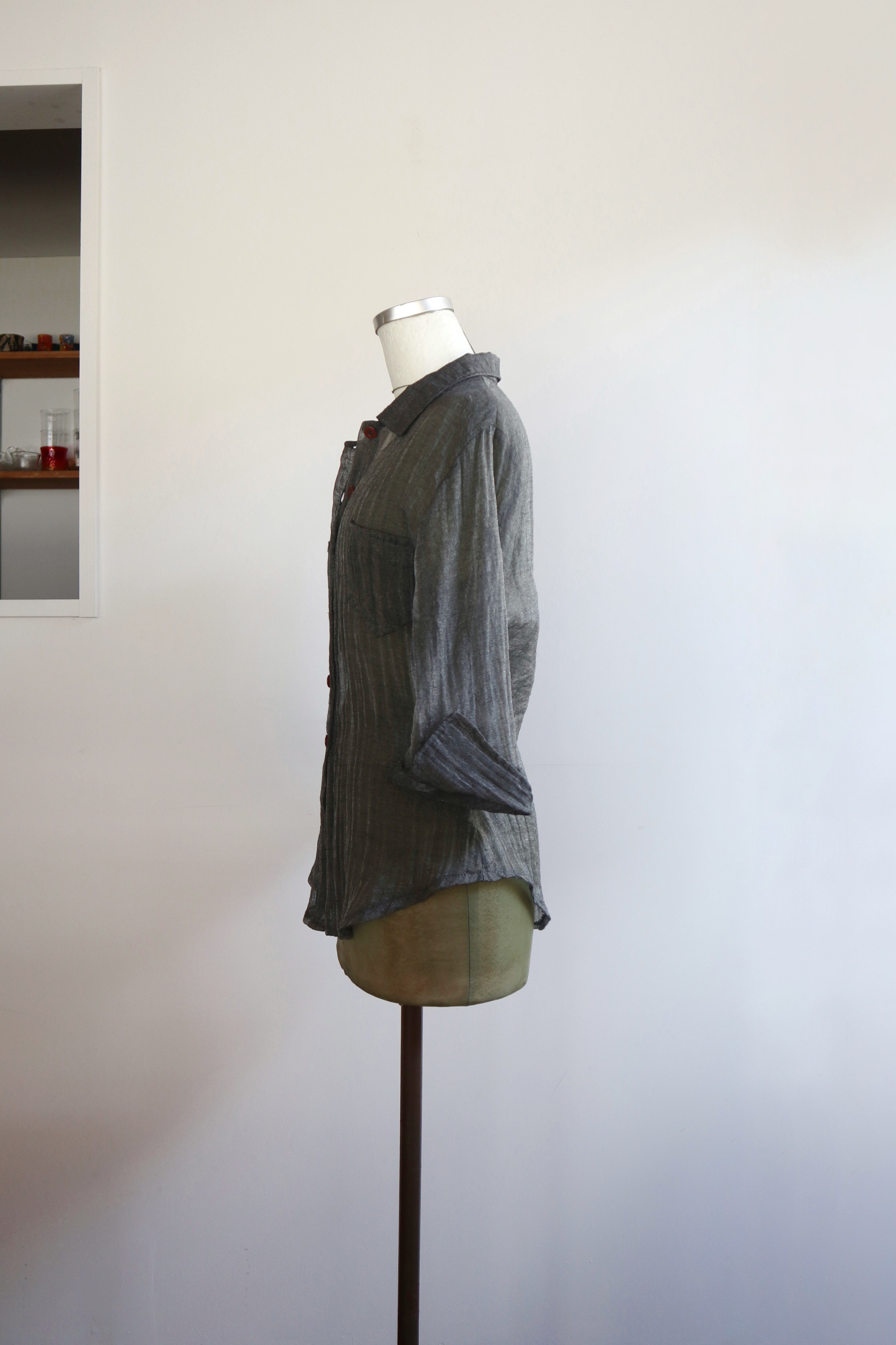 ラメのような光沢感のあるグレー色のシアーシャツ。