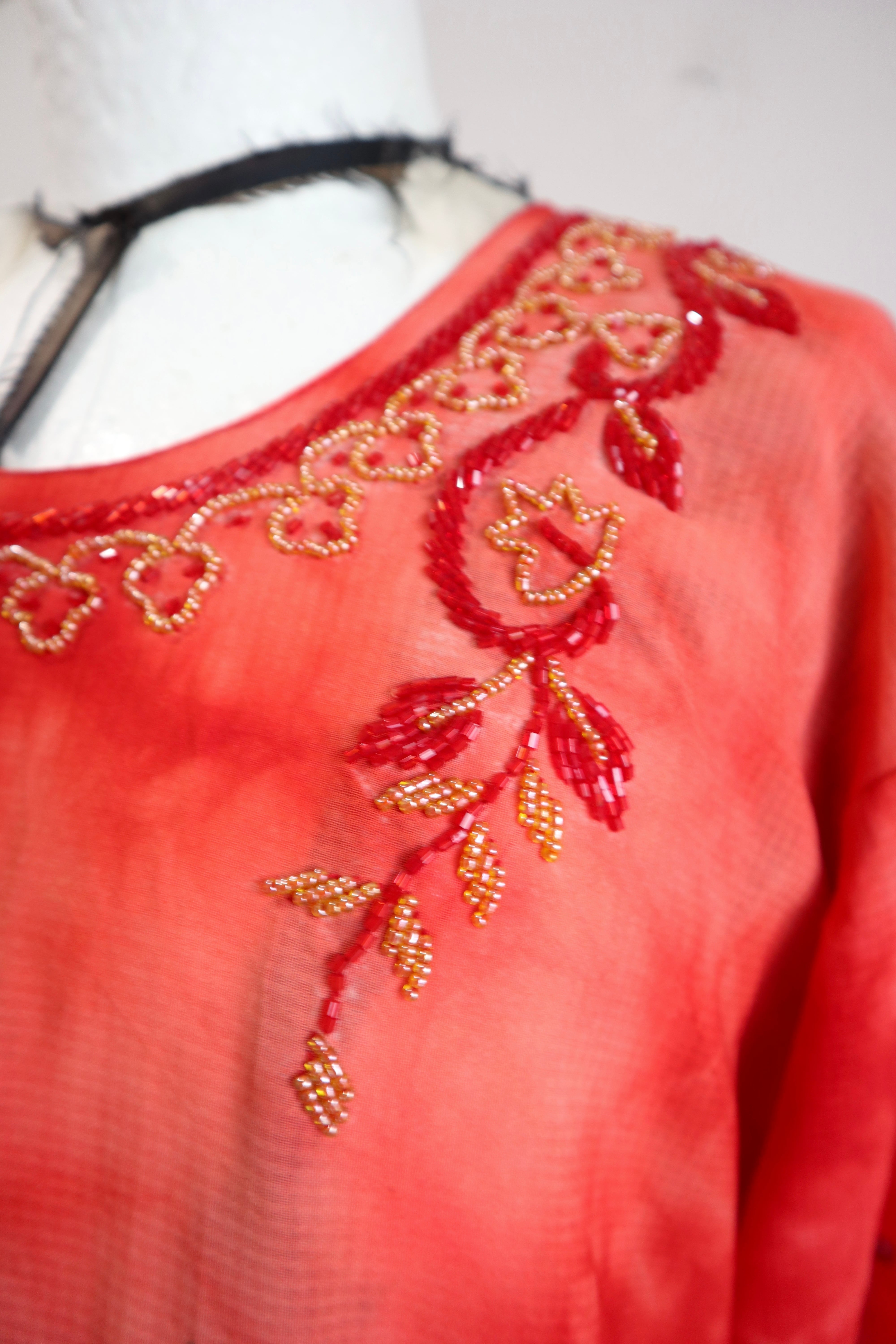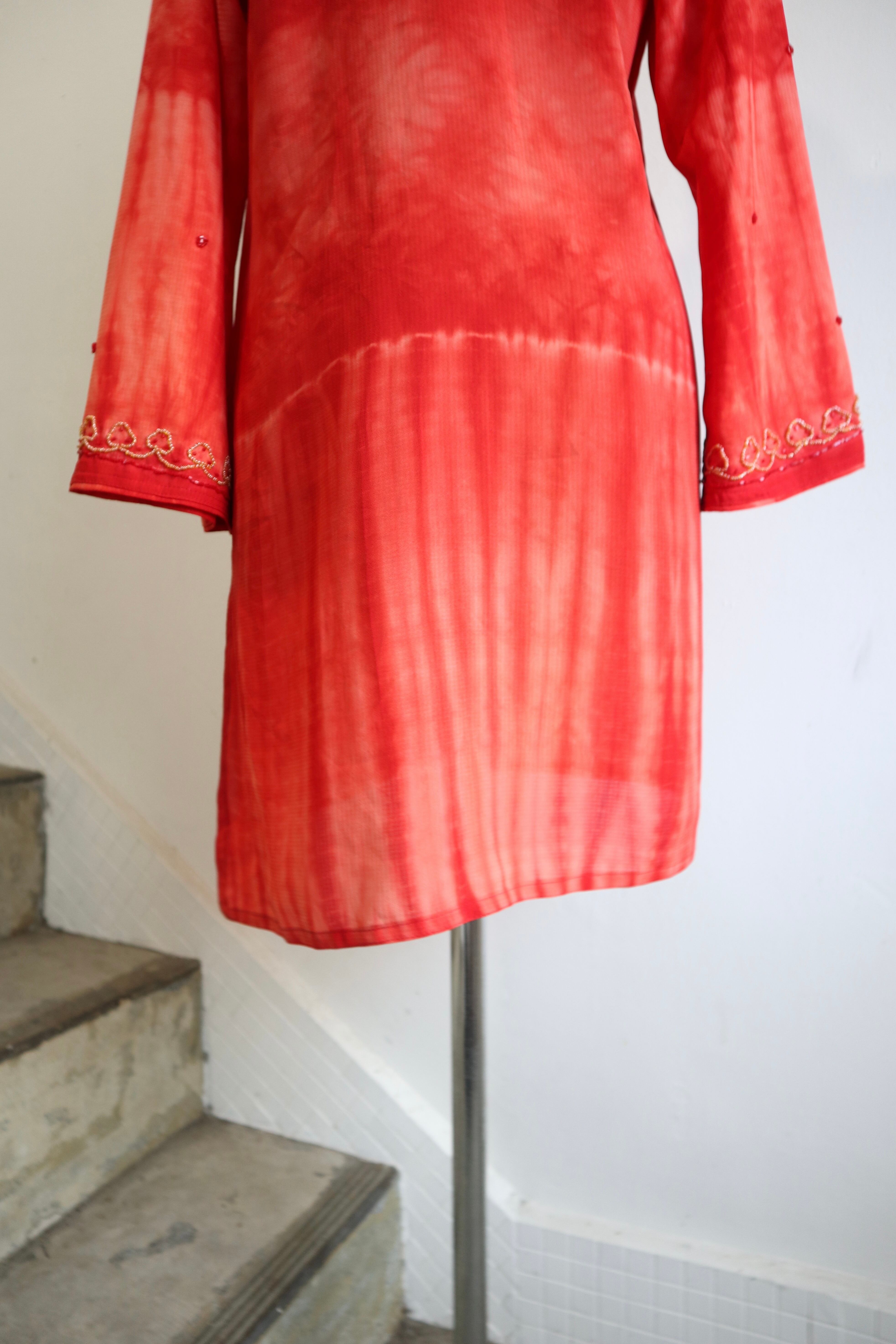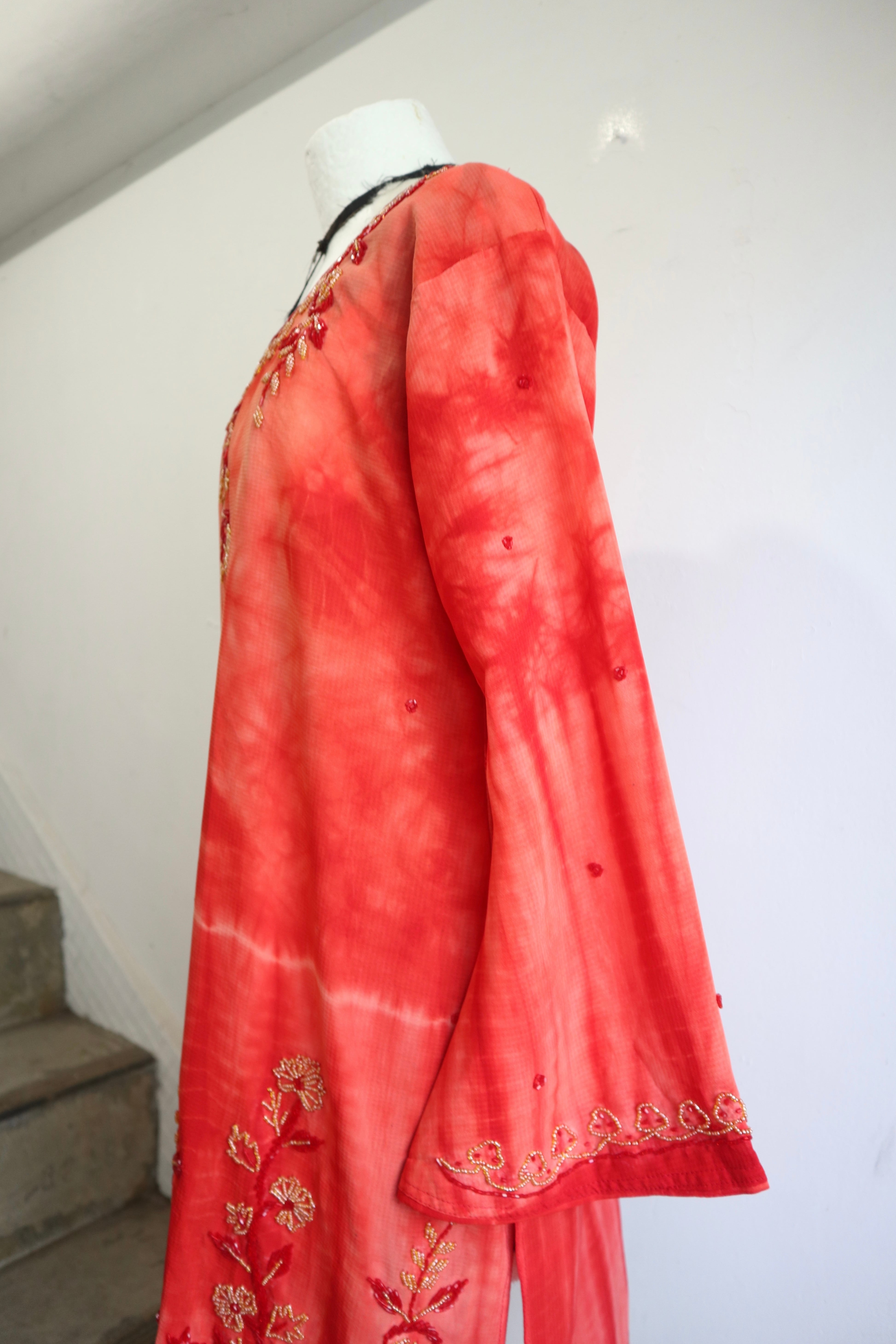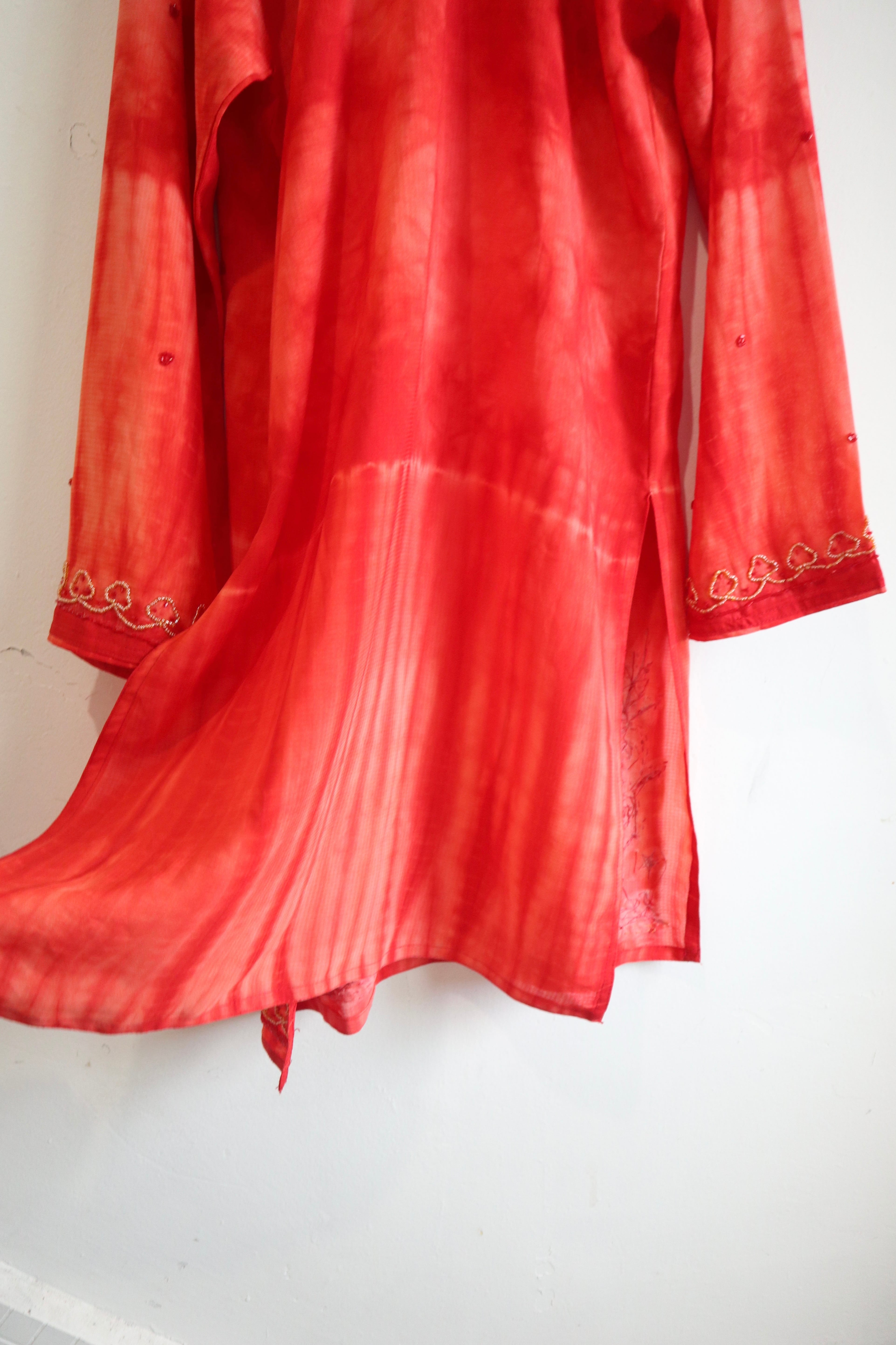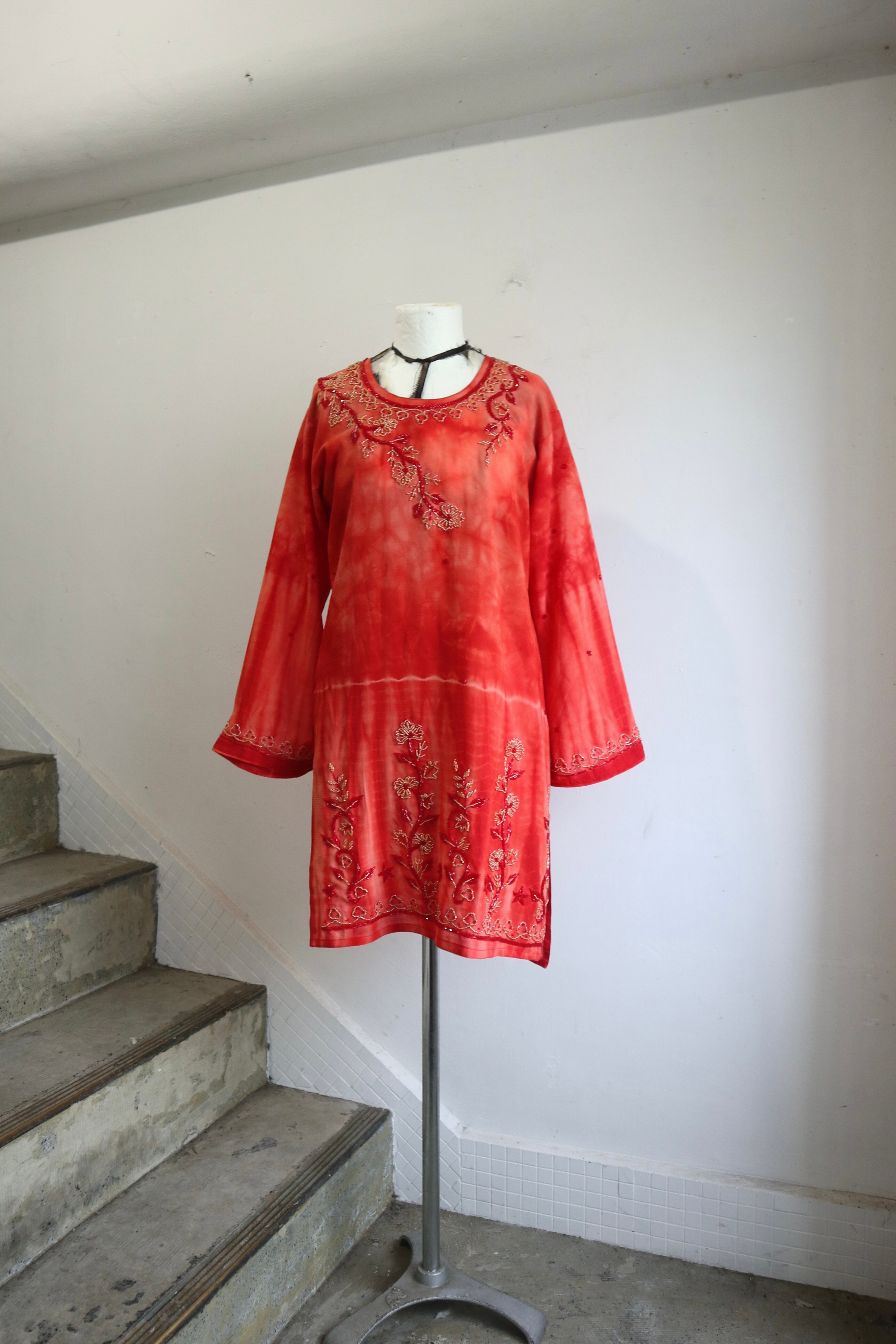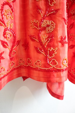 赤をベースとした贅沢なビーズ刺繍やタイダイ柄プリントがエスニックの雰囲気たっぷりな特別な一着。