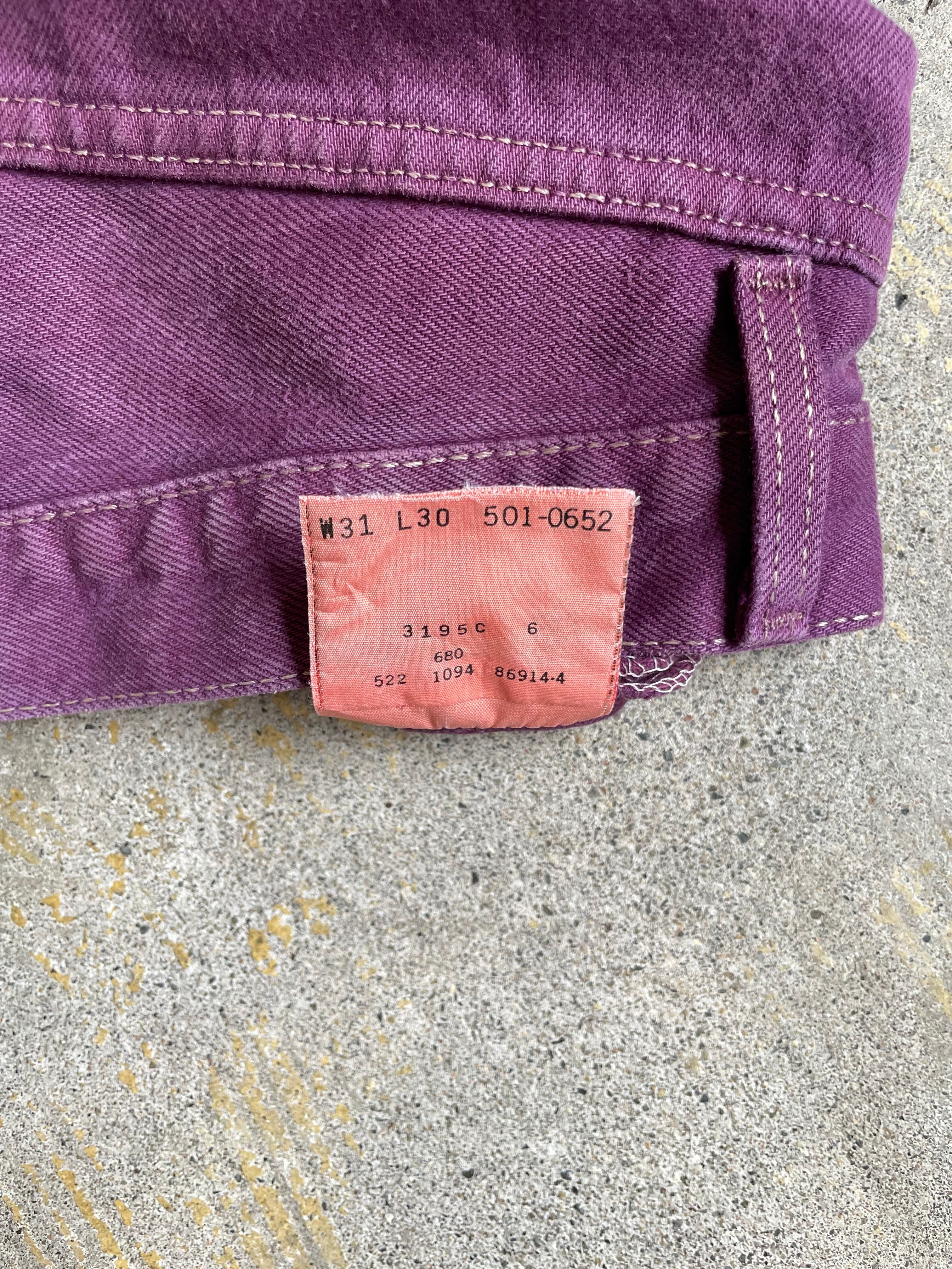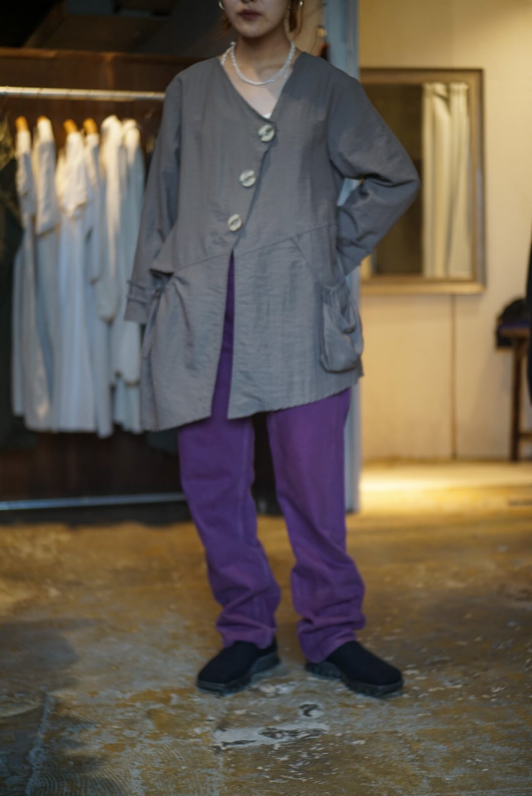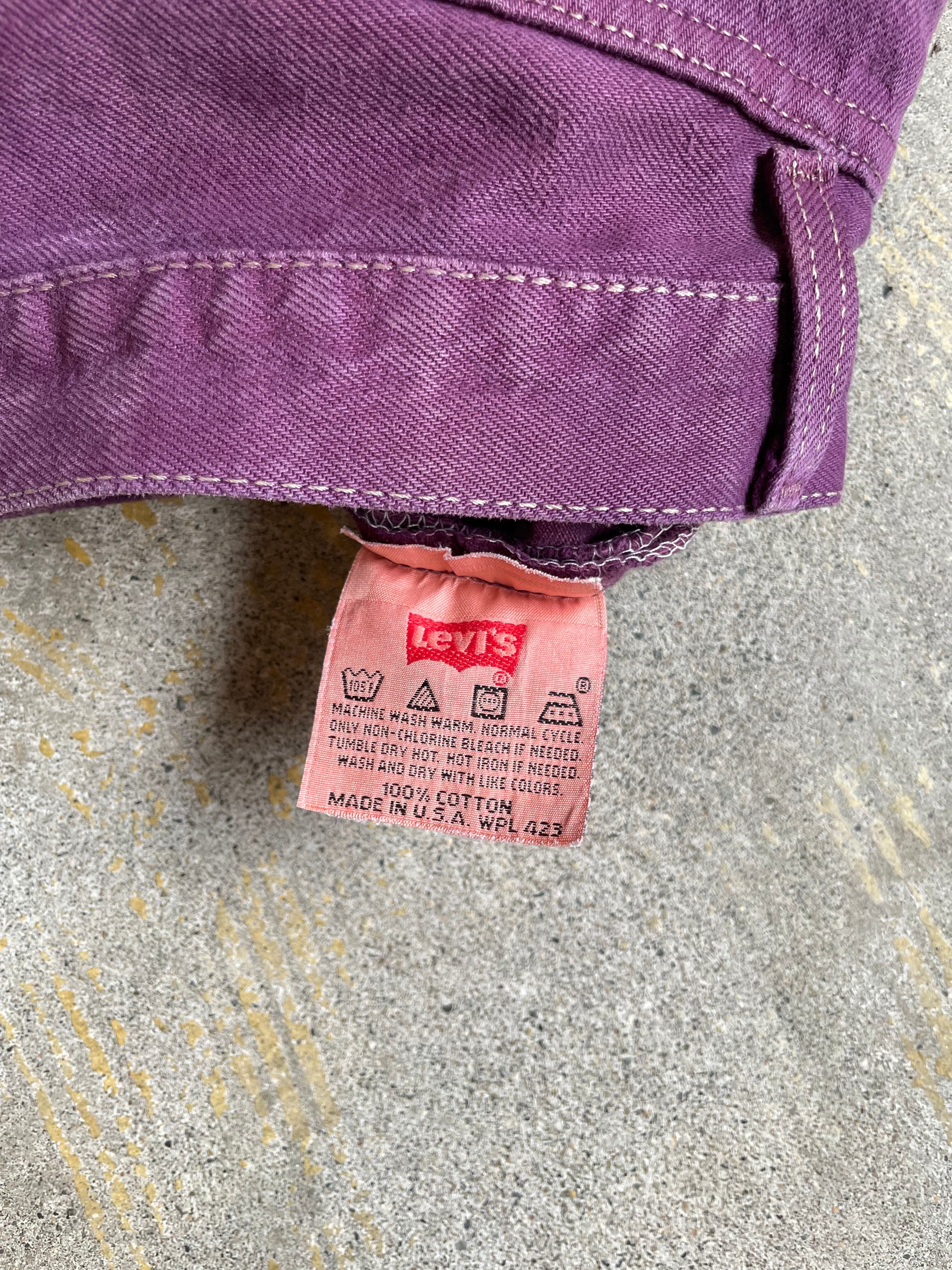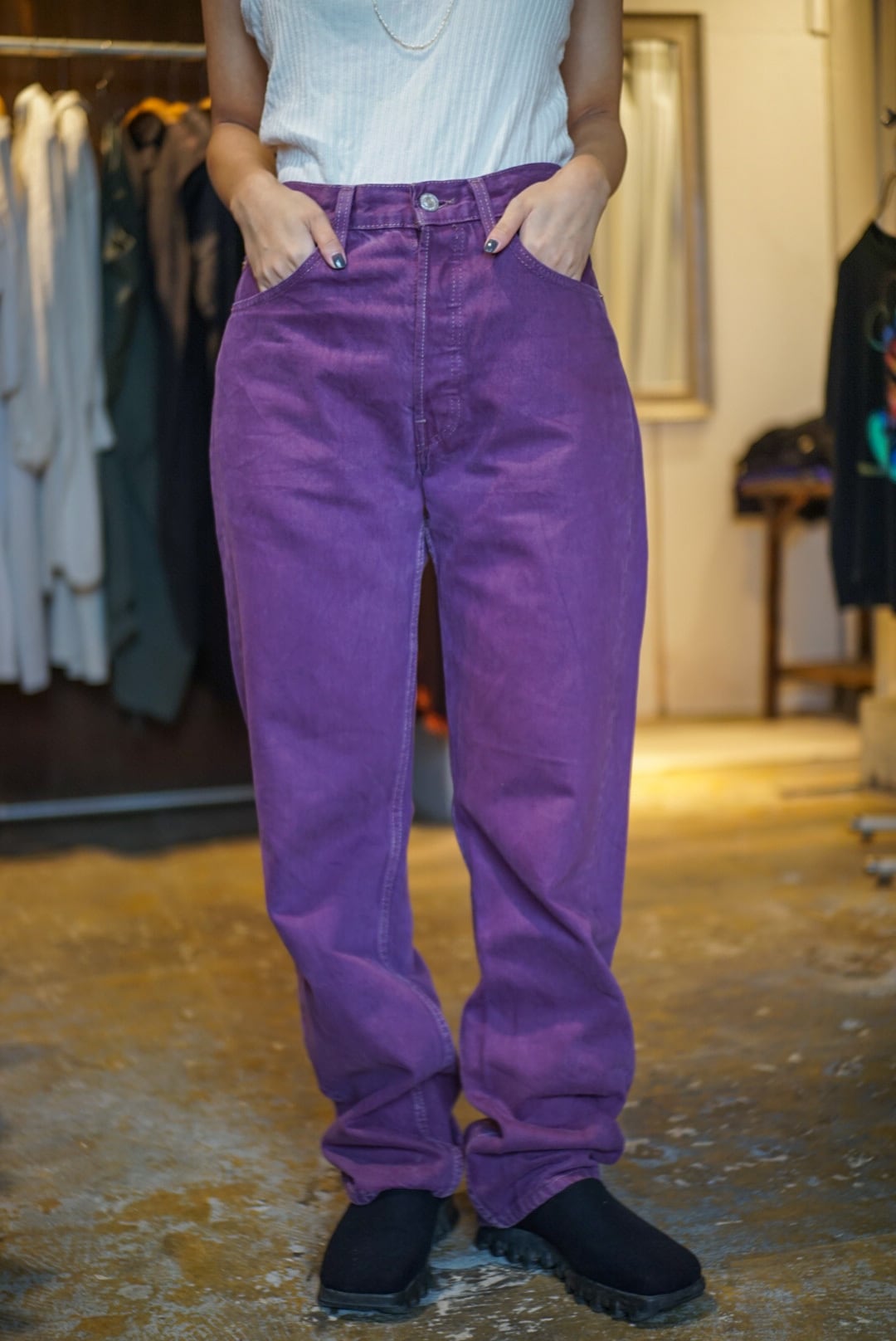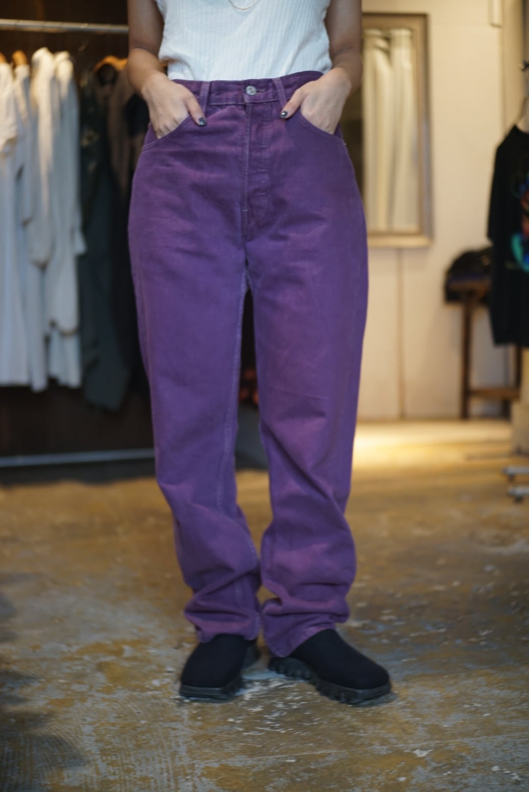 パープルカラーに後染めしたデニムパンツ
