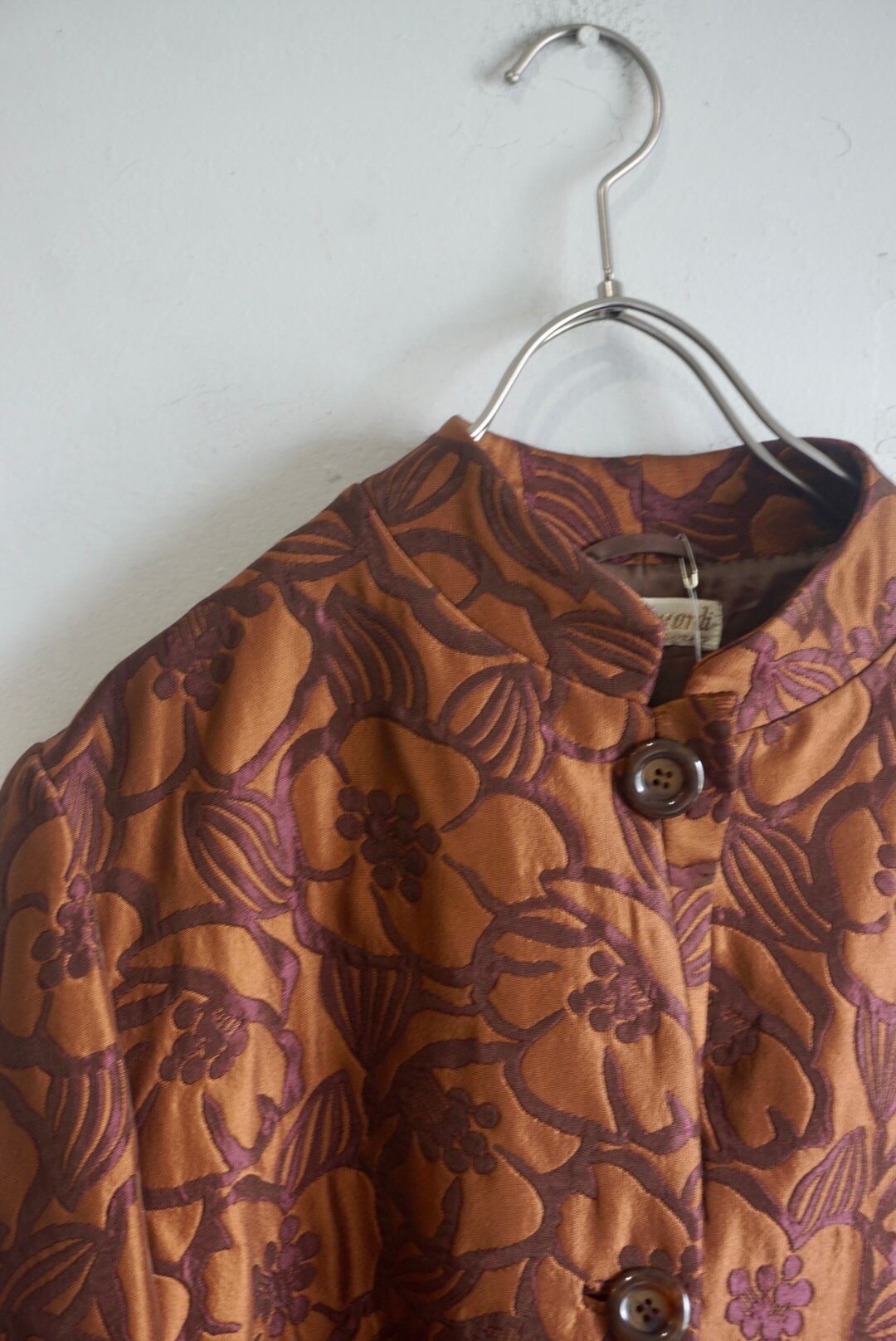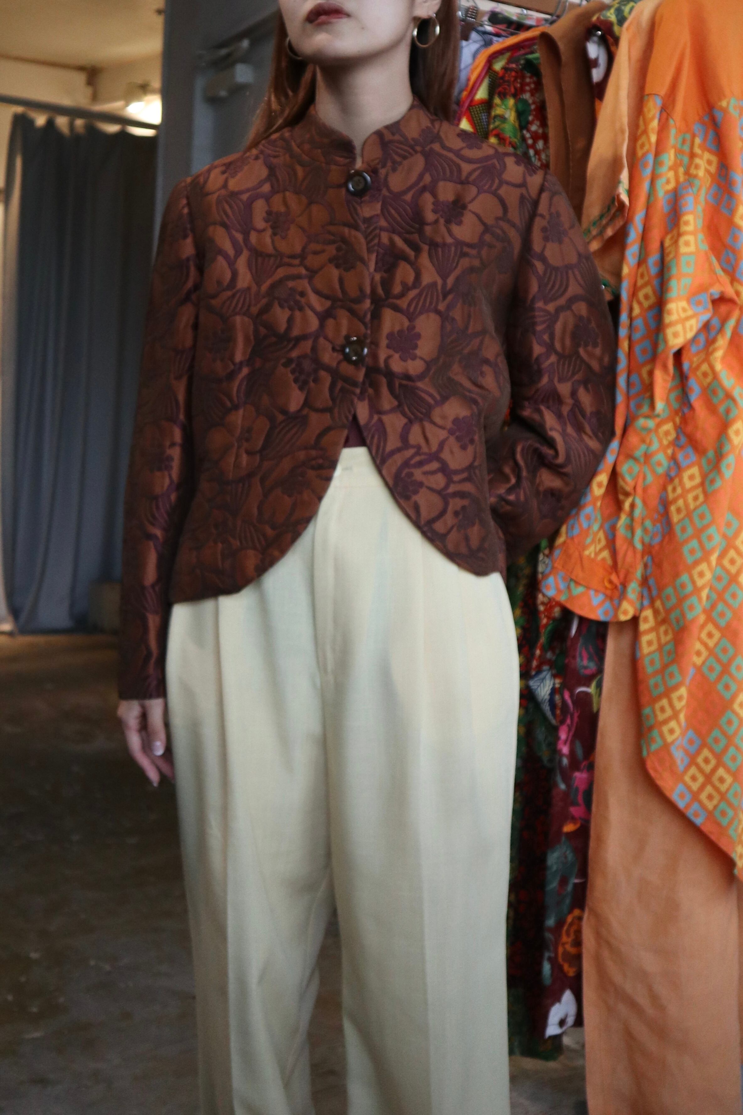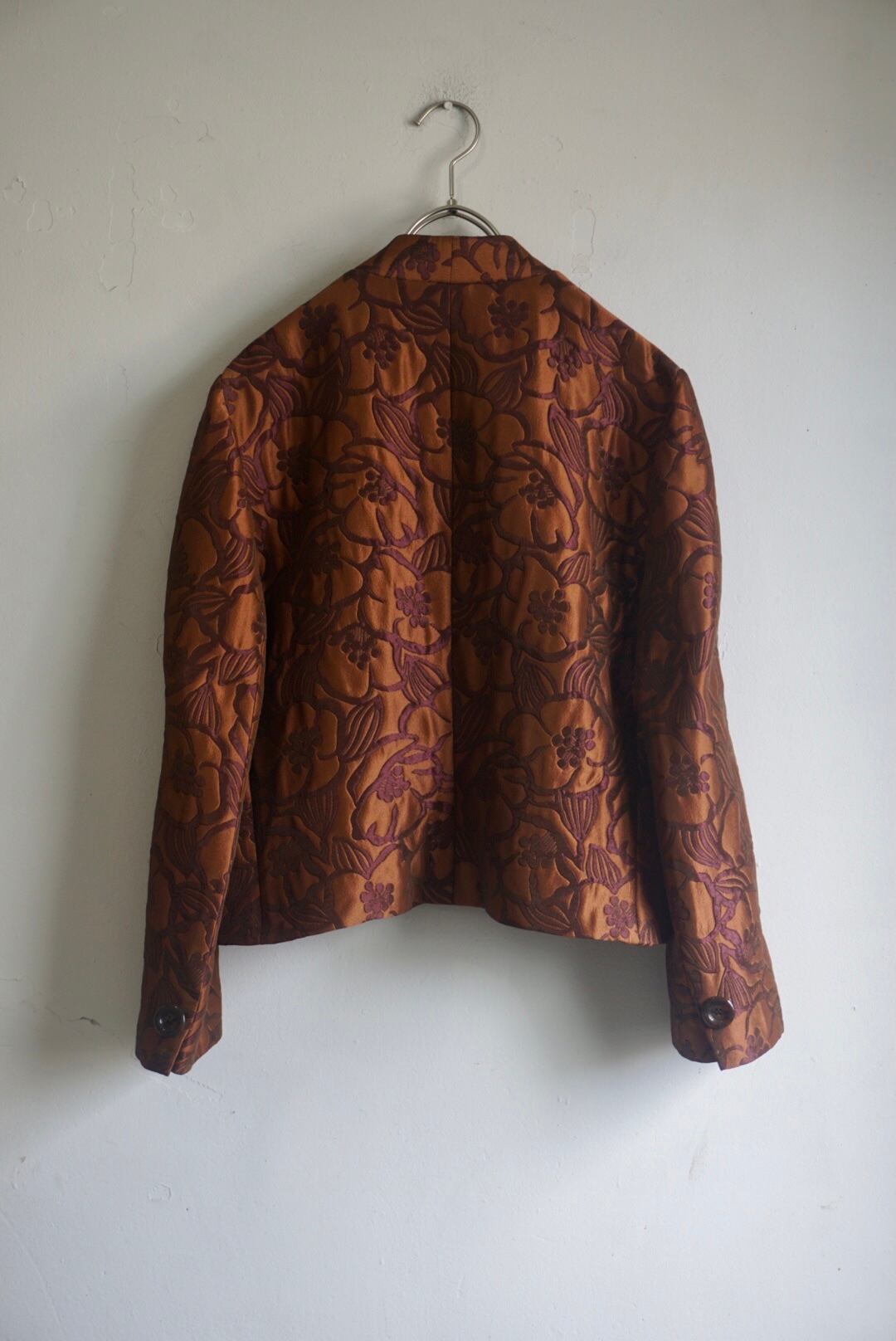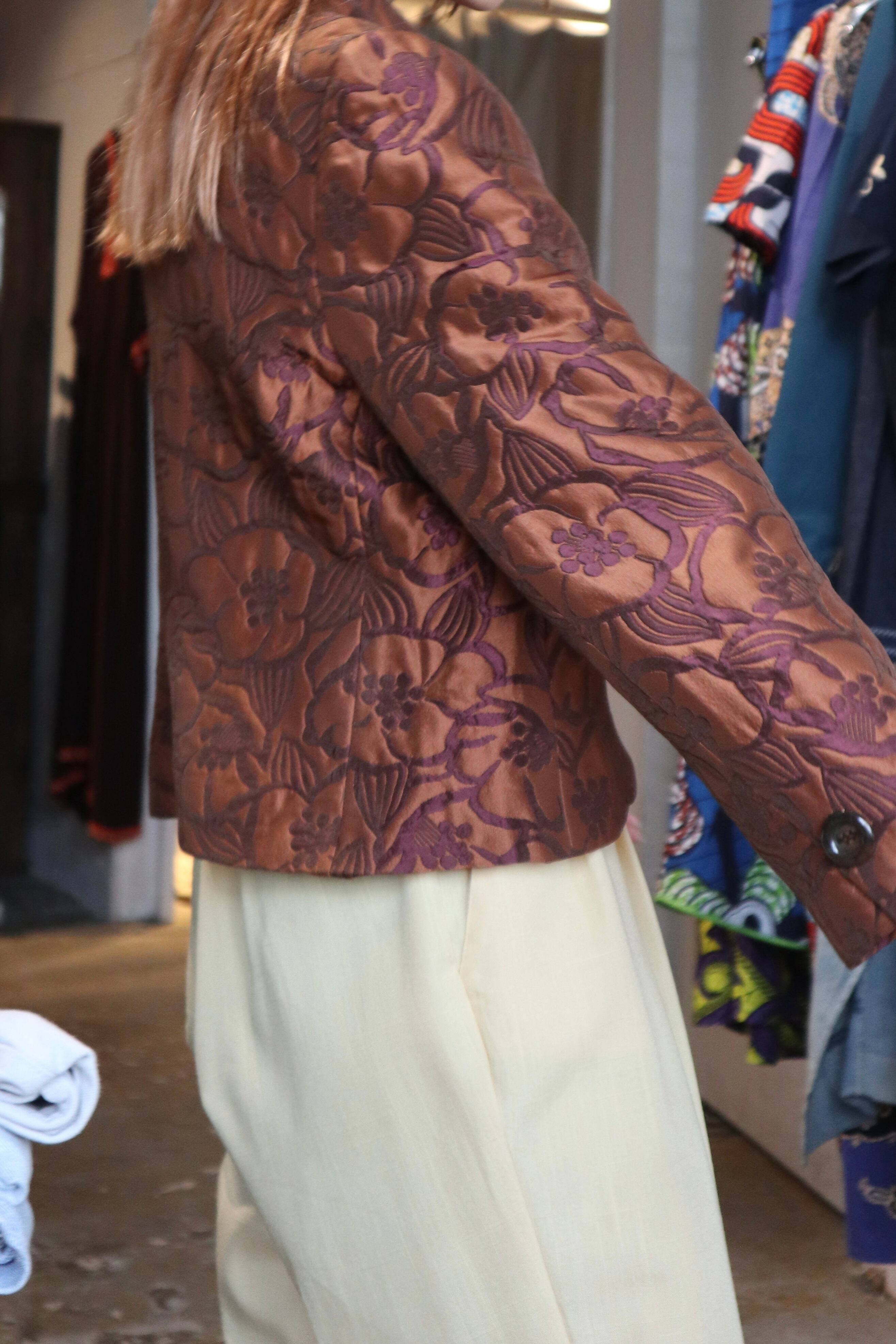 柄が浮き出て見えるジャガードのような生地が上品でブラウンカラーが着用しやすいジャケット