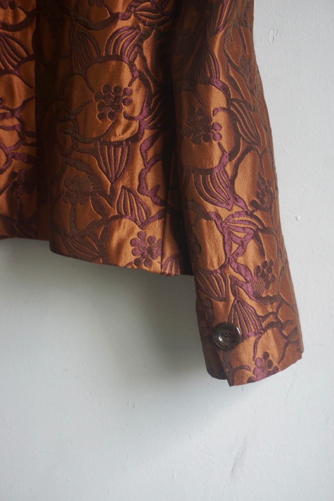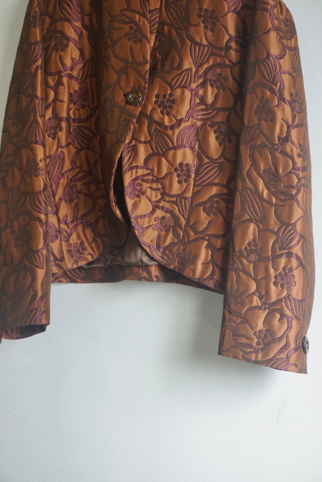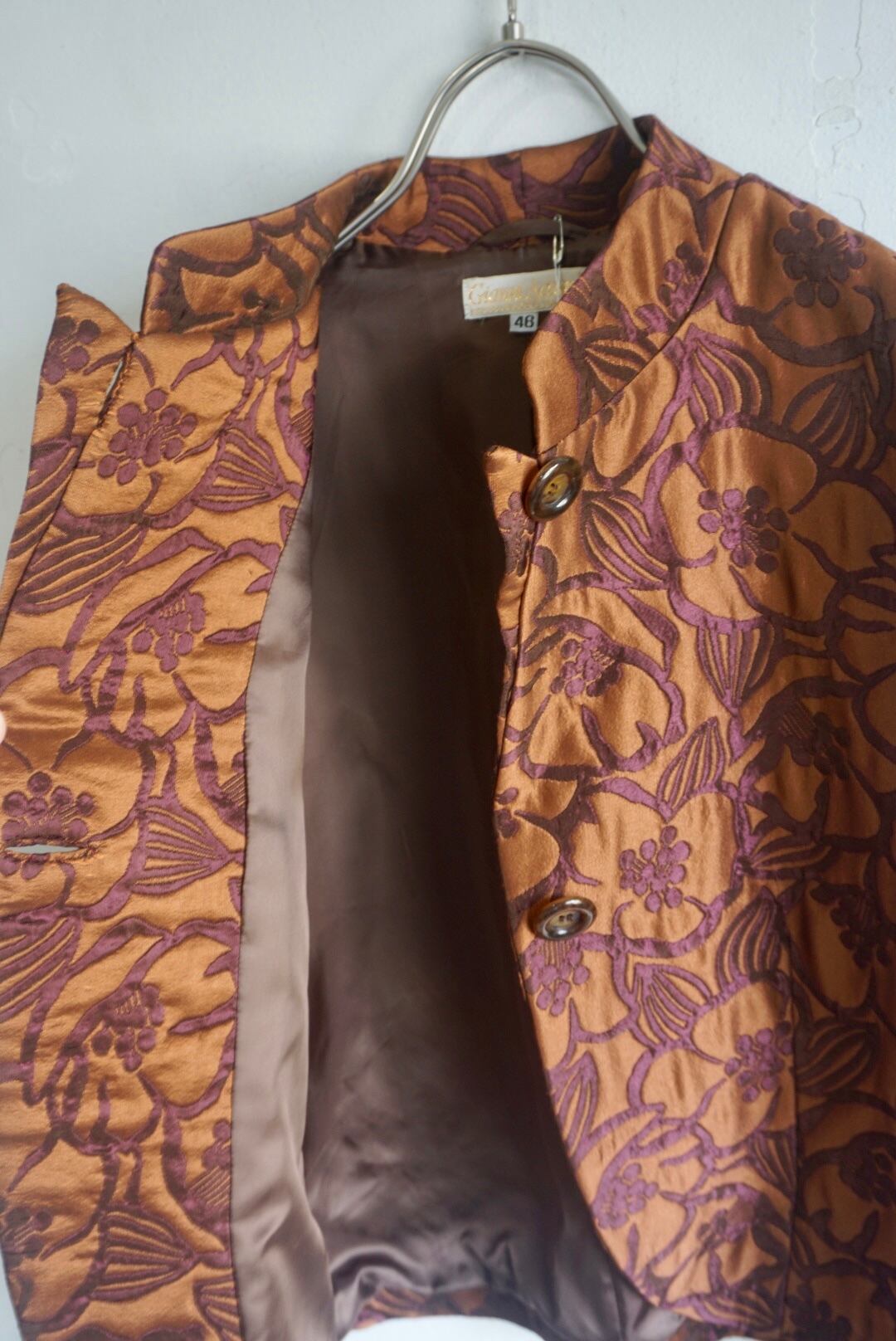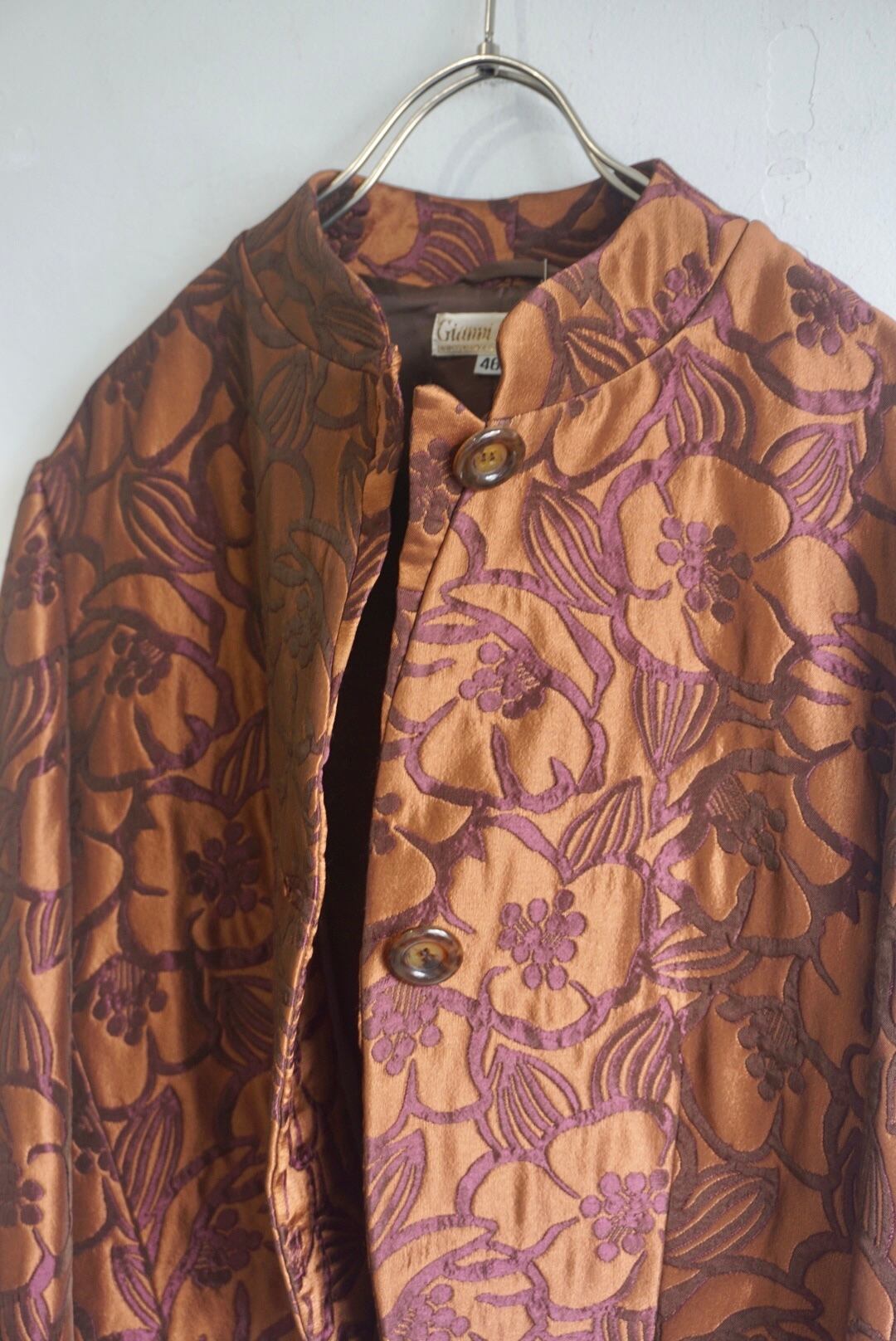 柄が浮き出て見えるジャガードのような生地が上品でブラウンカラーが着用しやすいジャケット