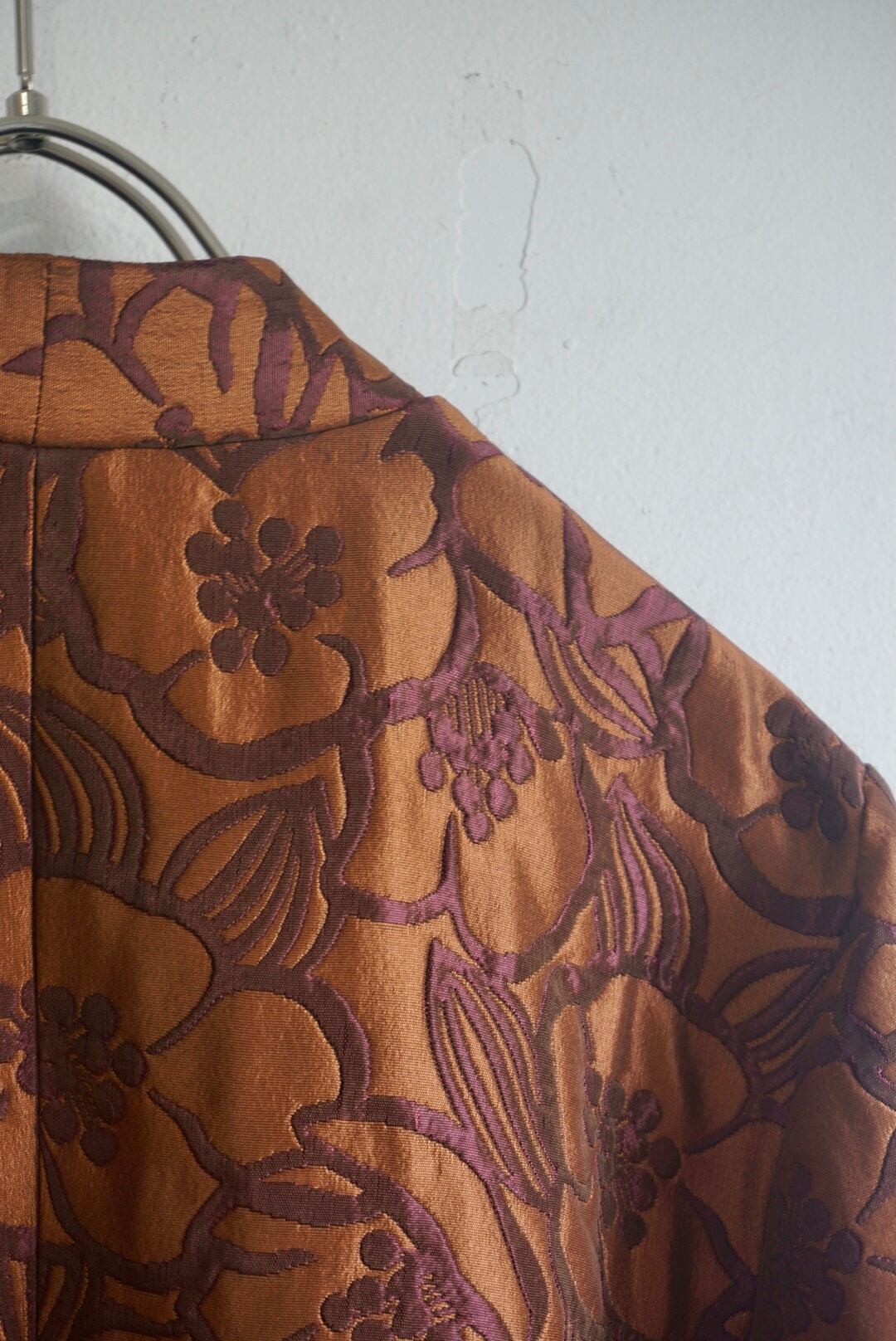 光沢感のあるサラッとした肌触りの素材。裏地付きですが重さはなく軽い羽織として着用頂けます。