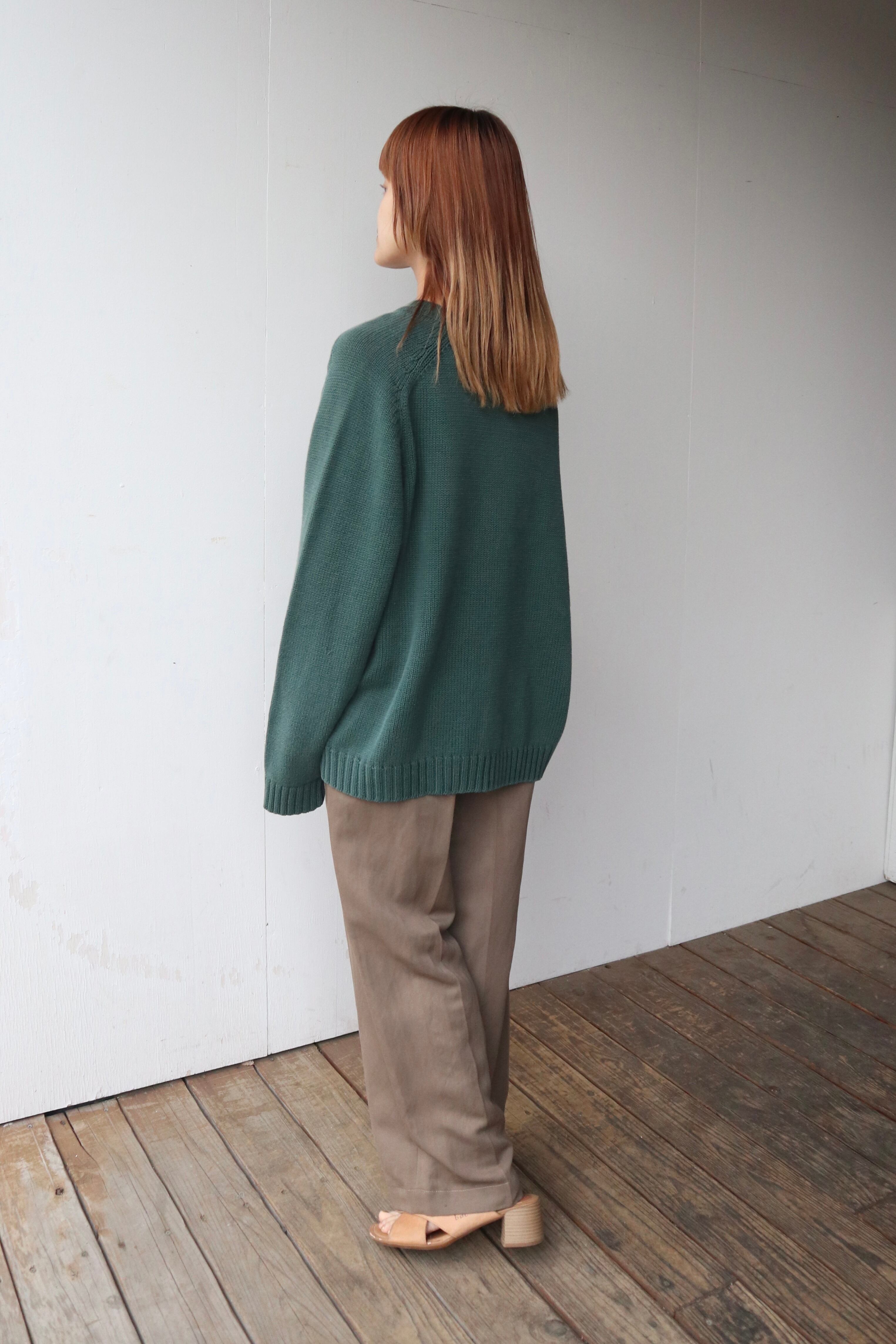 Vネックのデザインやグリーンカラーがポイントになりゆったりサイズでインナーなども重ねやすい1着