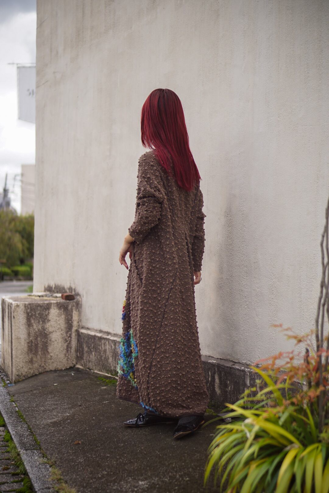 表面のみに凹凸のあるネップのような装飾が全体的につき、裾部分にはリボンテープで花柄装飾が施されているユニークなデザイン