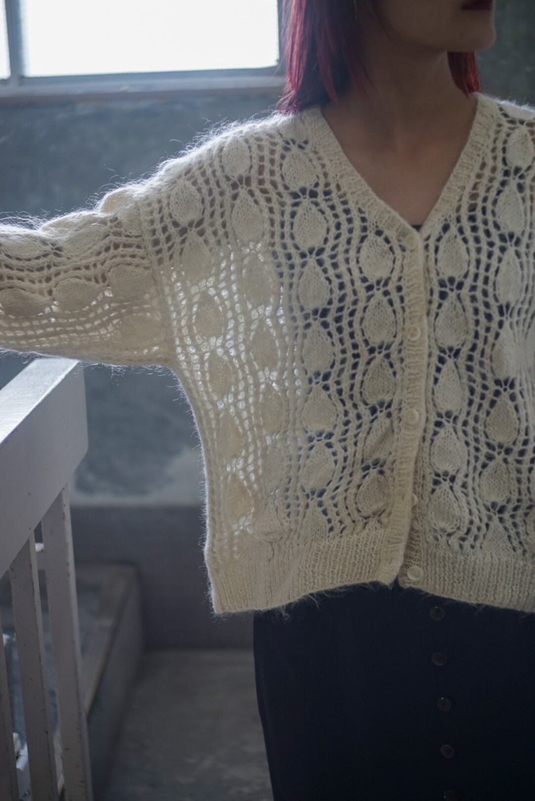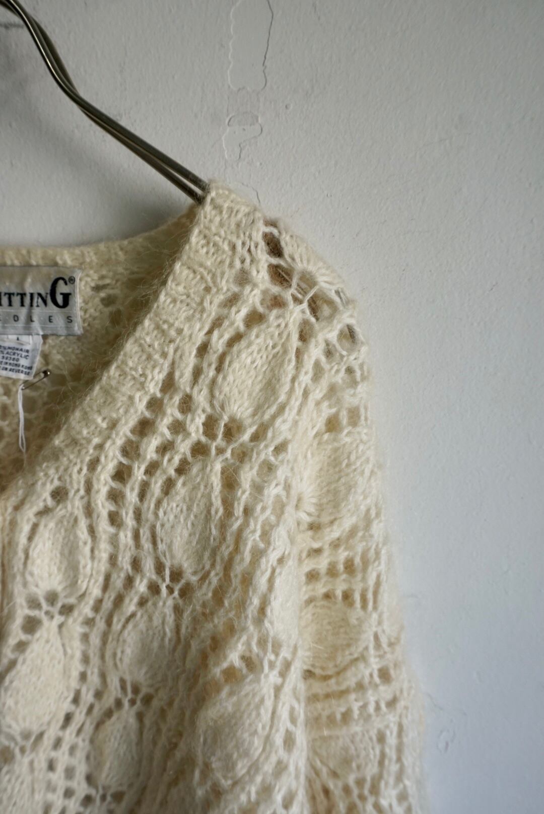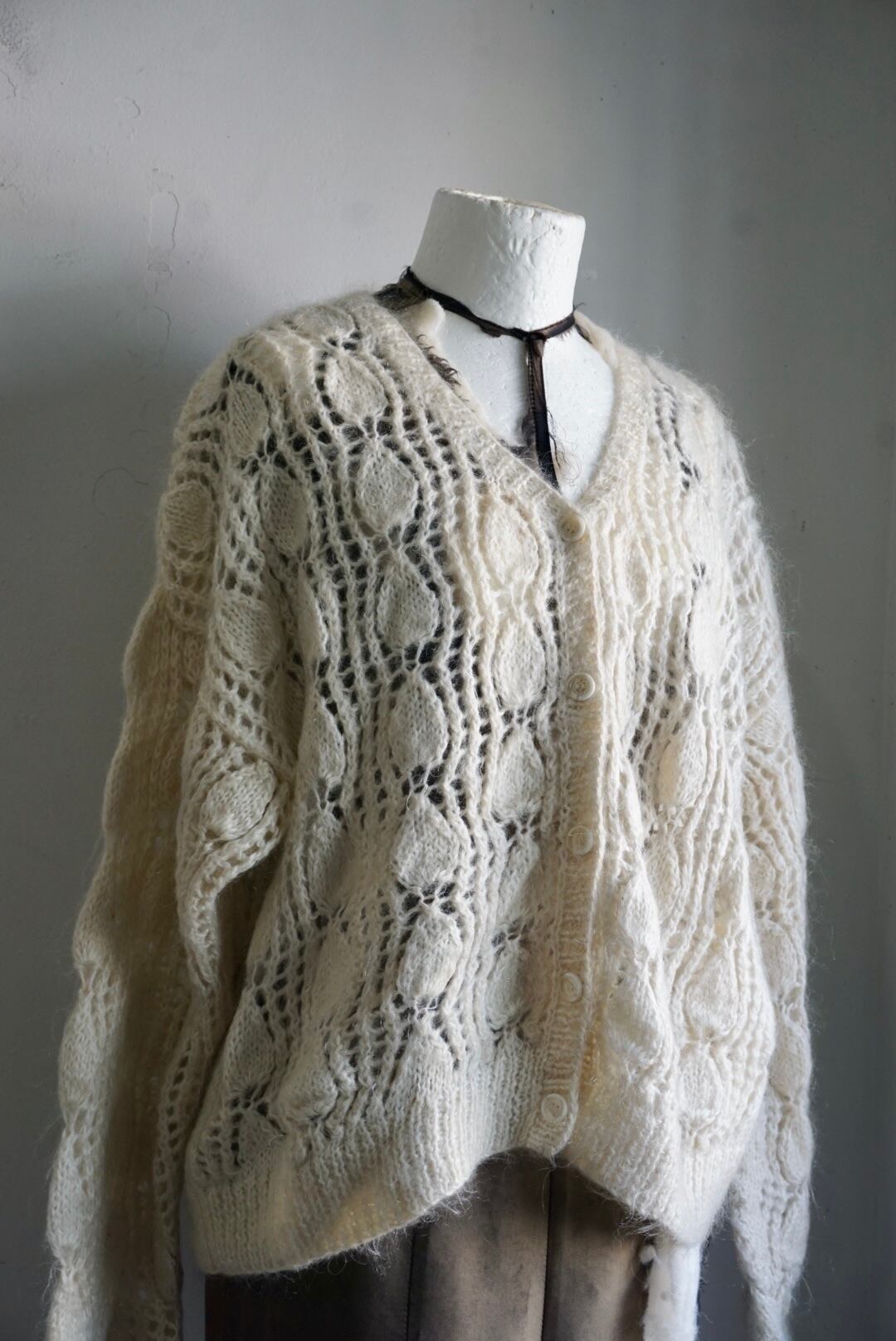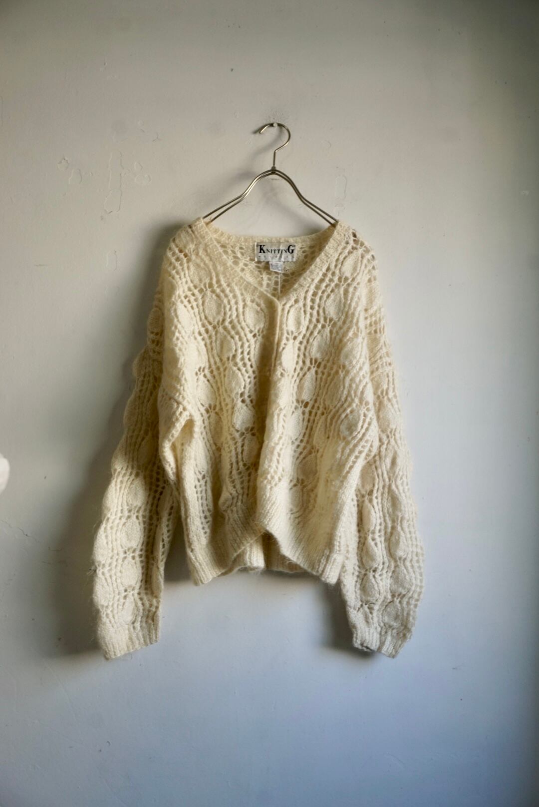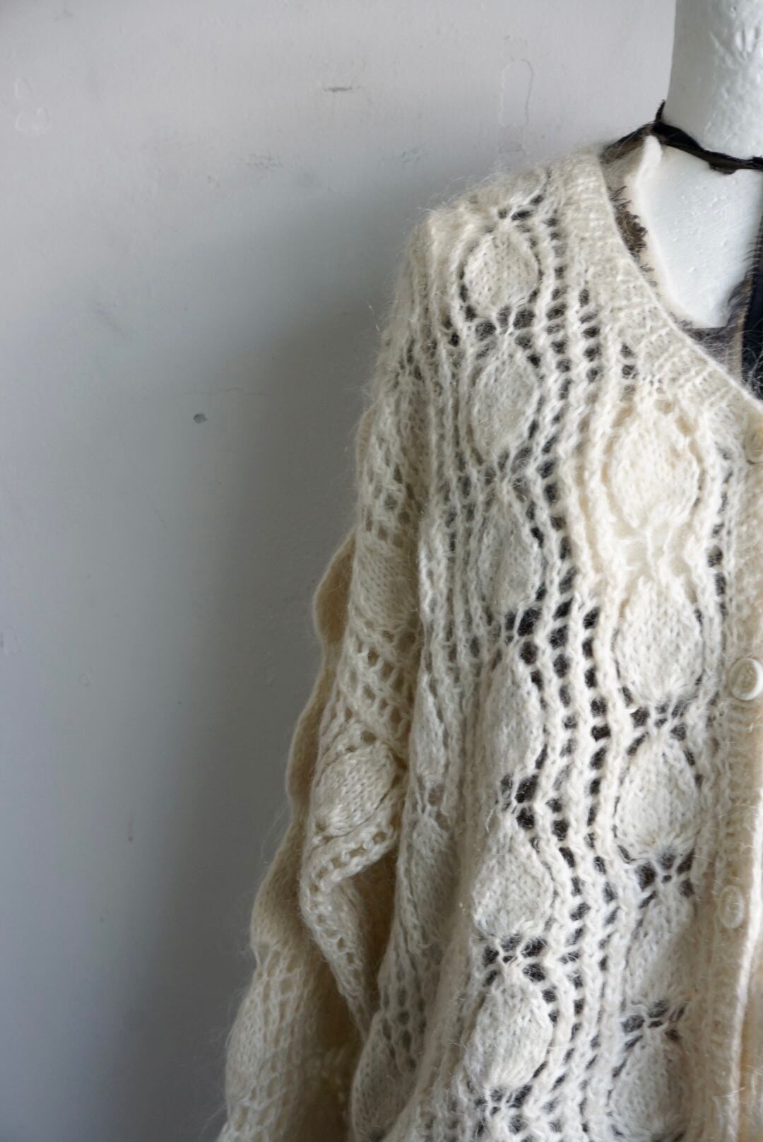 毛足の長いモヘアの素材が入っていて、柄が大きくざっくりと編まれています。