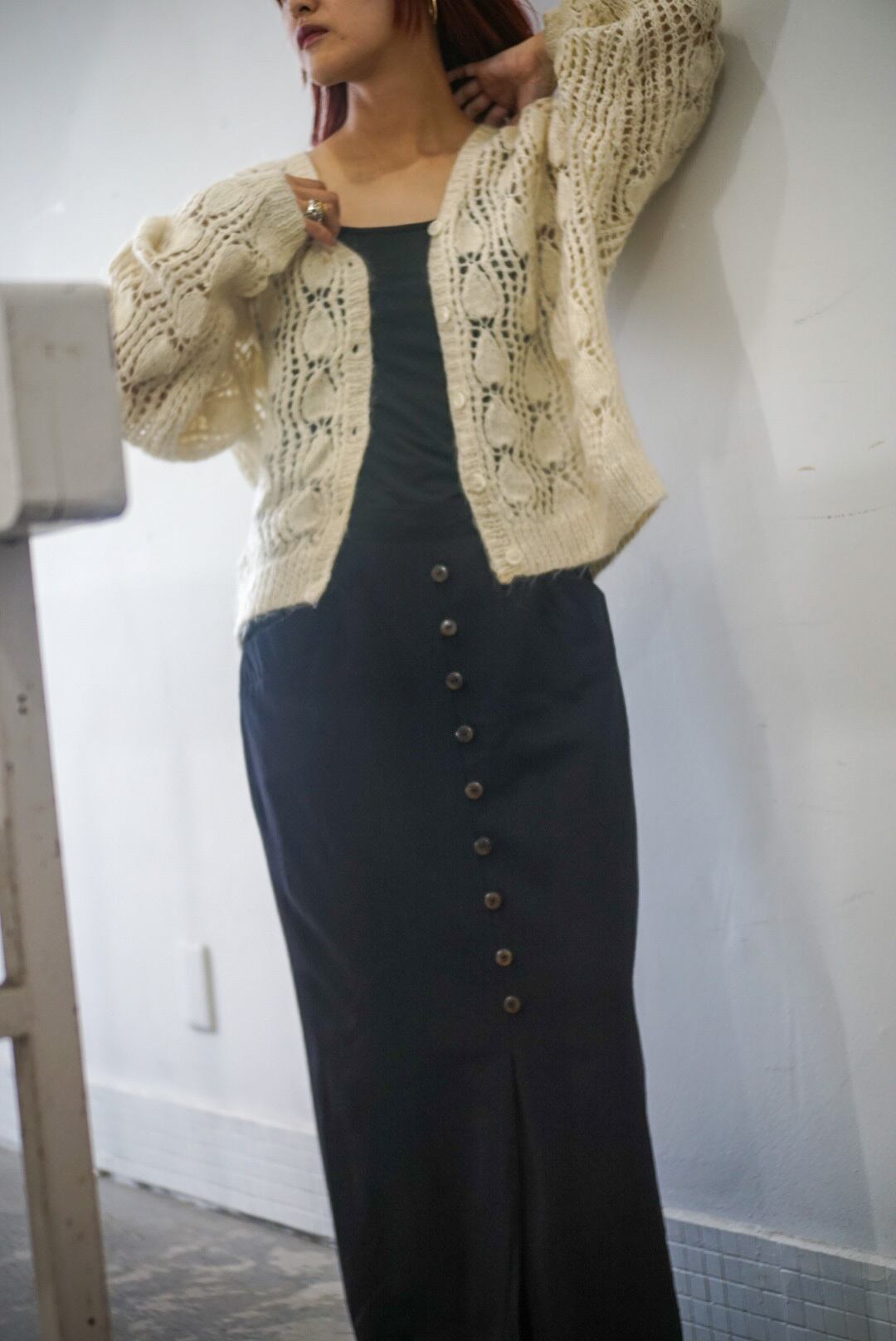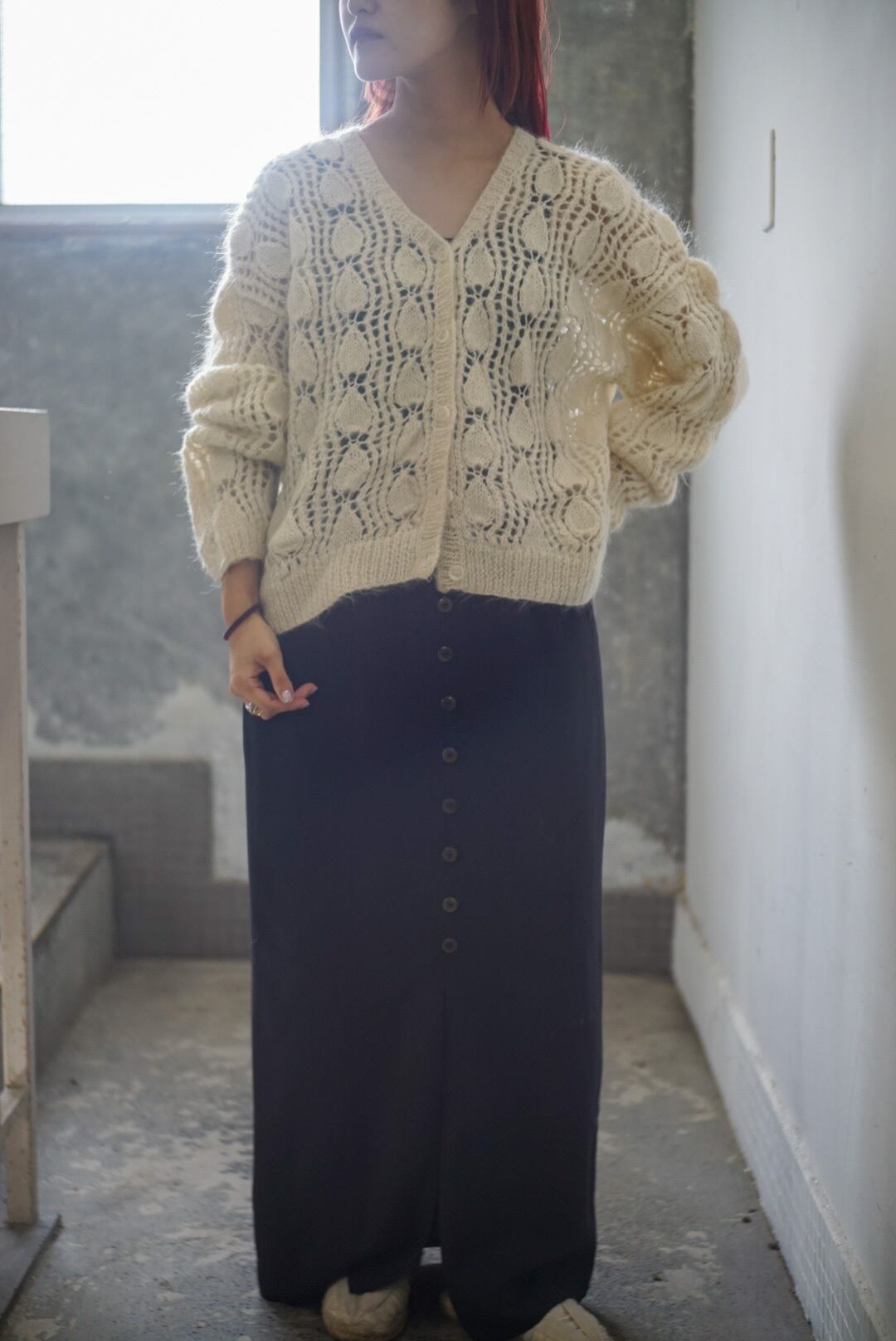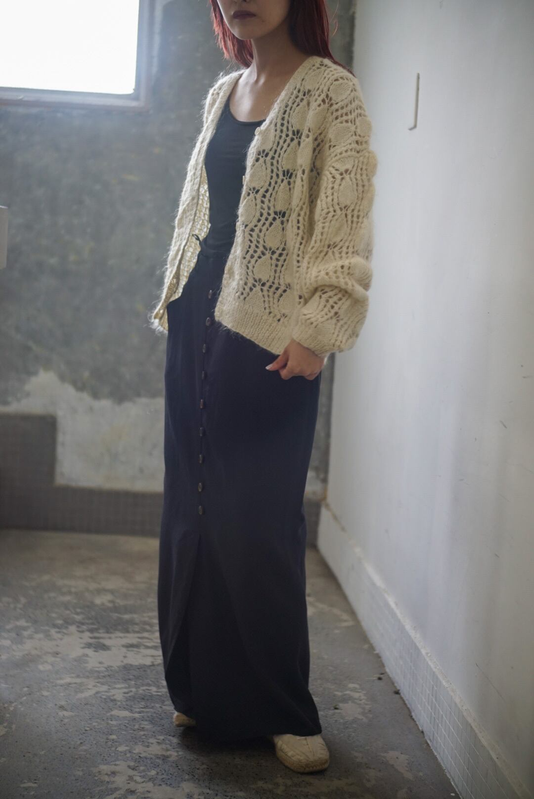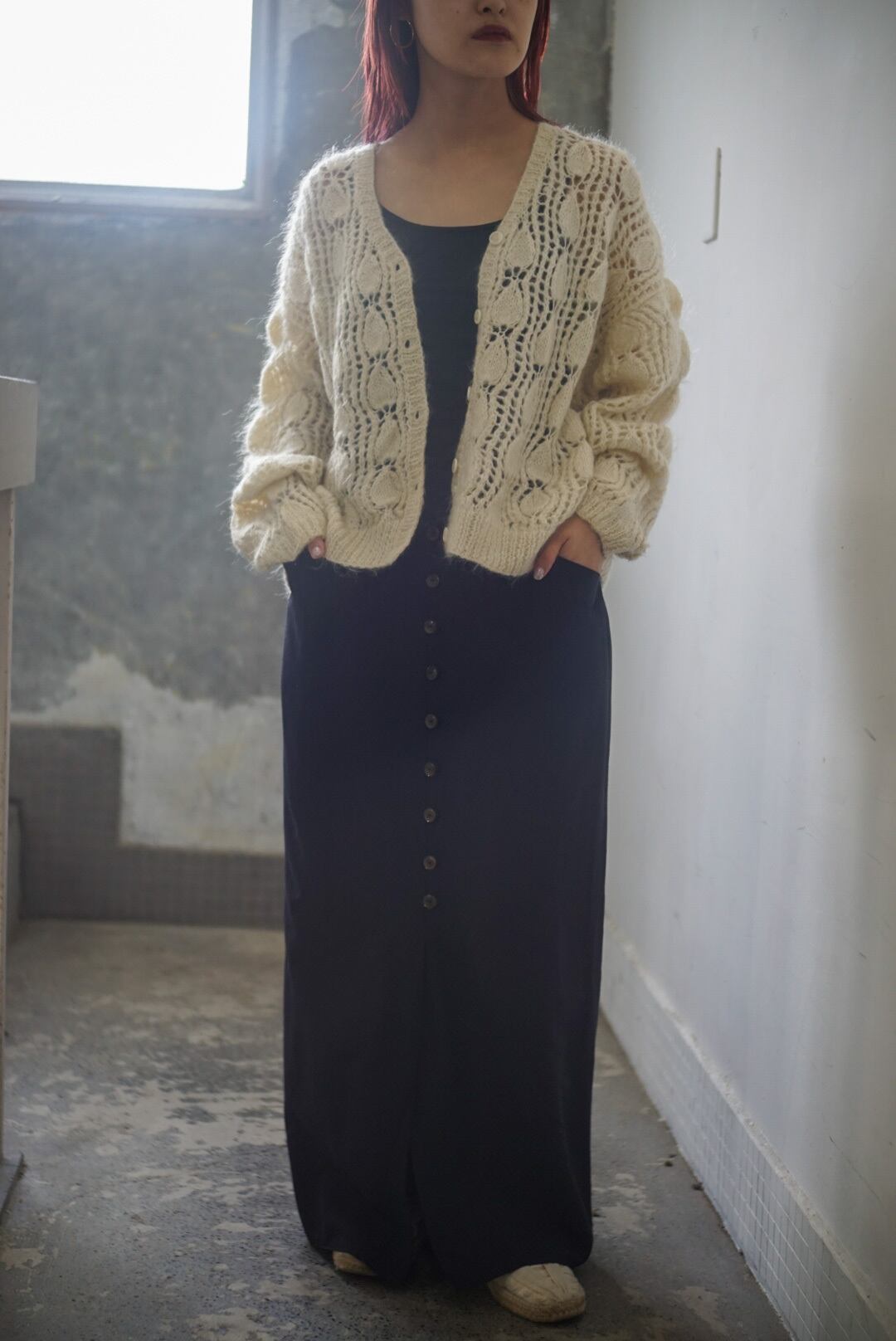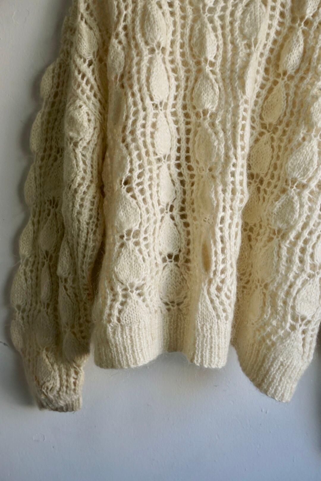 毛足の長いモヘアの素材が入っていて、柄が大きくざっくりと編まれています。