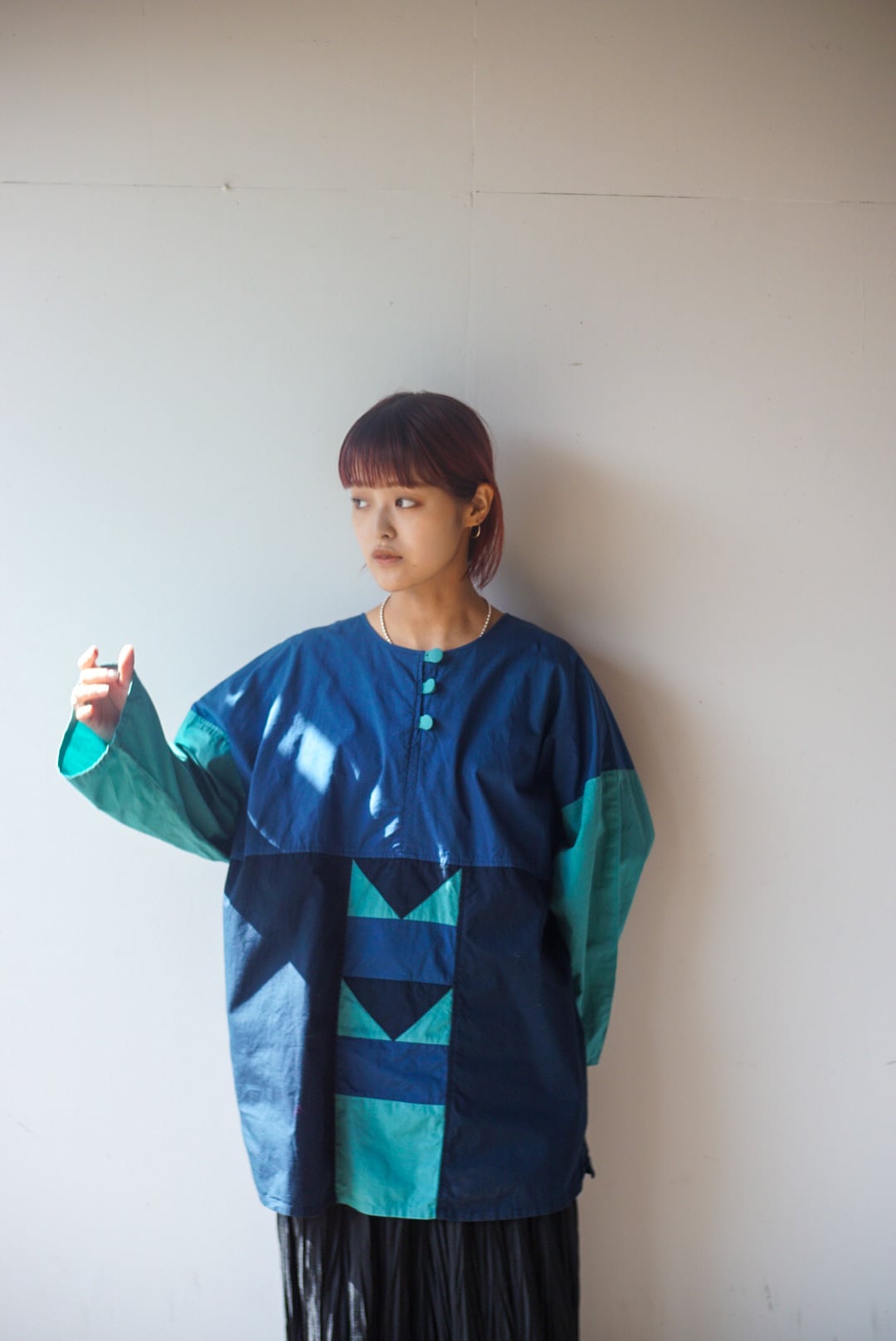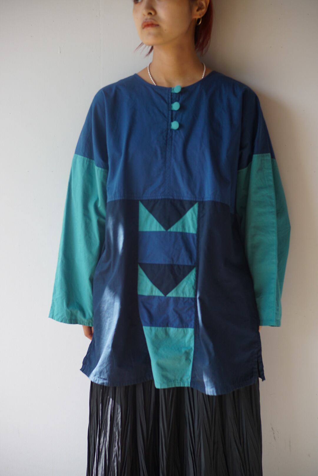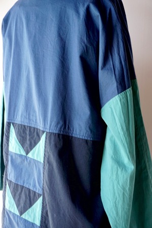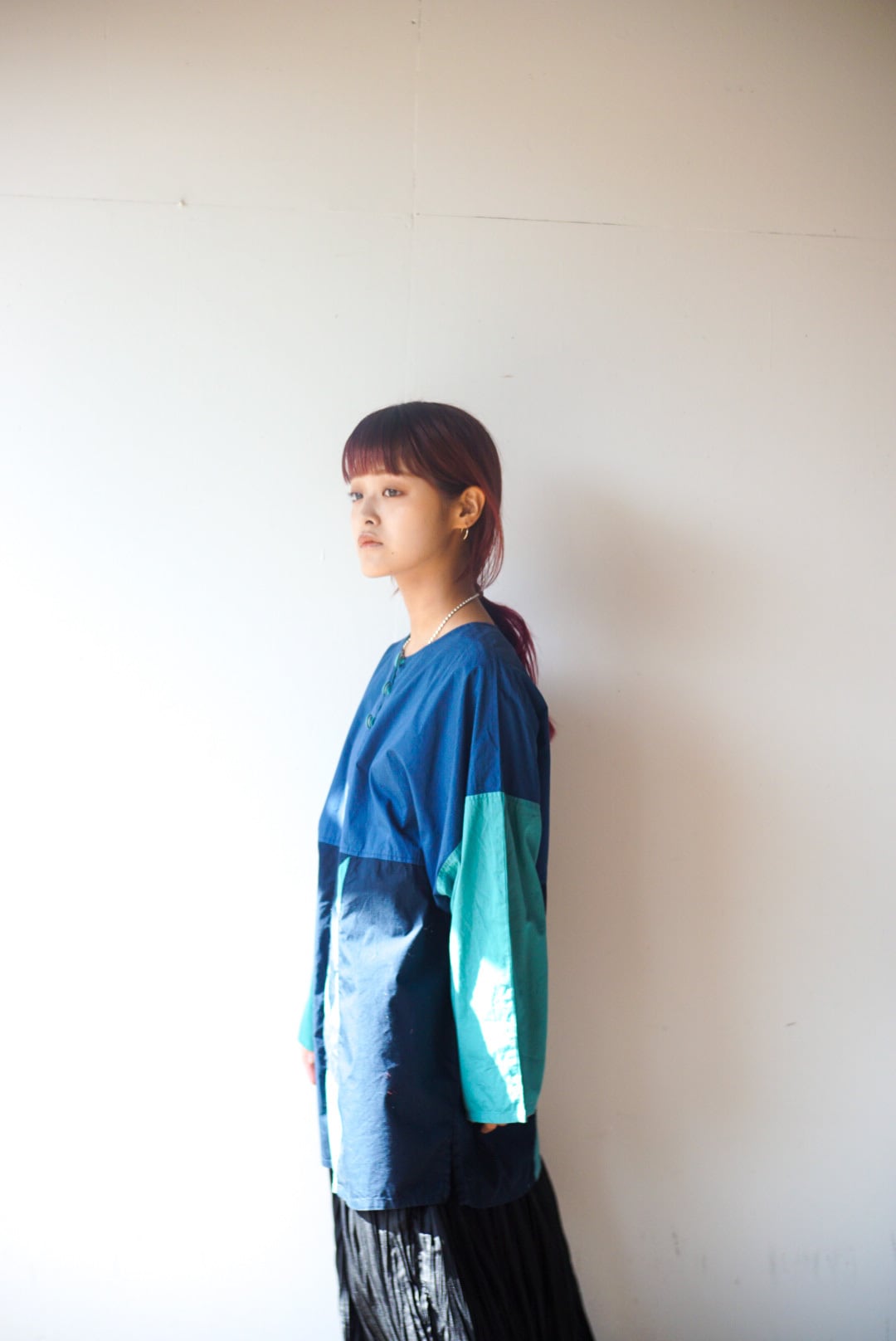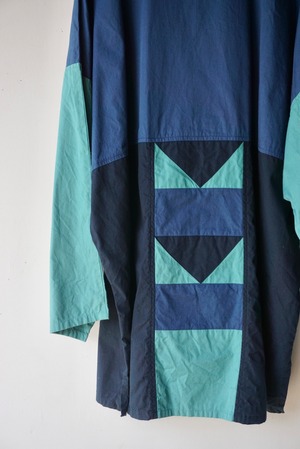 パッチワークなような切り替えデザインがユニークで寒色カラーが大人可愛い1着