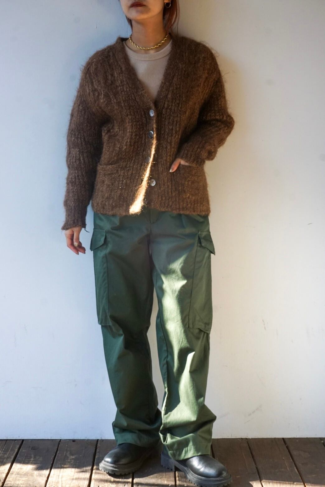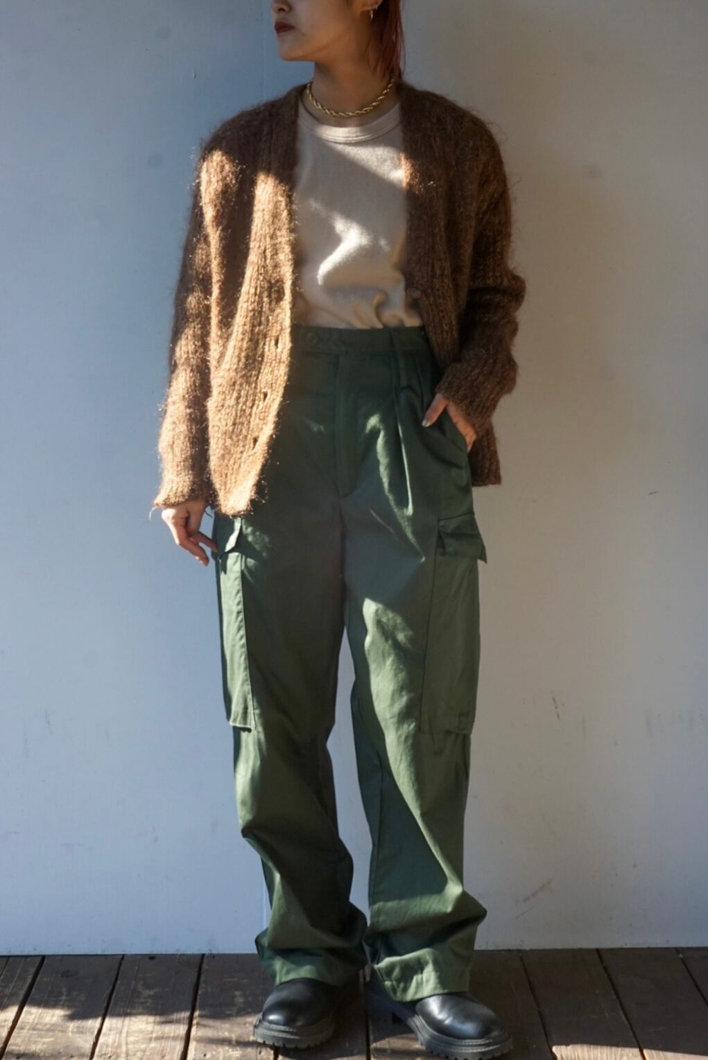 濃いカーキカラーやワイドでストレートなシルエットがカジュアルになり過ぎず着用頂けます