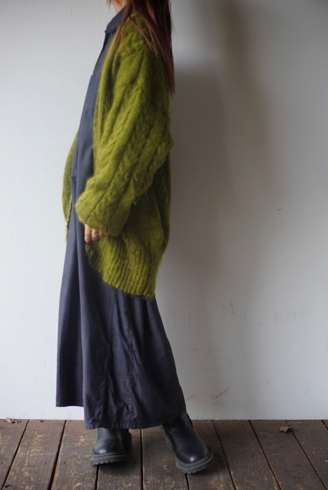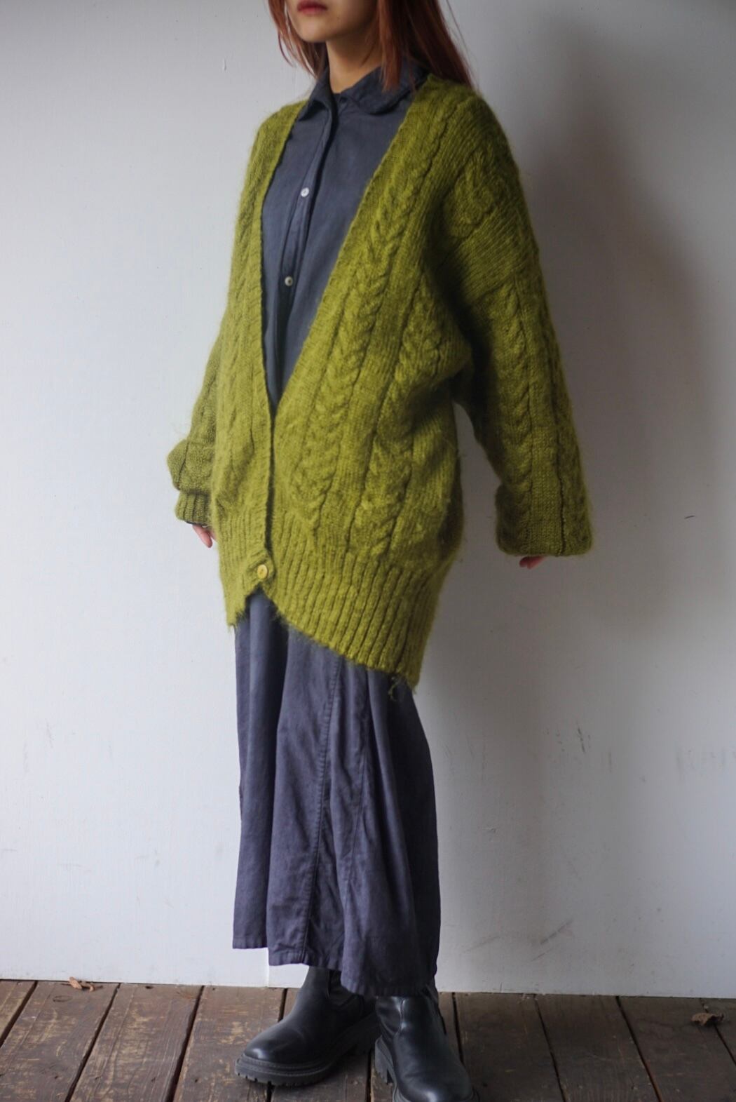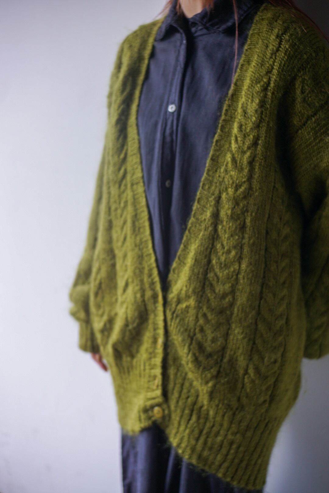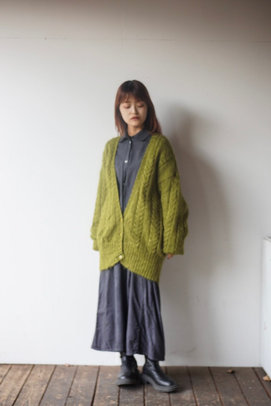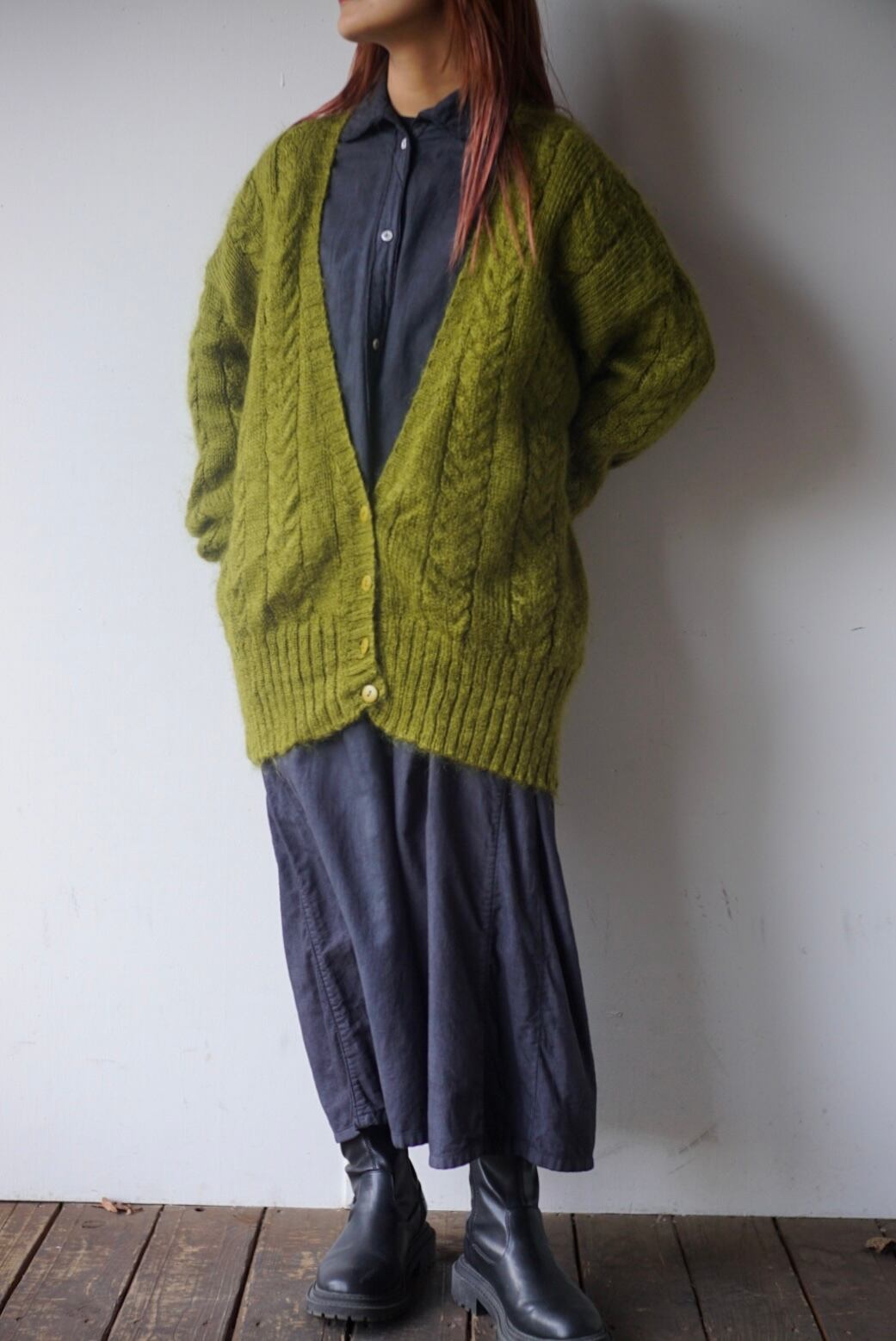 ウールとモヘア混素材の毛足が長く暖かく着用でき、くすみグリーンカラーがトレンドライクなカーディガン