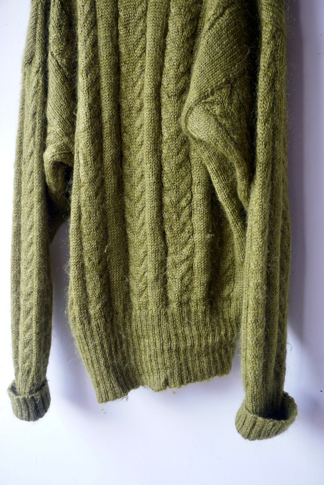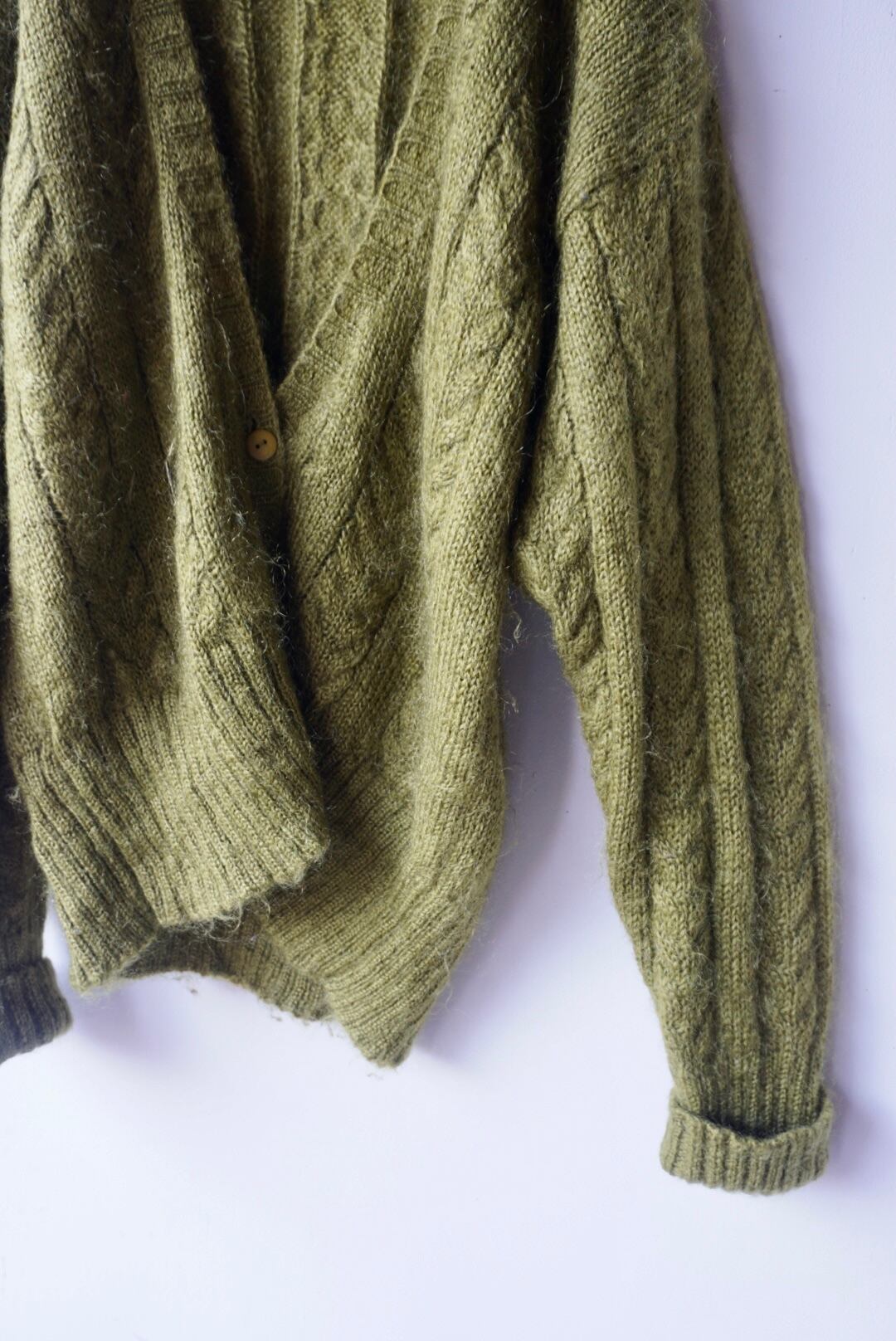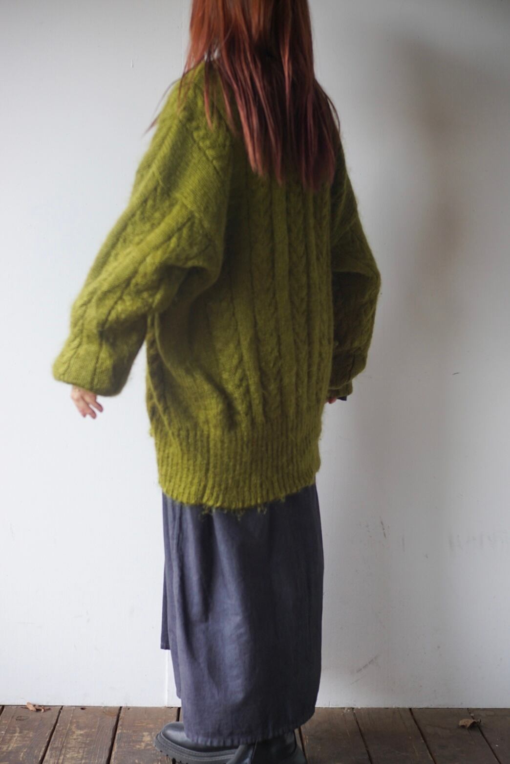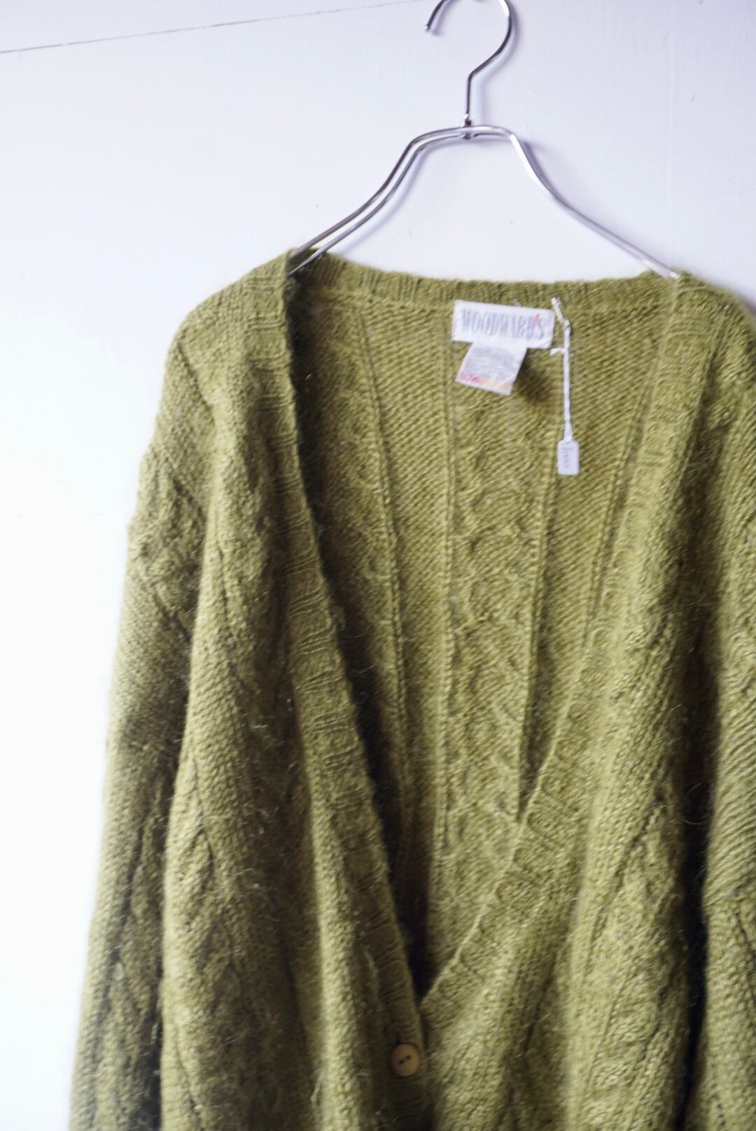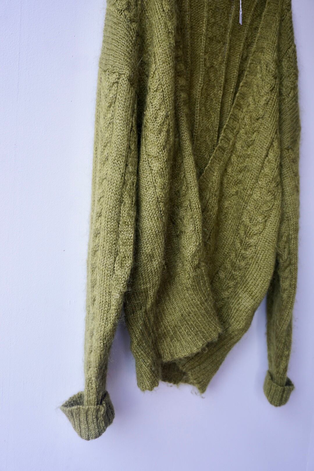 ウールとモヘア混素材の毛足が長く暖かく着用でき、くすみグリーンカラーがトレンドライクなカーディガン
