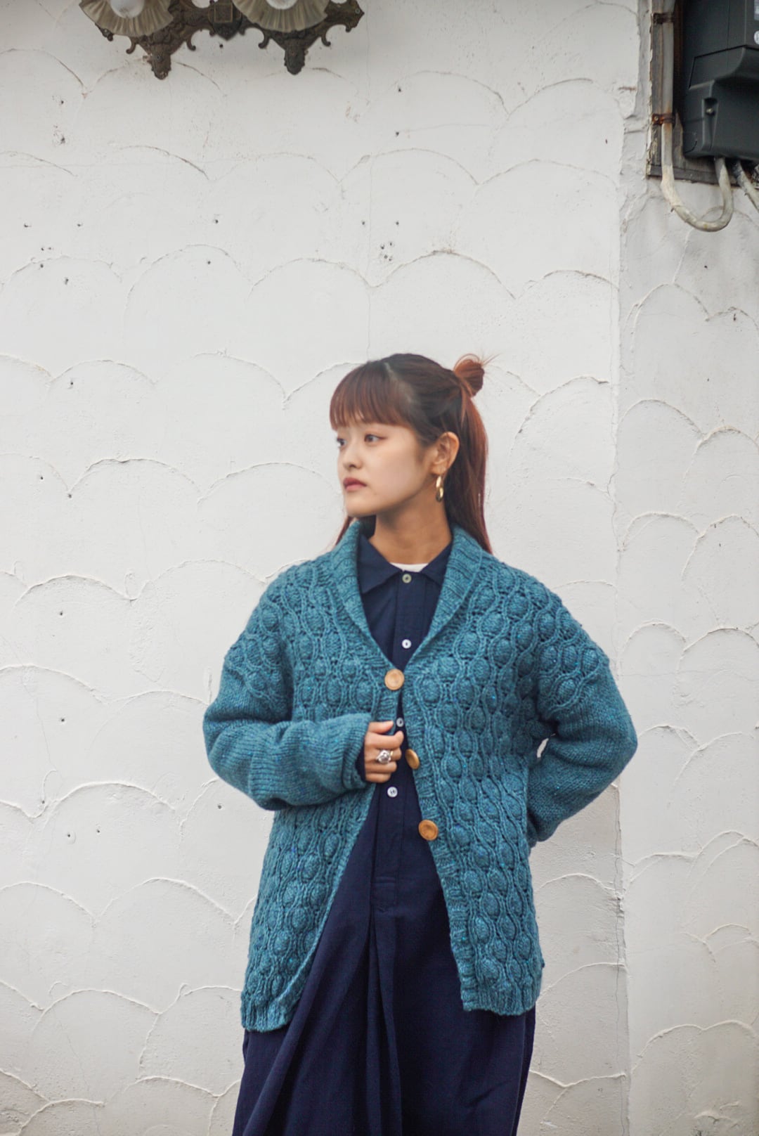 ブルーカラーの中に寒色のネップが入り、木のようなボタンが暖かみのあるデザイン