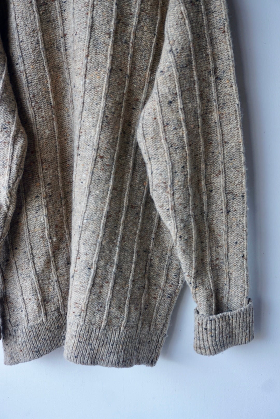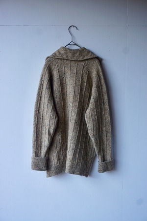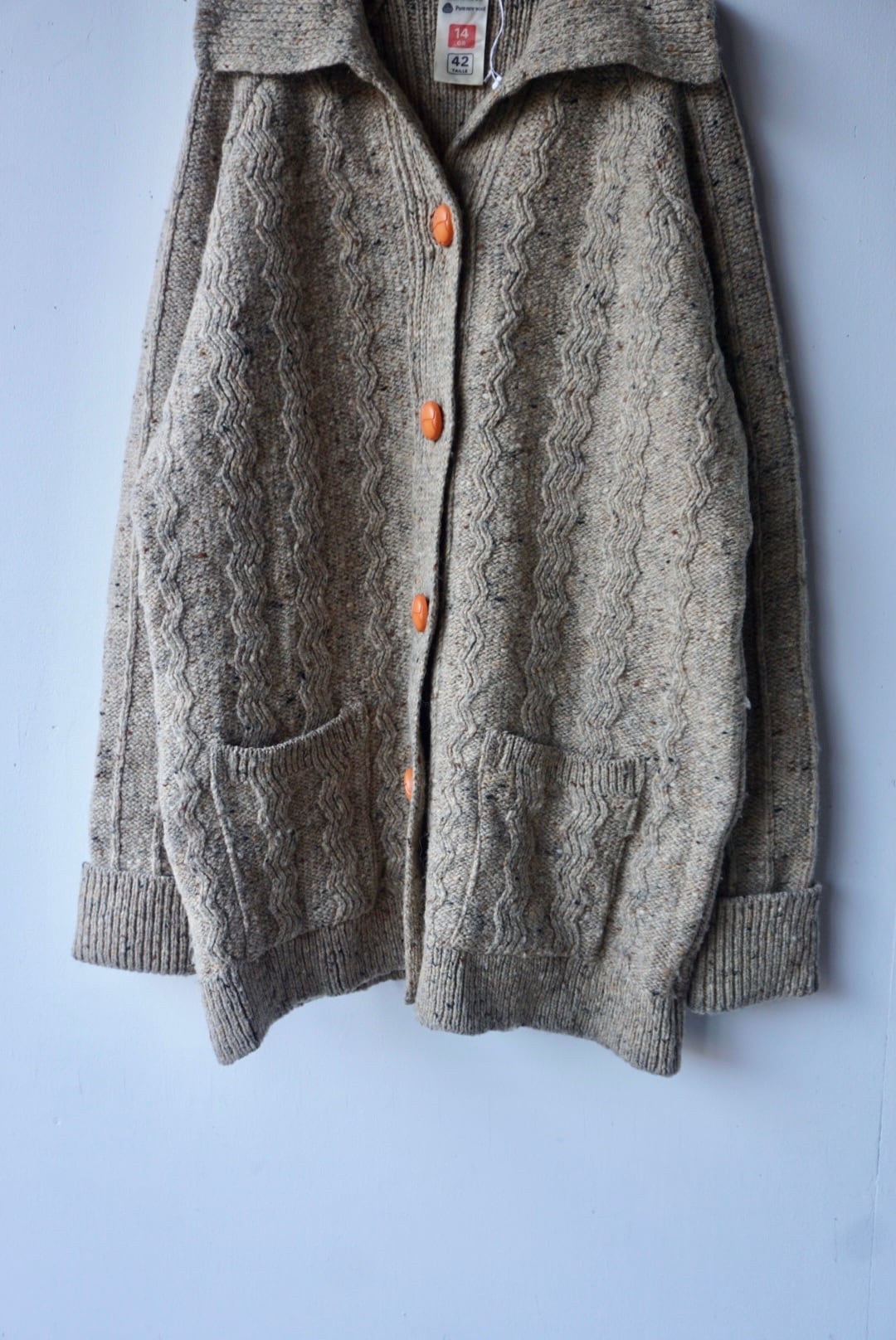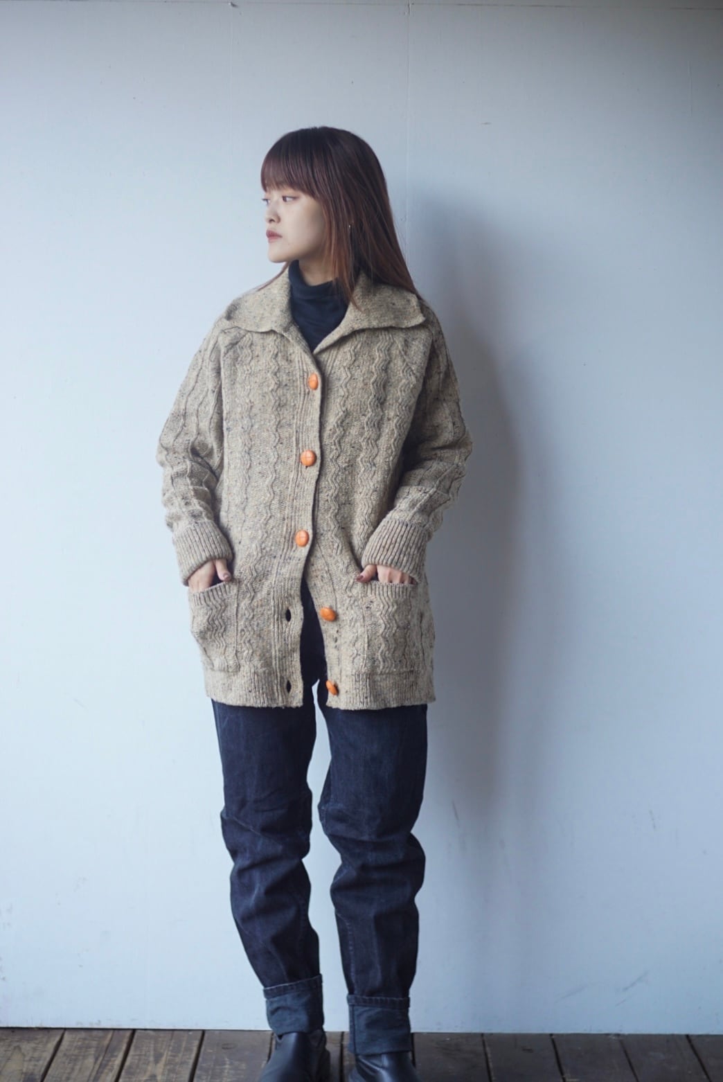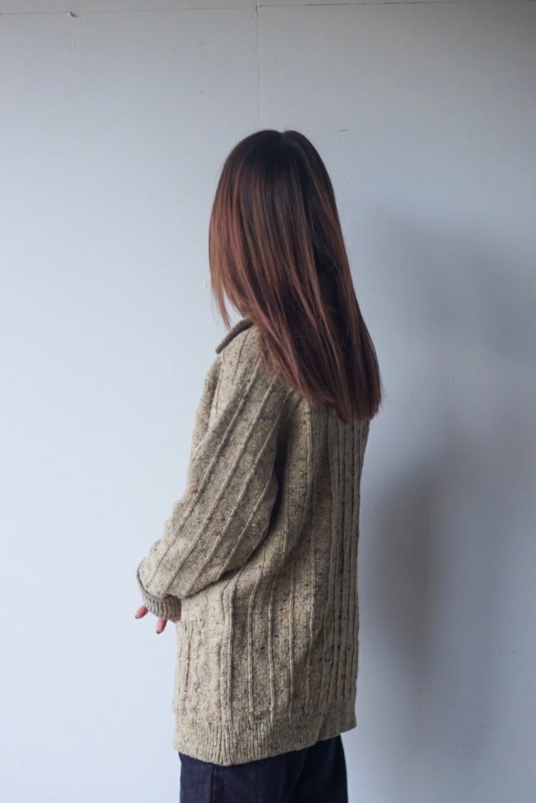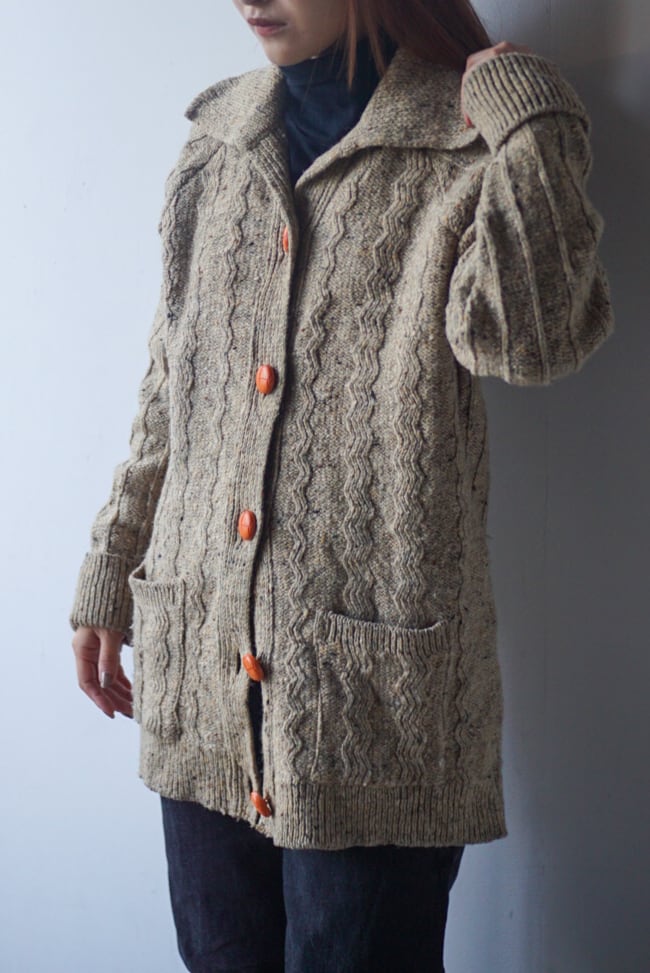 肌馴染みの良いベージュカラーに黒.茶.白のネップの混ざるウール素材のニットカーディガン