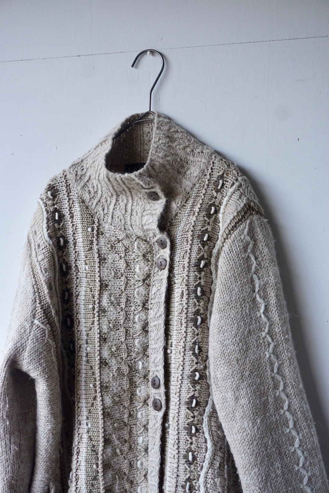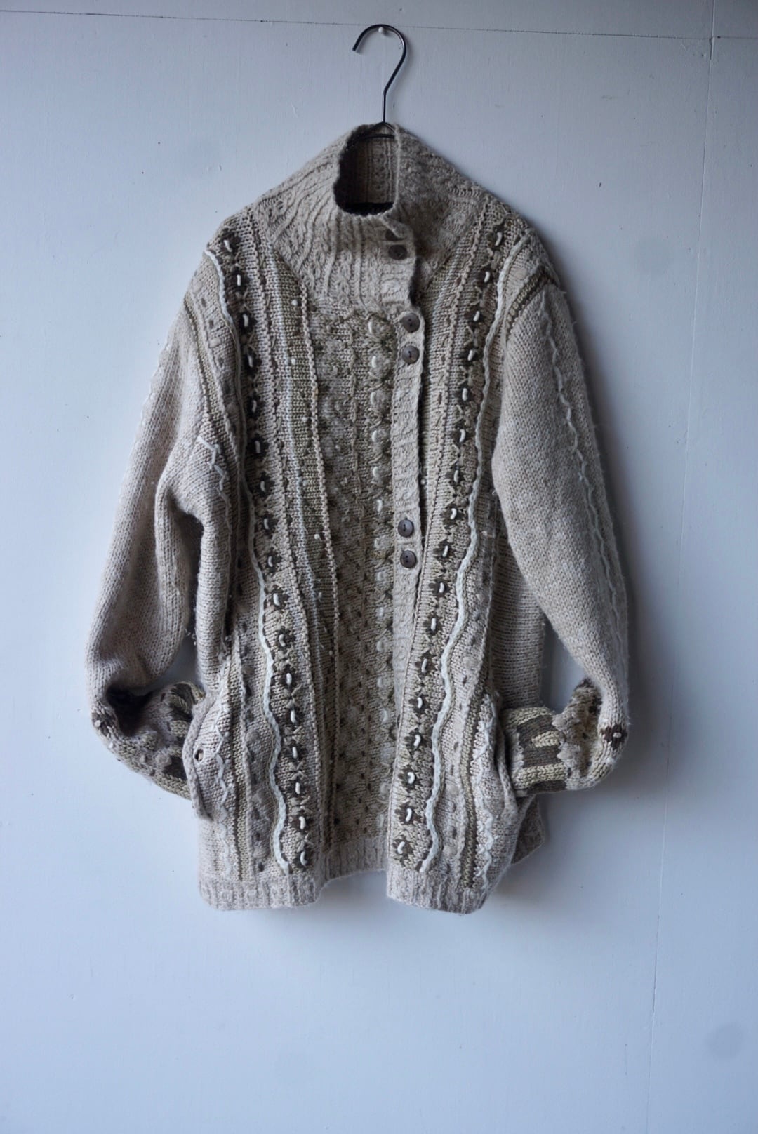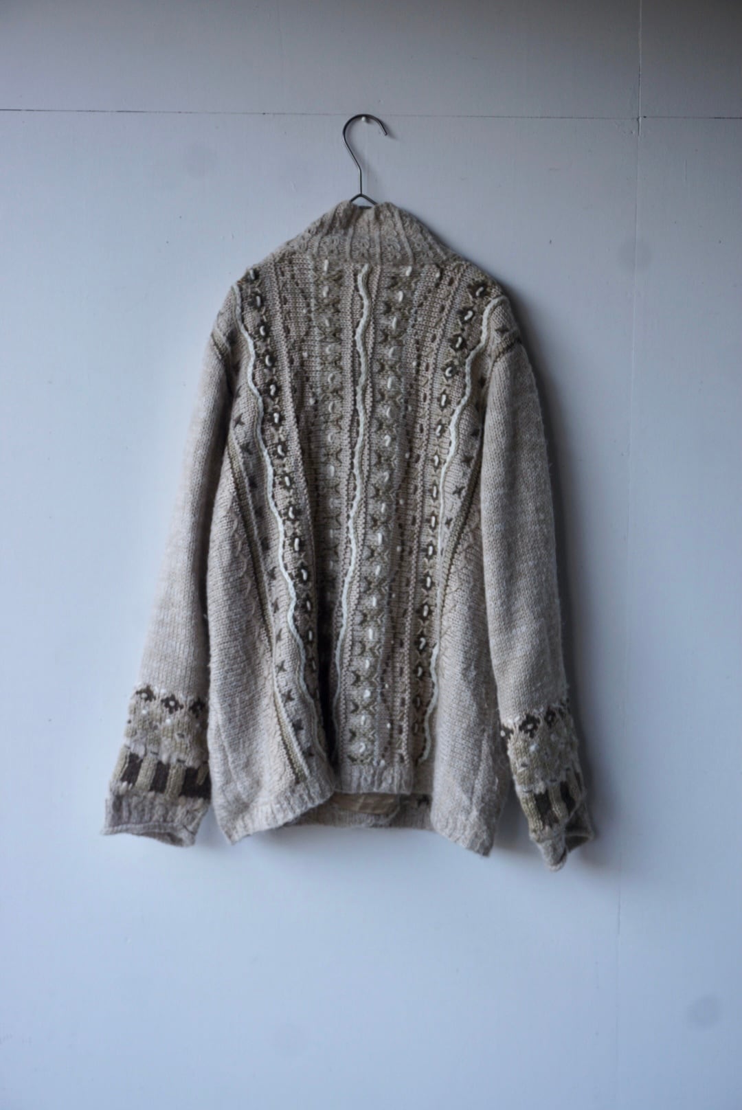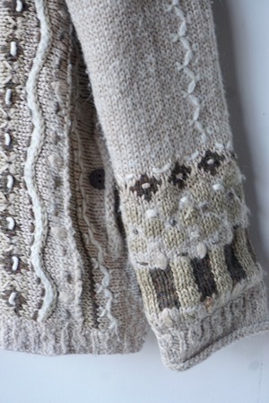 柄が浮き出ているように編まれているデザインがポイントとなり、サイドにはポケットもついており機能性も高い1着