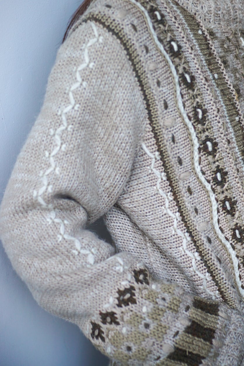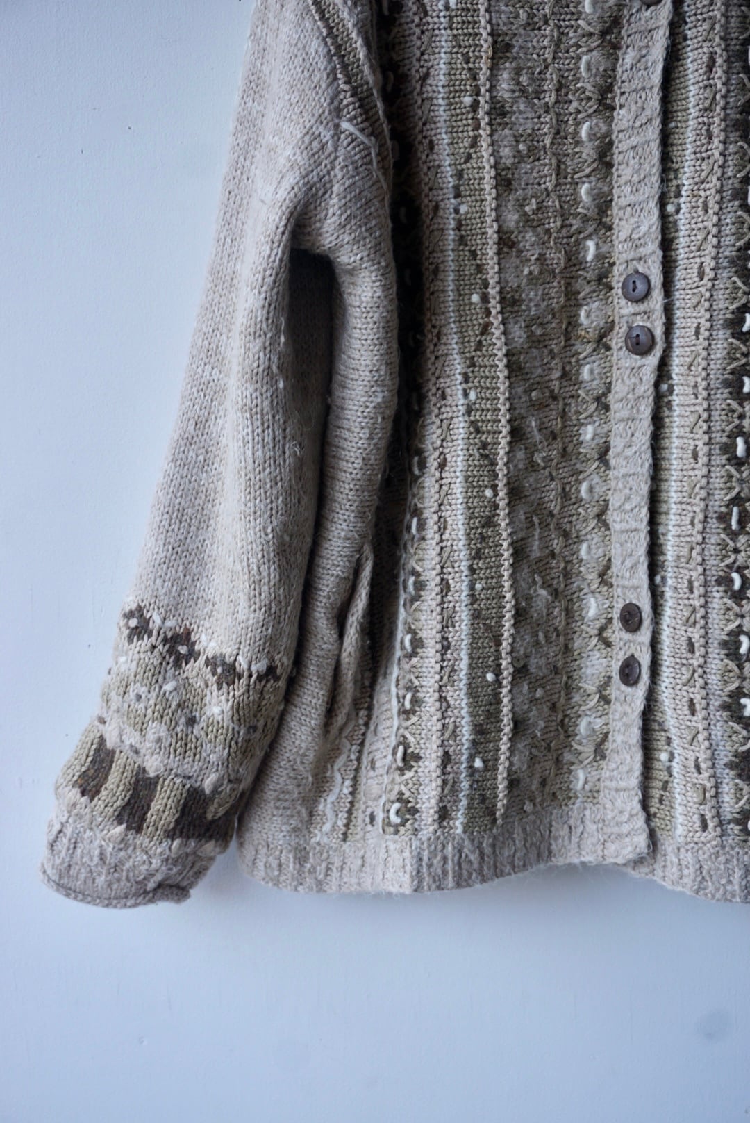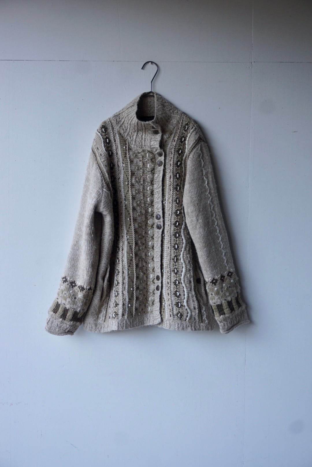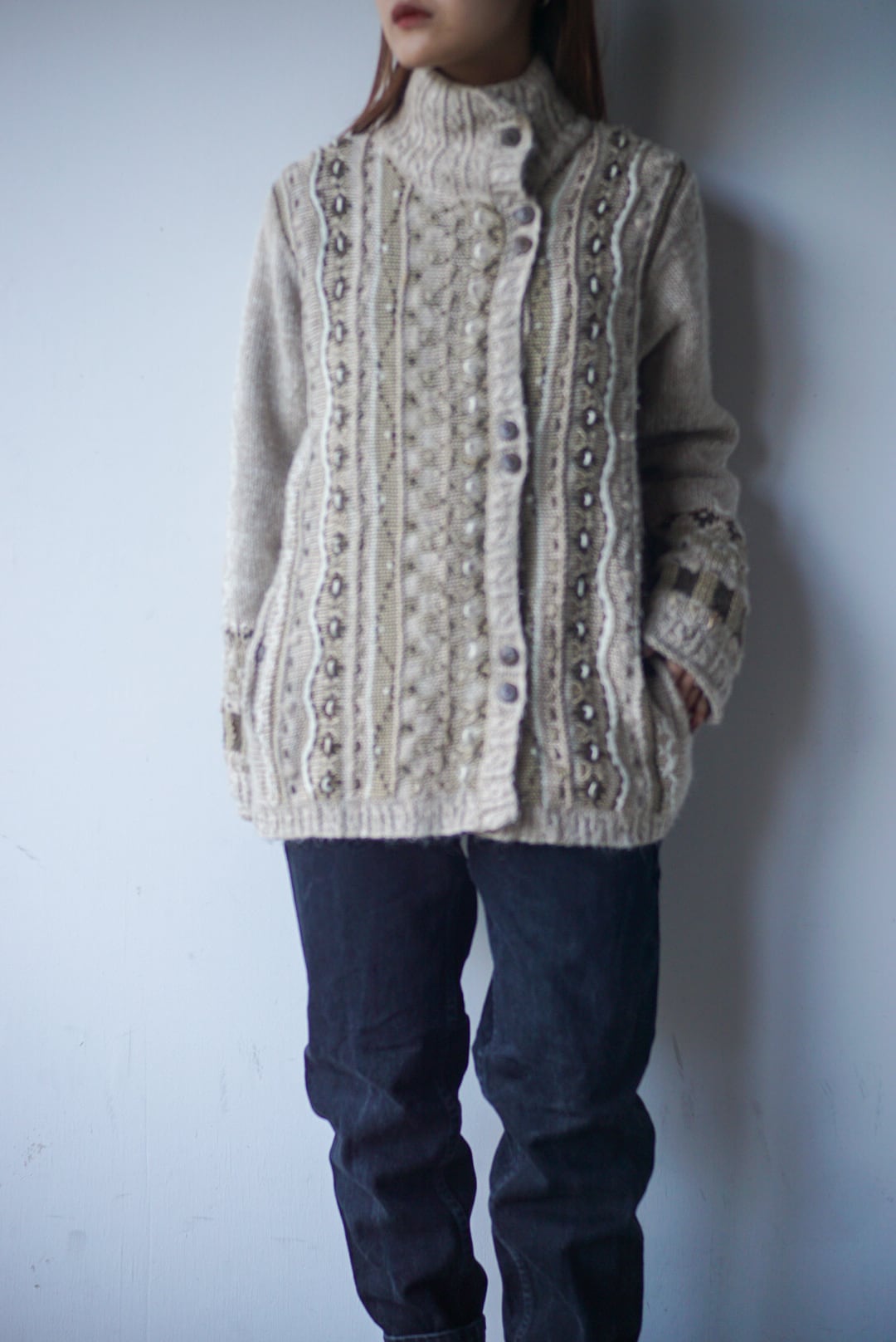 柄が浮き出ているように編まれているデザインがポイントとなり、サイドにはポケットもついており機能性も高い1着