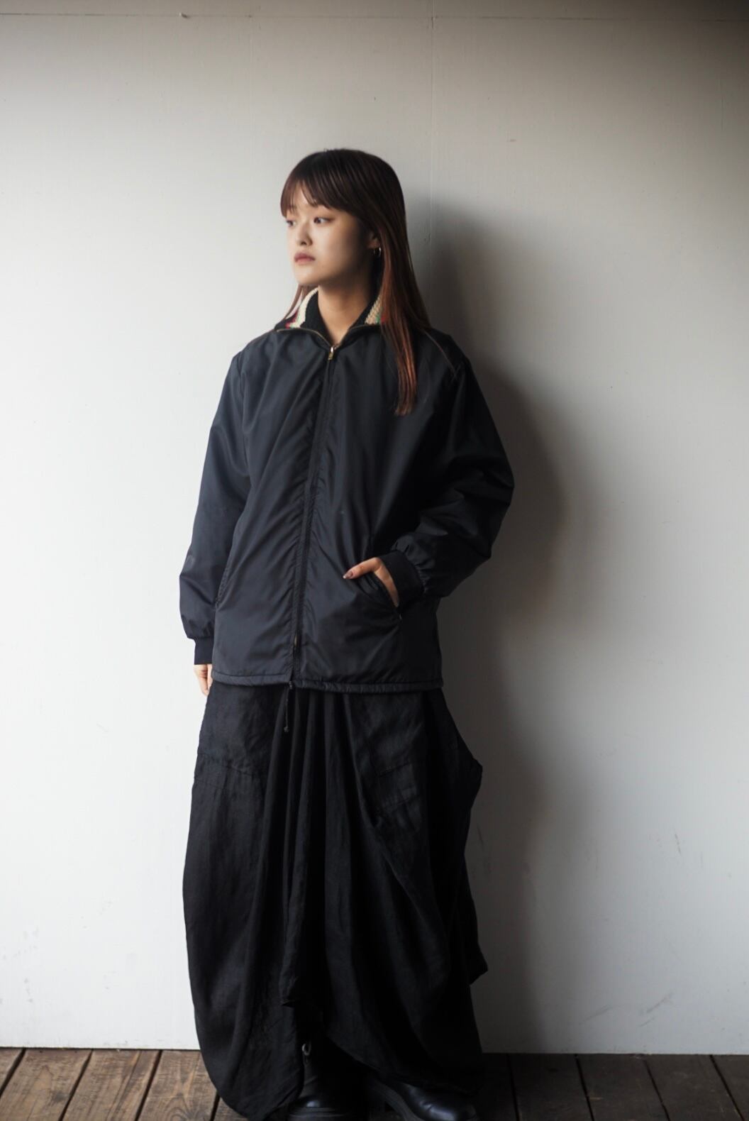 ブラックカラーのワントーンデザインと、首元のリブがポイントになるデザインのリバーシブル