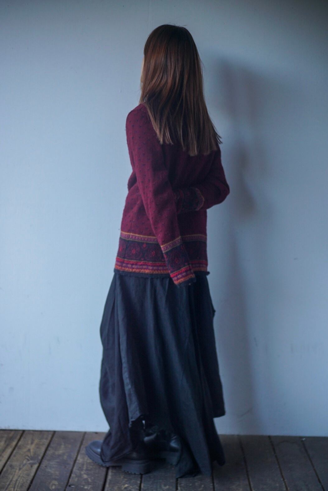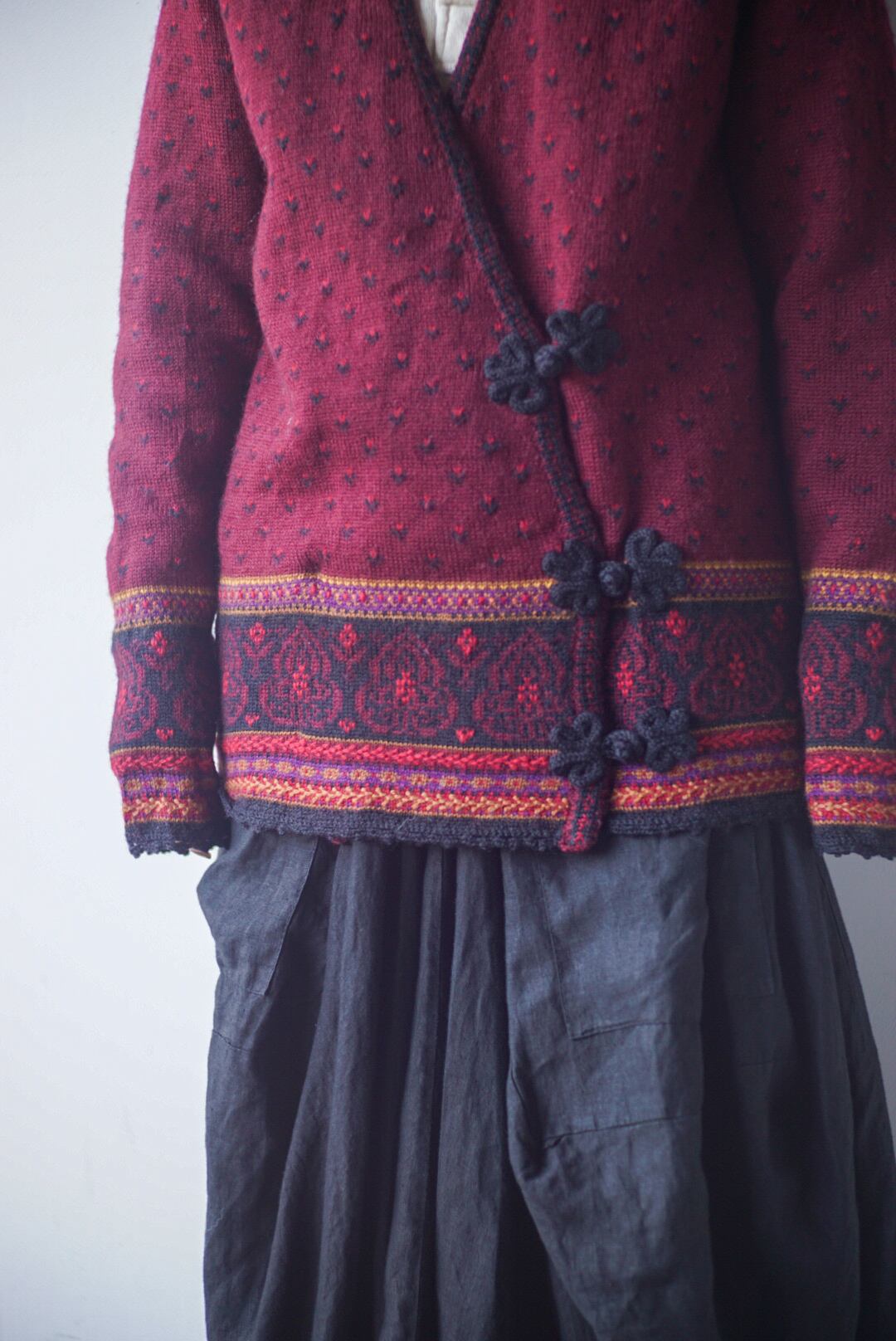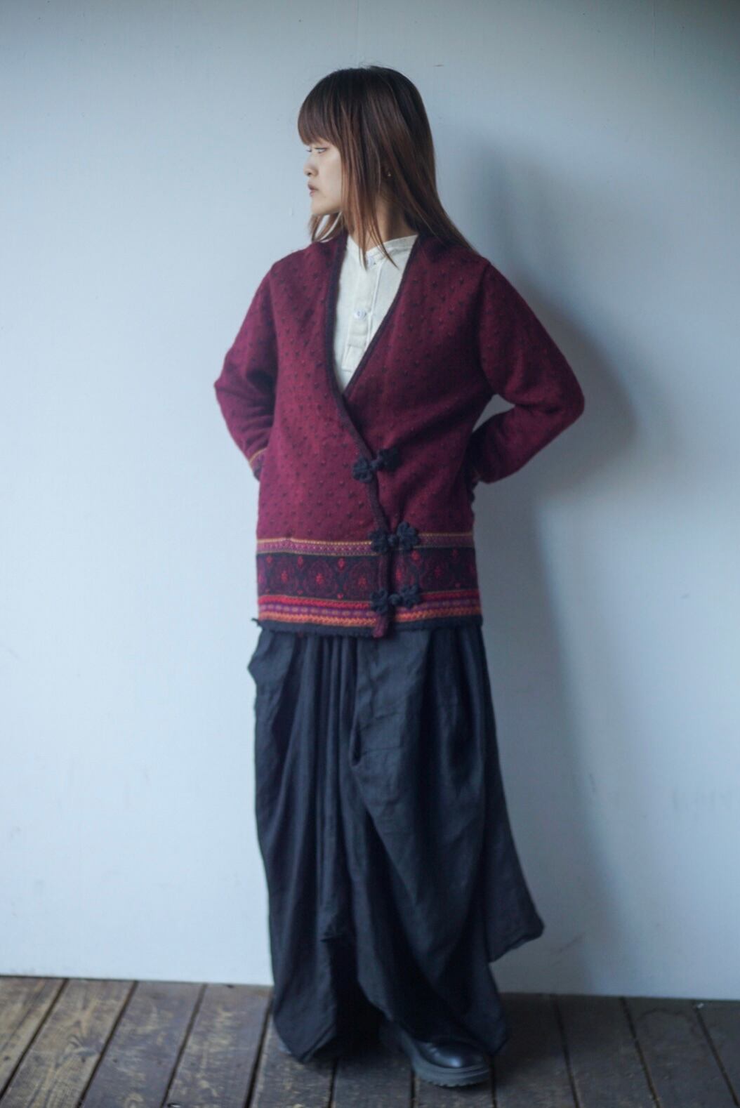 ワインレッドをベースに上品な色合いで、細かい総柄やチャイナボタンのデザインがポイントになります