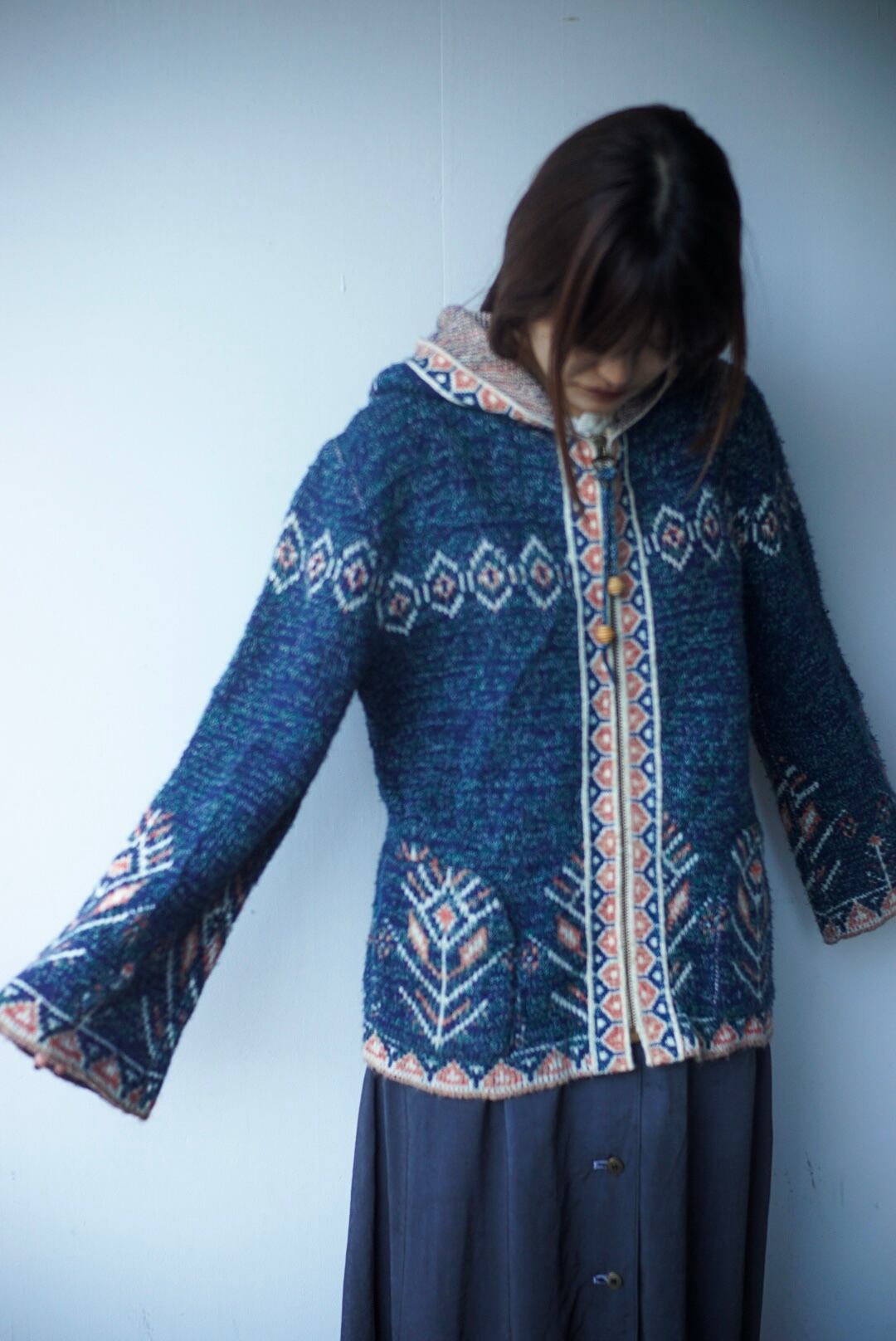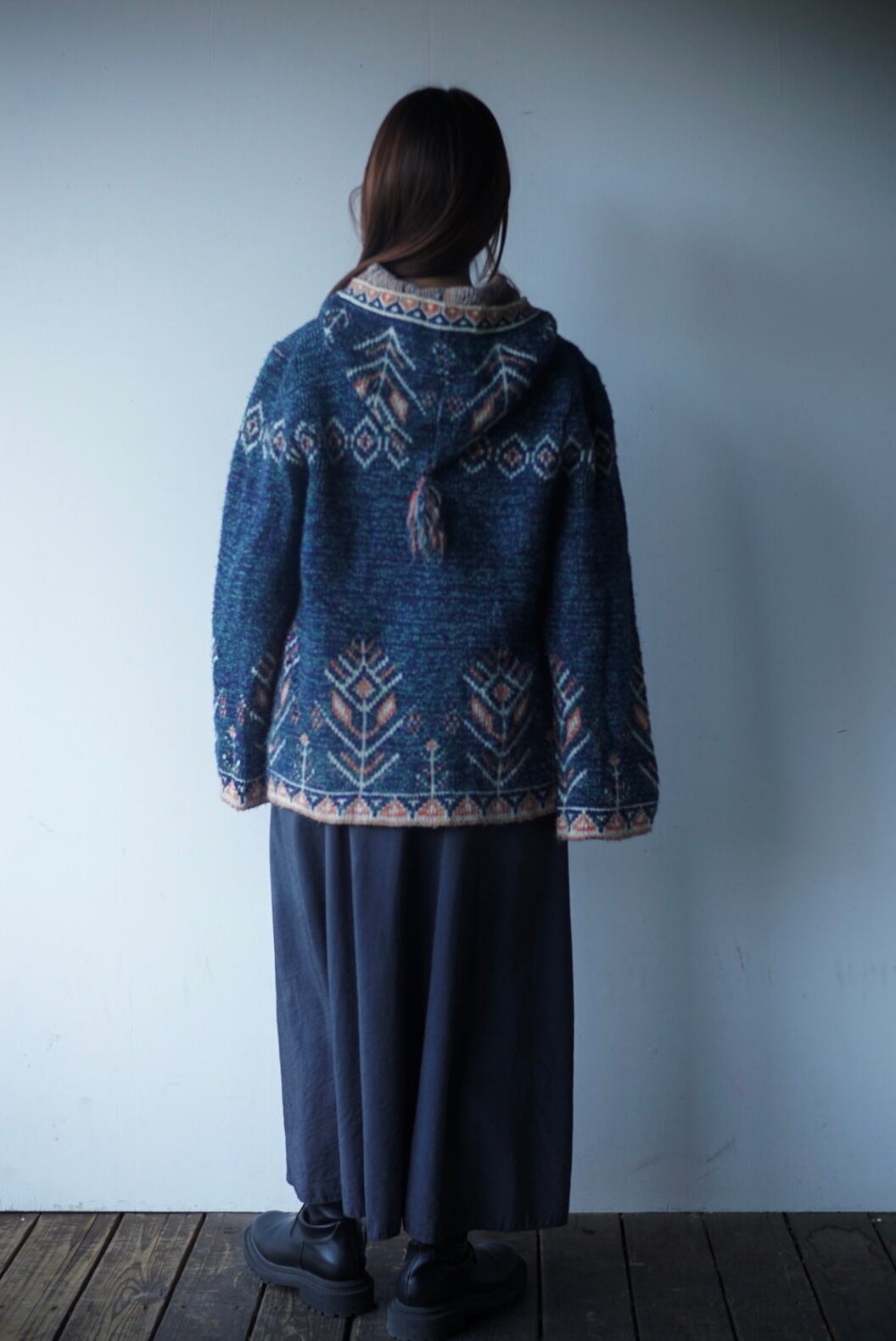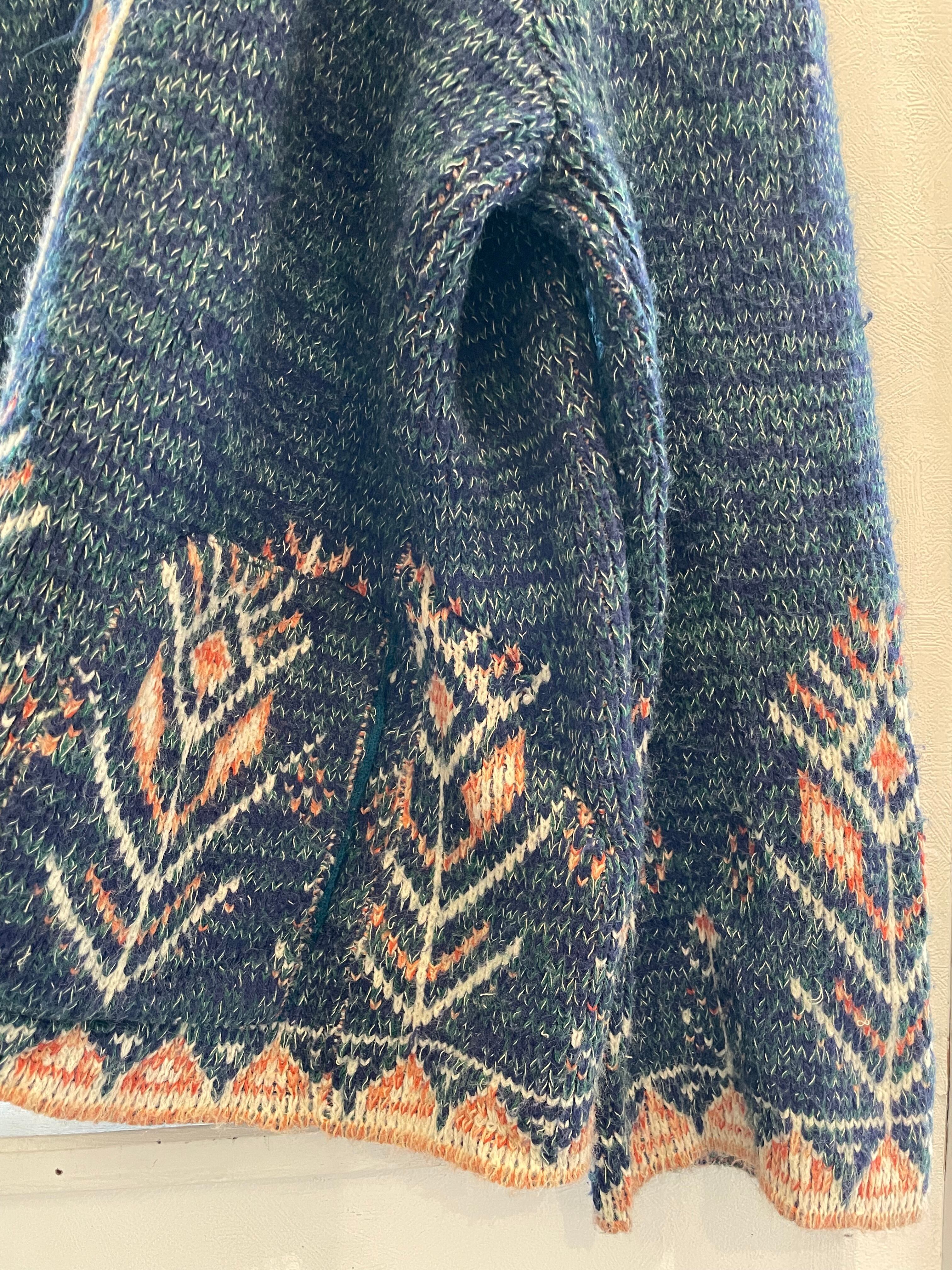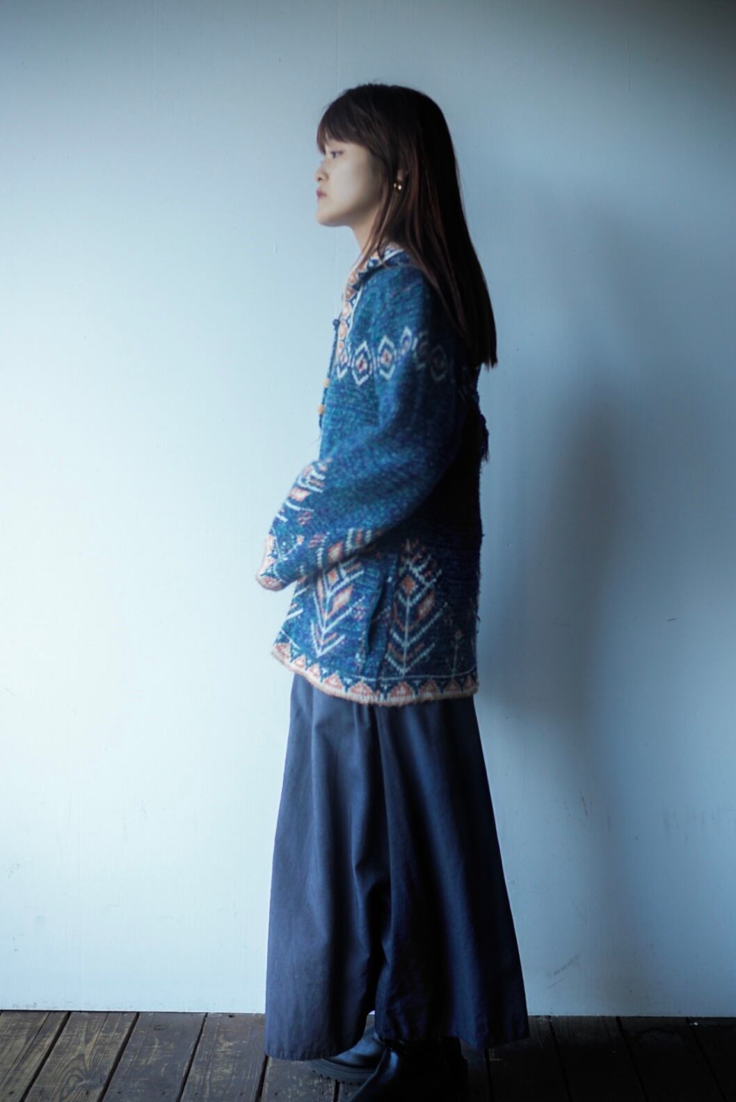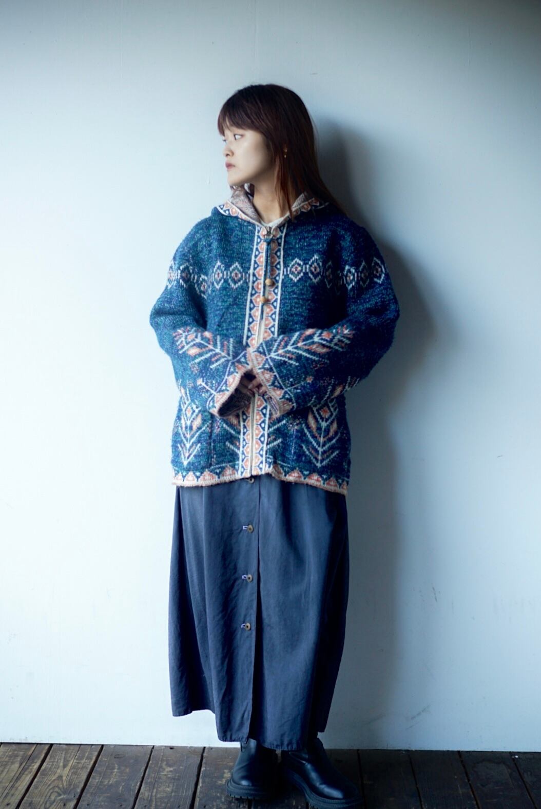 ネイビーとグリーンが混ざったカラーに、白と暖色の柄が可愛らしいデザイン
