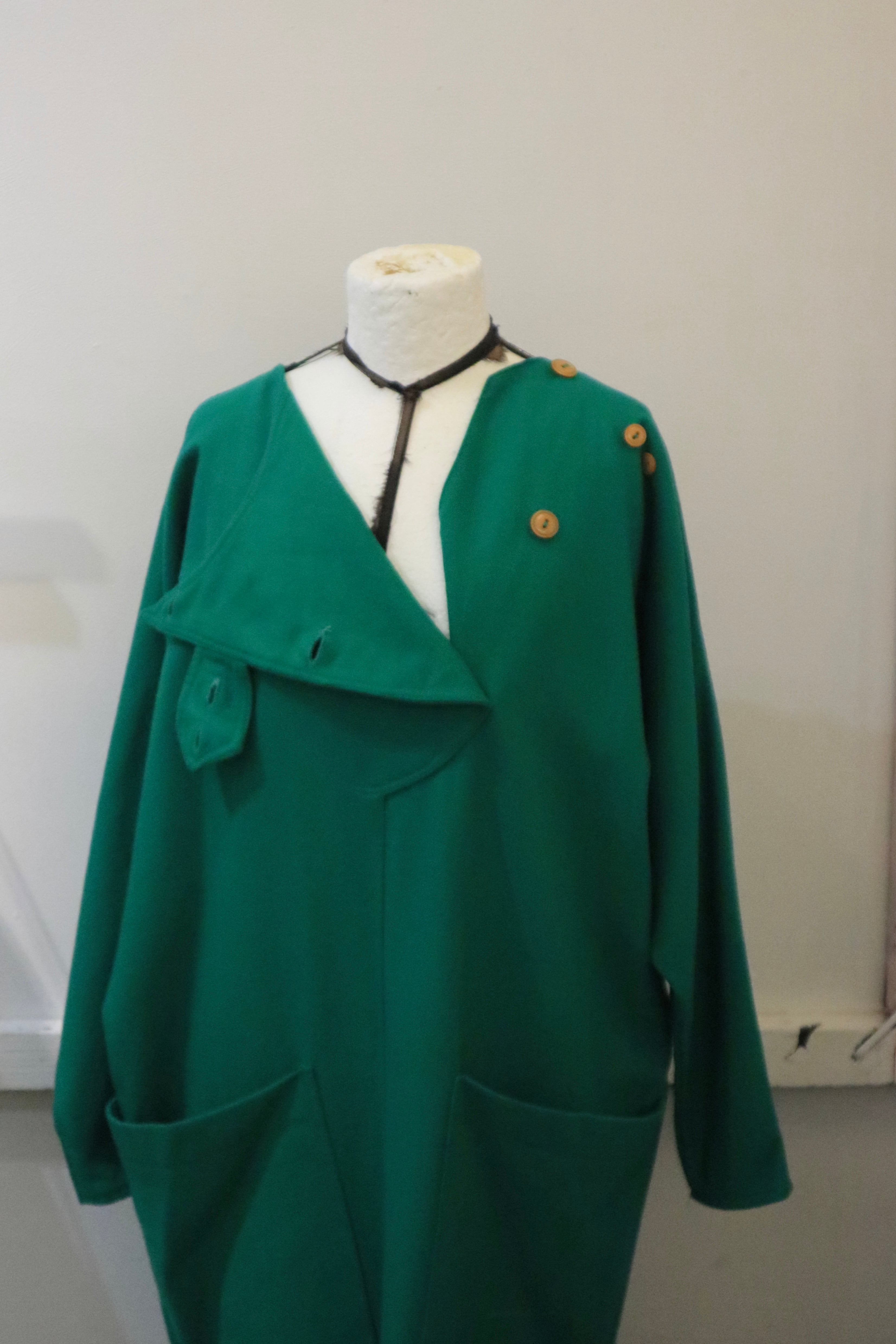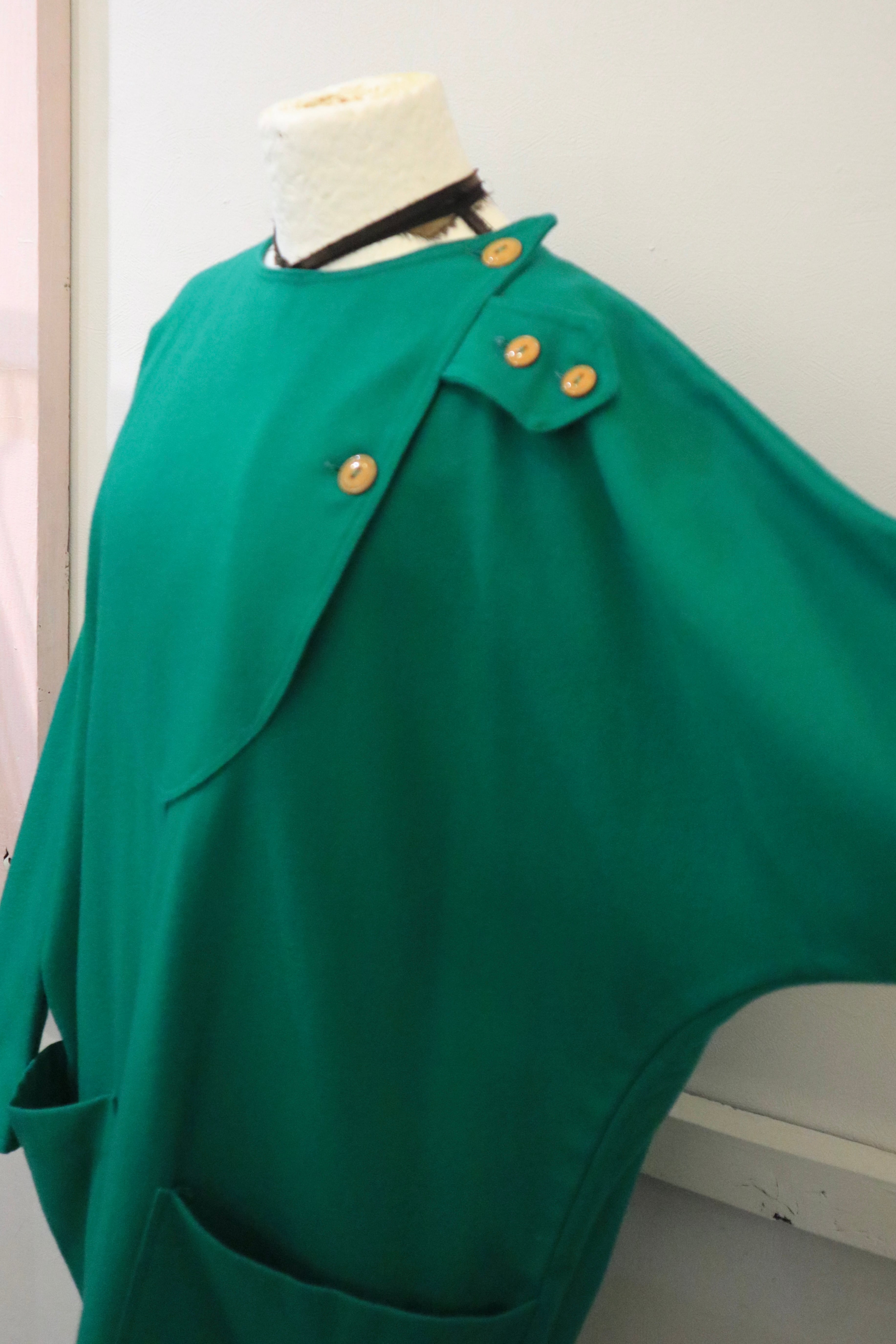 肩から袖にかけて自然に落ちるドルマンスリーブ、
