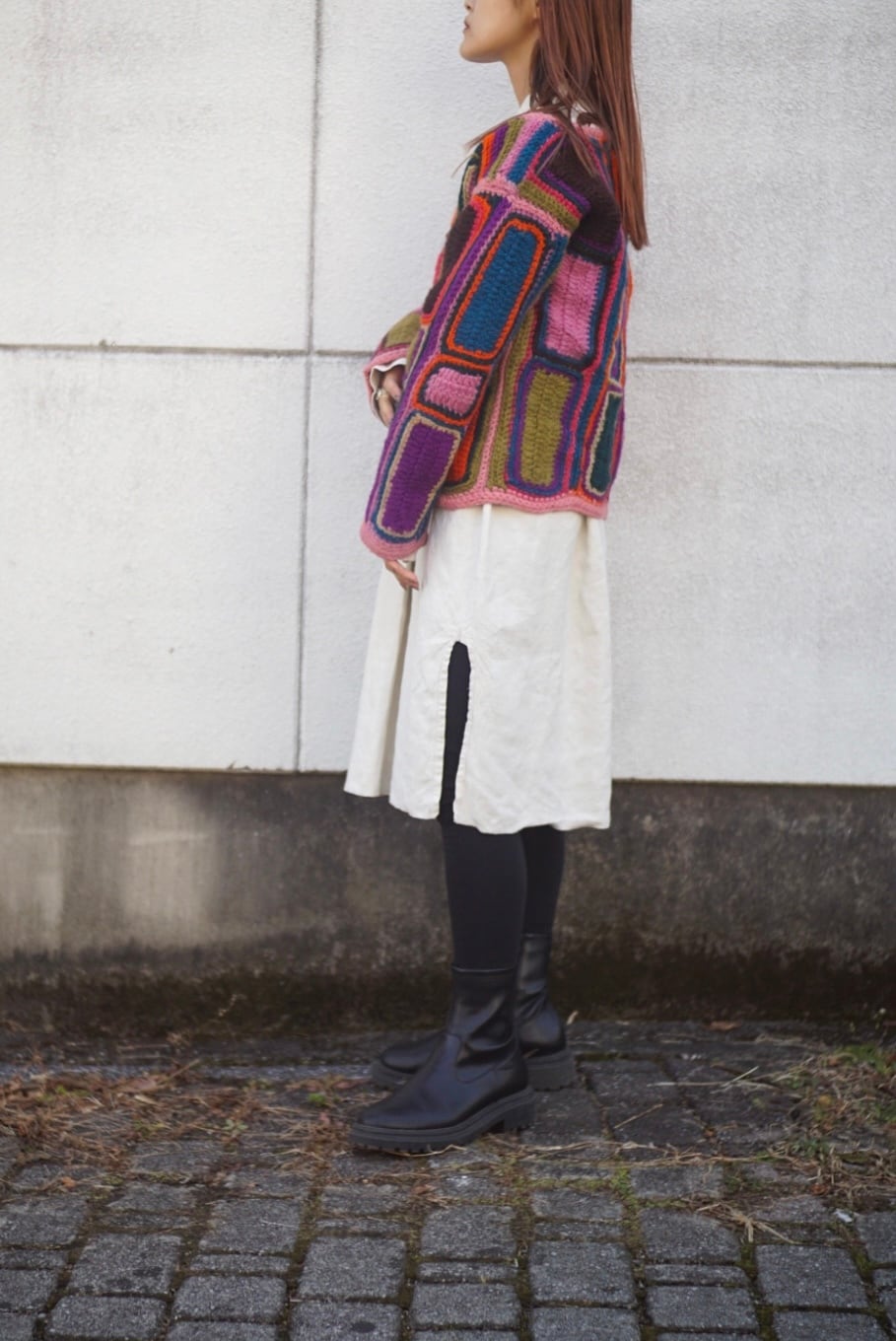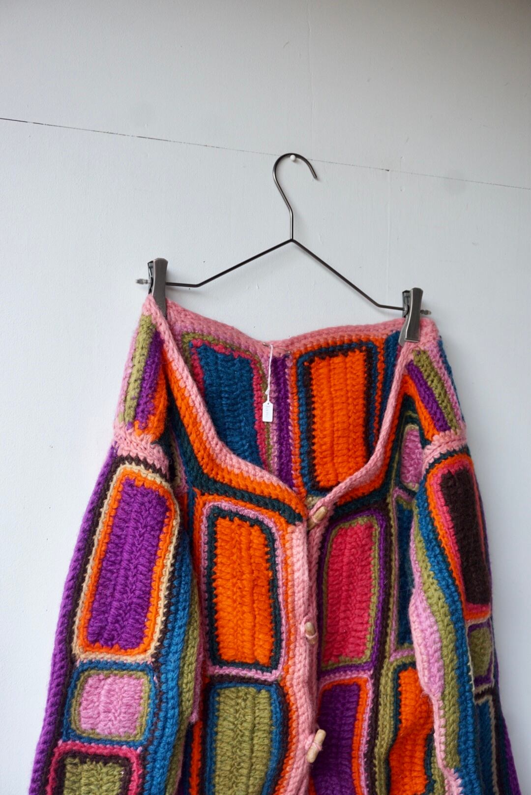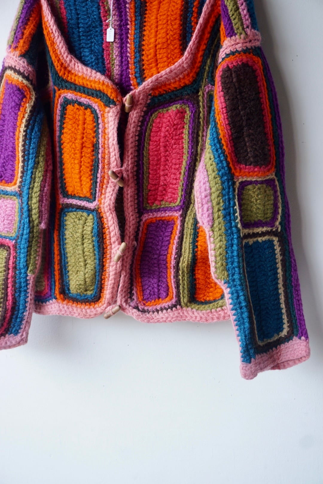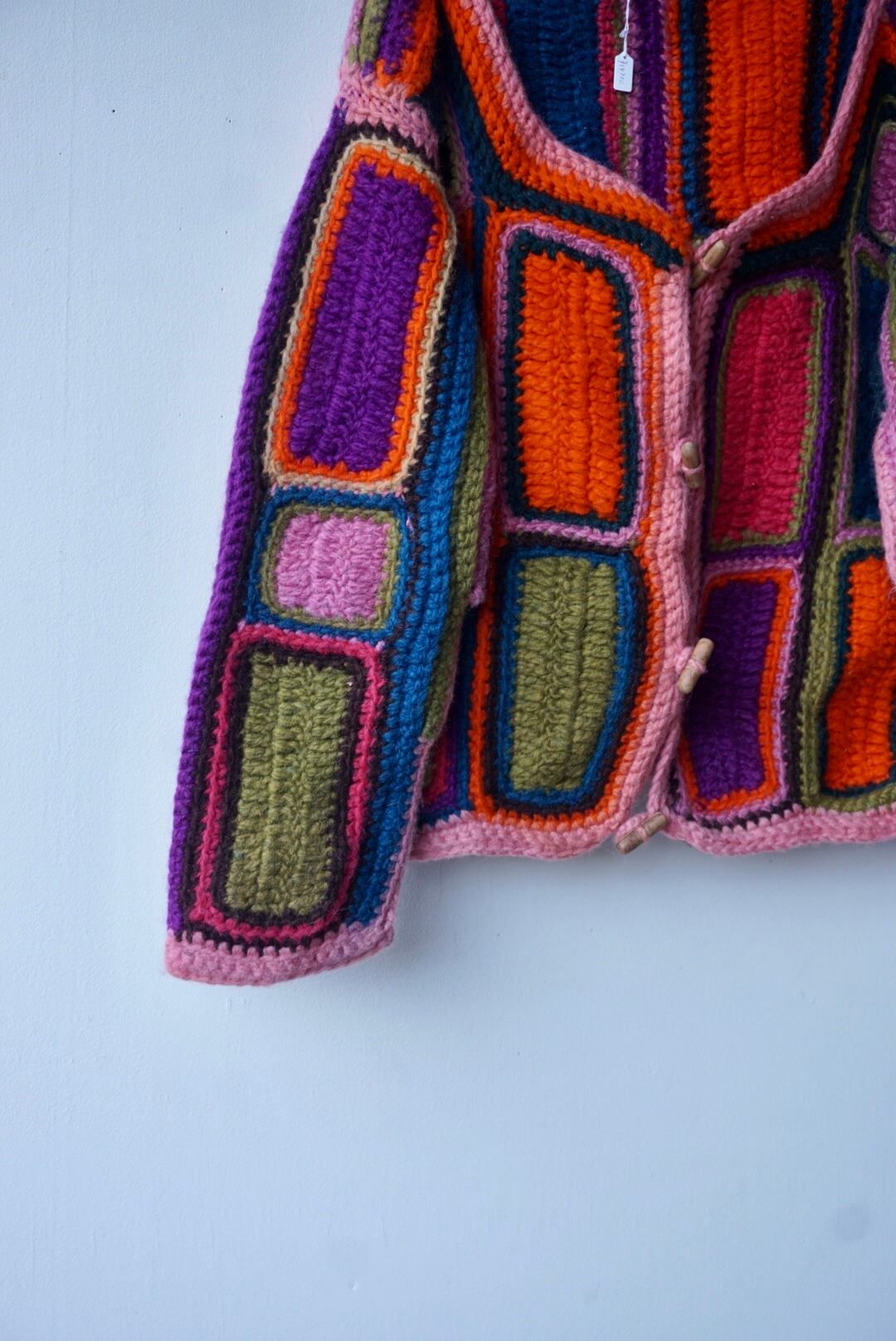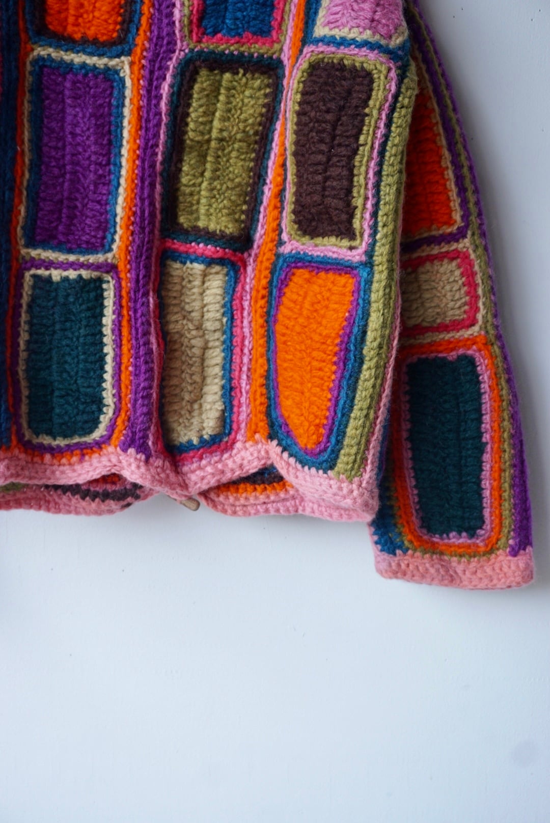 おそらくハンドメイドでつくられたクロシェ編みの厚みのあるニットカーディガン