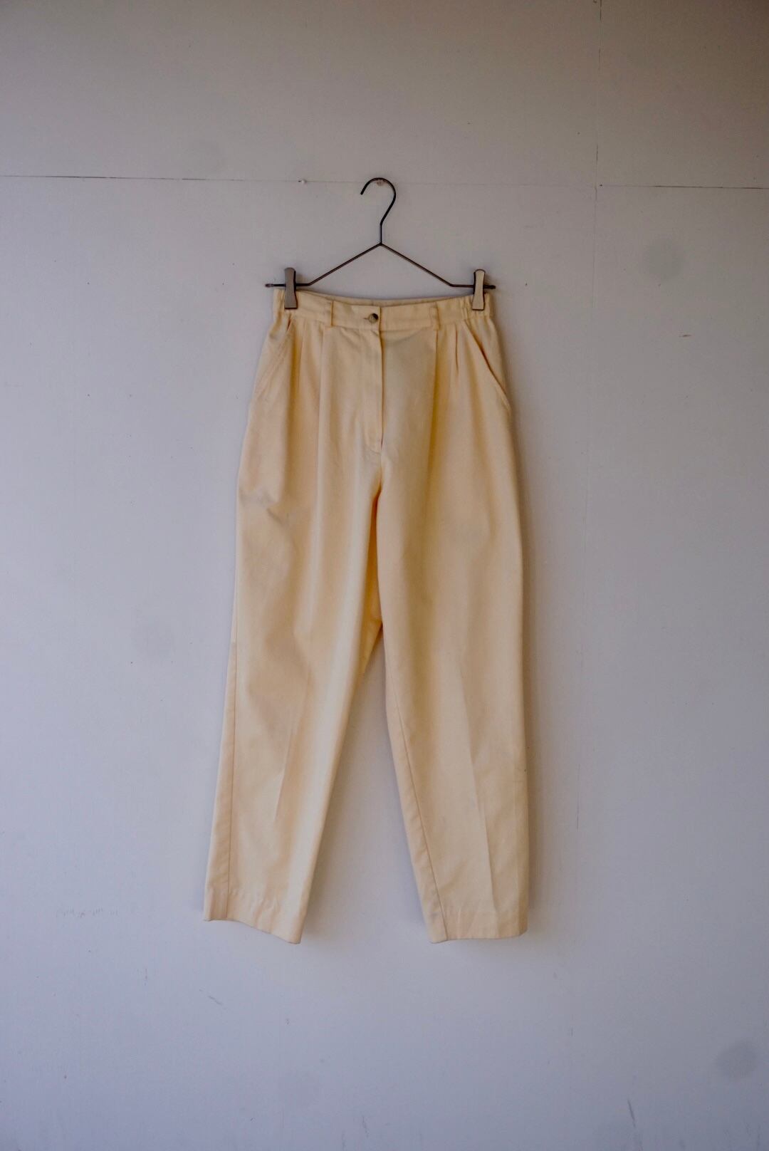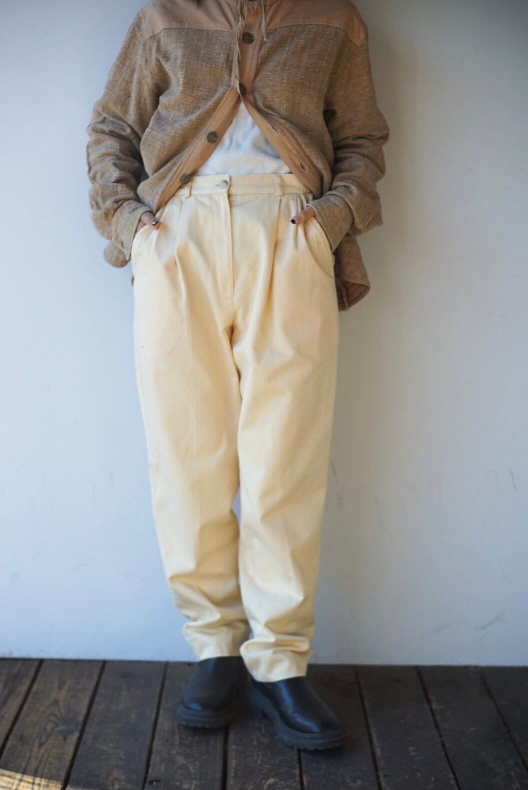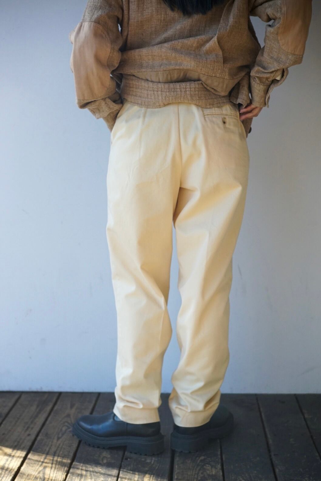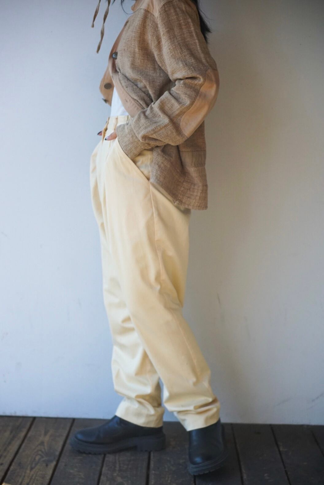 裾にかけて細身になるシルエットや淡いイエローカラーが程よくポイントになります