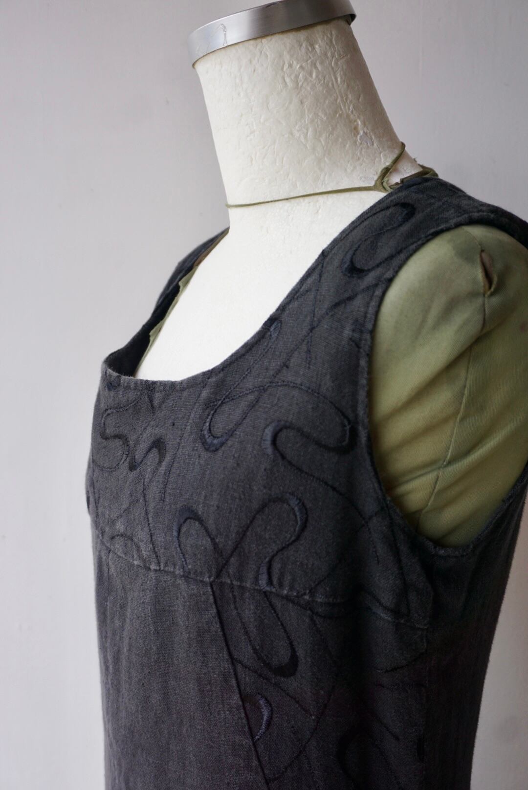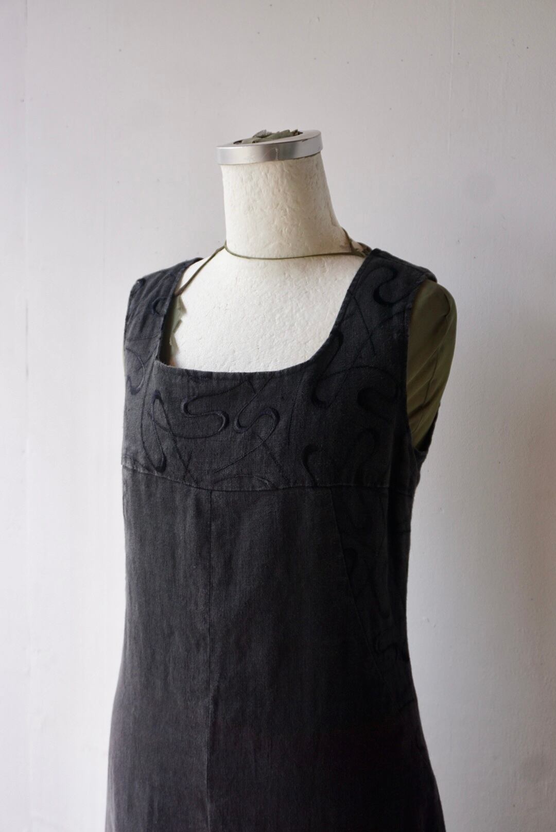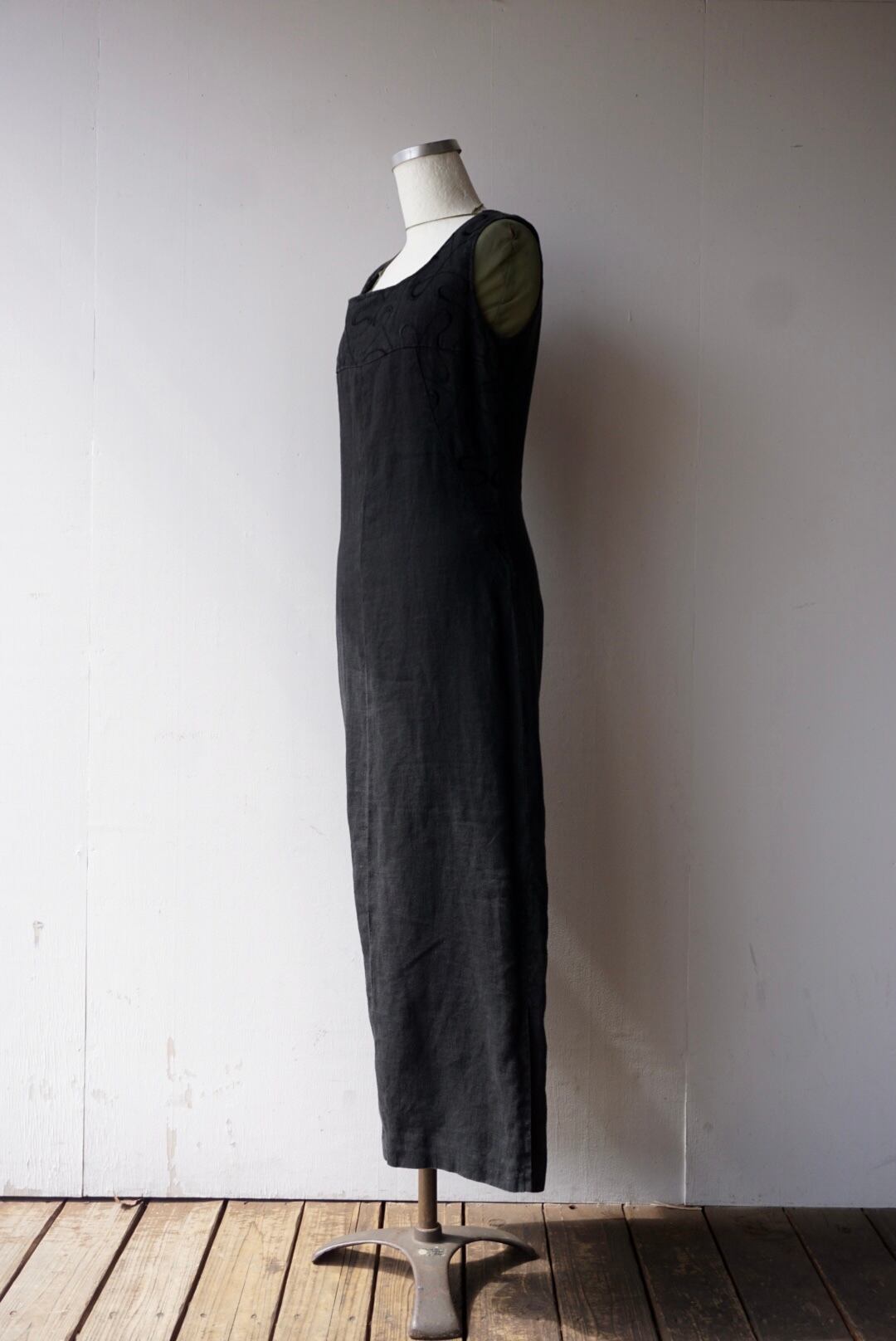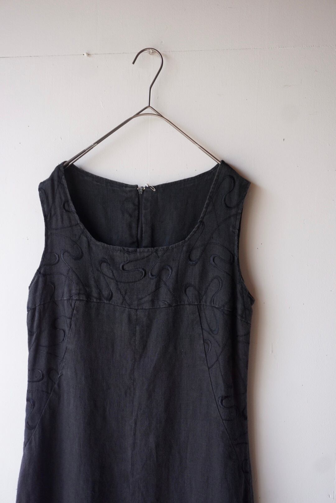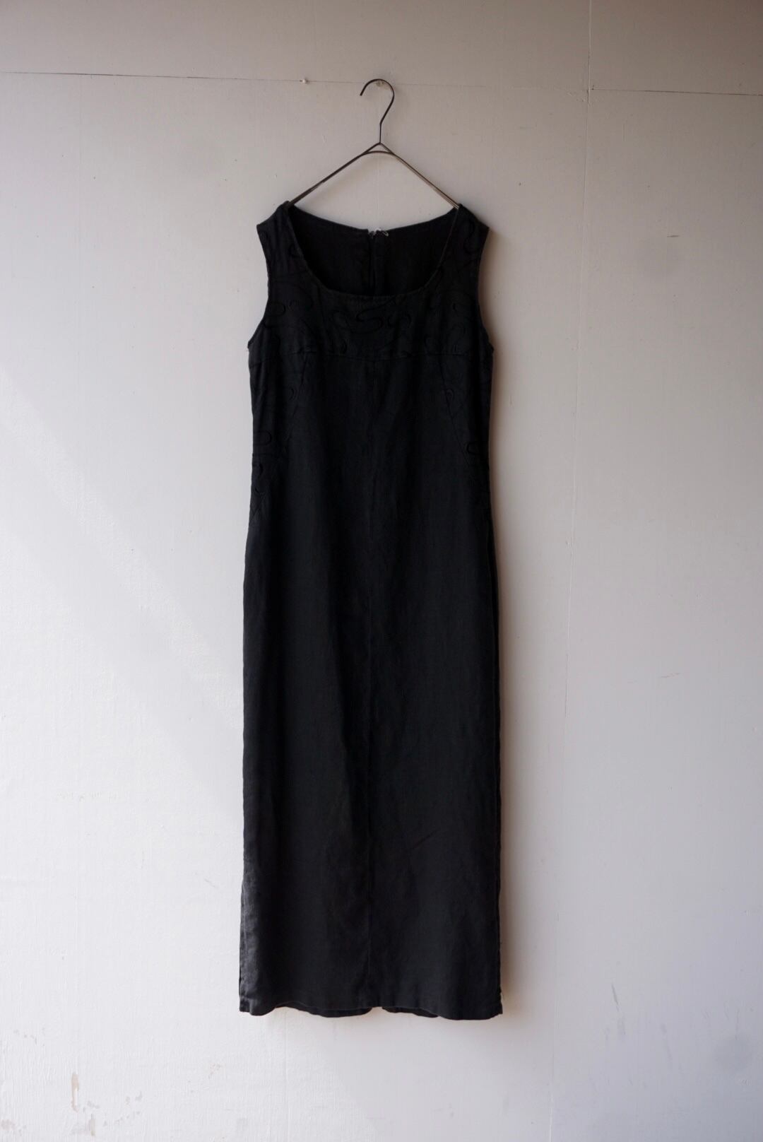 胸元から両脇にかけて黒の刺繍が施されたノースリーブワンピース