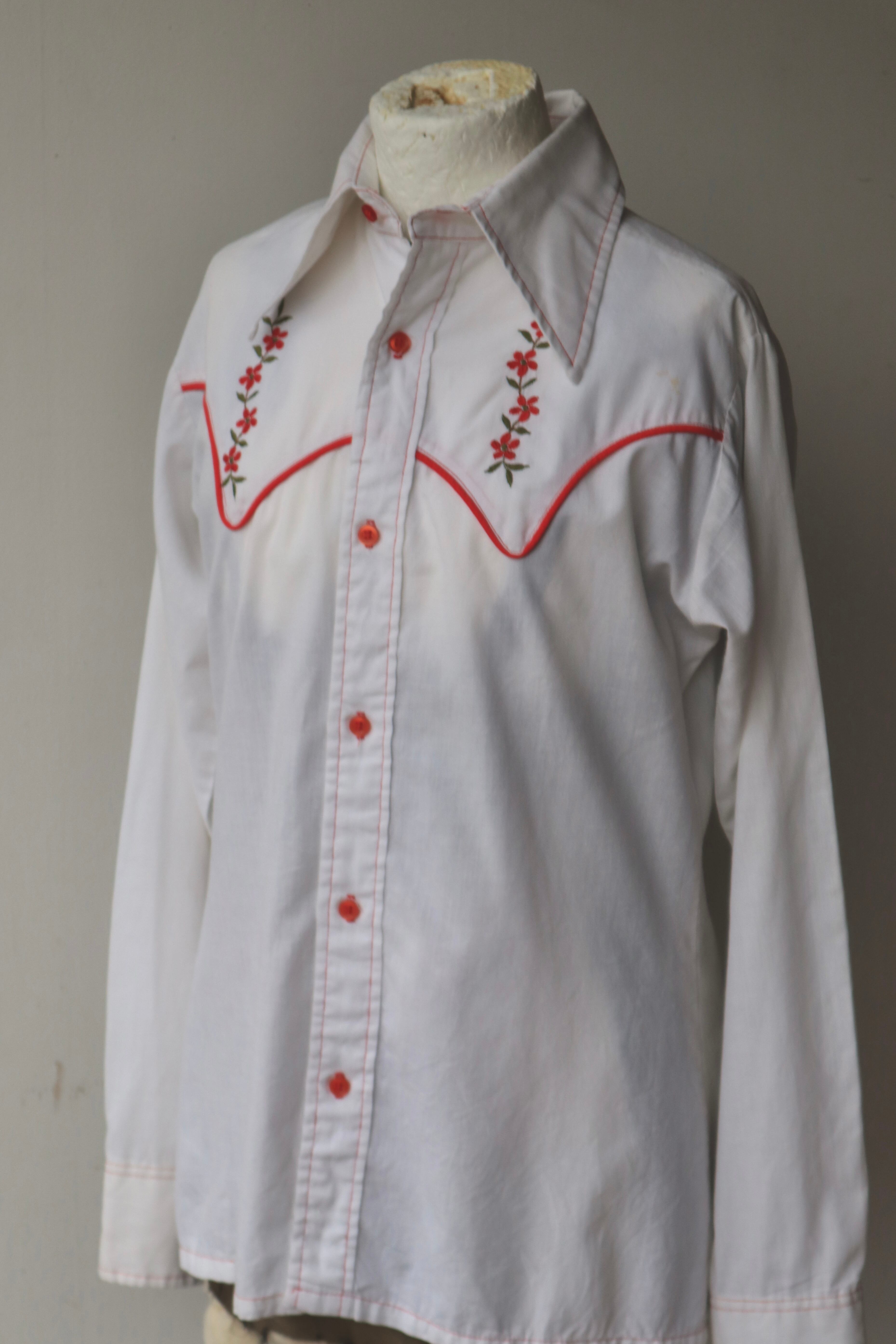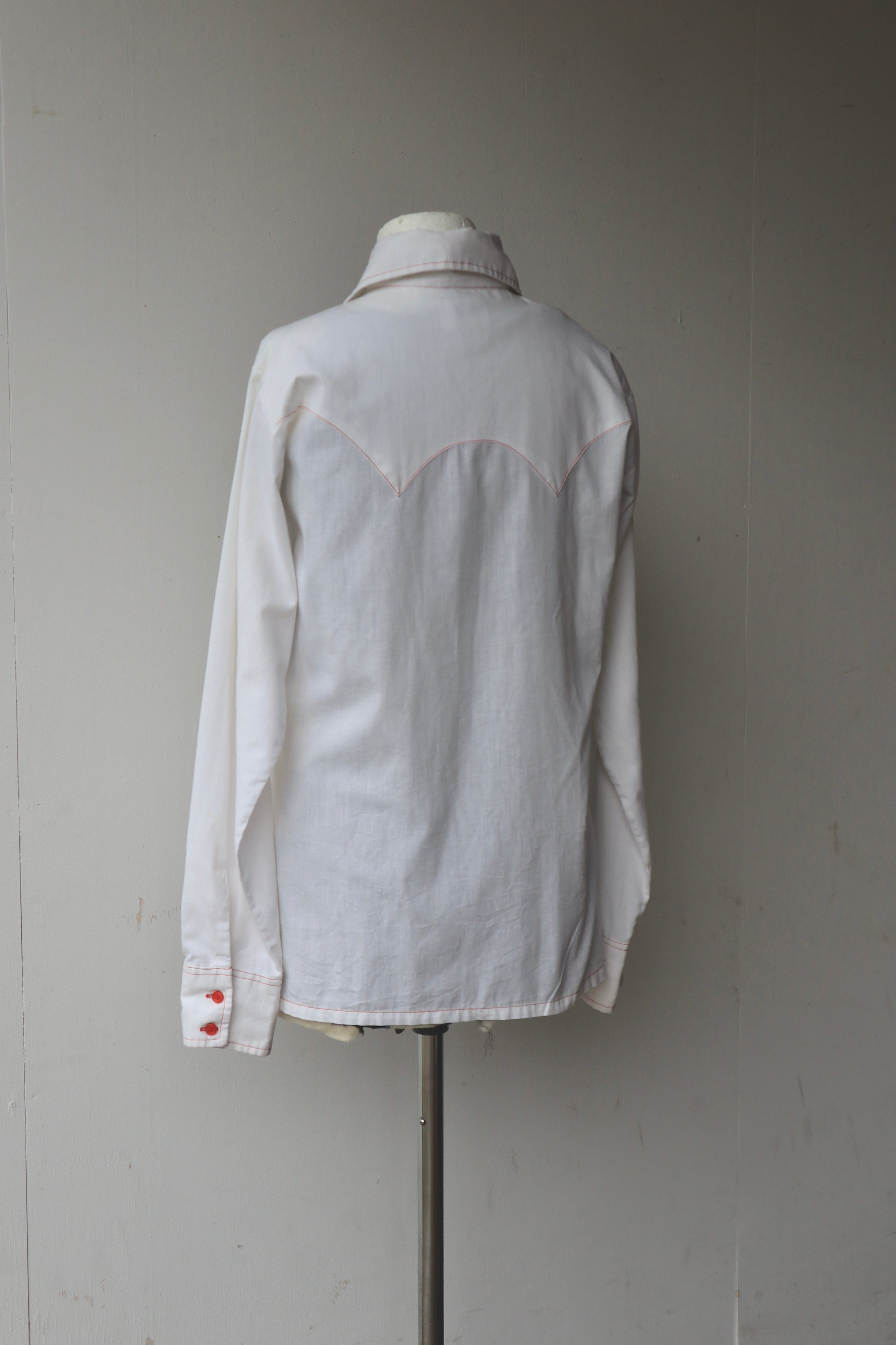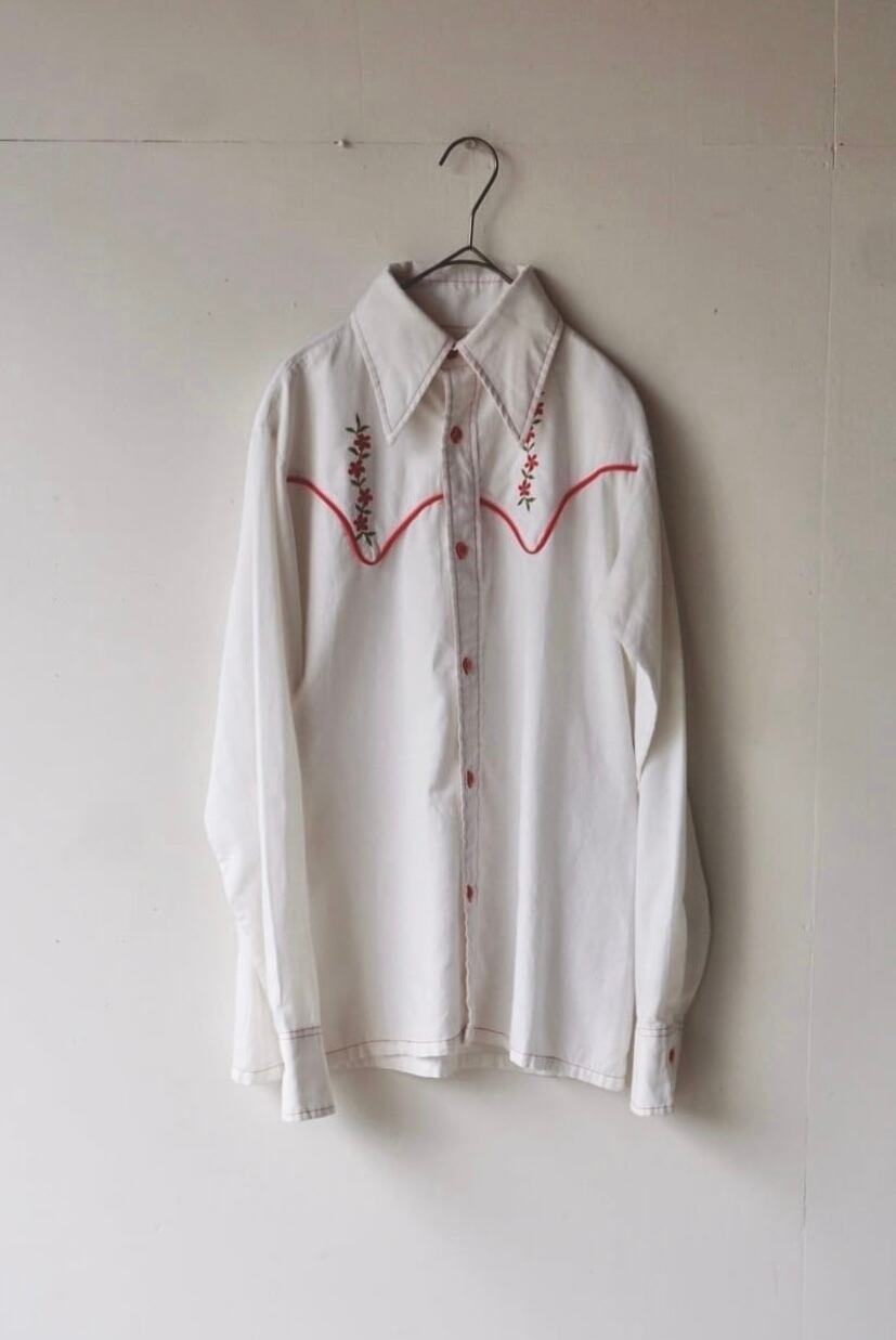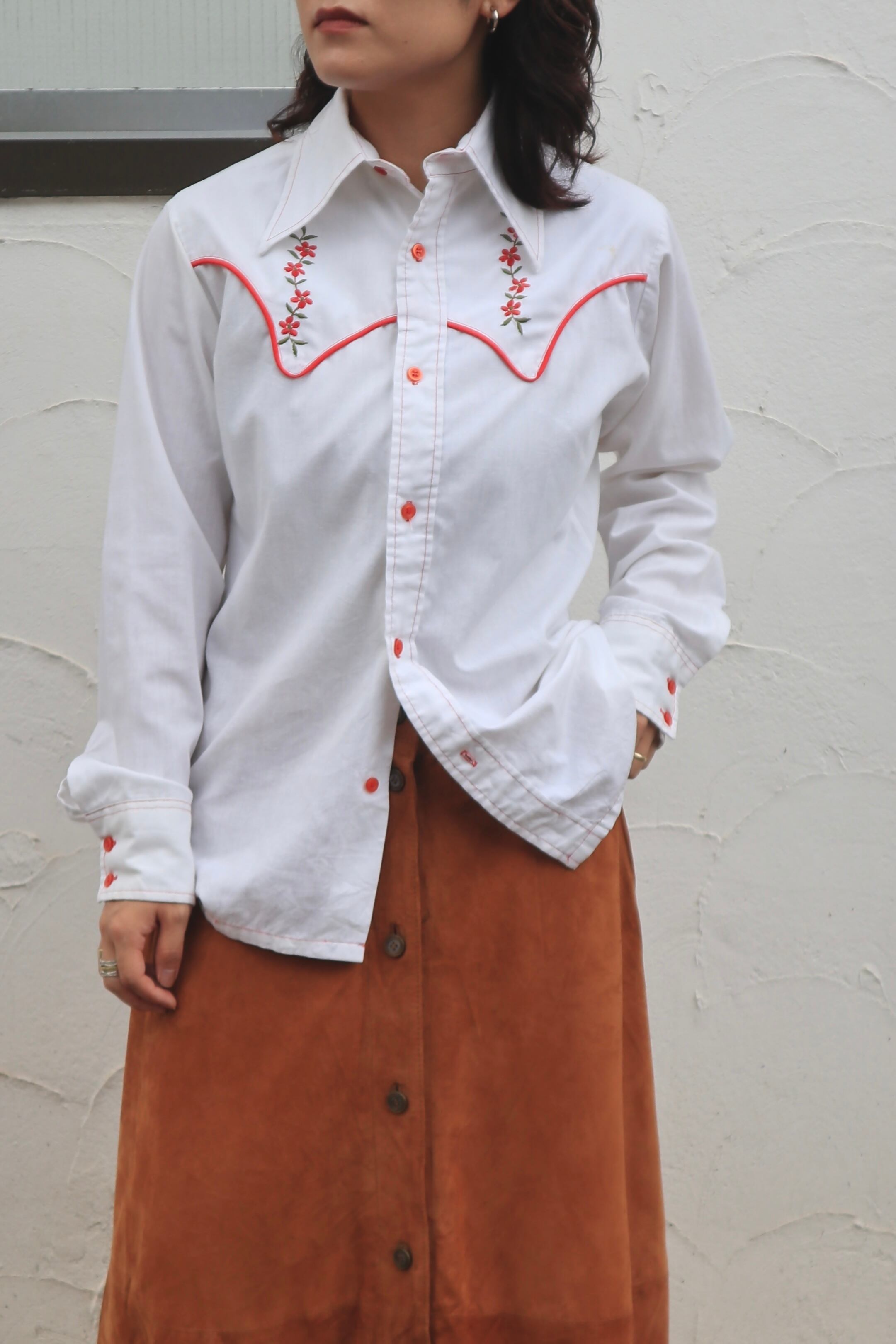 ホワイトベースにレッドのパイピングとお花の刺繍が施された、ウエスタンシャツ