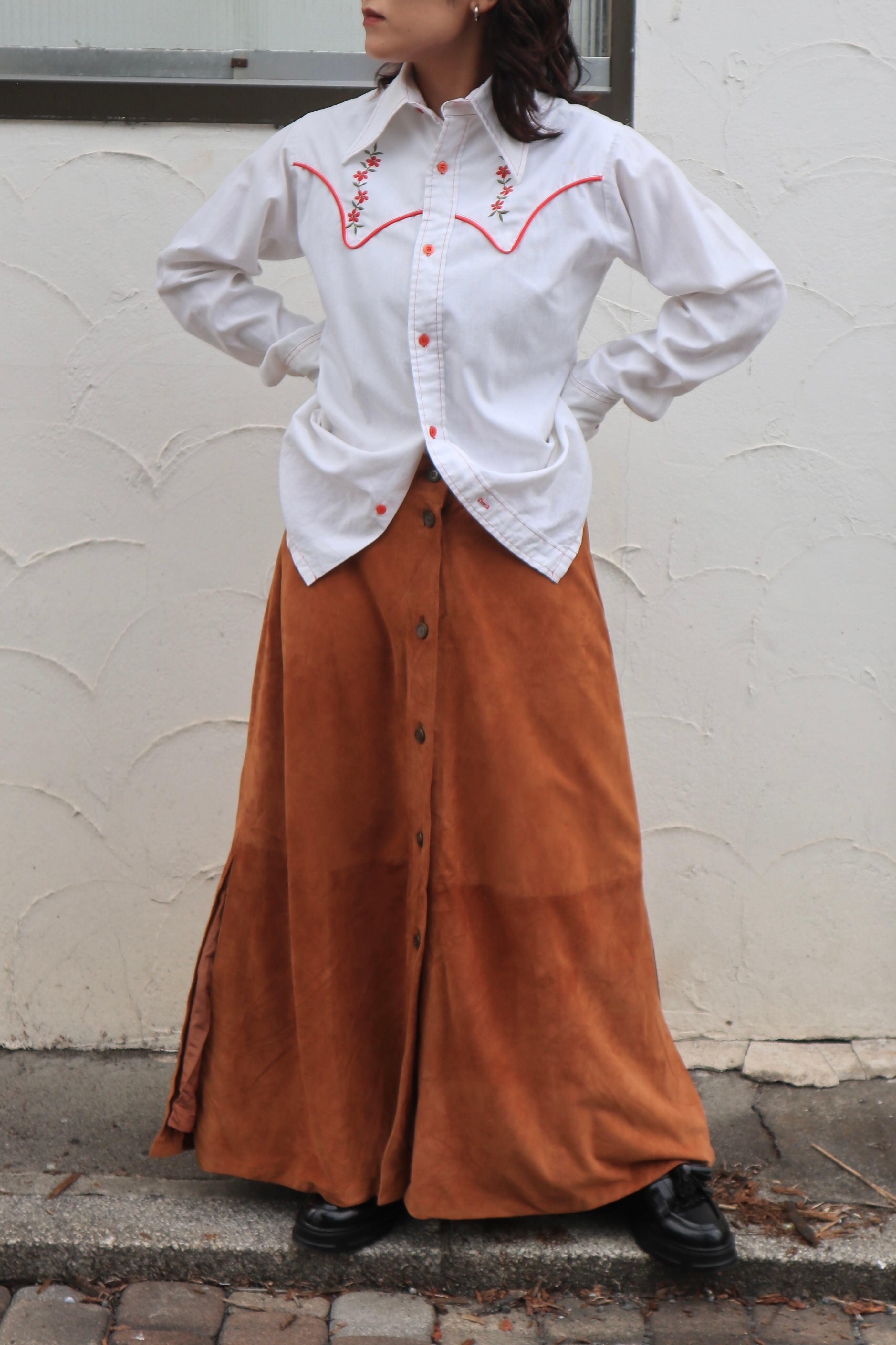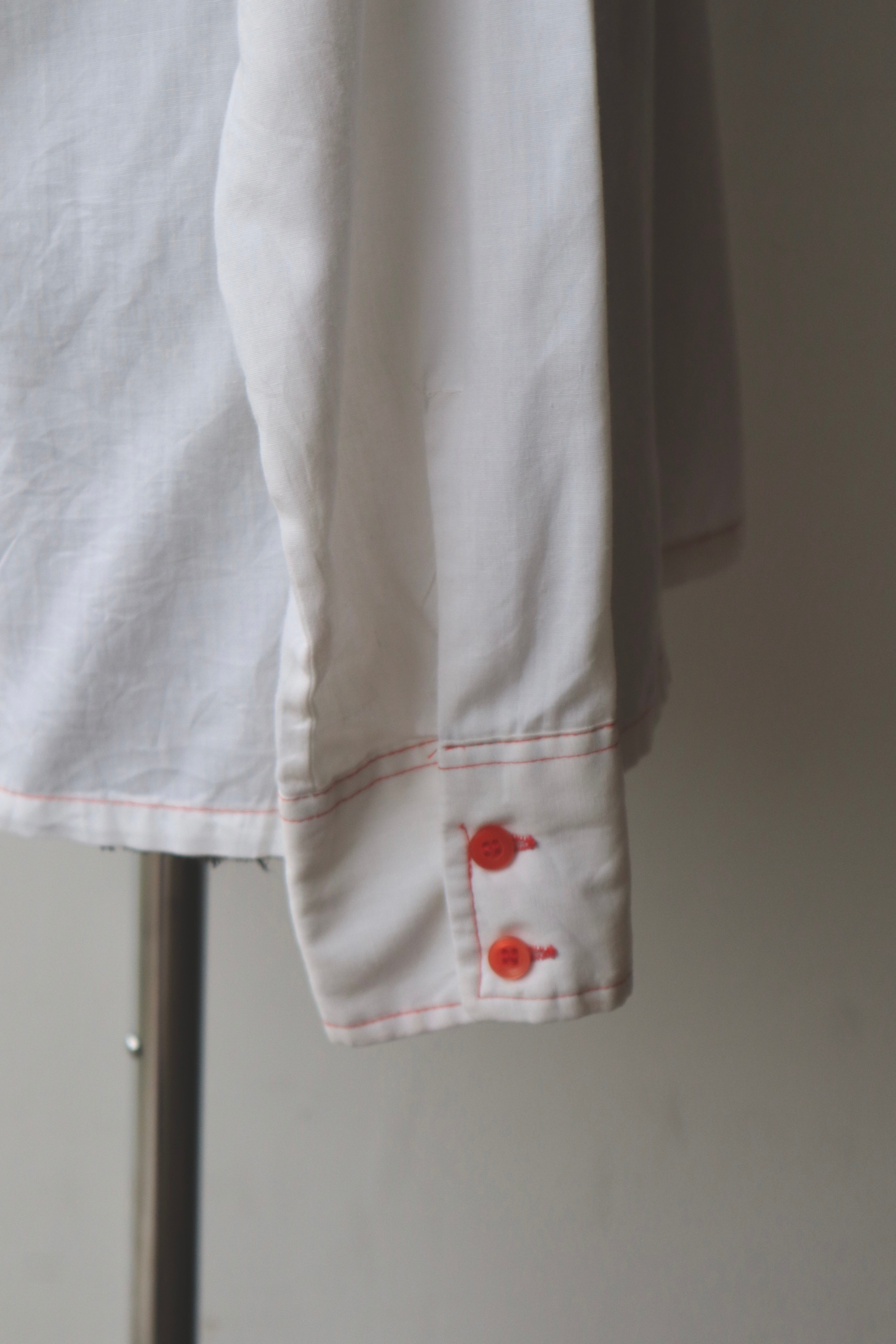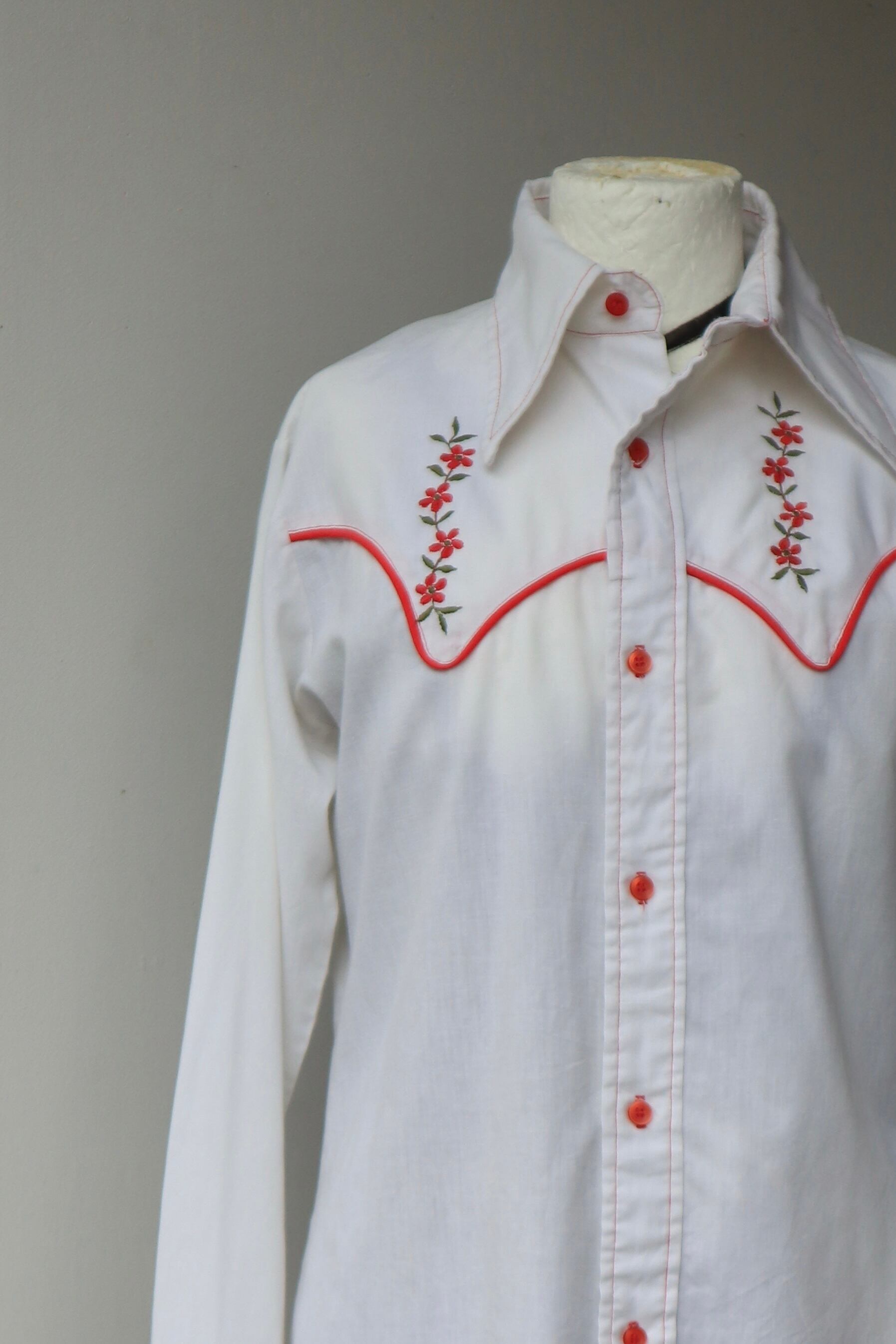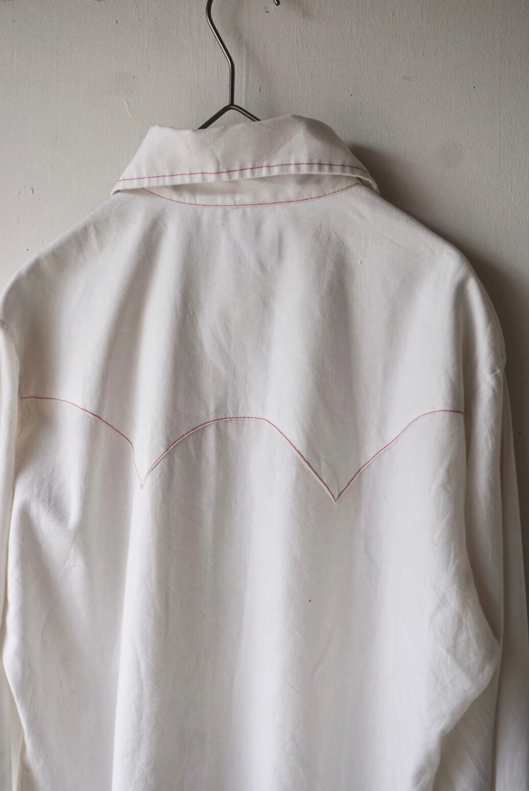 ホワイトベースにレッドのパイピングとお花の刺繍が施された、ウエスタンシャツ
