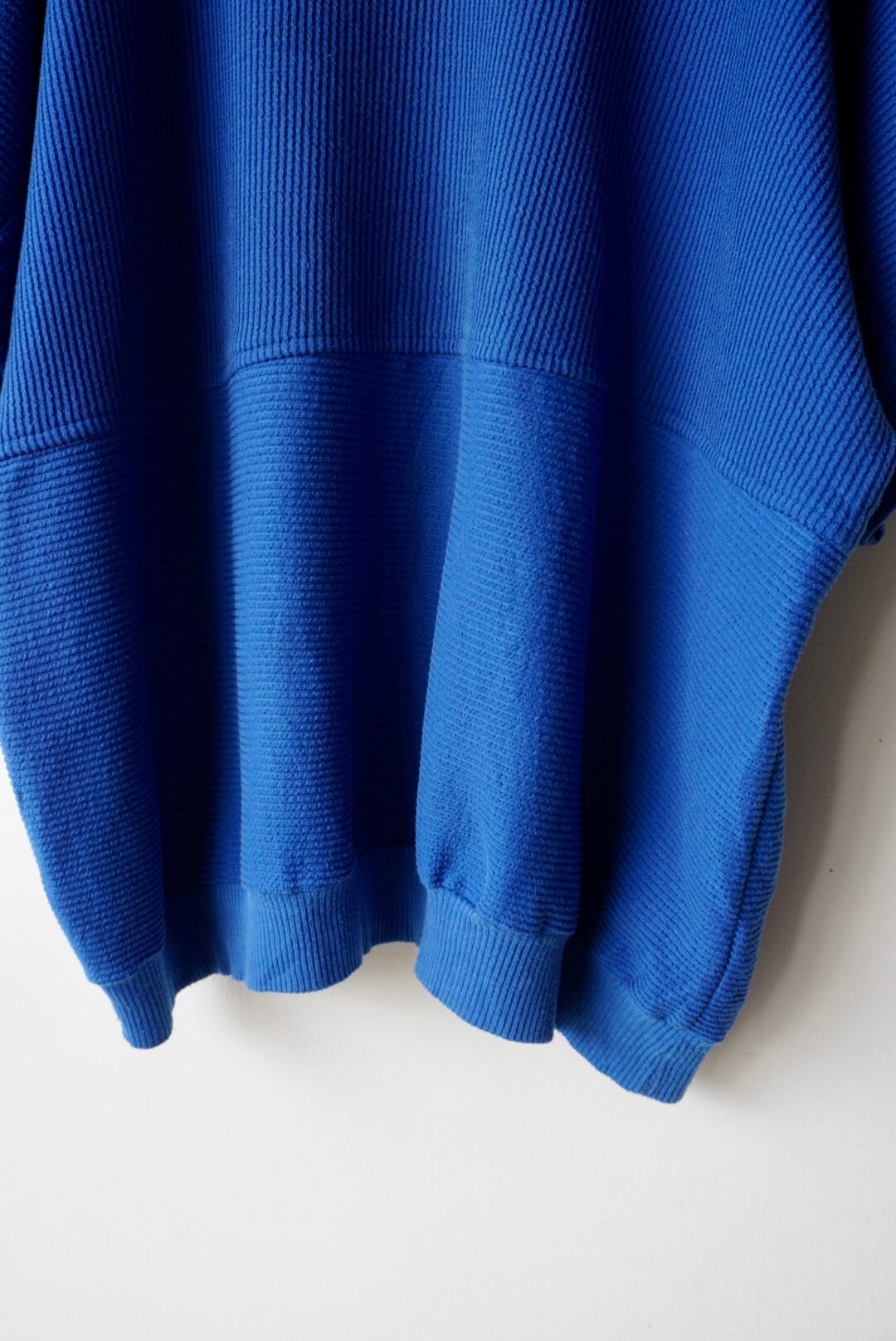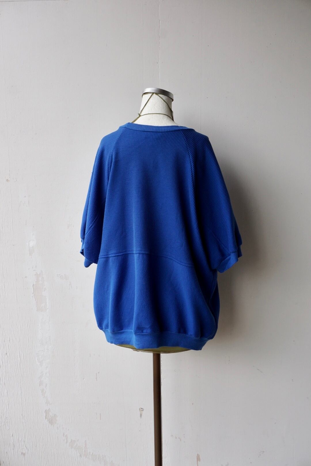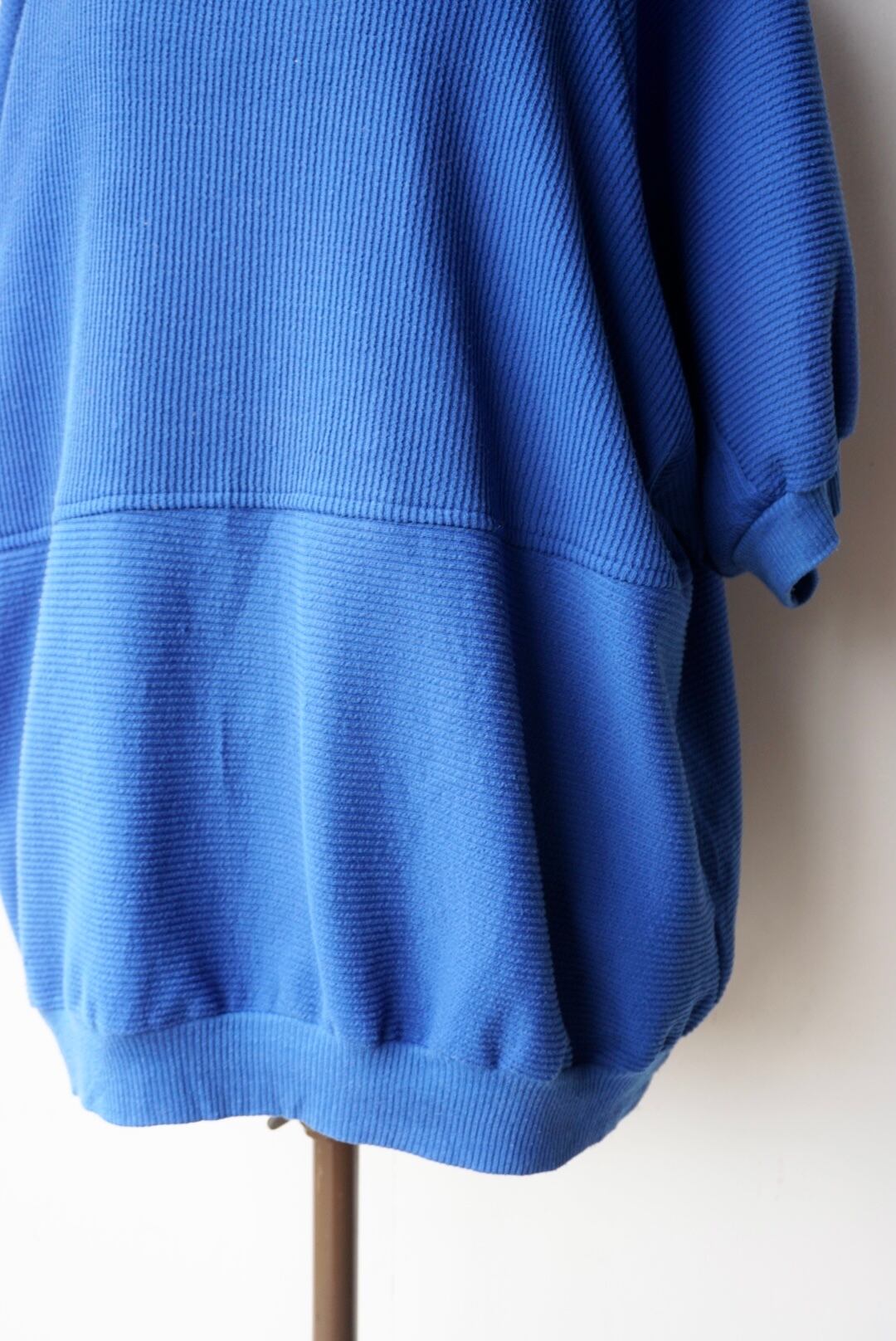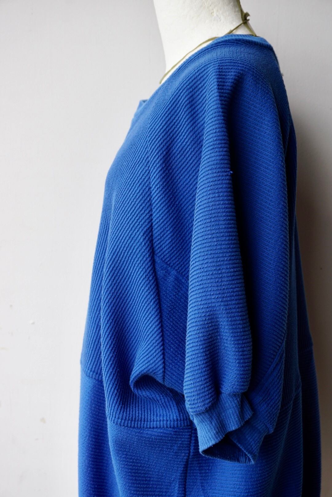 濃いブルーカラーが目を惹く一枚で無地ながらデザイン性が高く、ラグランスリーブで体型問わず着ていただけます。
