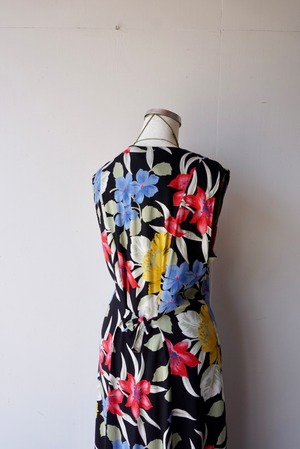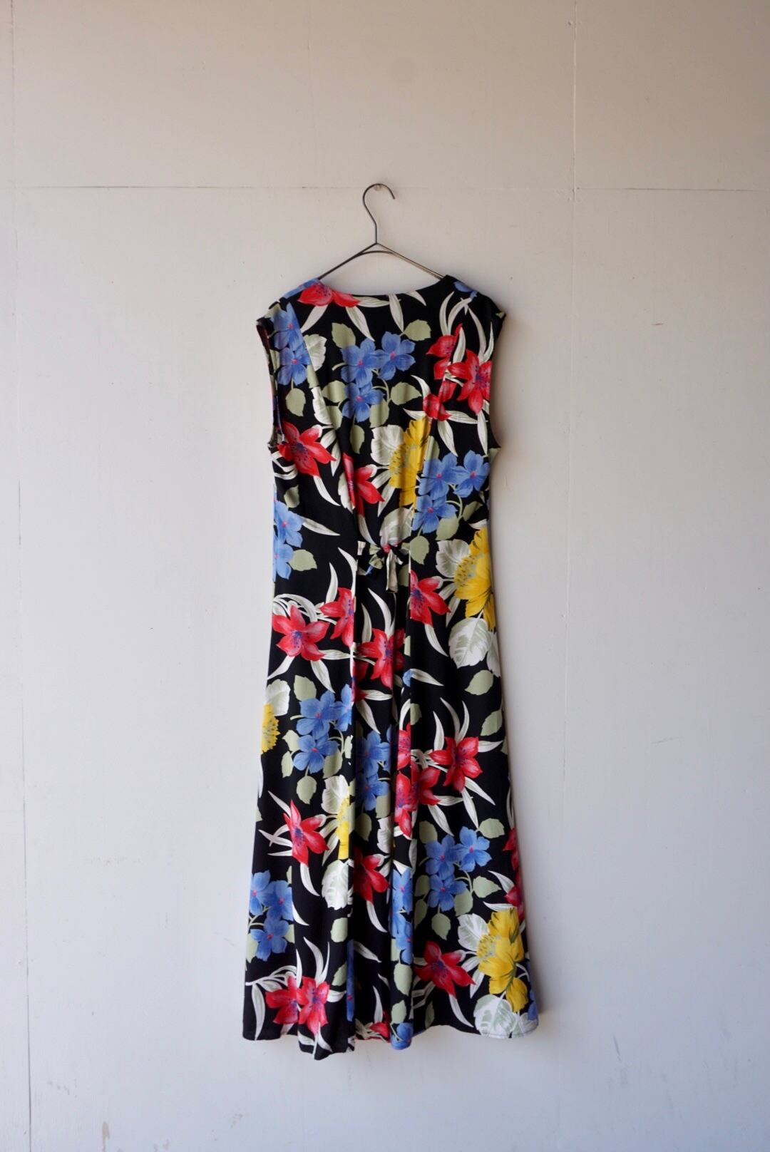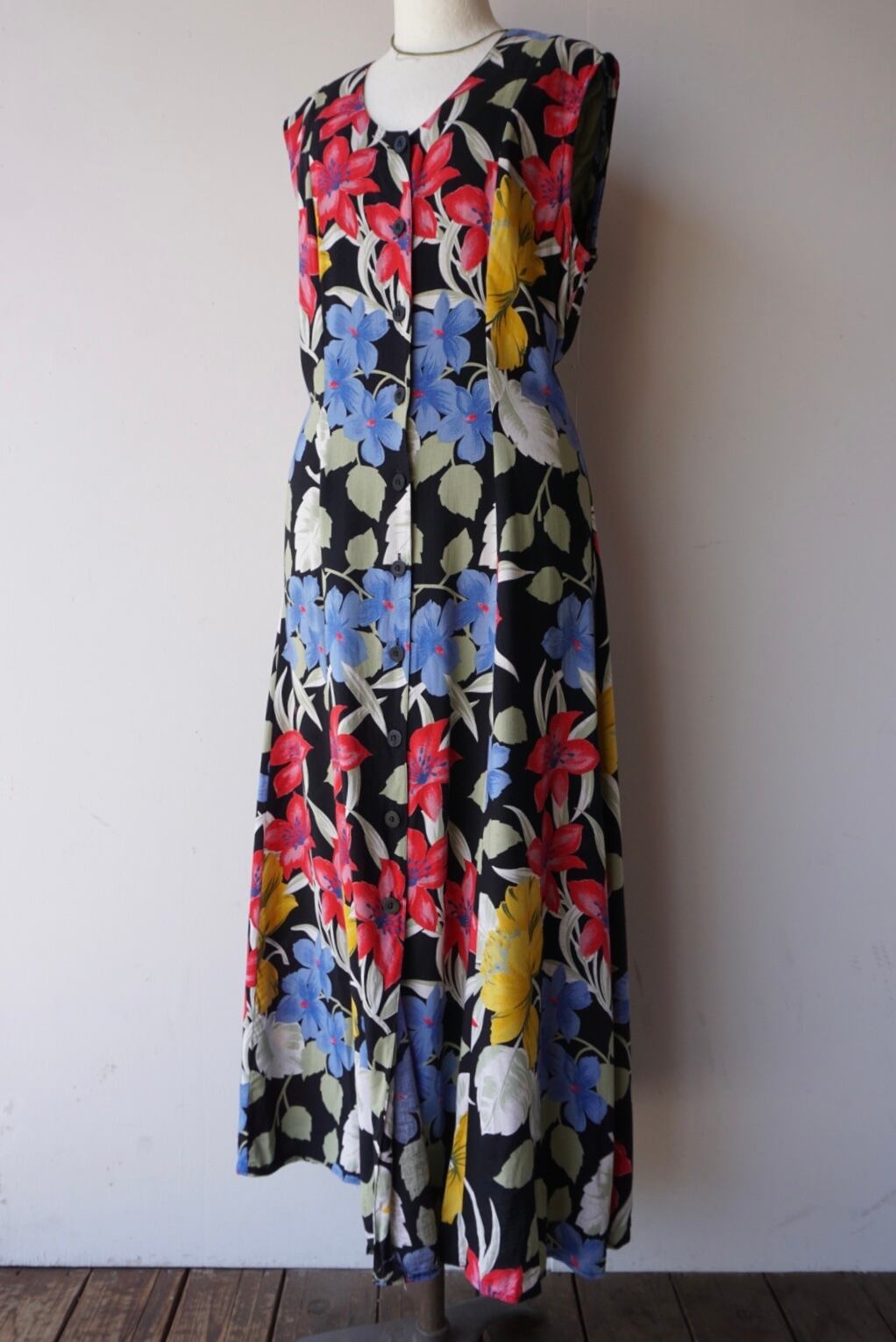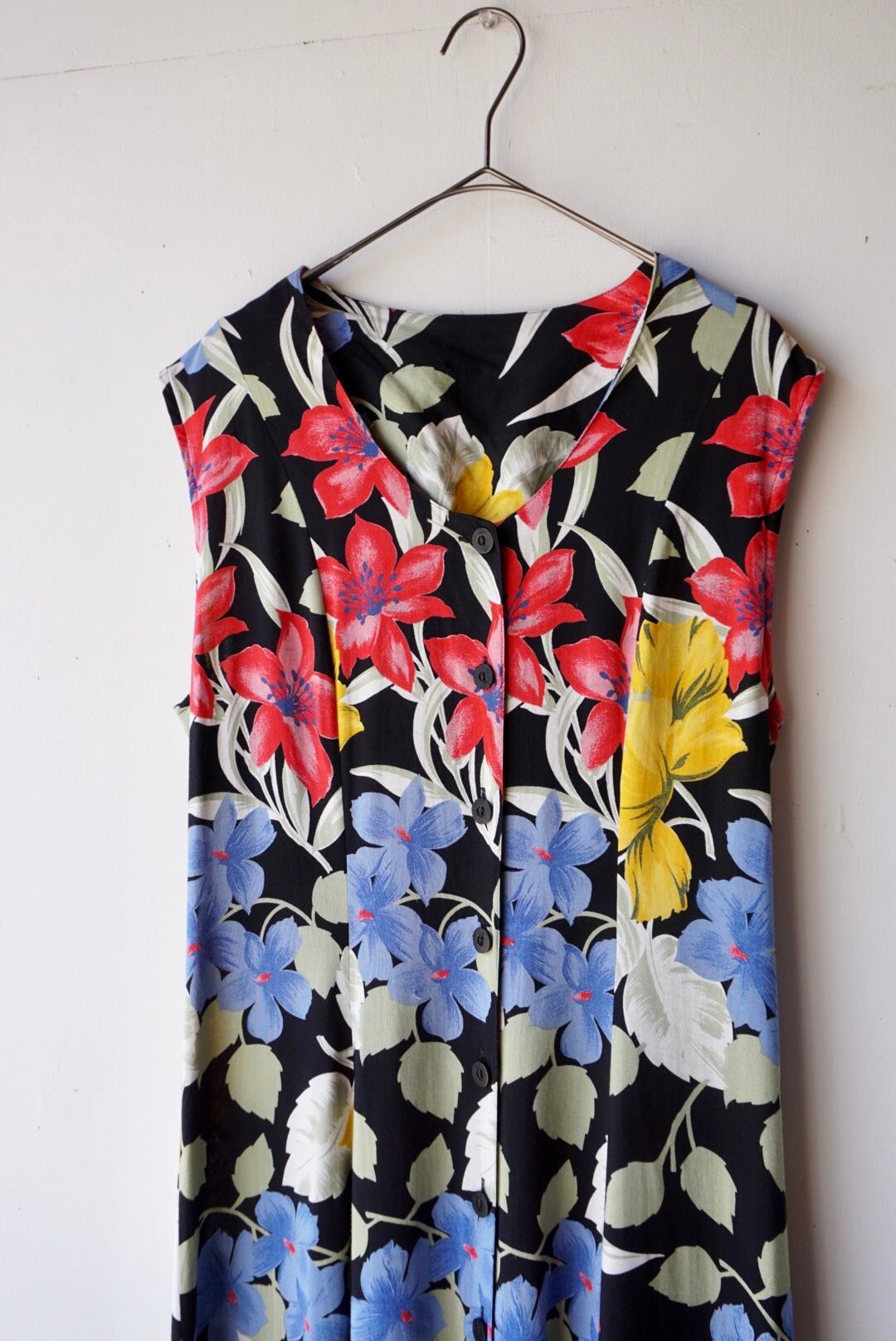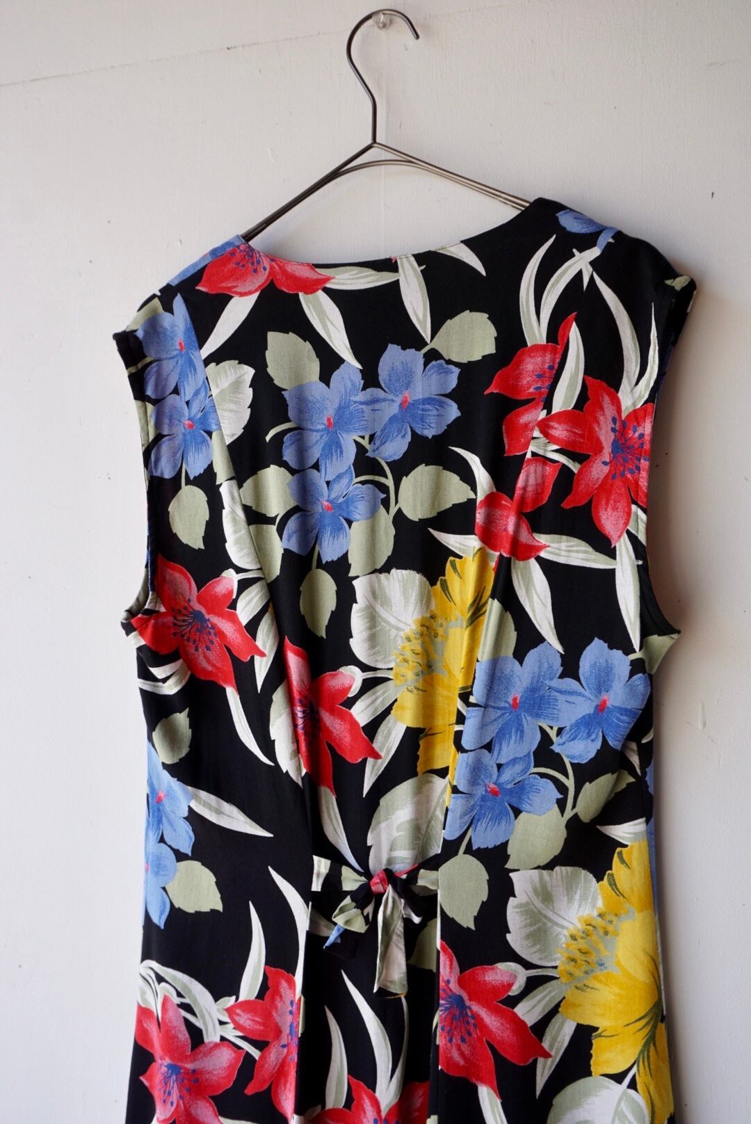 ブラックベースに鮮やかな花柄が目を引くノースリーブワンピース