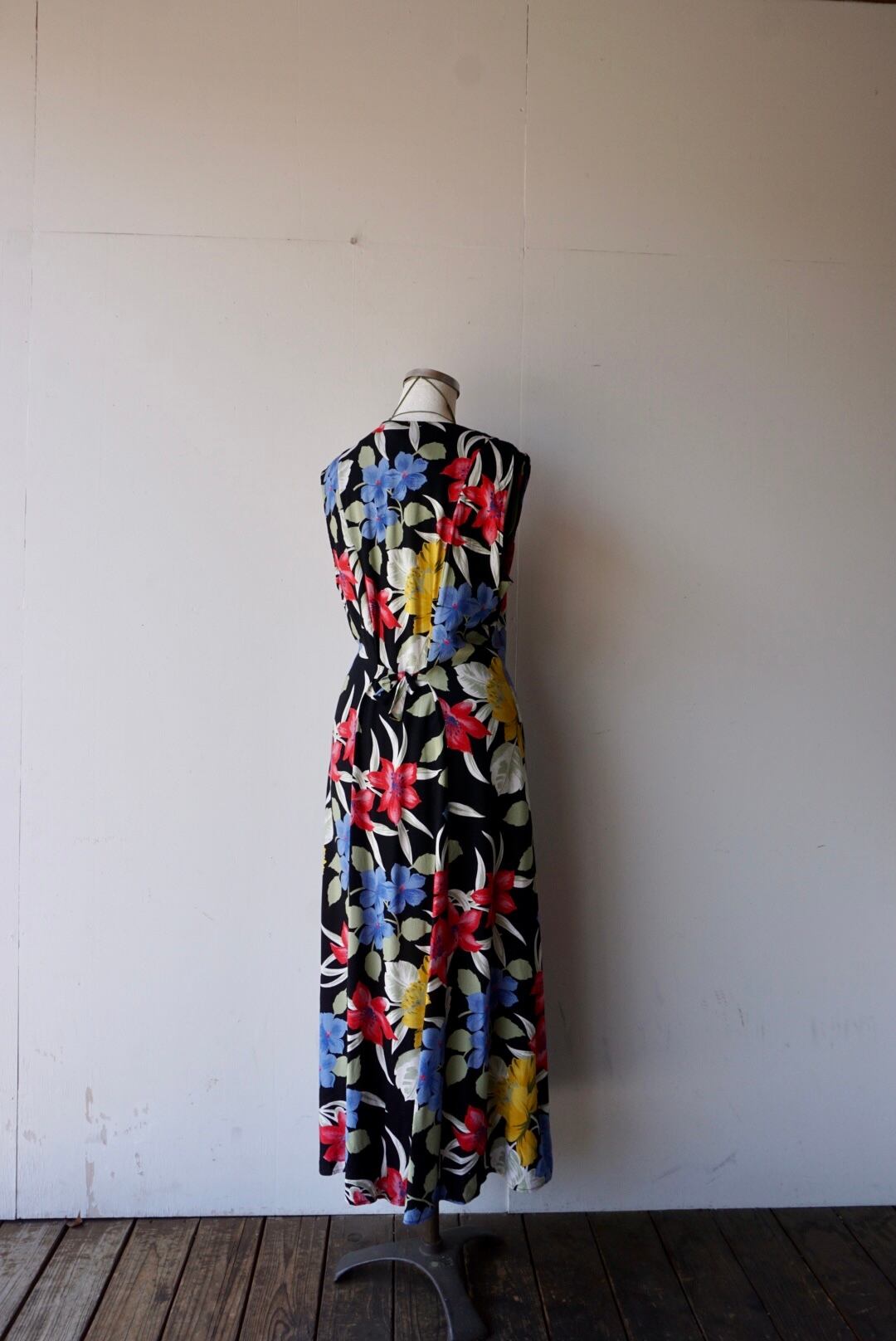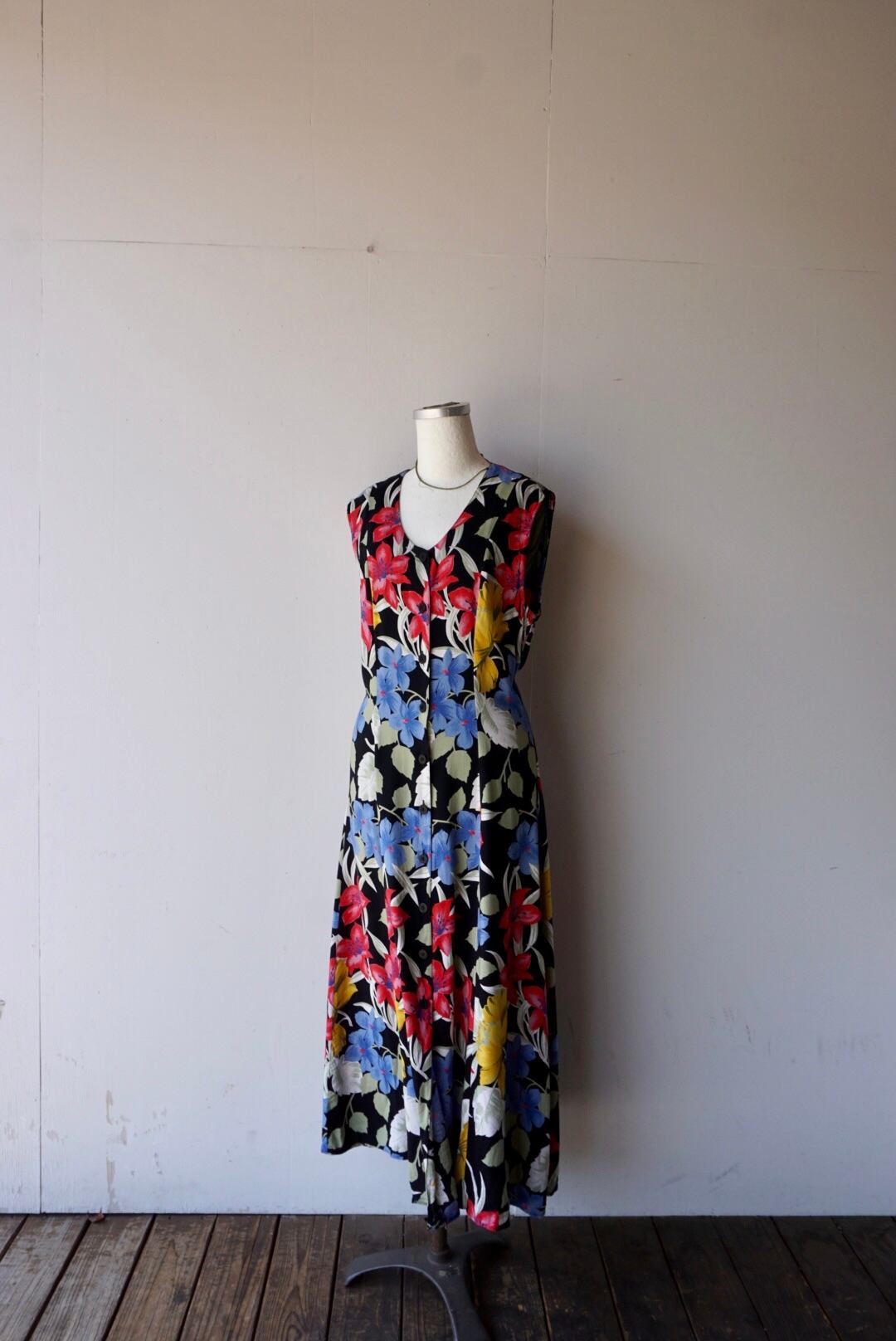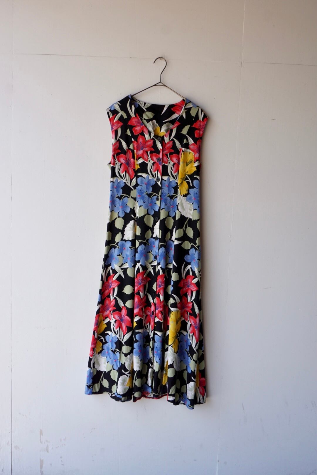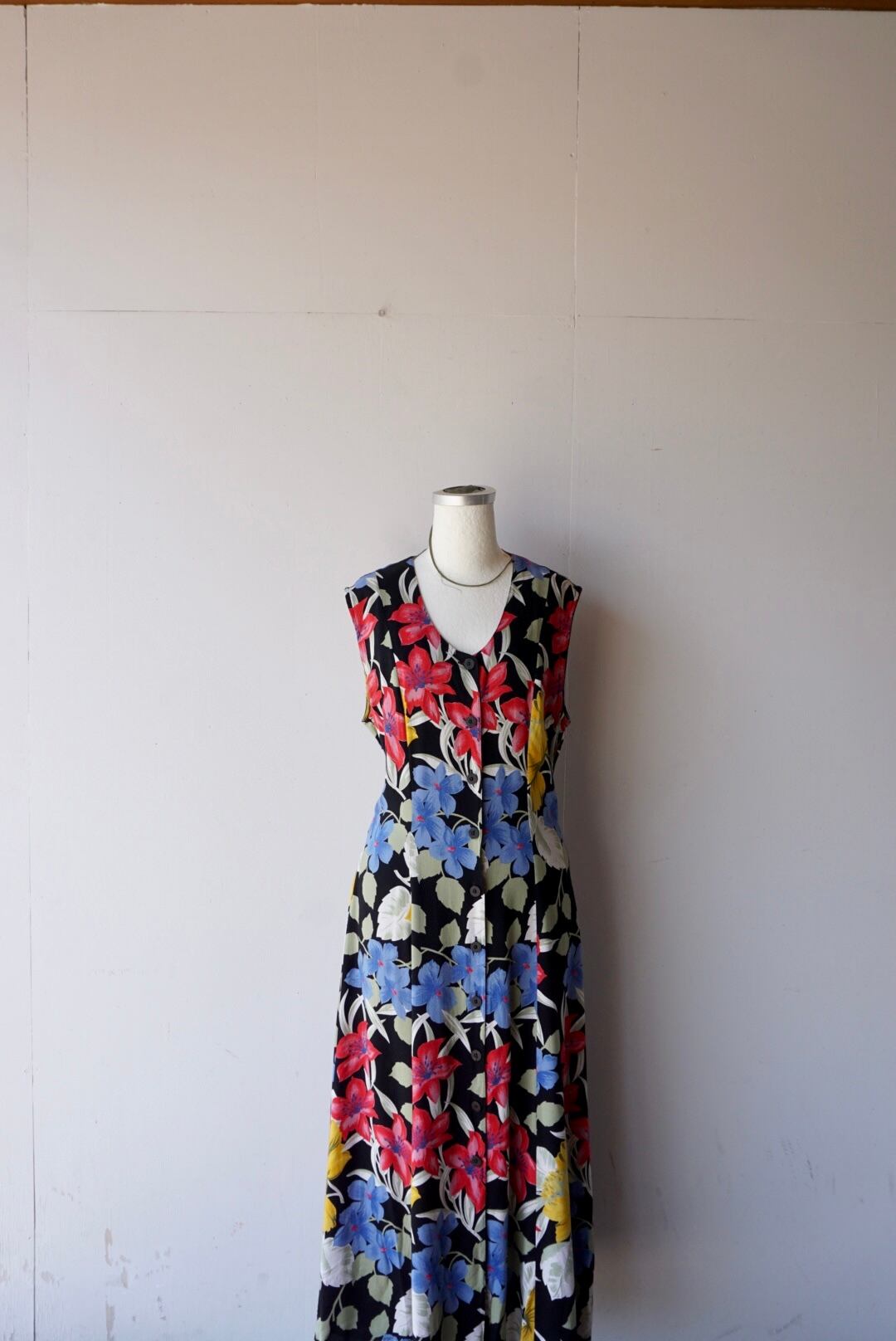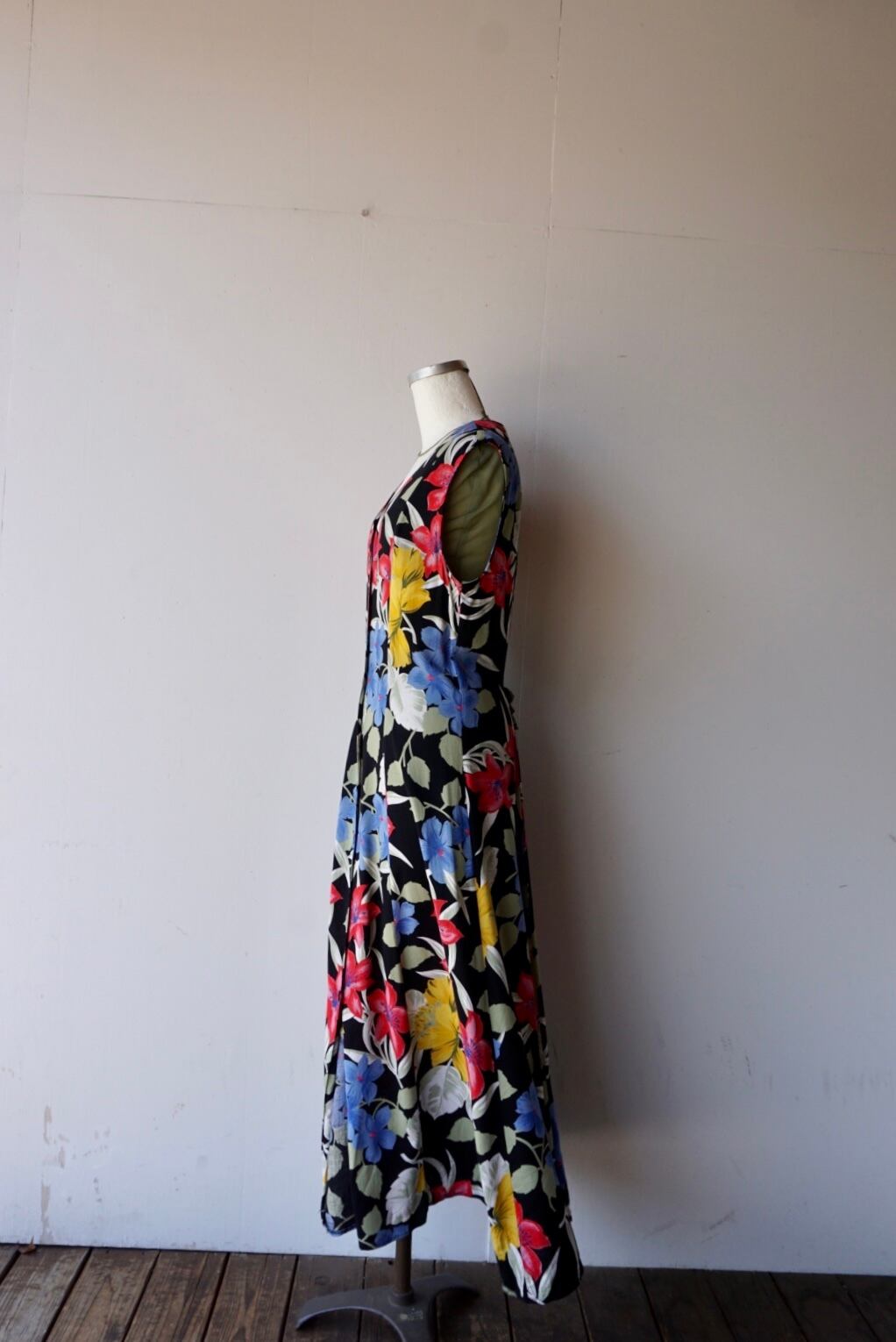 ブラックベースに鮮やかな花柄が目を引くノースリーブワンピース
