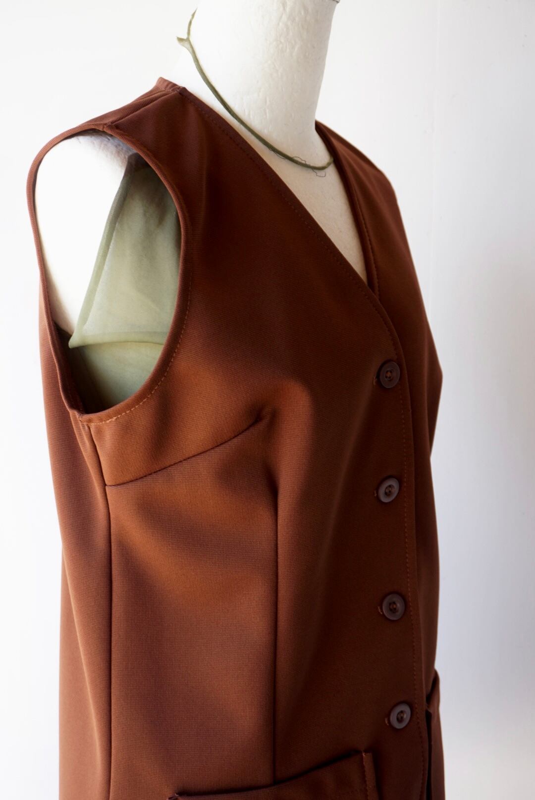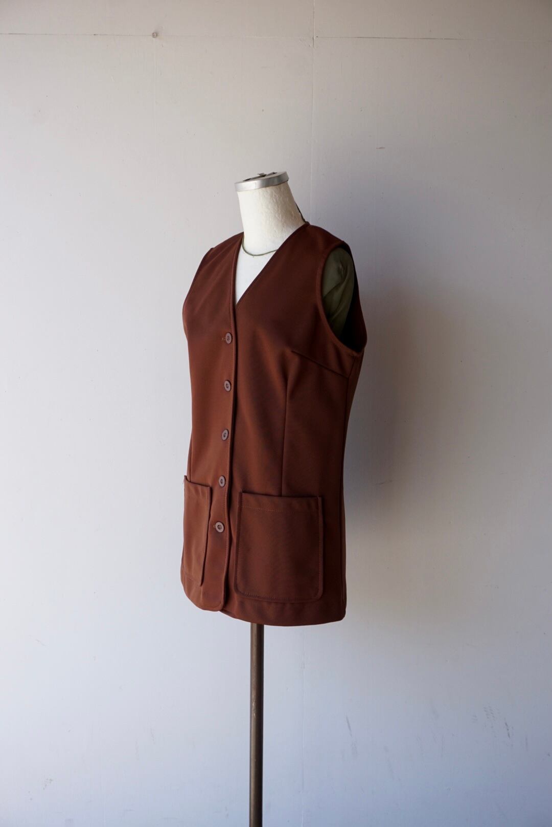 合わせやすいブラウンカラーのポリエステルベスト。