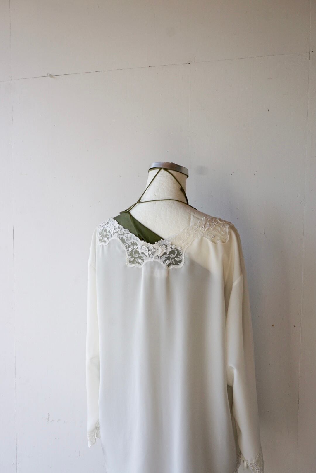 ネック回りや裾、袖に散りばめられたレースが上品な一枚