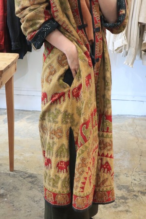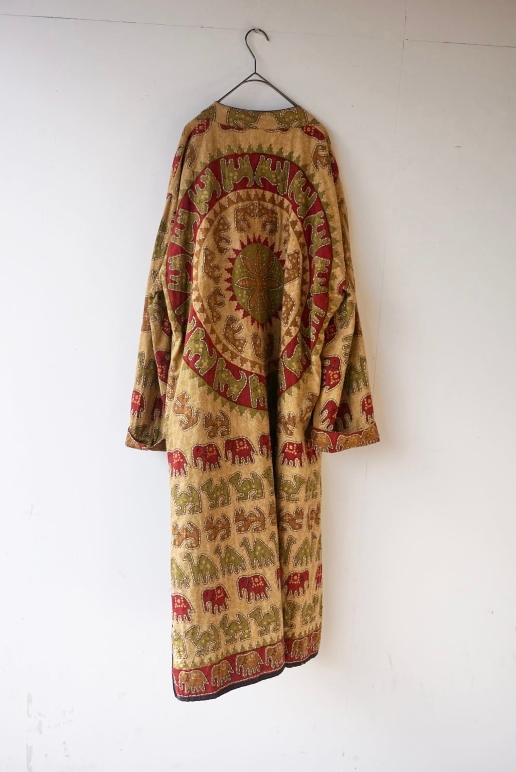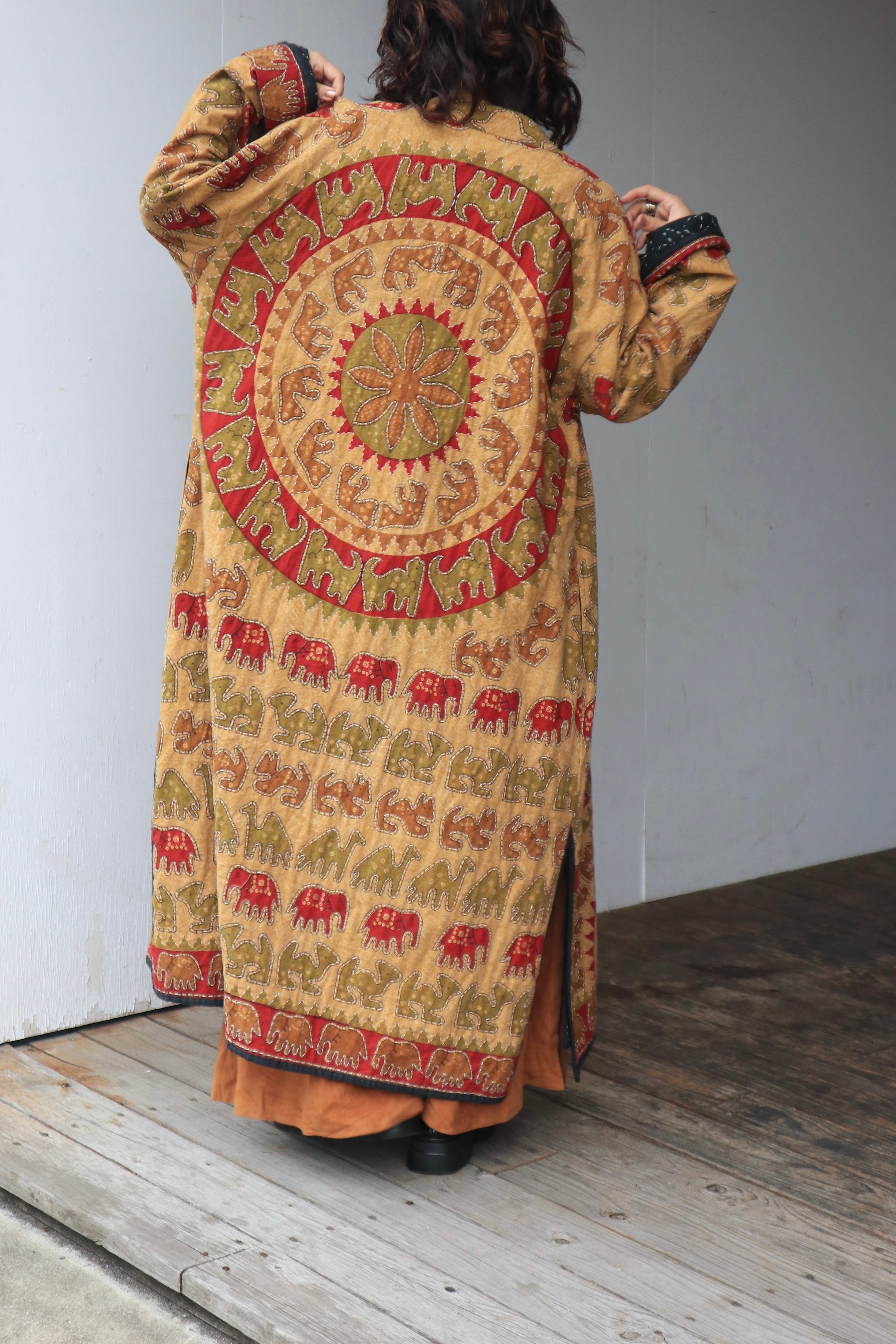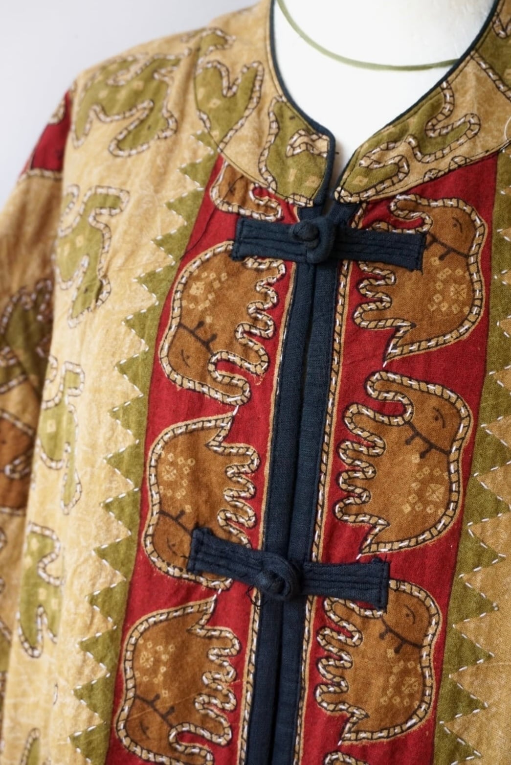 ゾウやラクダなどのモチーフが全体にステッチで描かれた、贅沢でユニークなチャイナコート