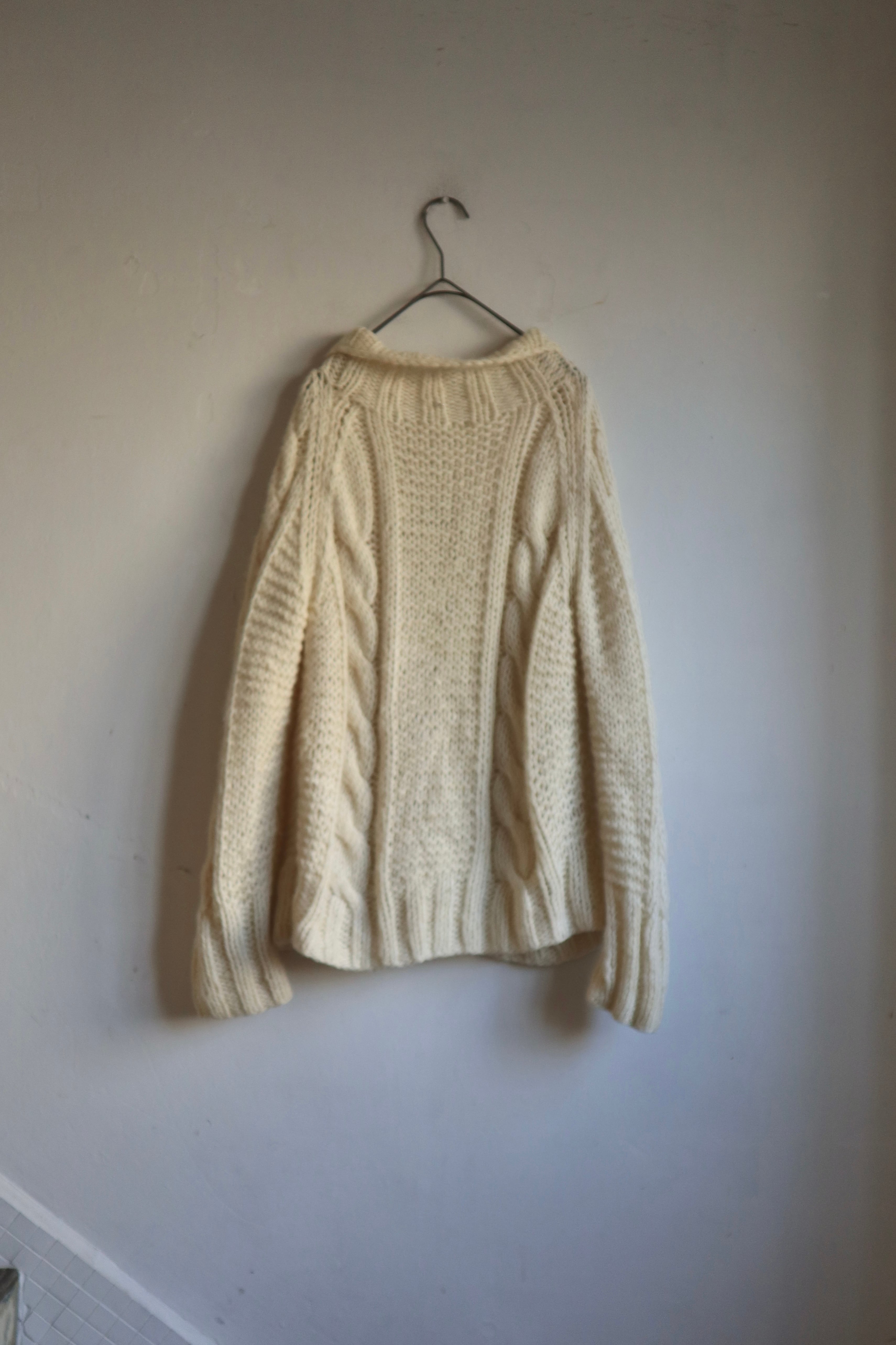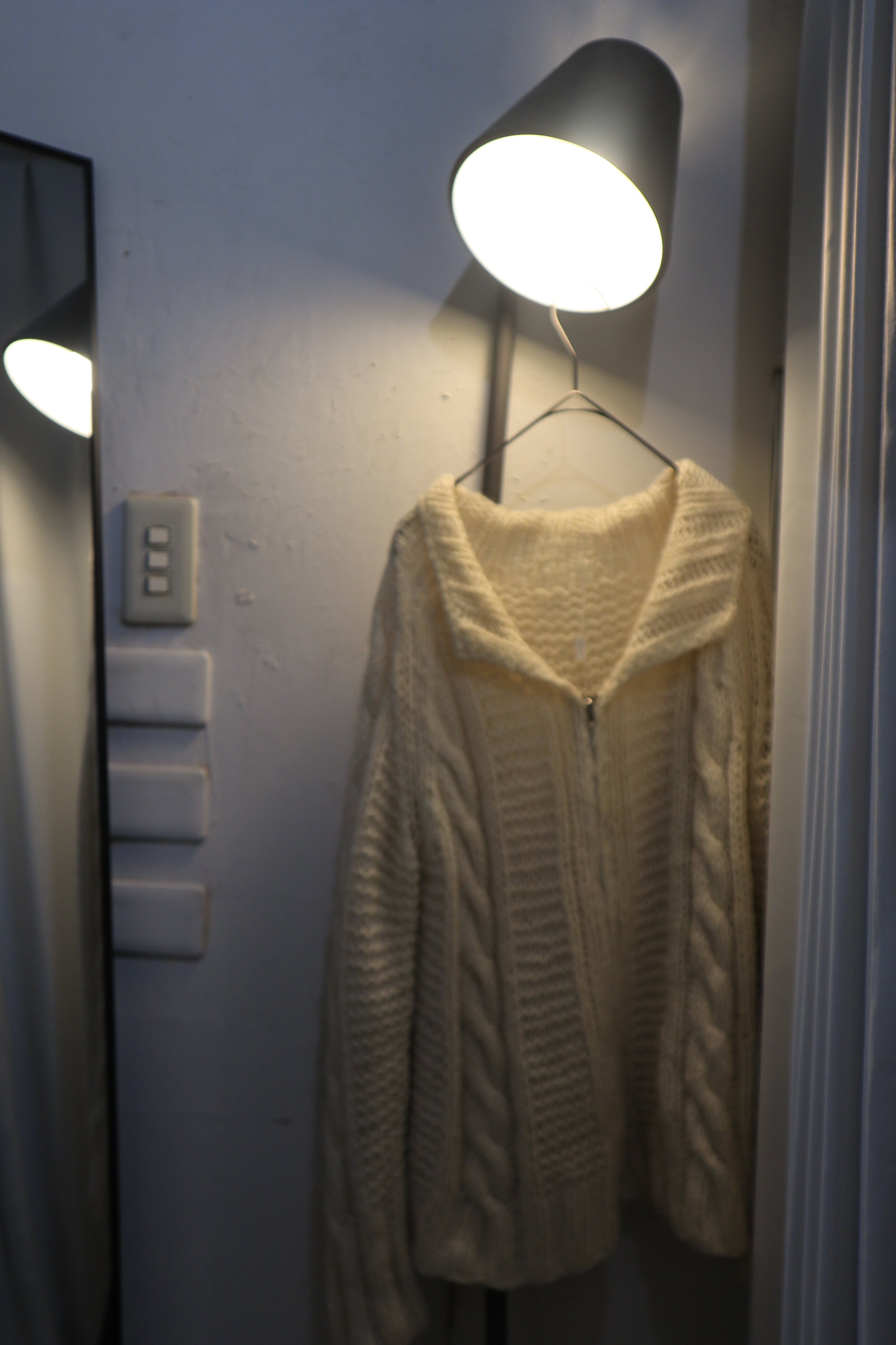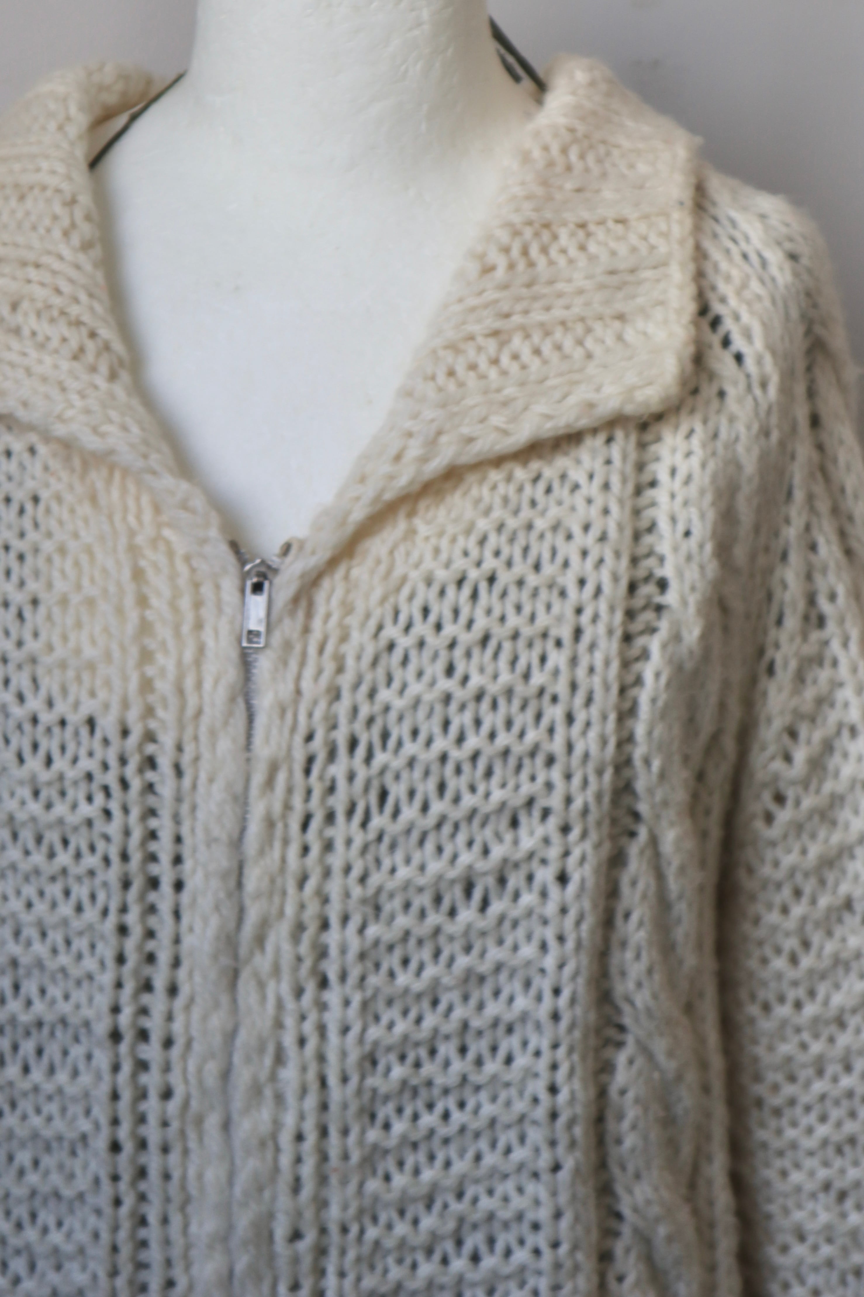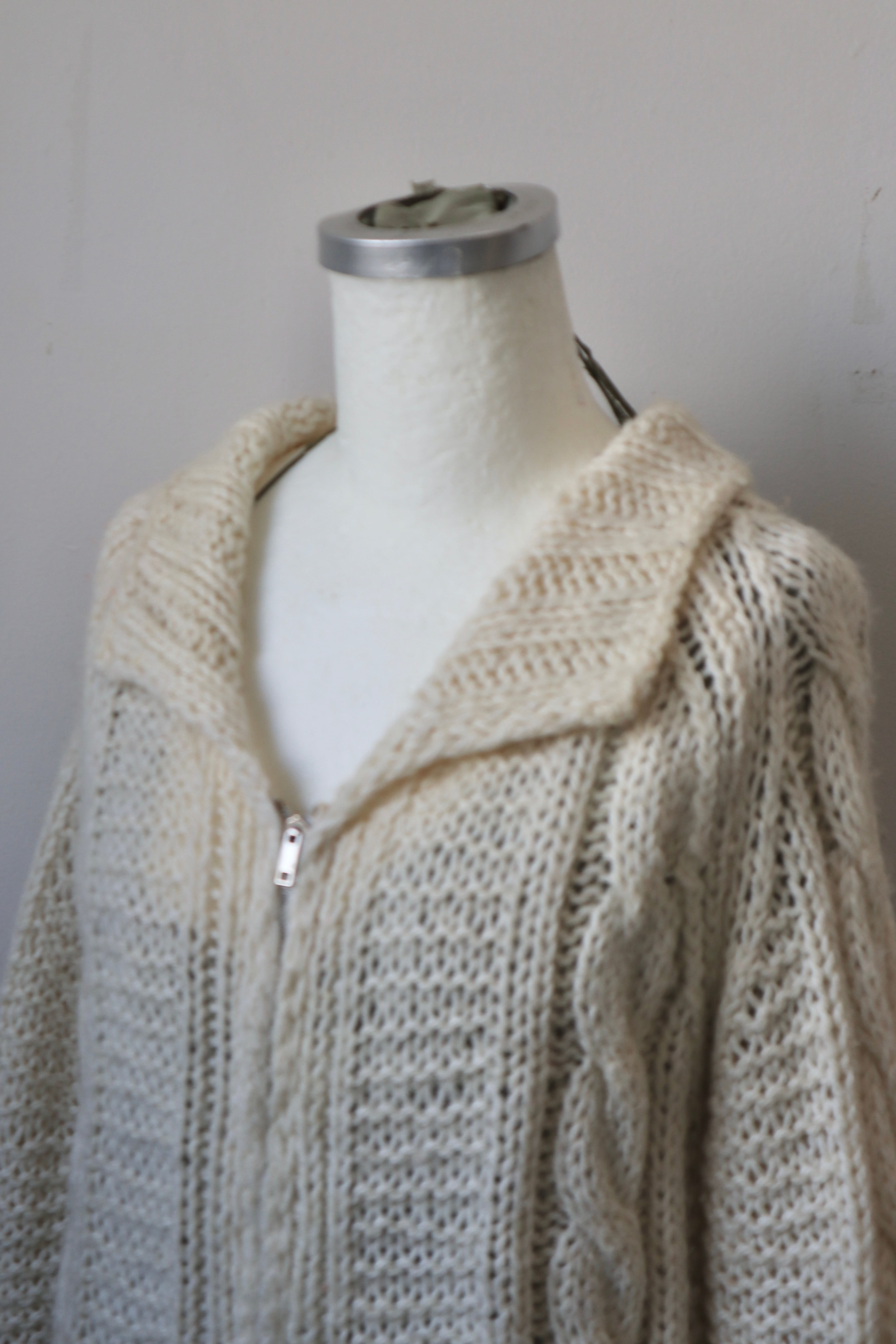 厚みのある糸でざっくりと編まれた、ケーブル編みのジップアップカーディガン