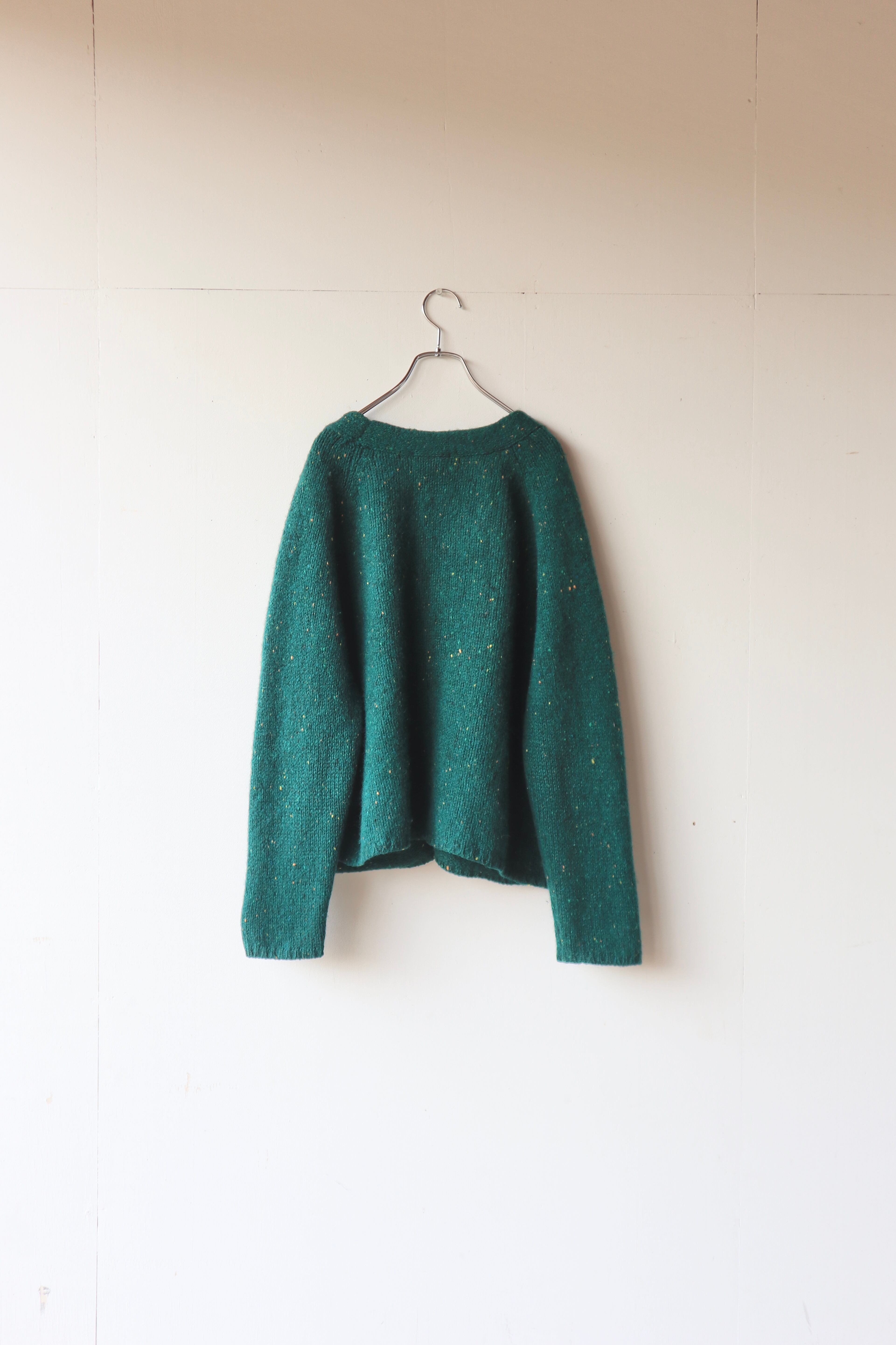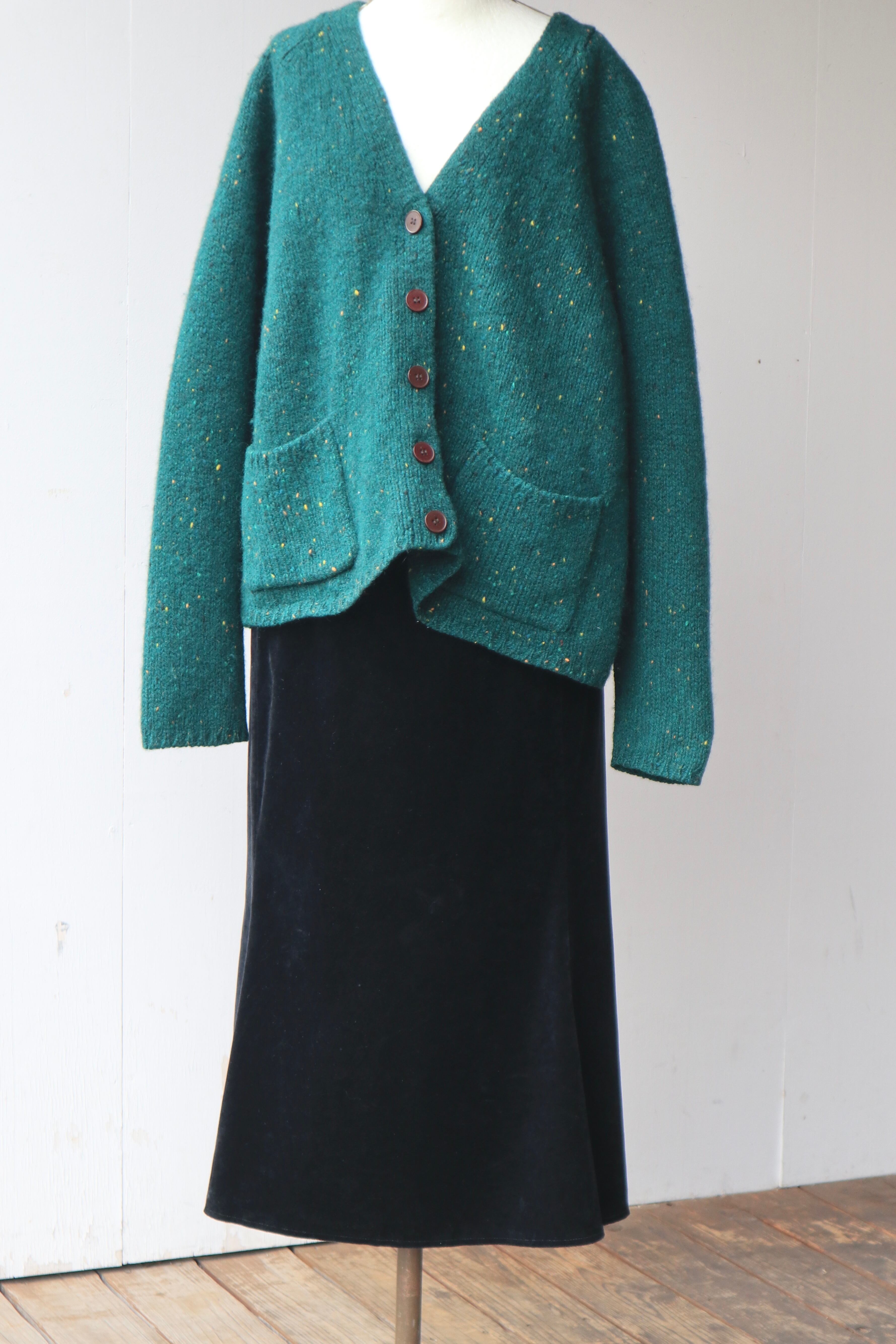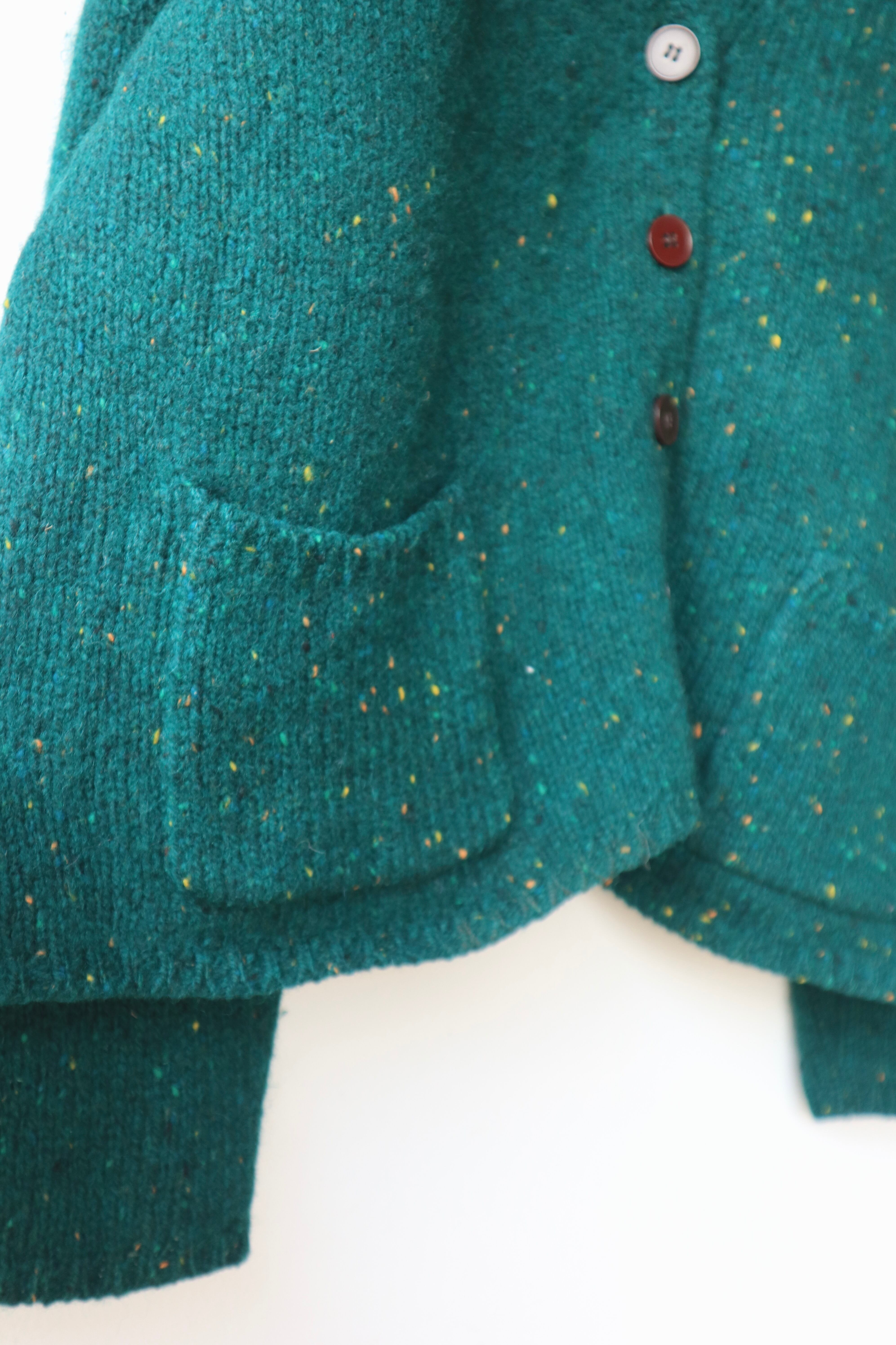 グリーンにイエロー・オレンジ・ブラックなどのネップが入ったウールカーディガン