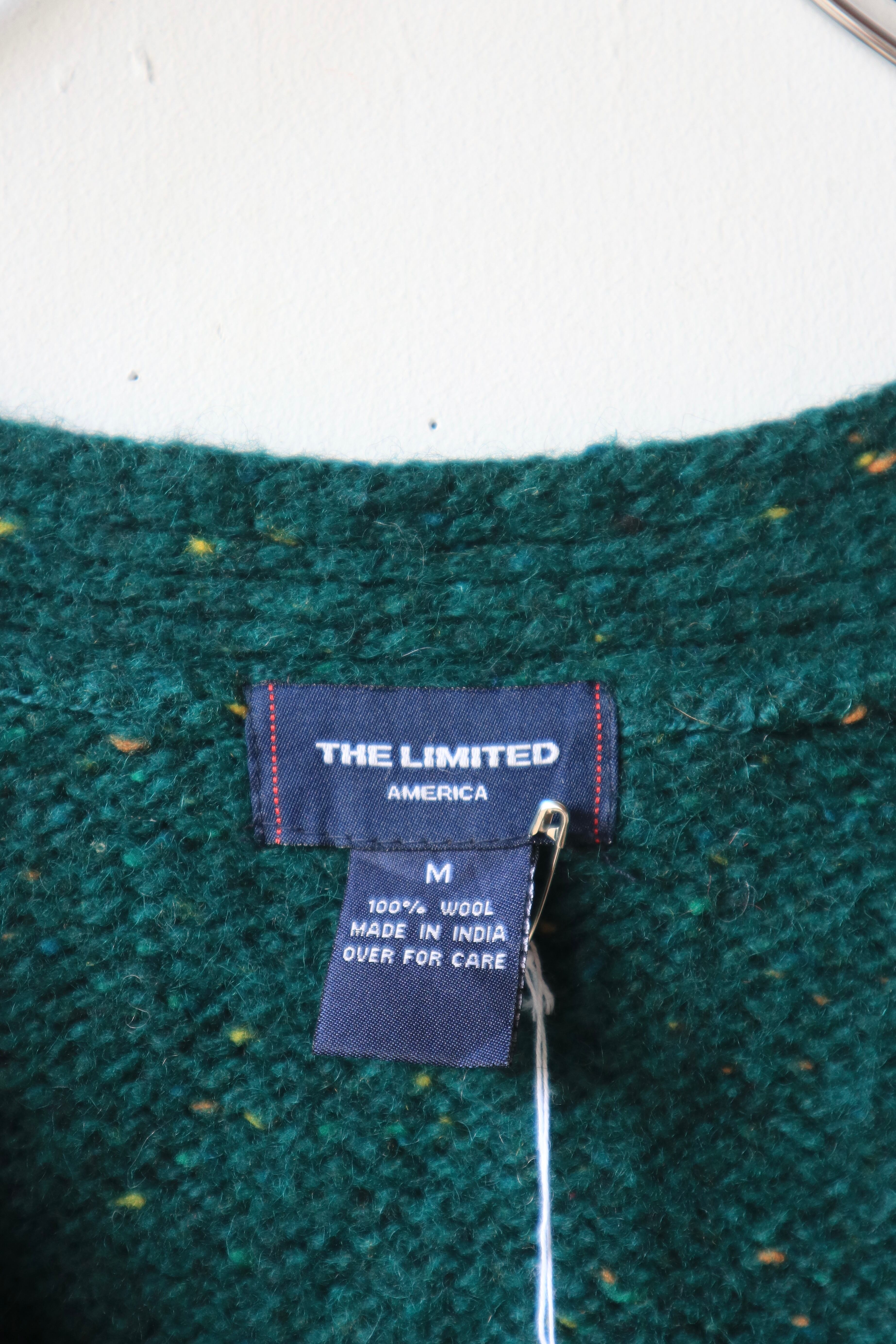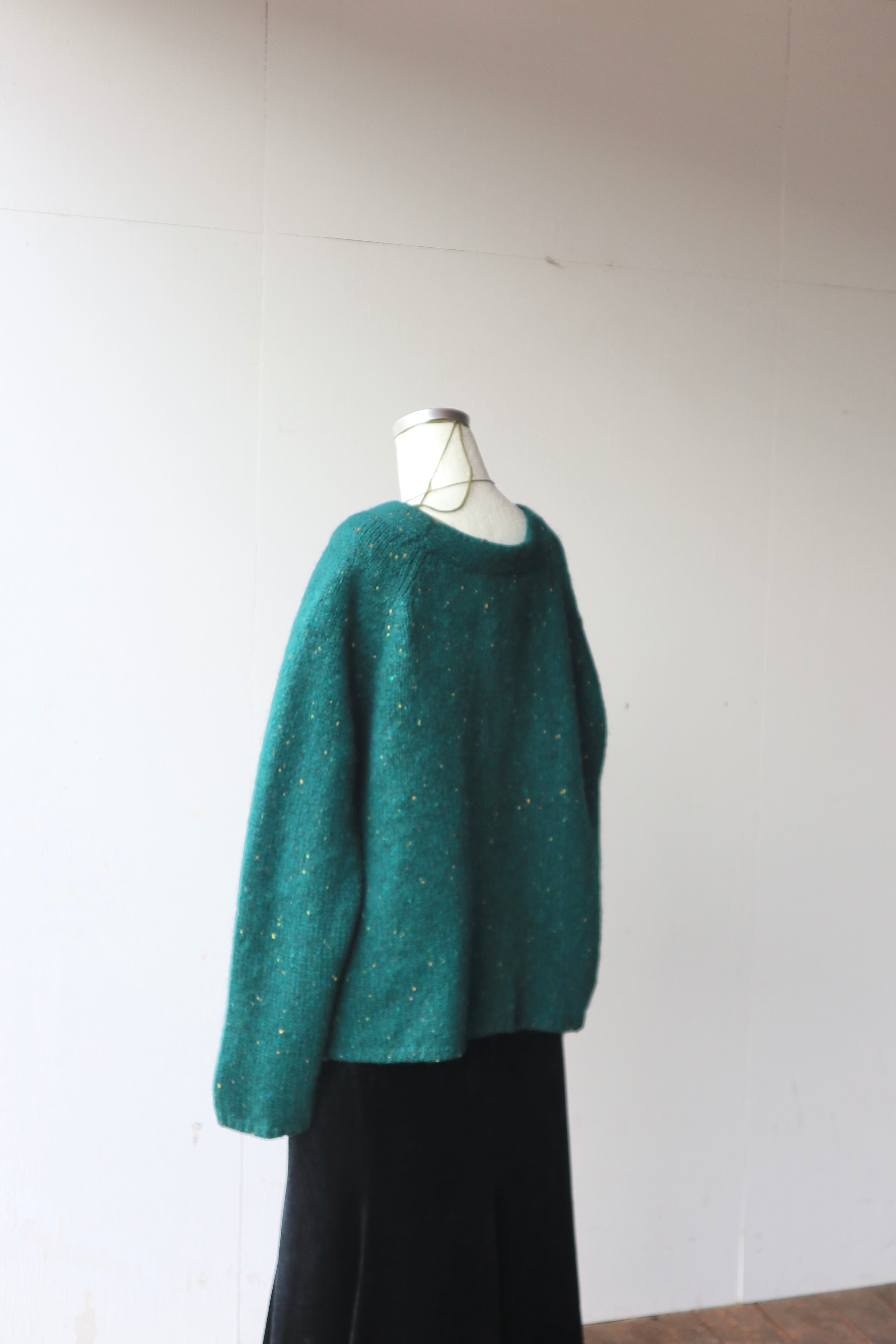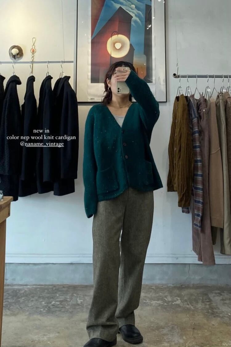 グリーンにイエロー・オレンジ・ブラックなどのネップが入ったウールカーディガン
