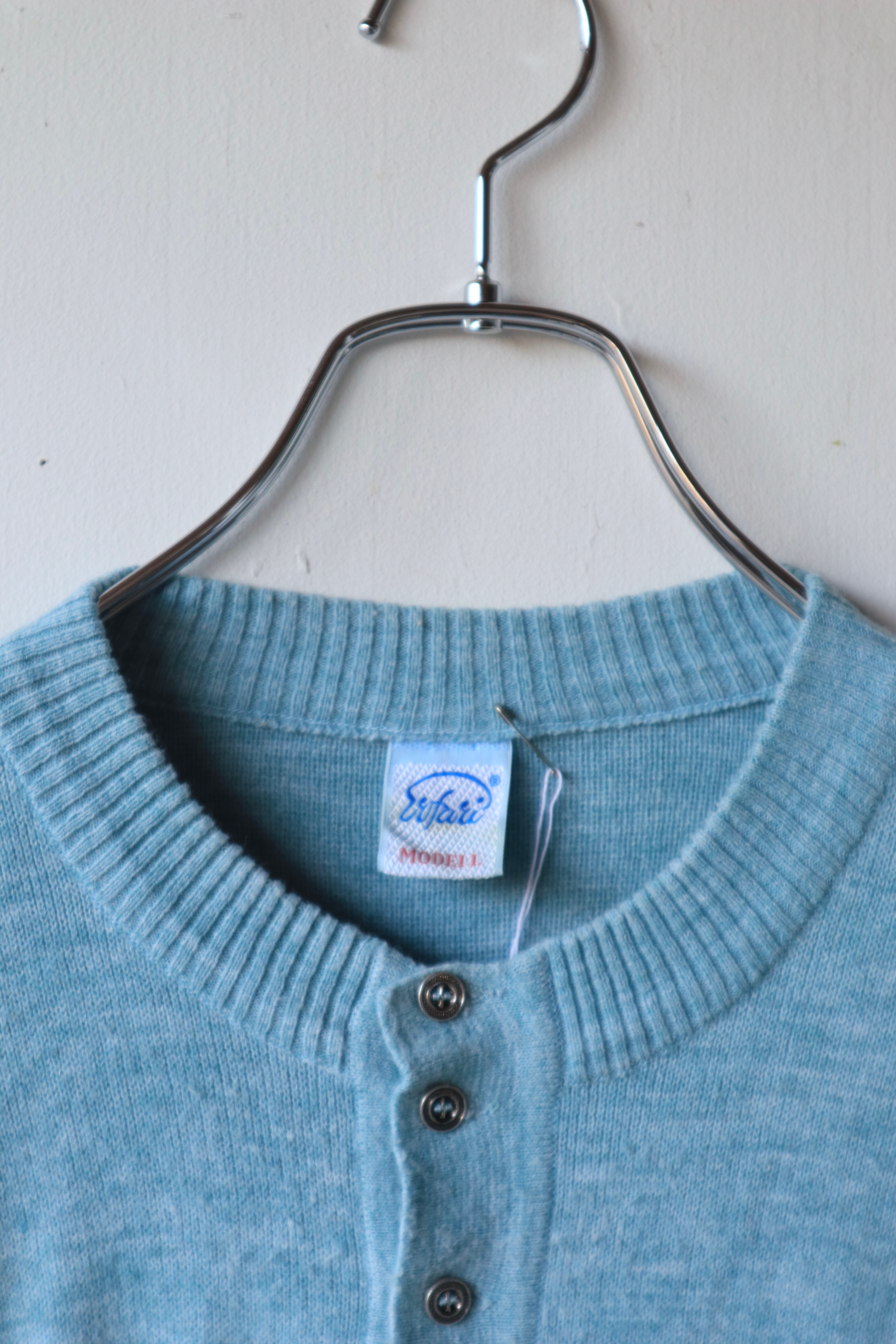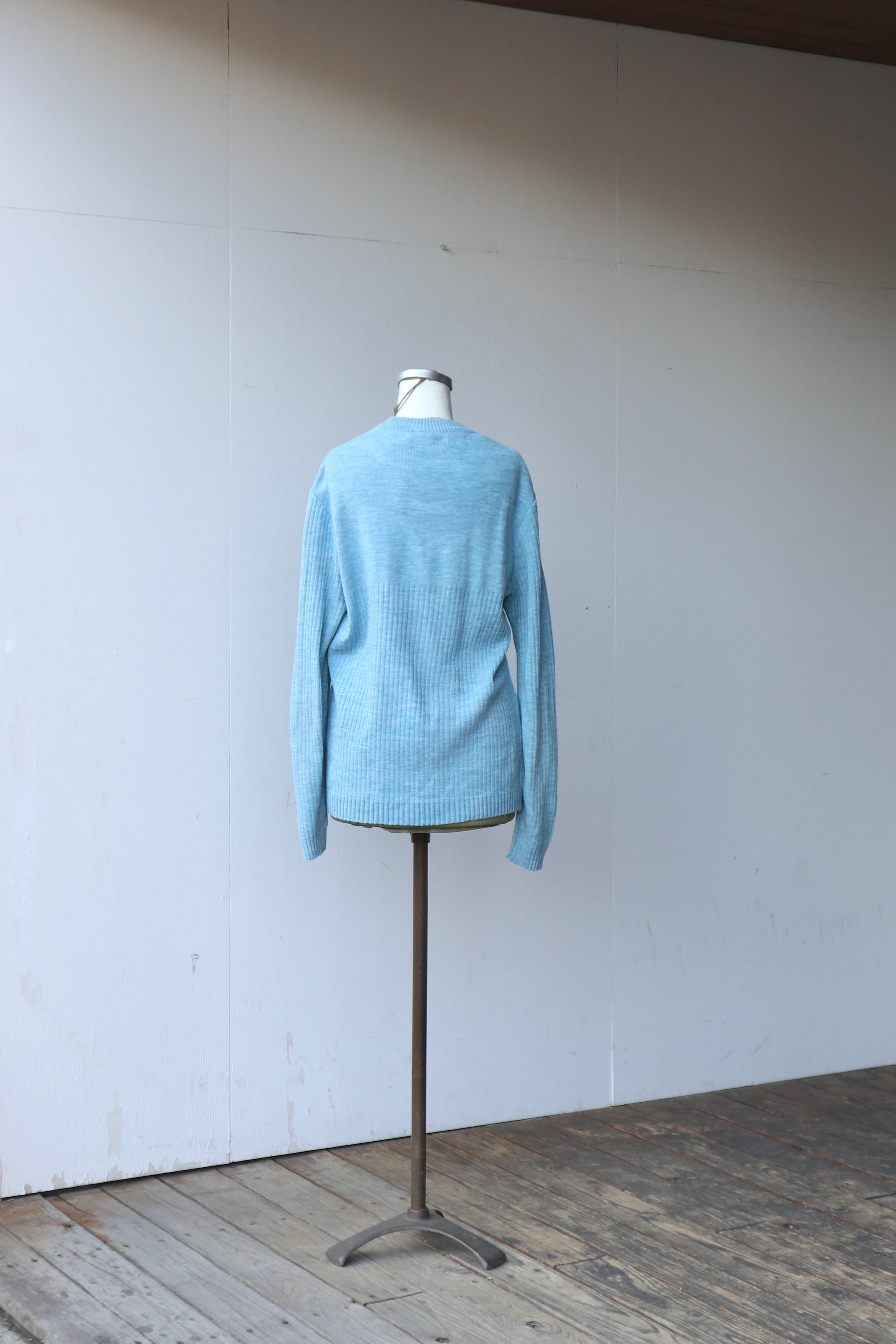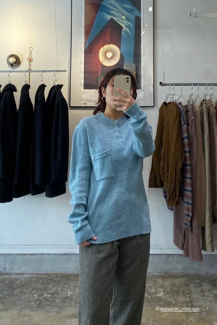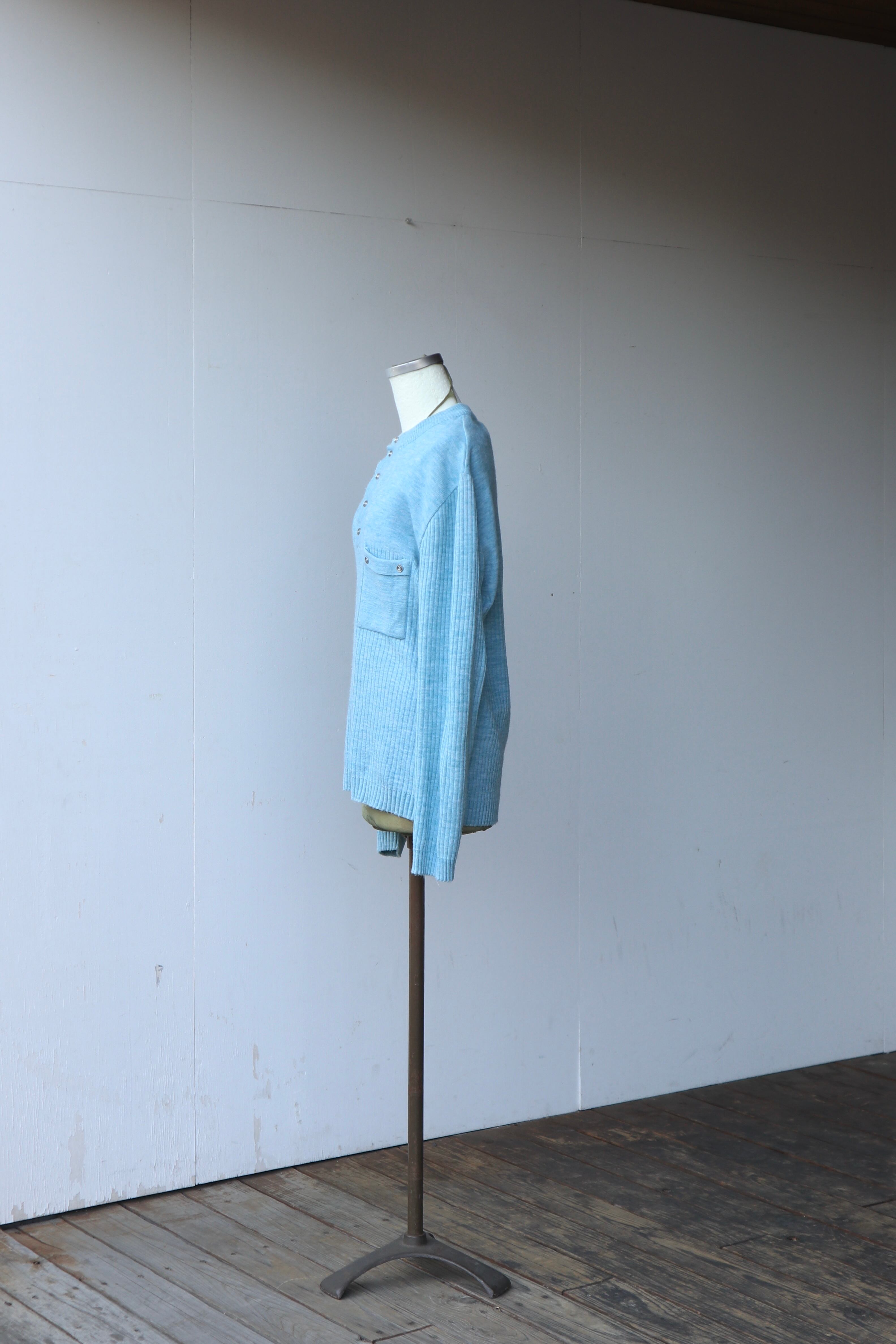 シルバーのヴィンテージボタンがアクセントになった水色のニットセーター