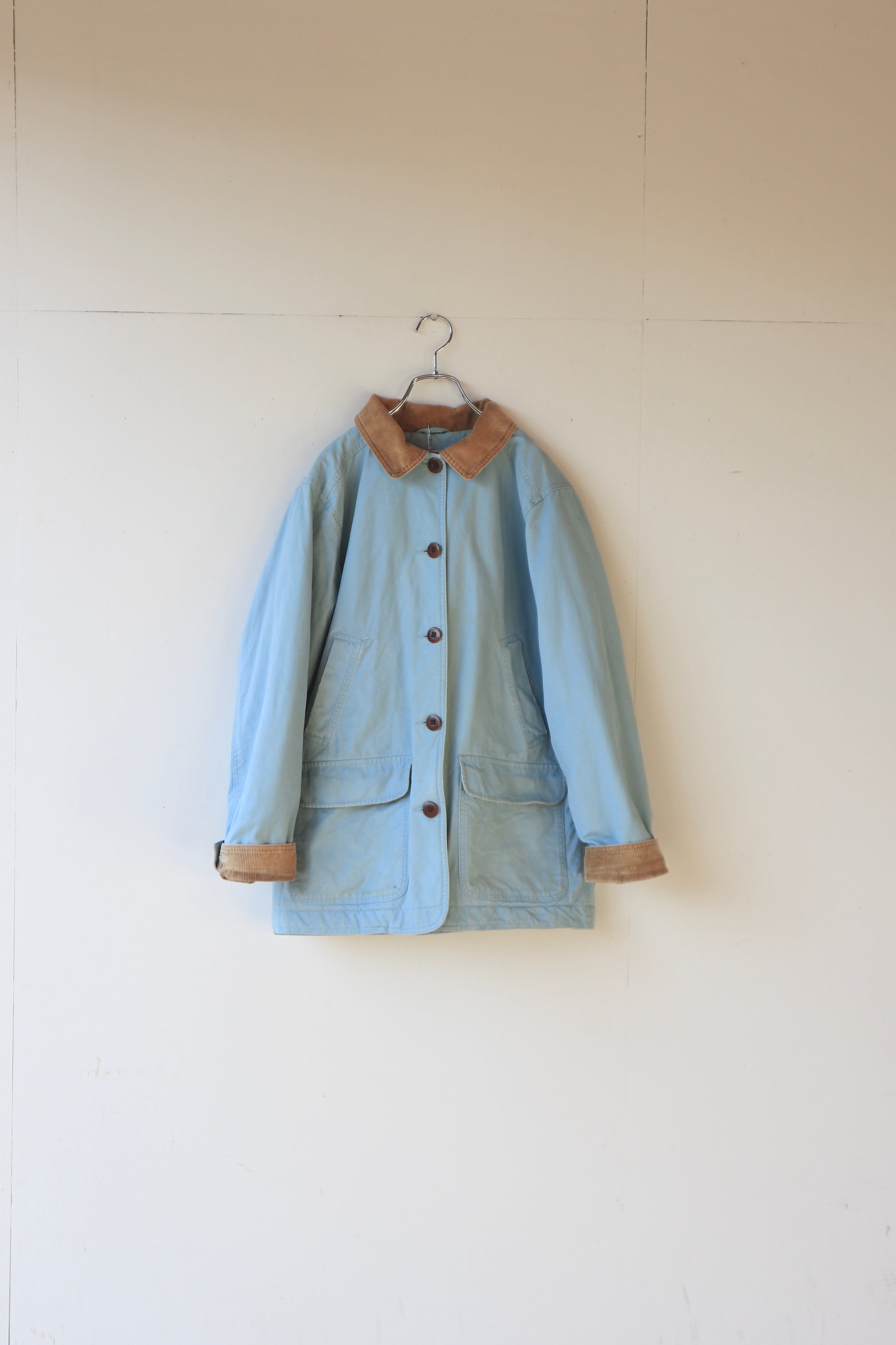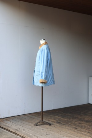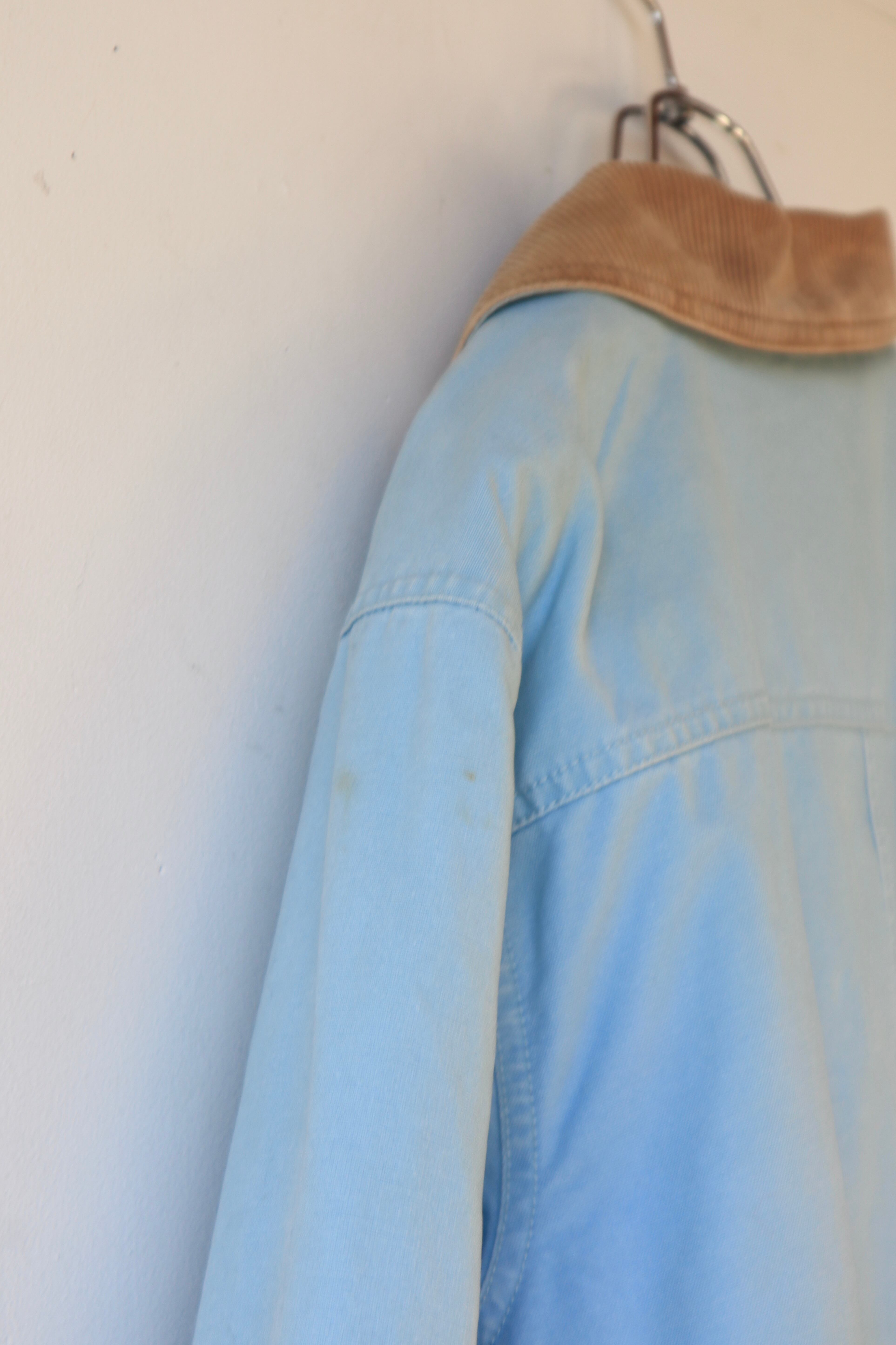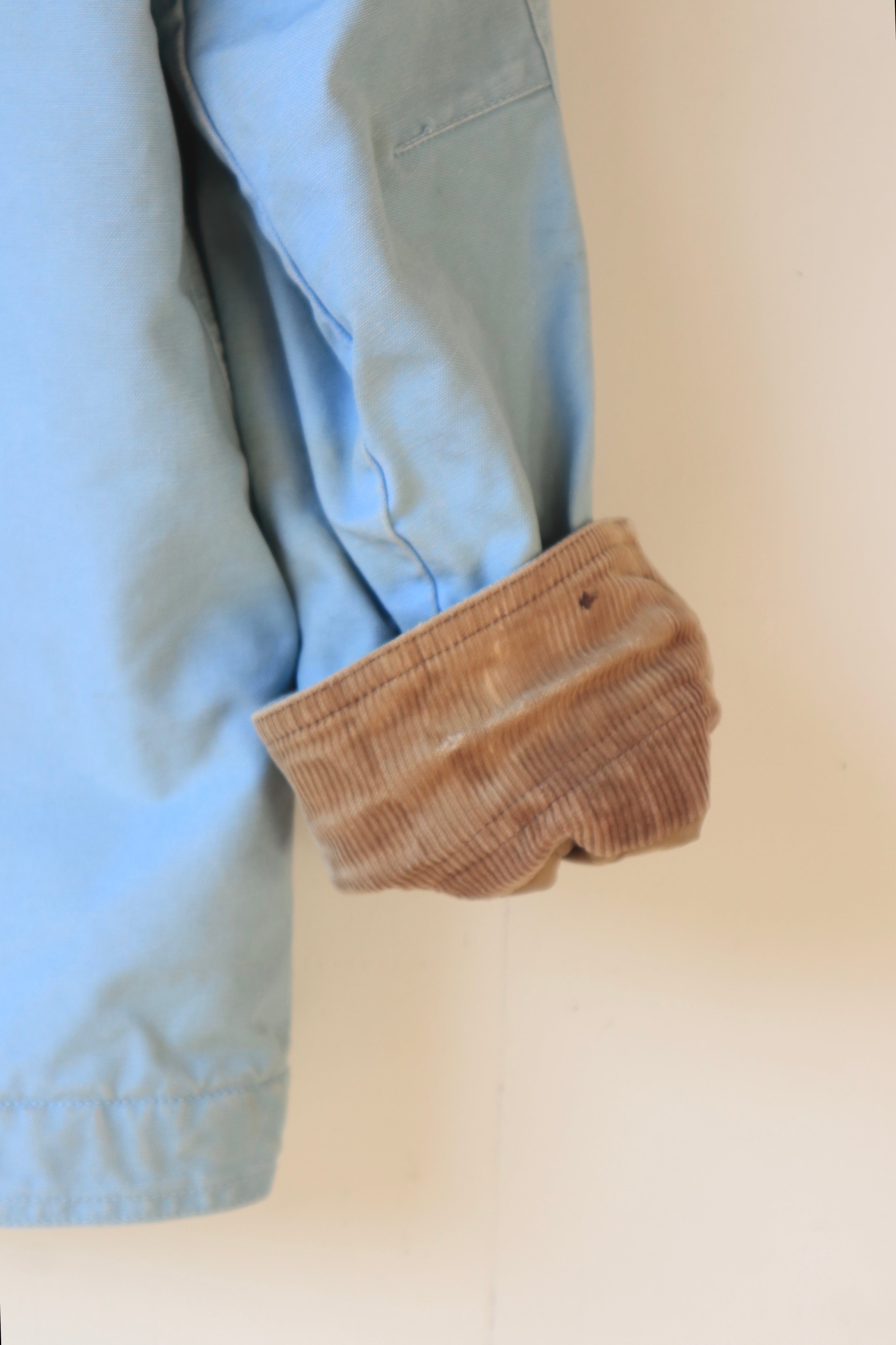 ボディの淡いブルーとコーデュロイ襟のブラウンが可愛らしいバランス
